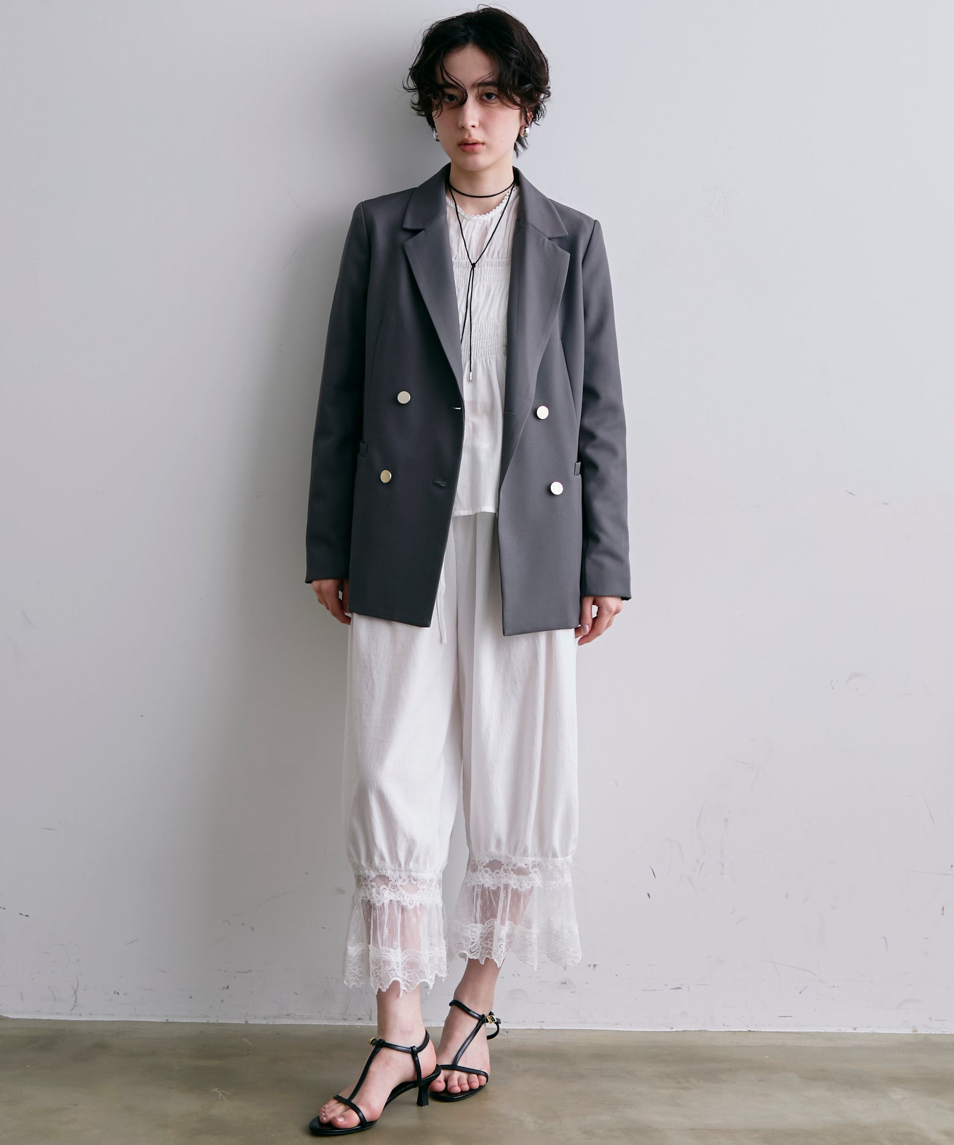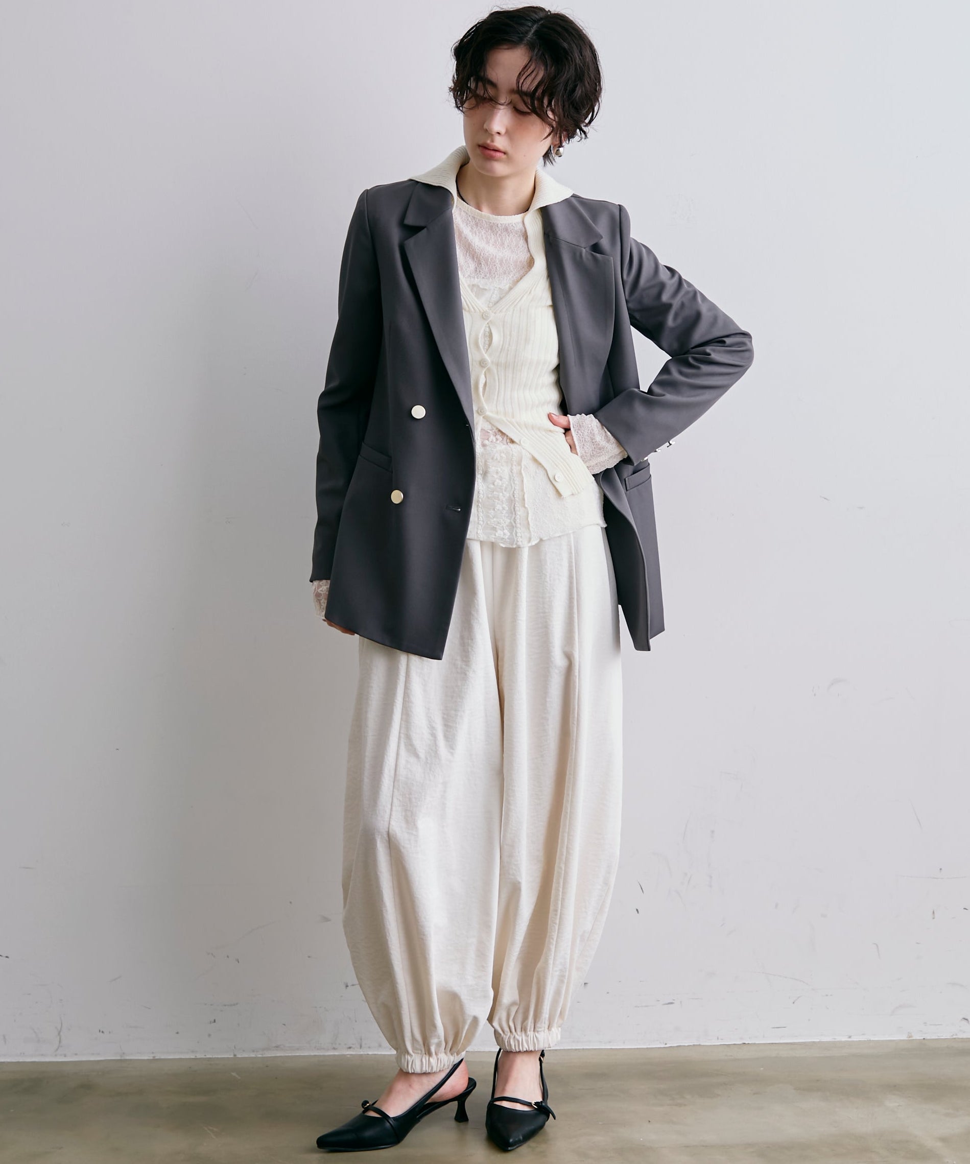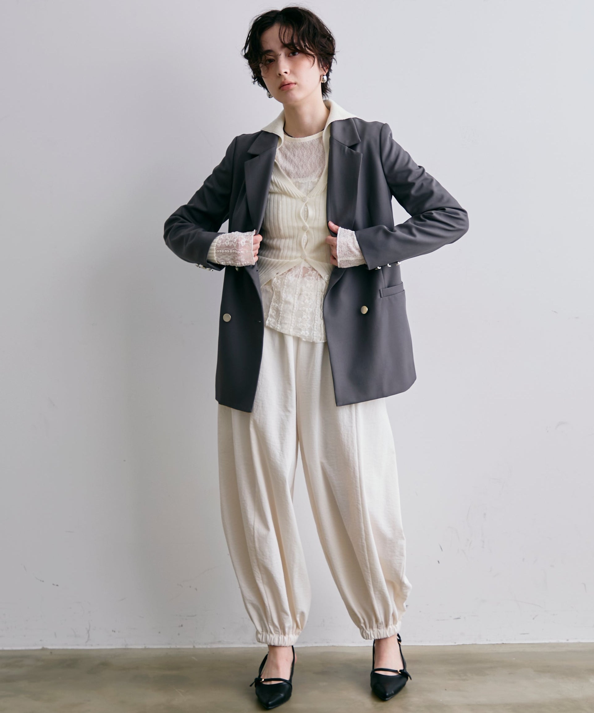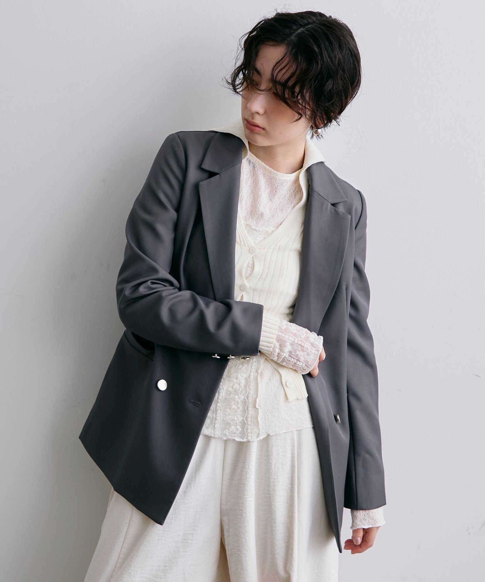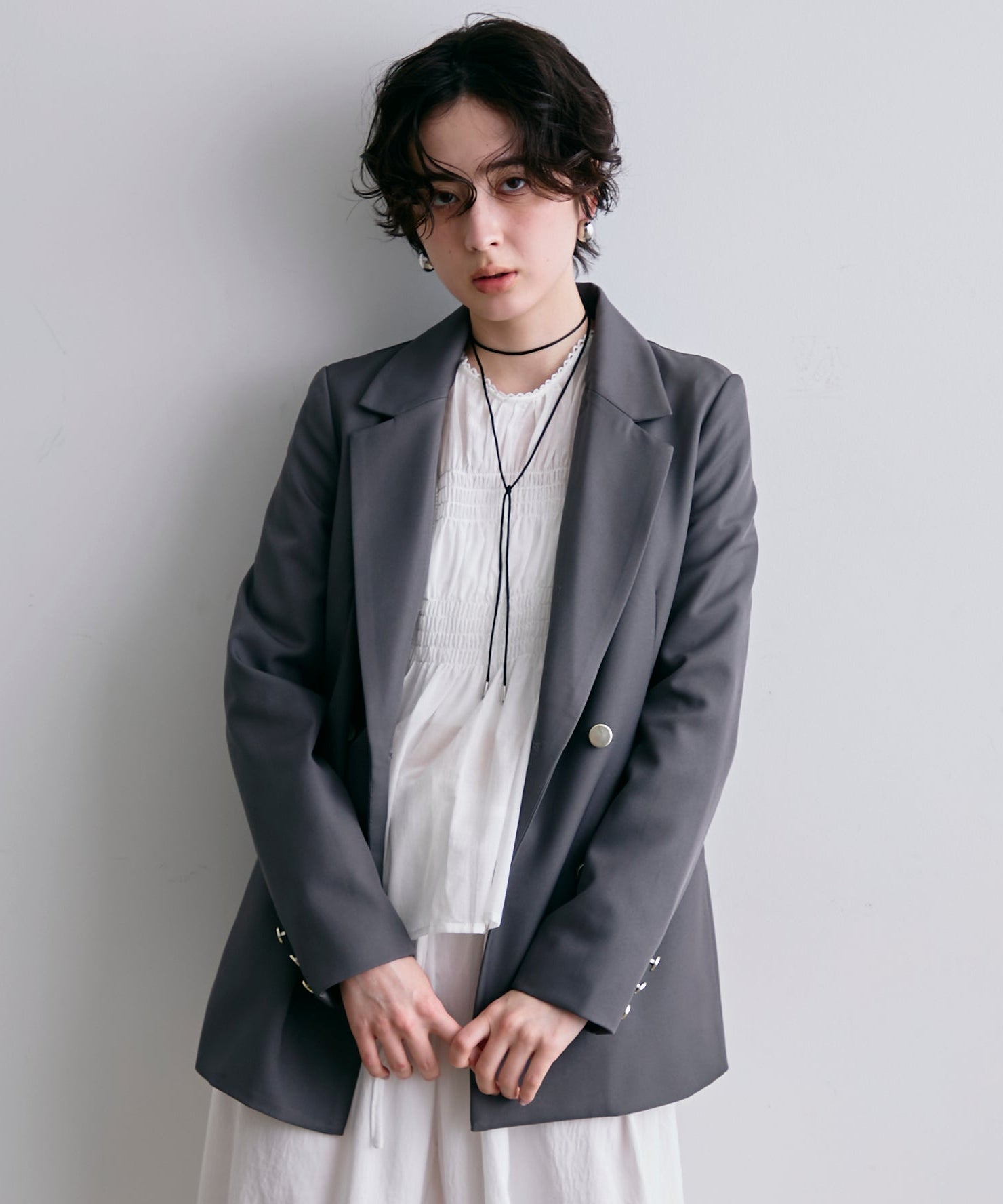 ゴールドボタンがアクセントをプラスするダブルテーラードジャケット