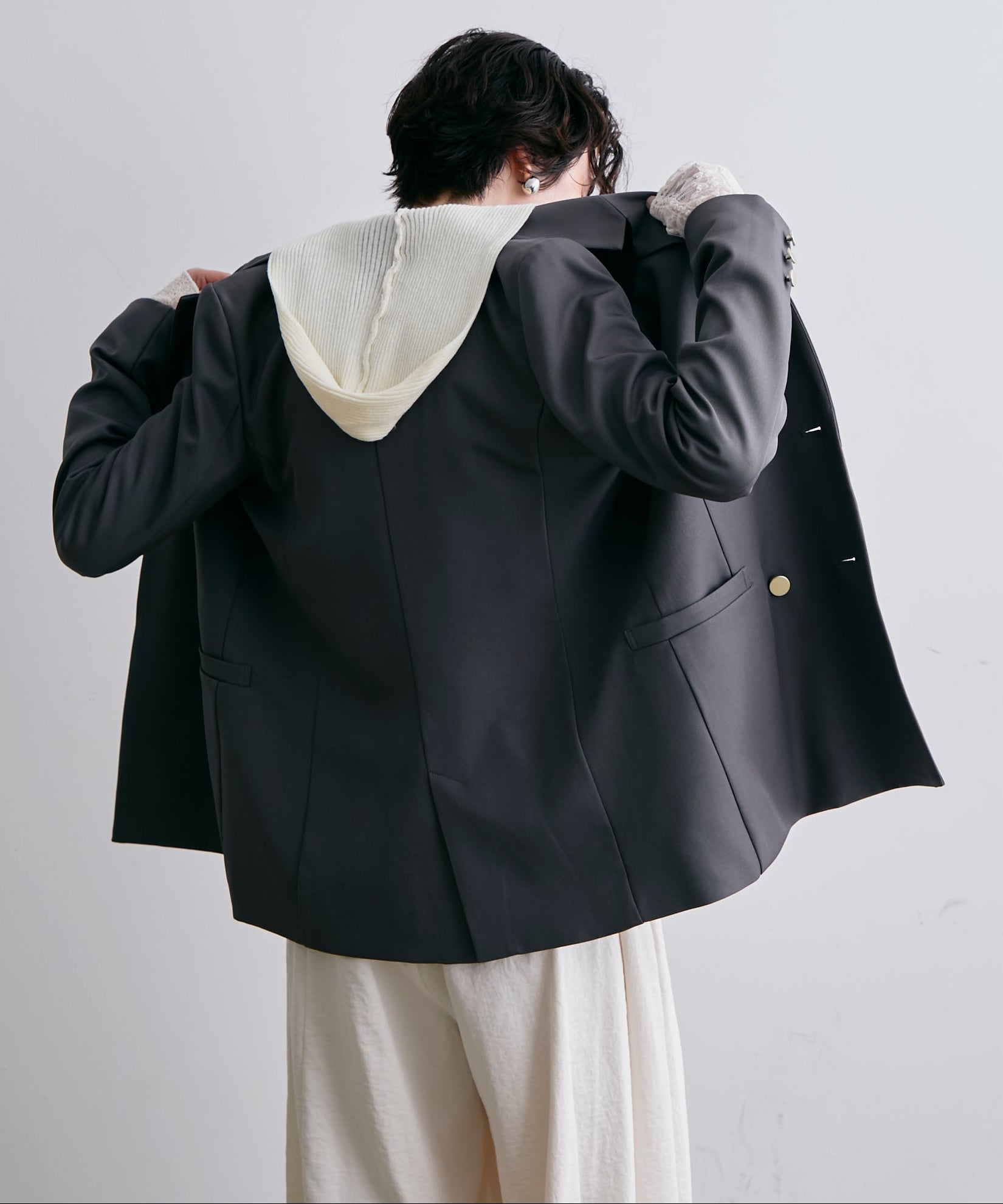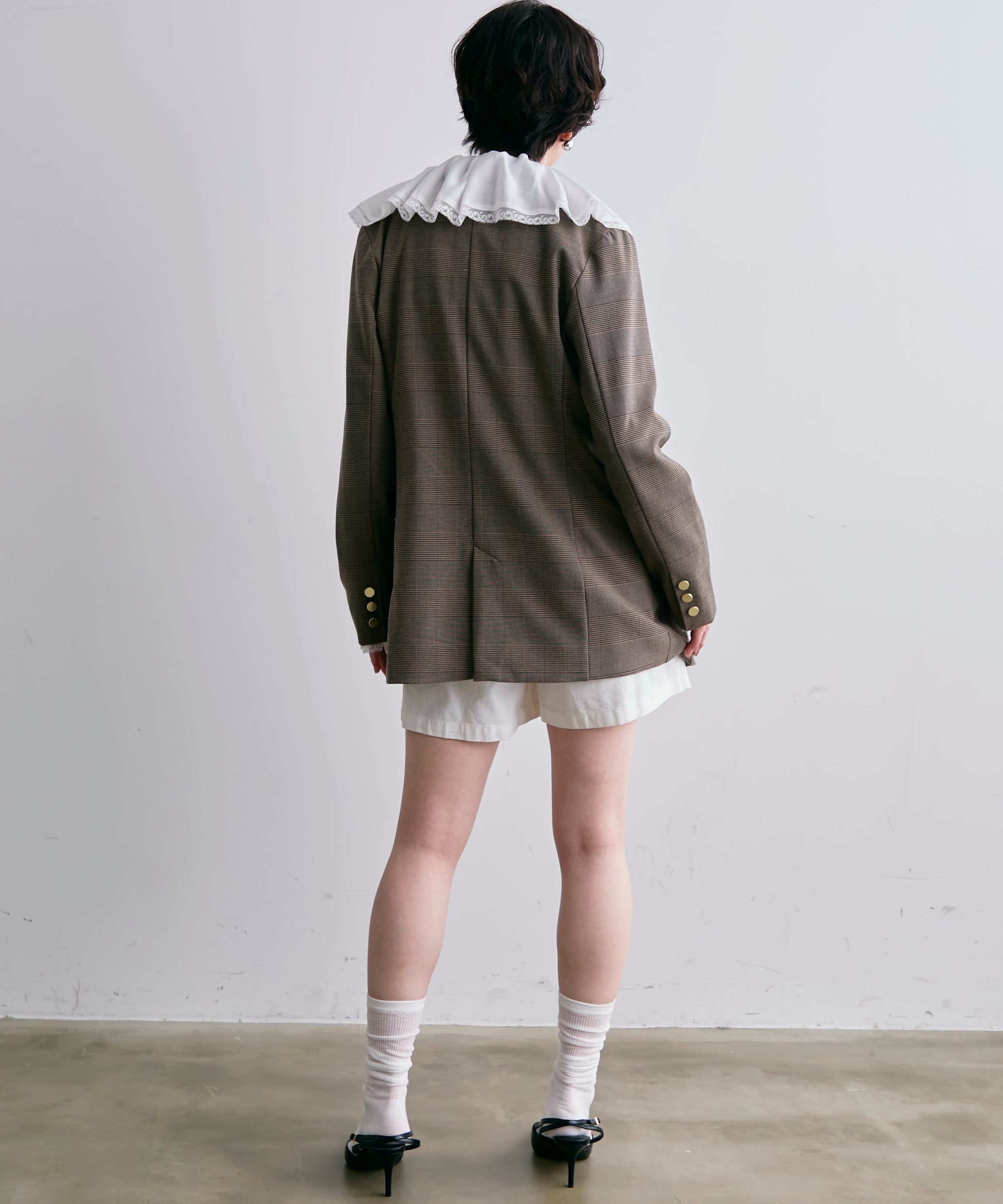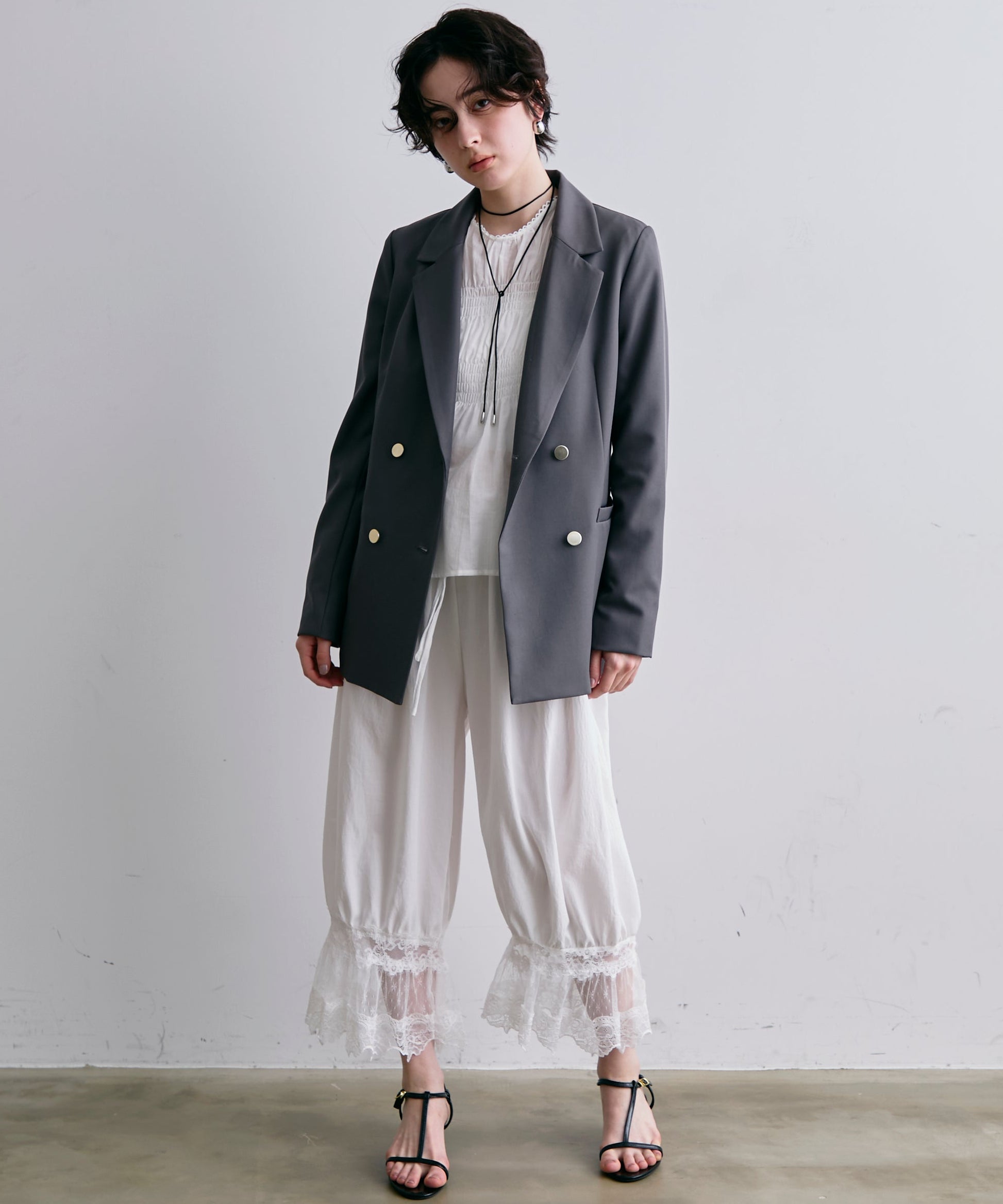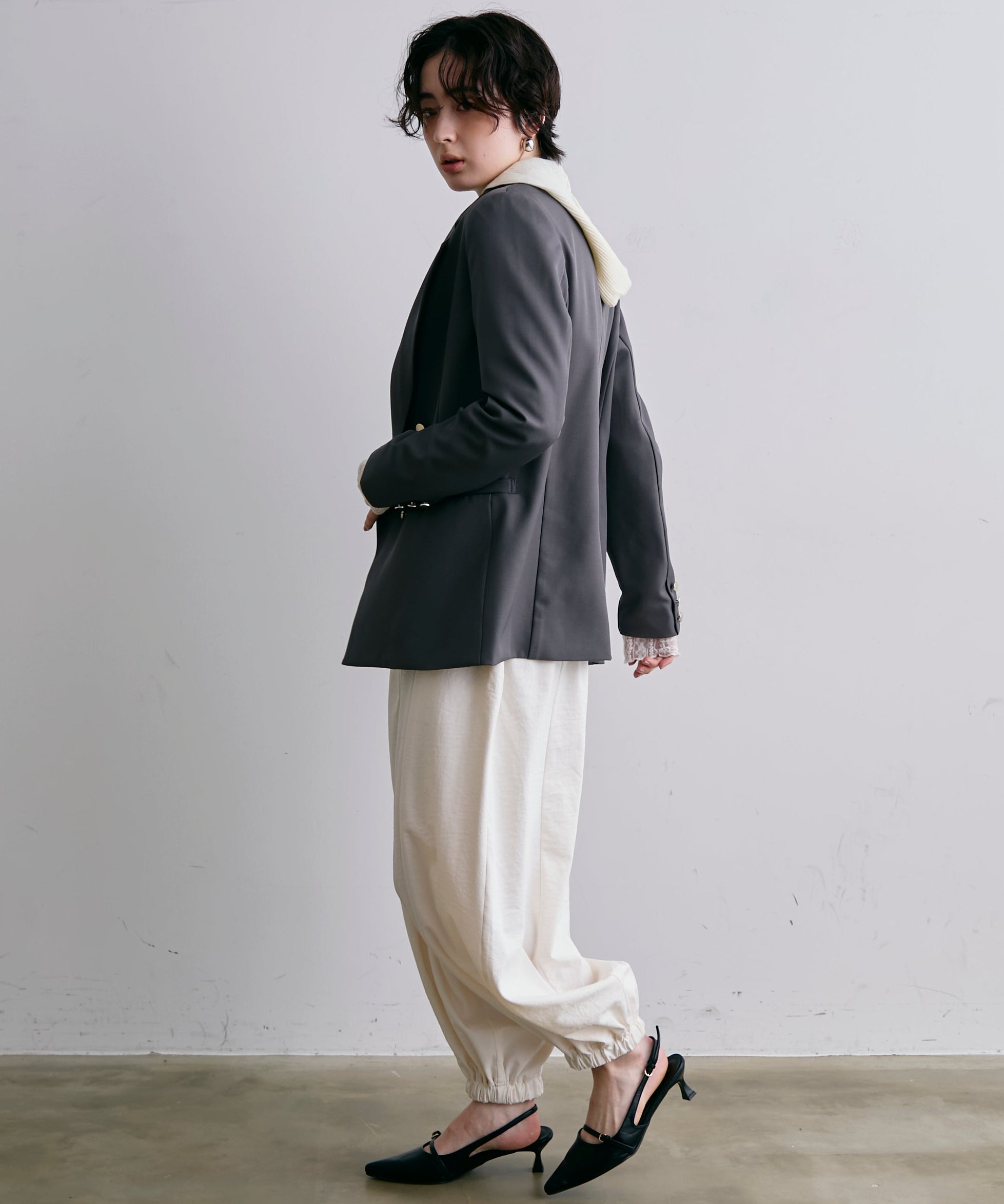 ゴールドボタンがアクセントをプラスするダブルテーラードジャケット