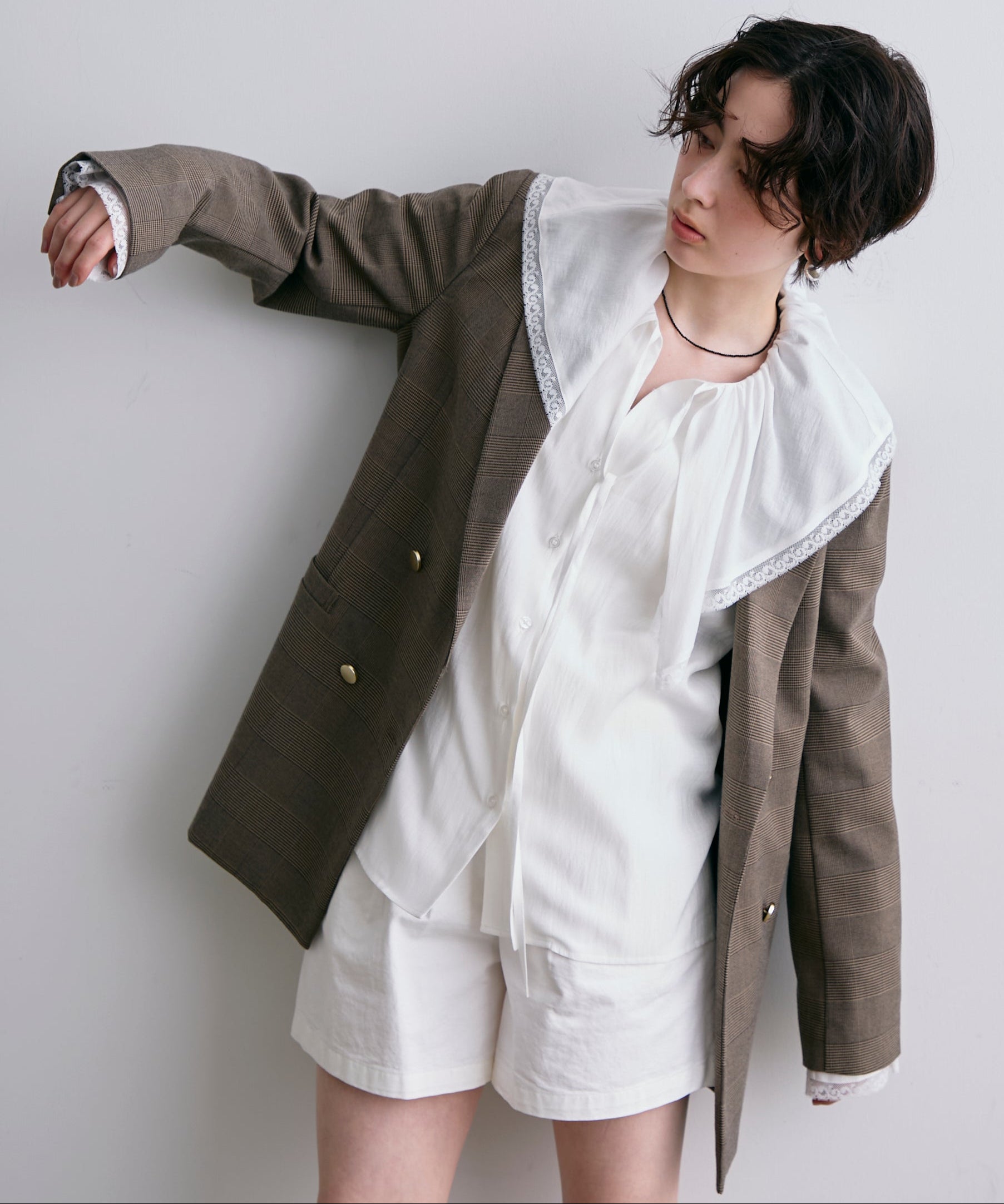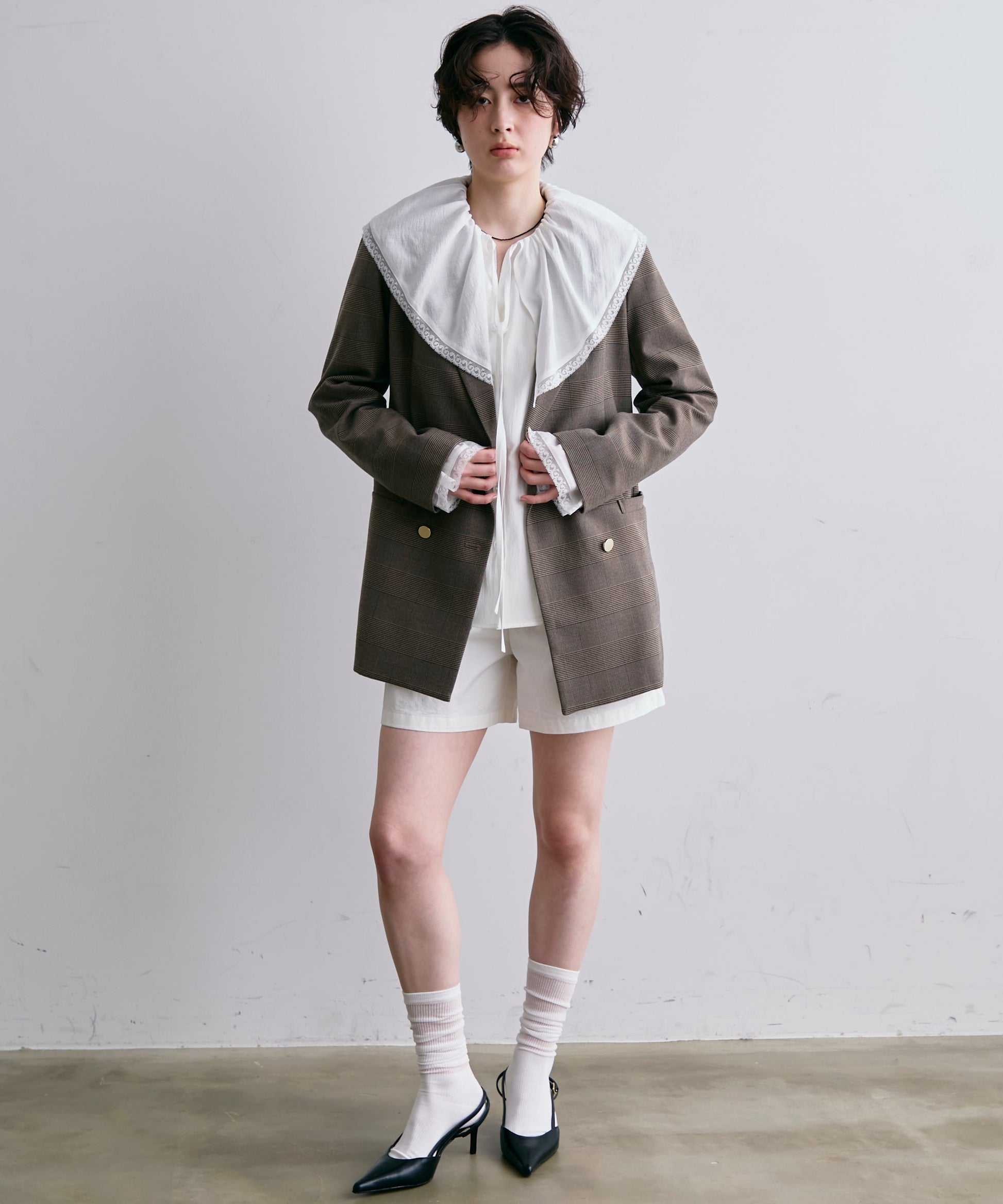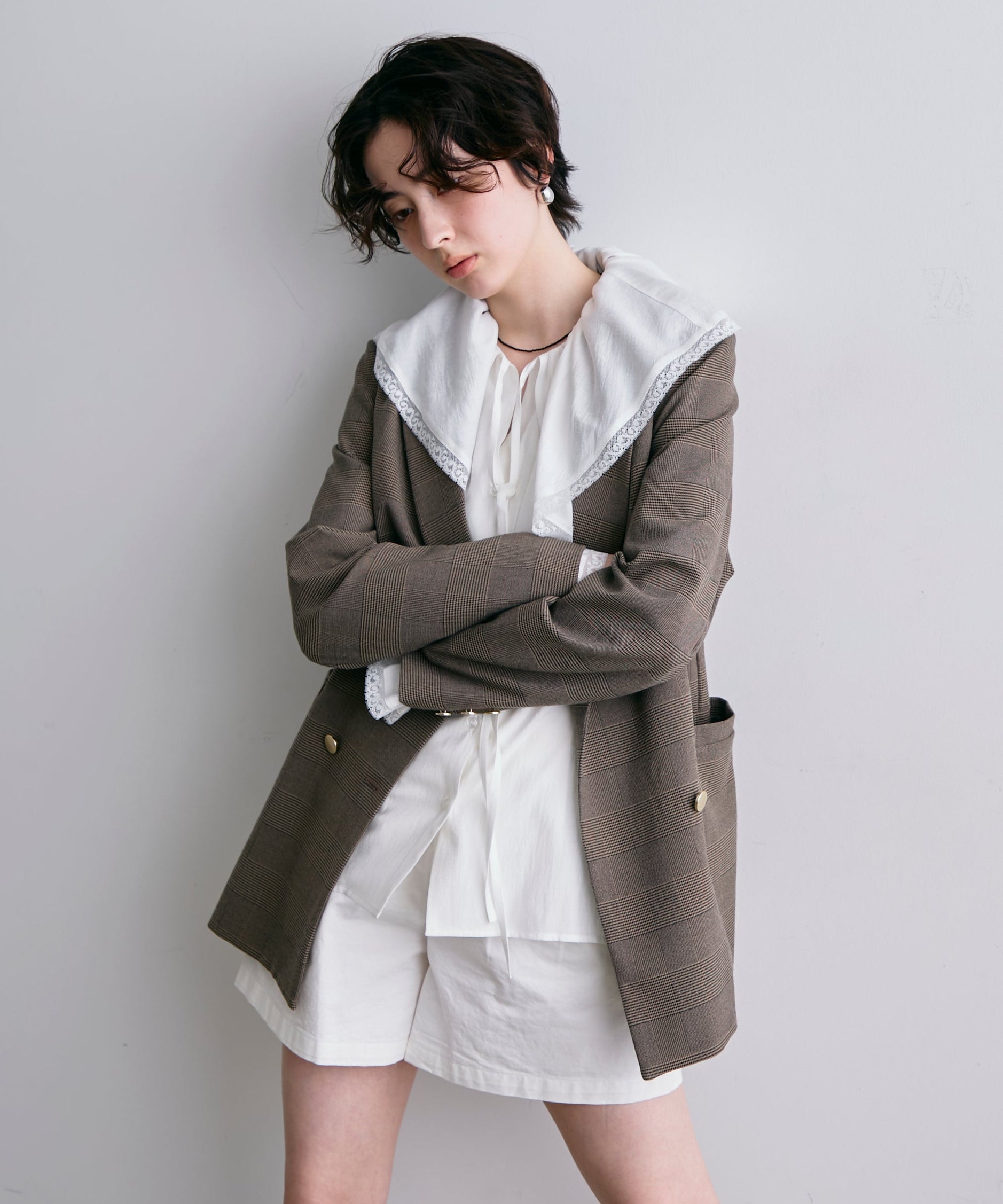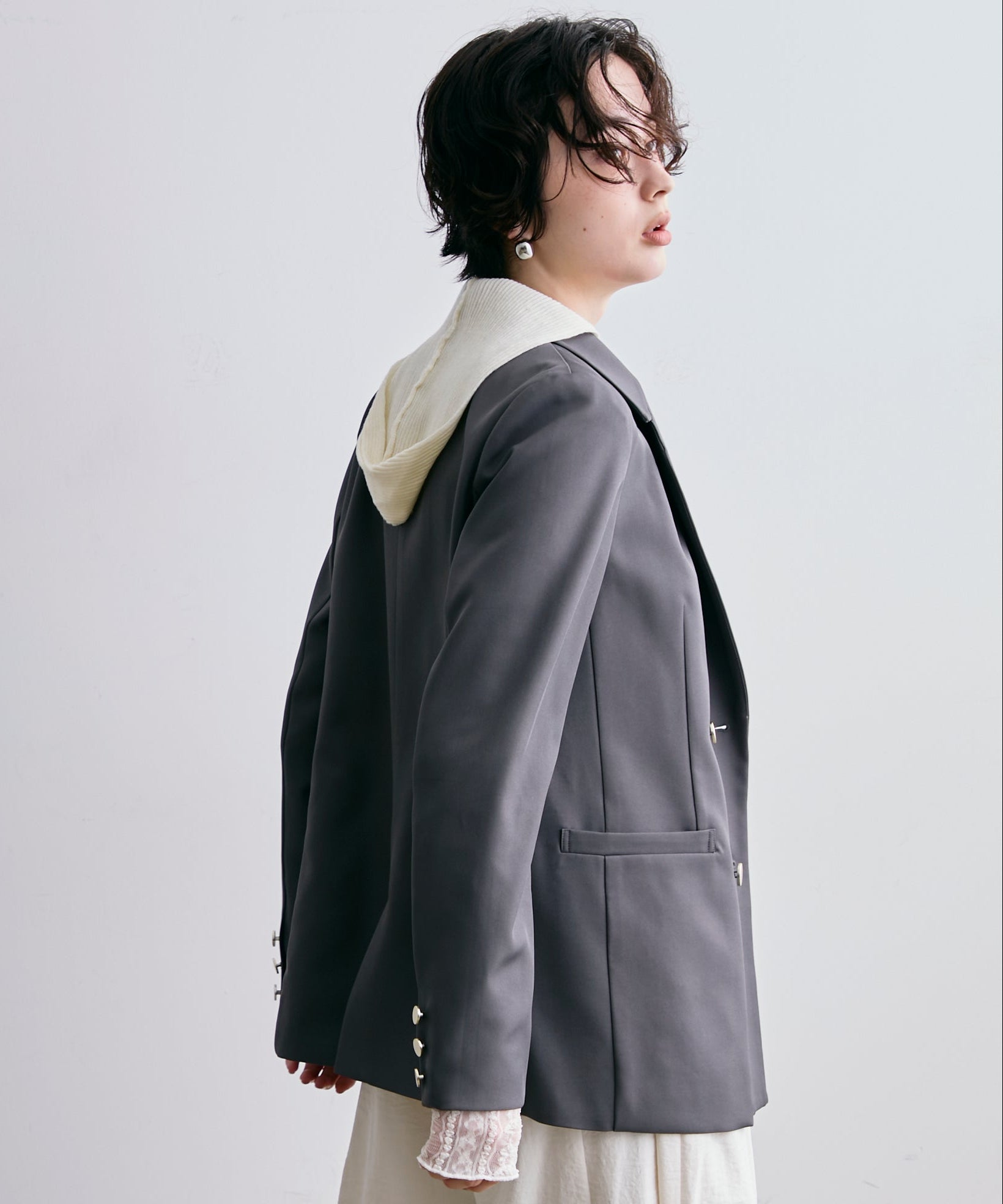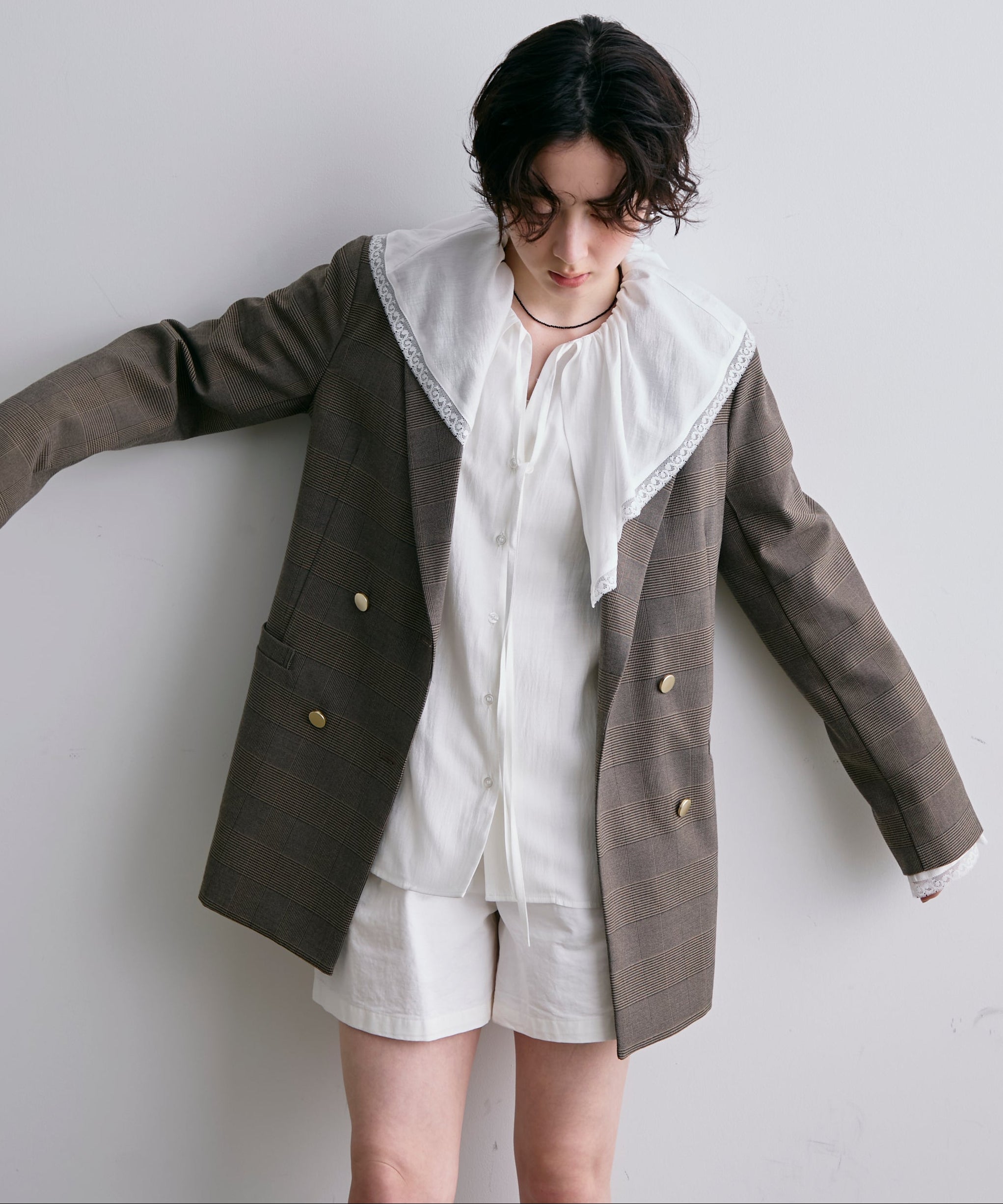 ゴールドボタンがアクセントをプラスするダブルテーラードジャケット