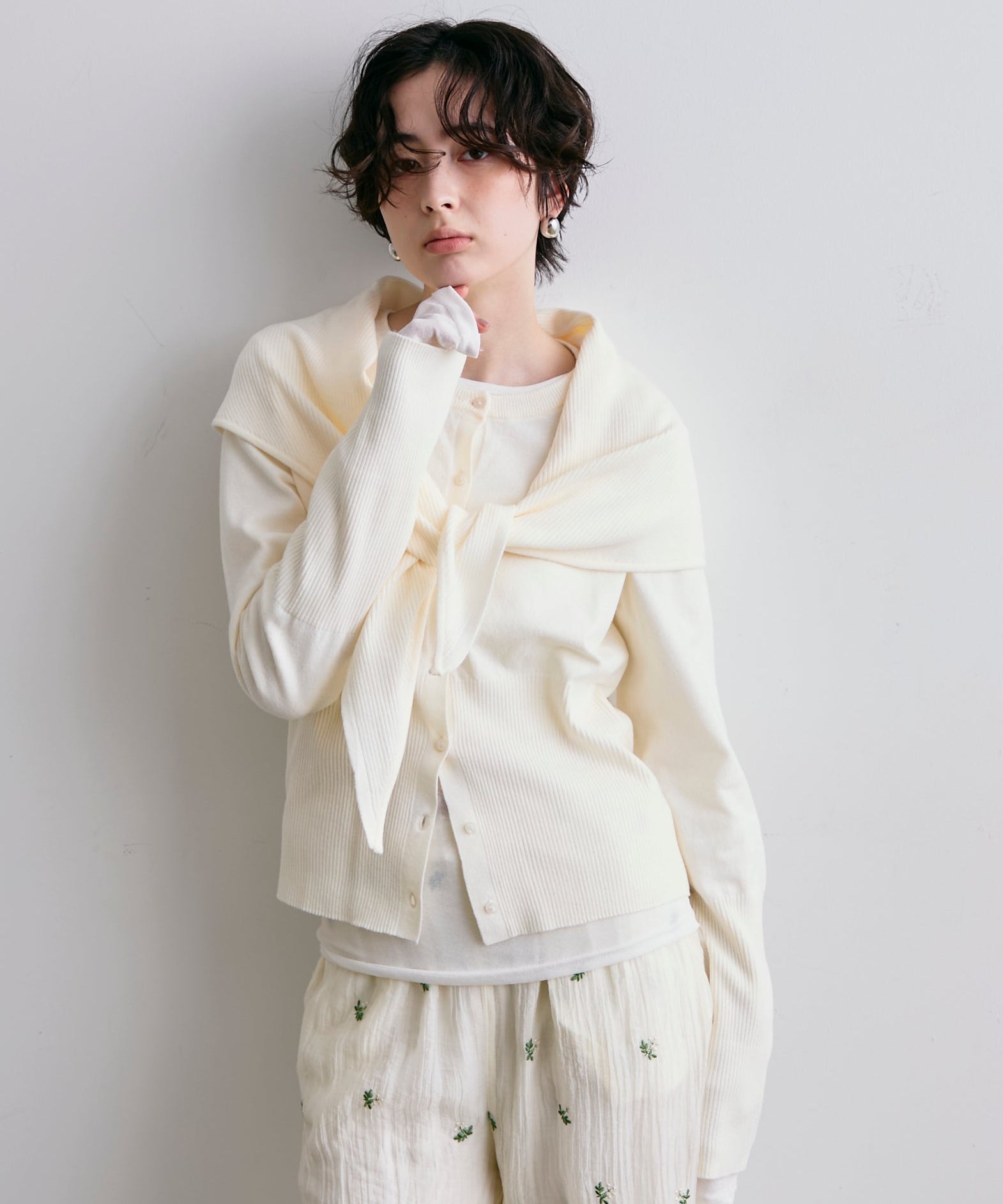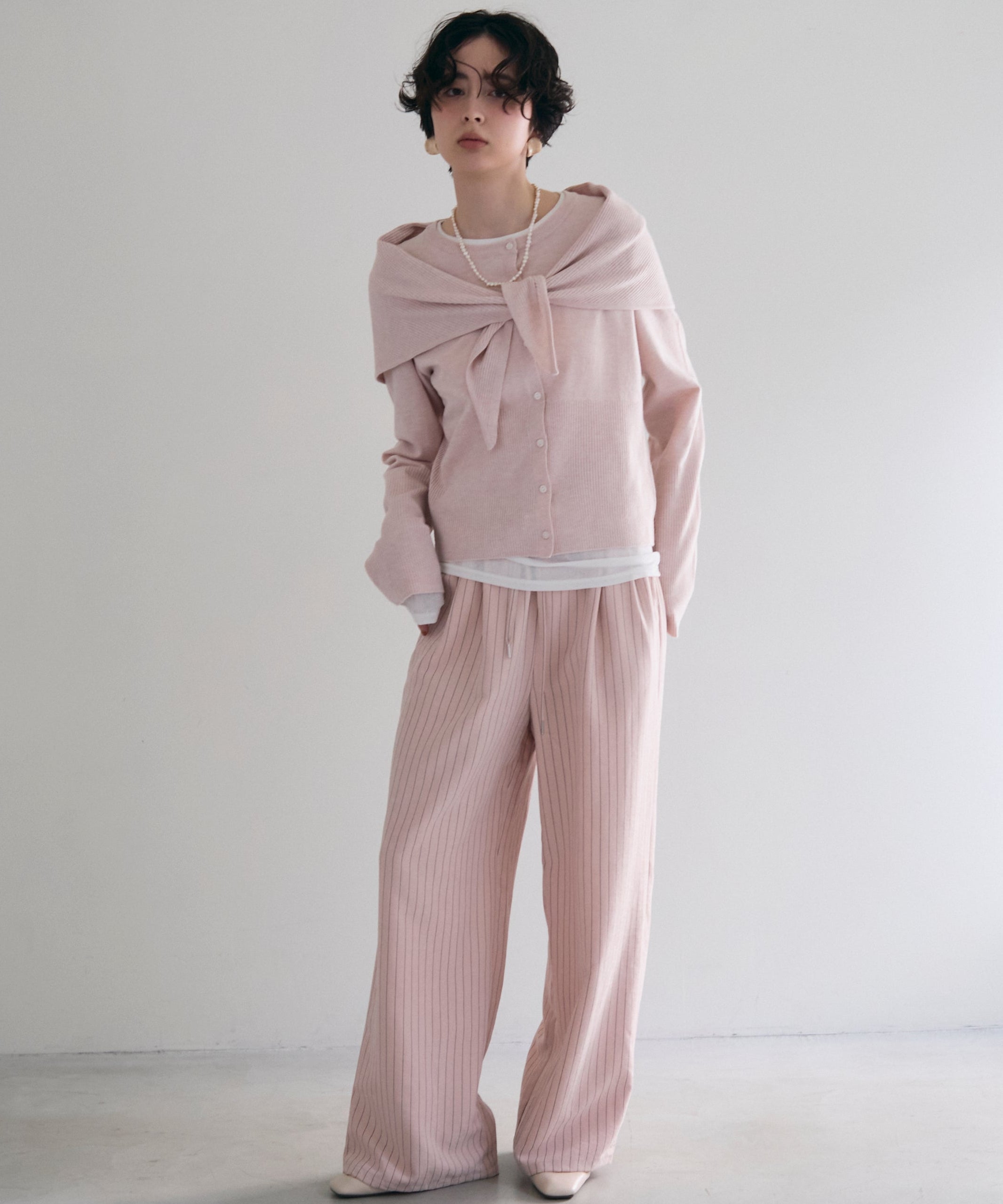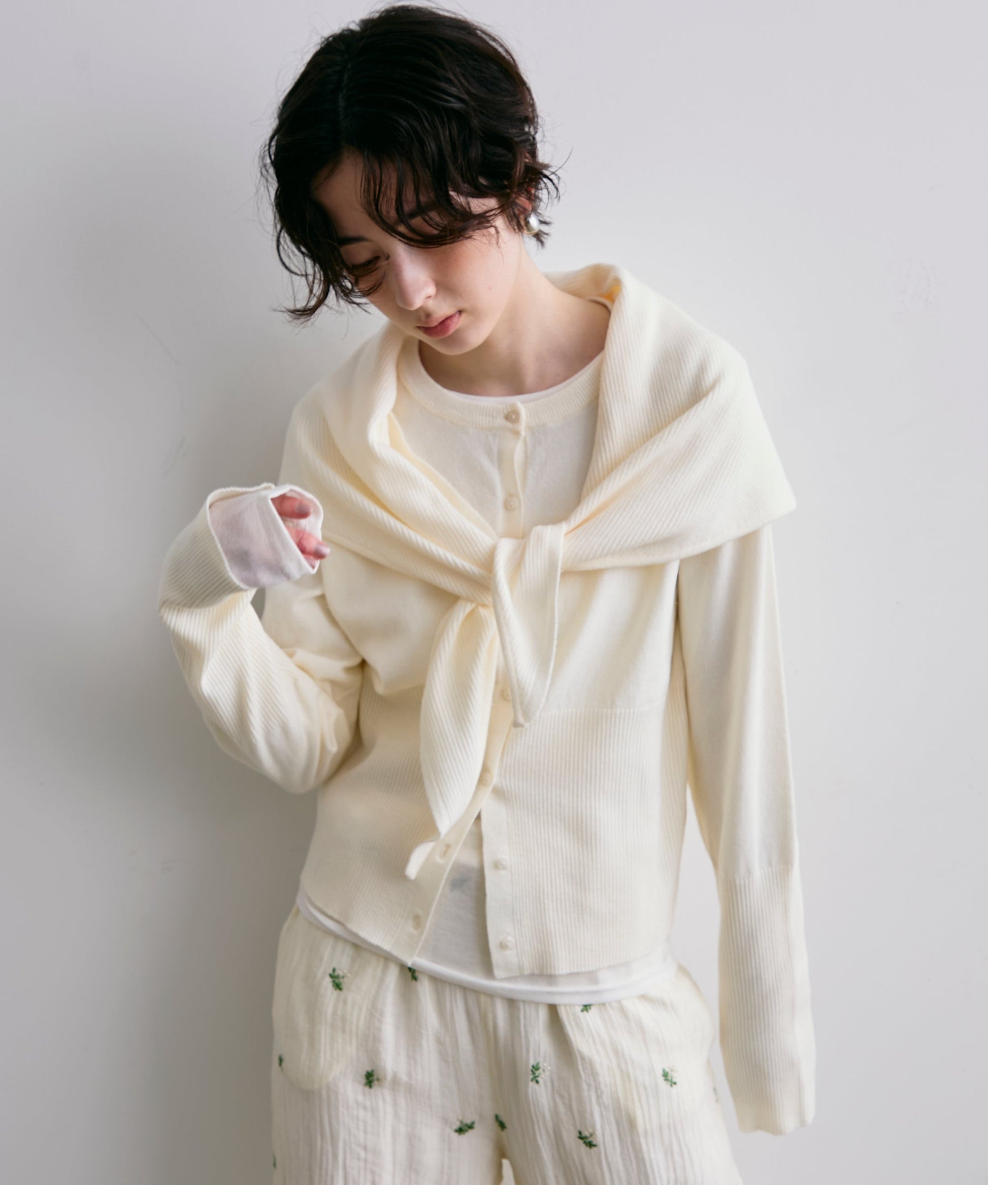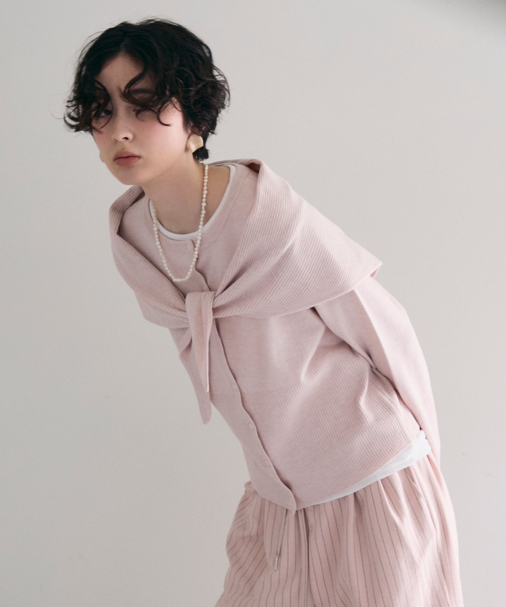 ストールは肩に掛けたり胸元や腰に巻いたりと、好みのアレンジを楽しめます。