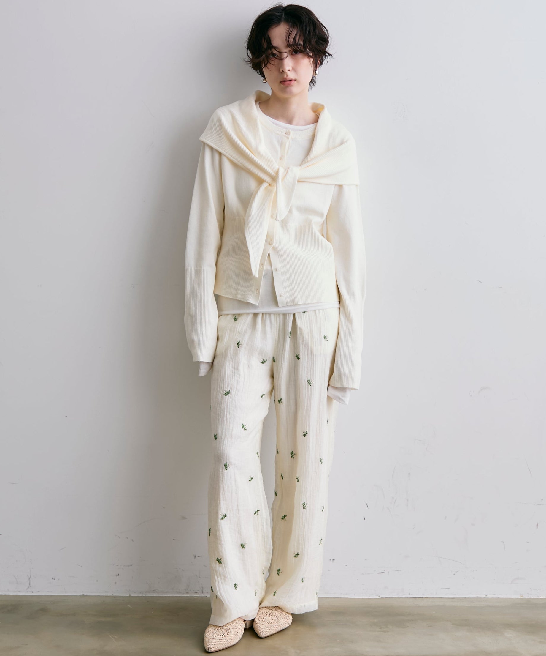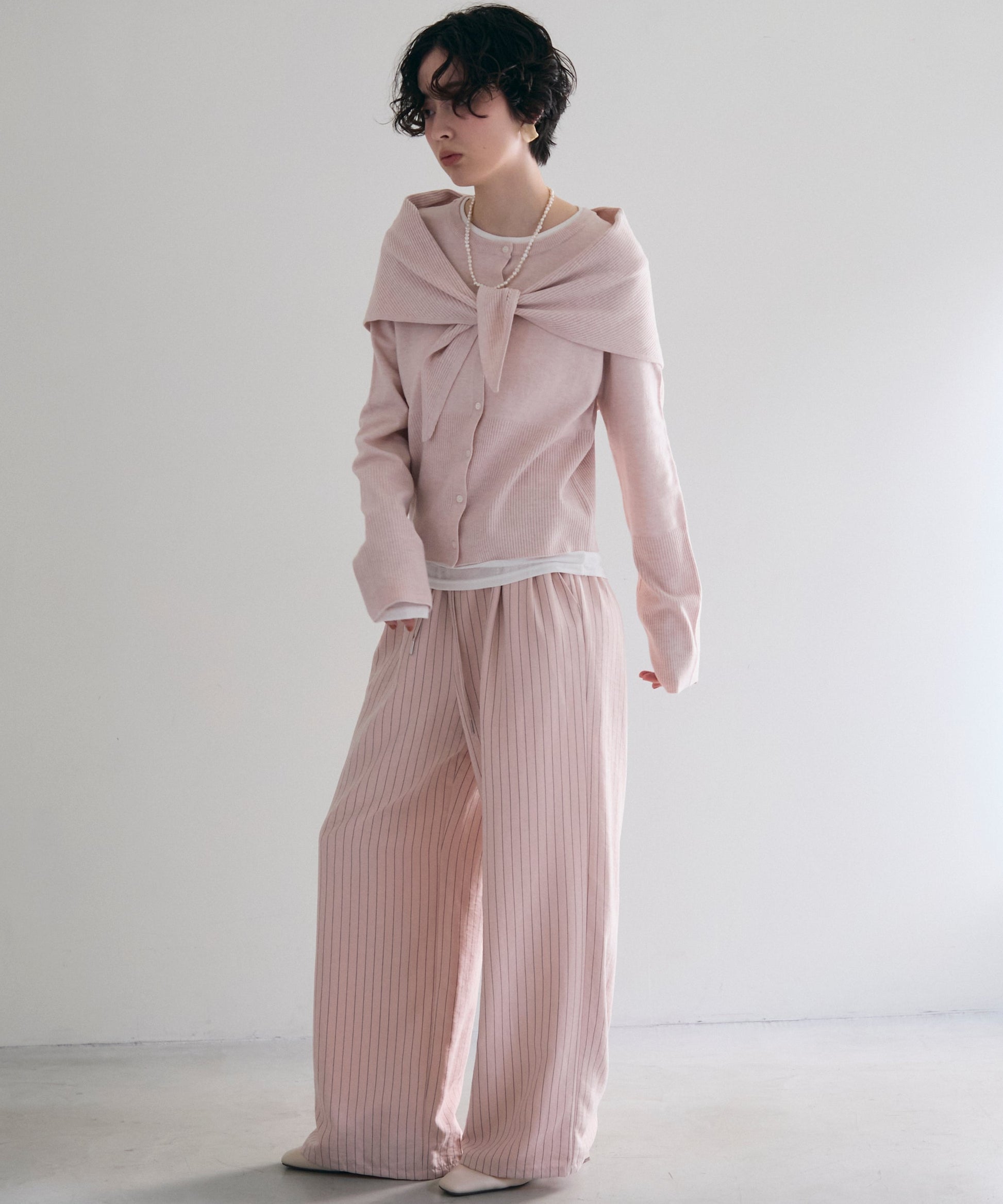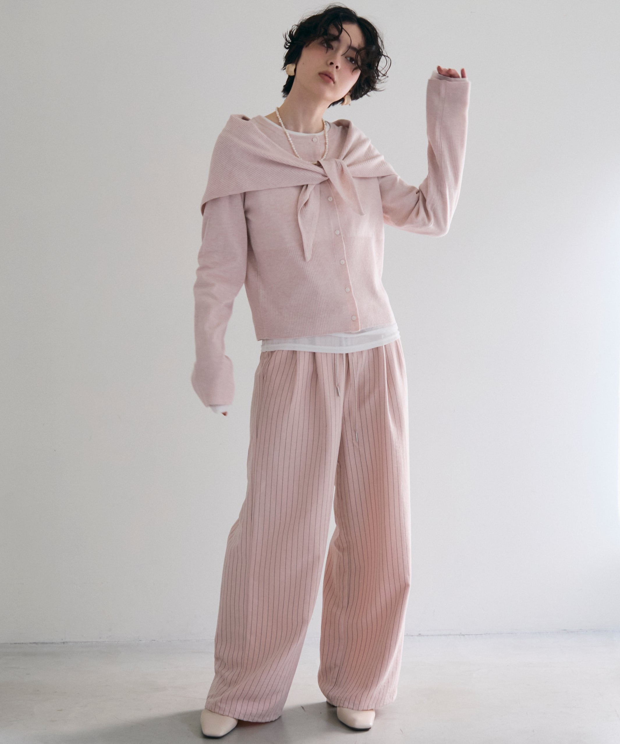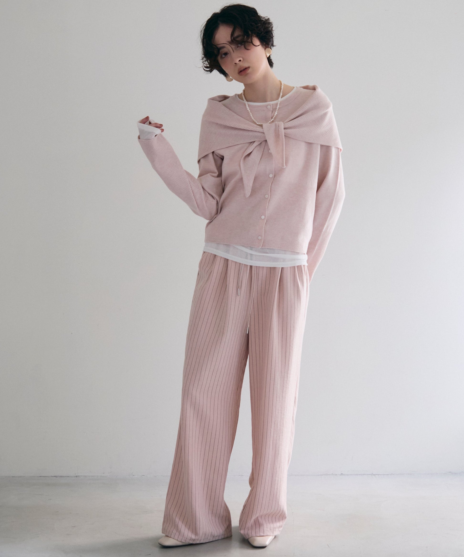 ストールは肩に掛けたり胸元や腰に巻いたりと、好みのアレンジを楽しめます。