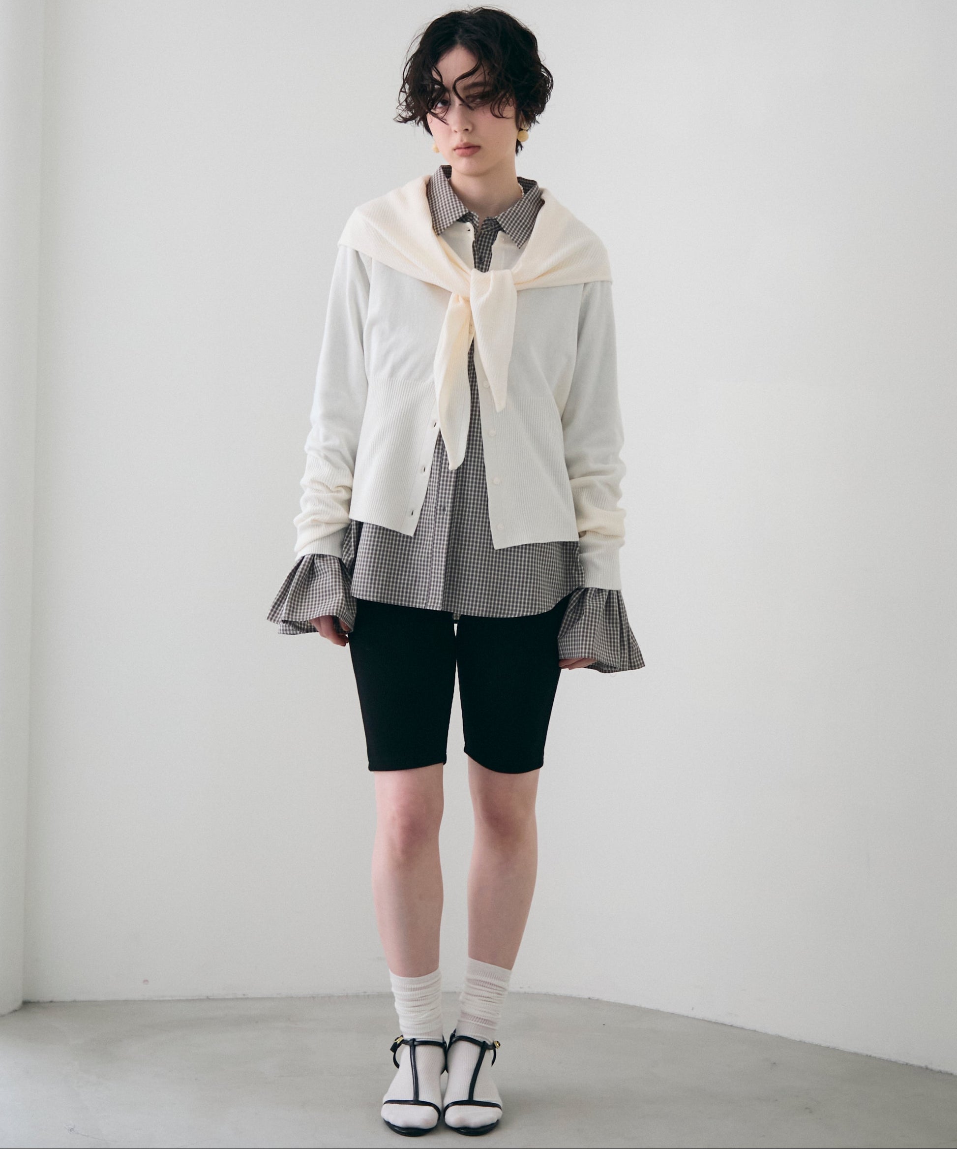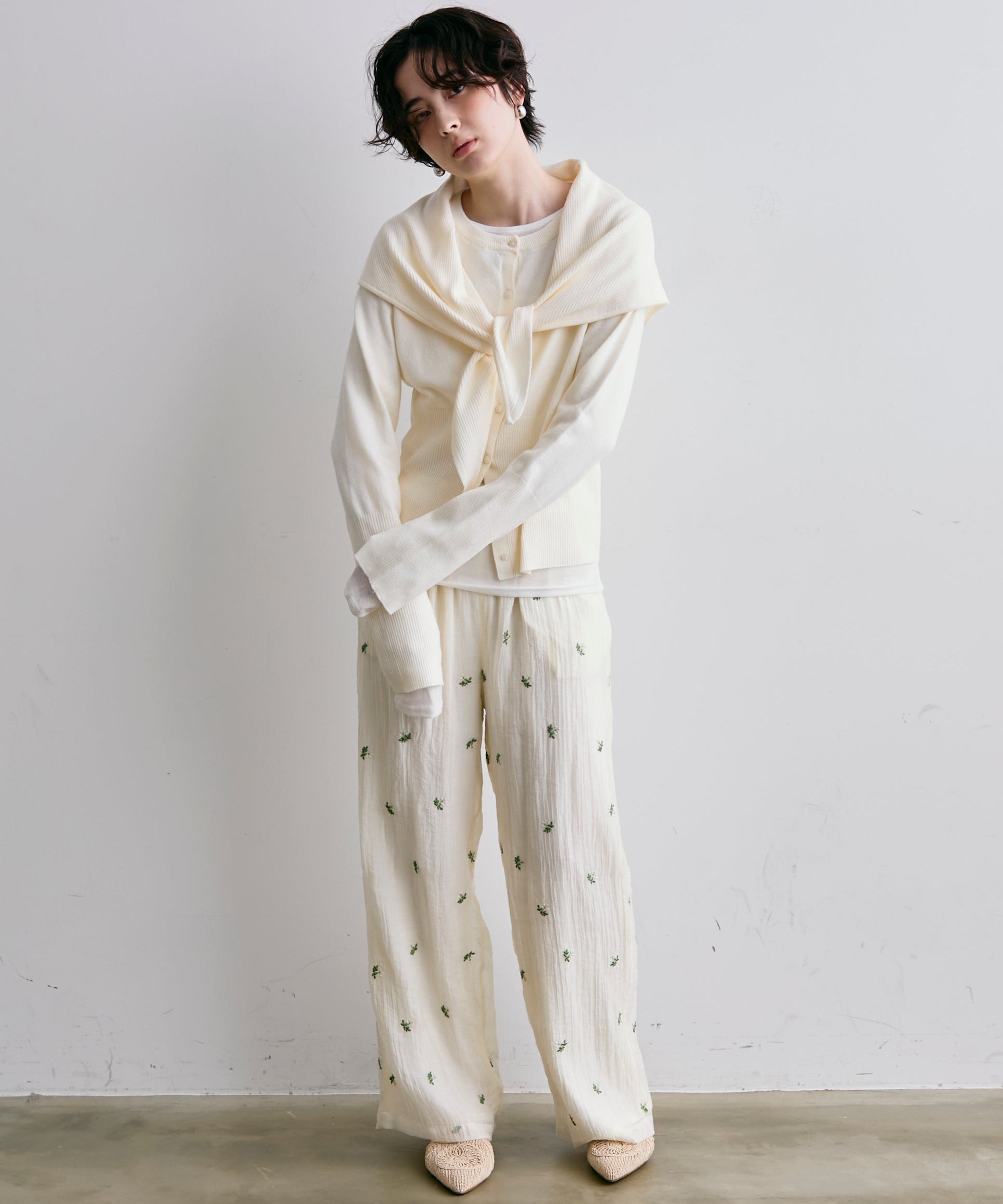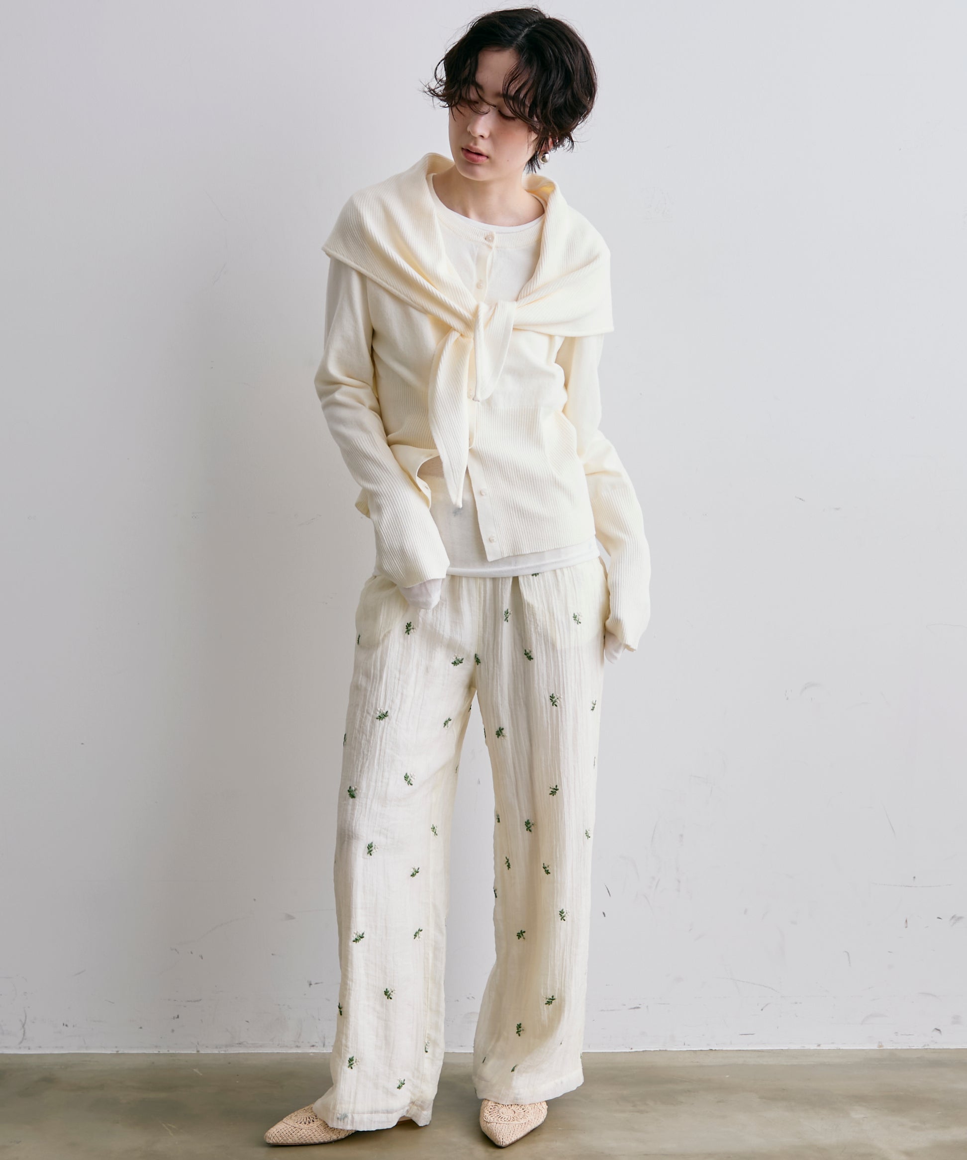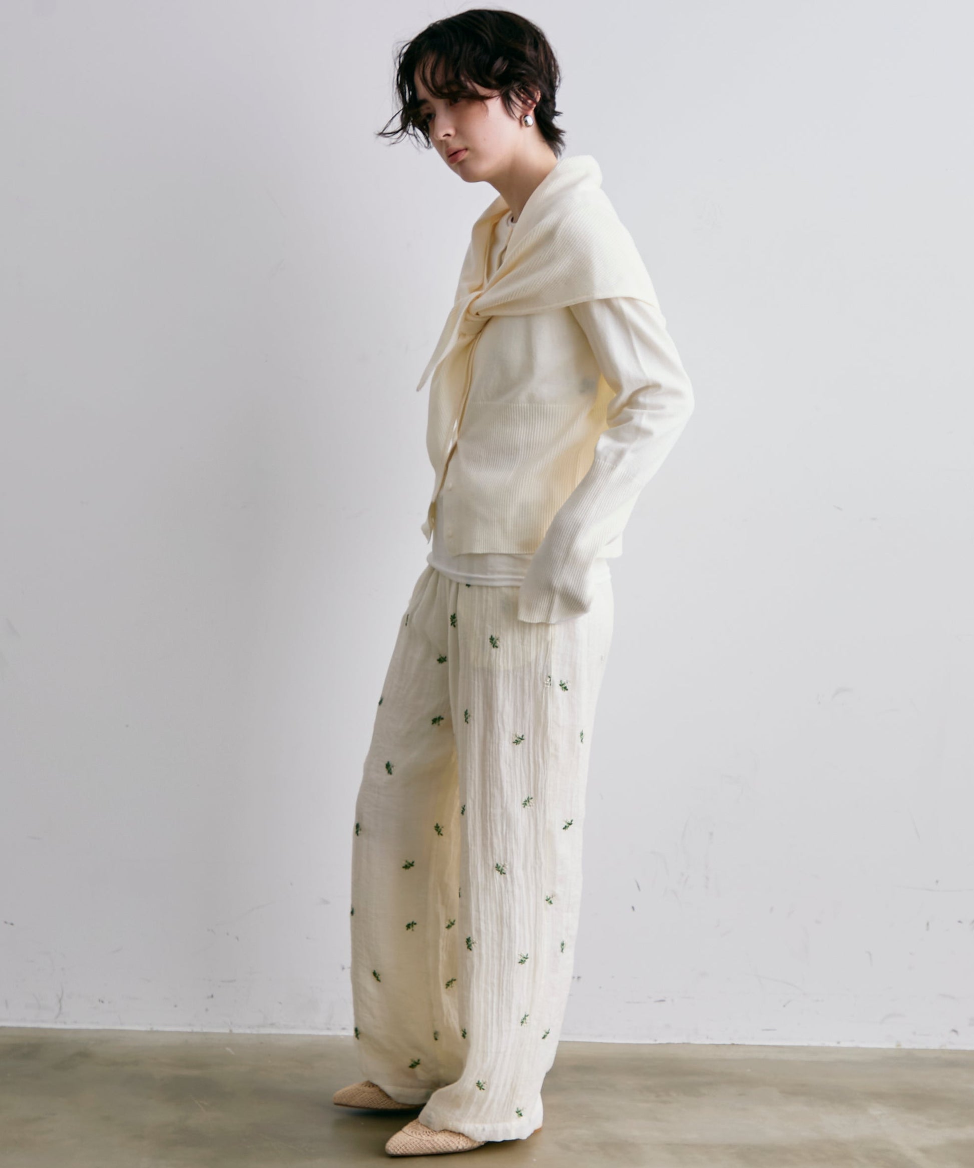ストールは肩に掛けたり胸元や腰に巻いたりと、好みのアレンジを楽しめます。