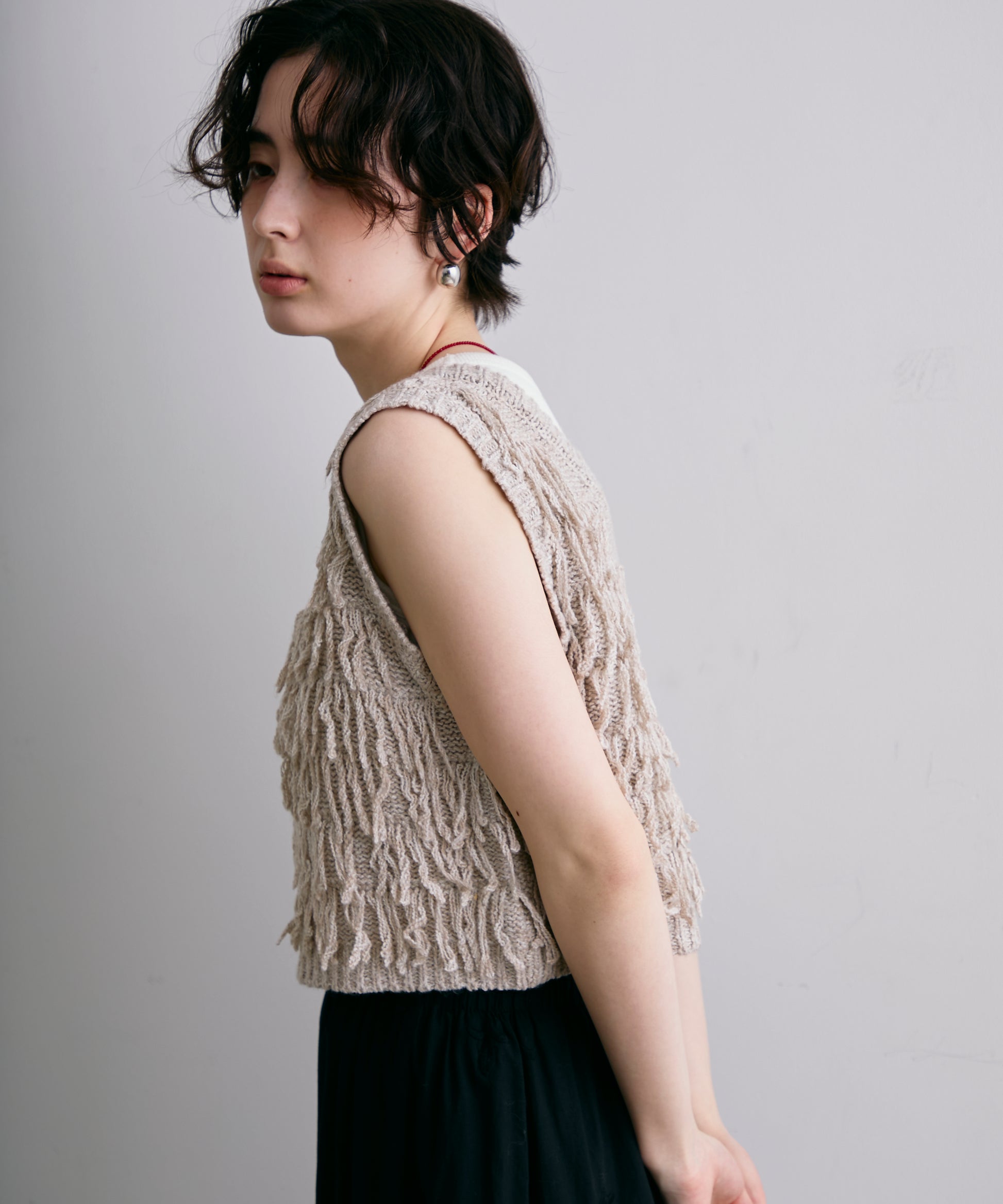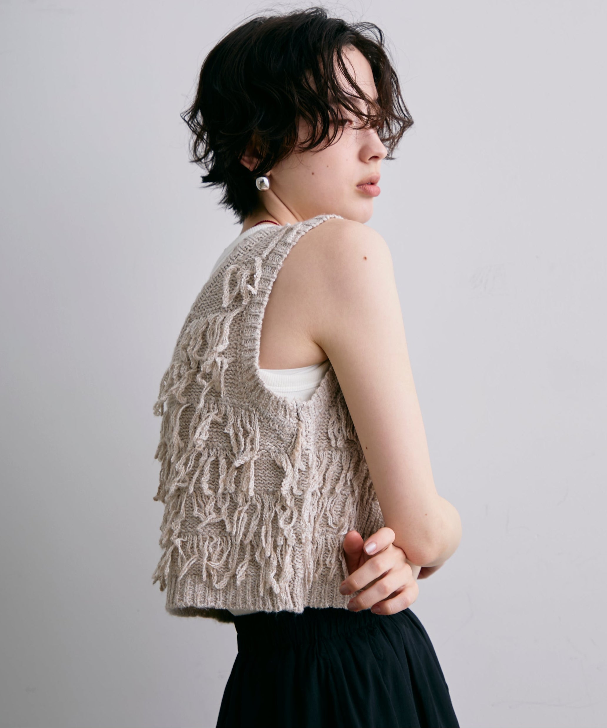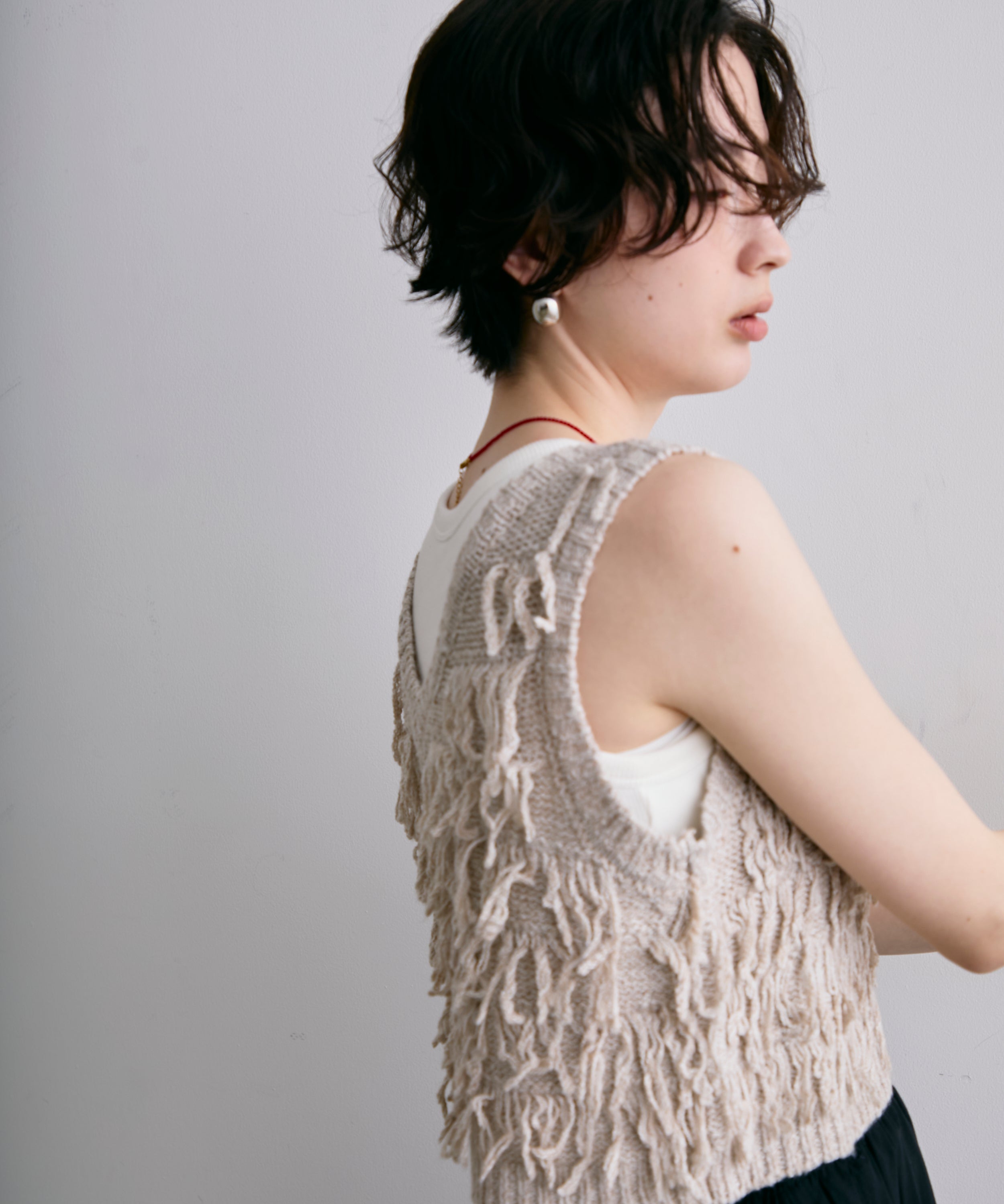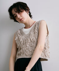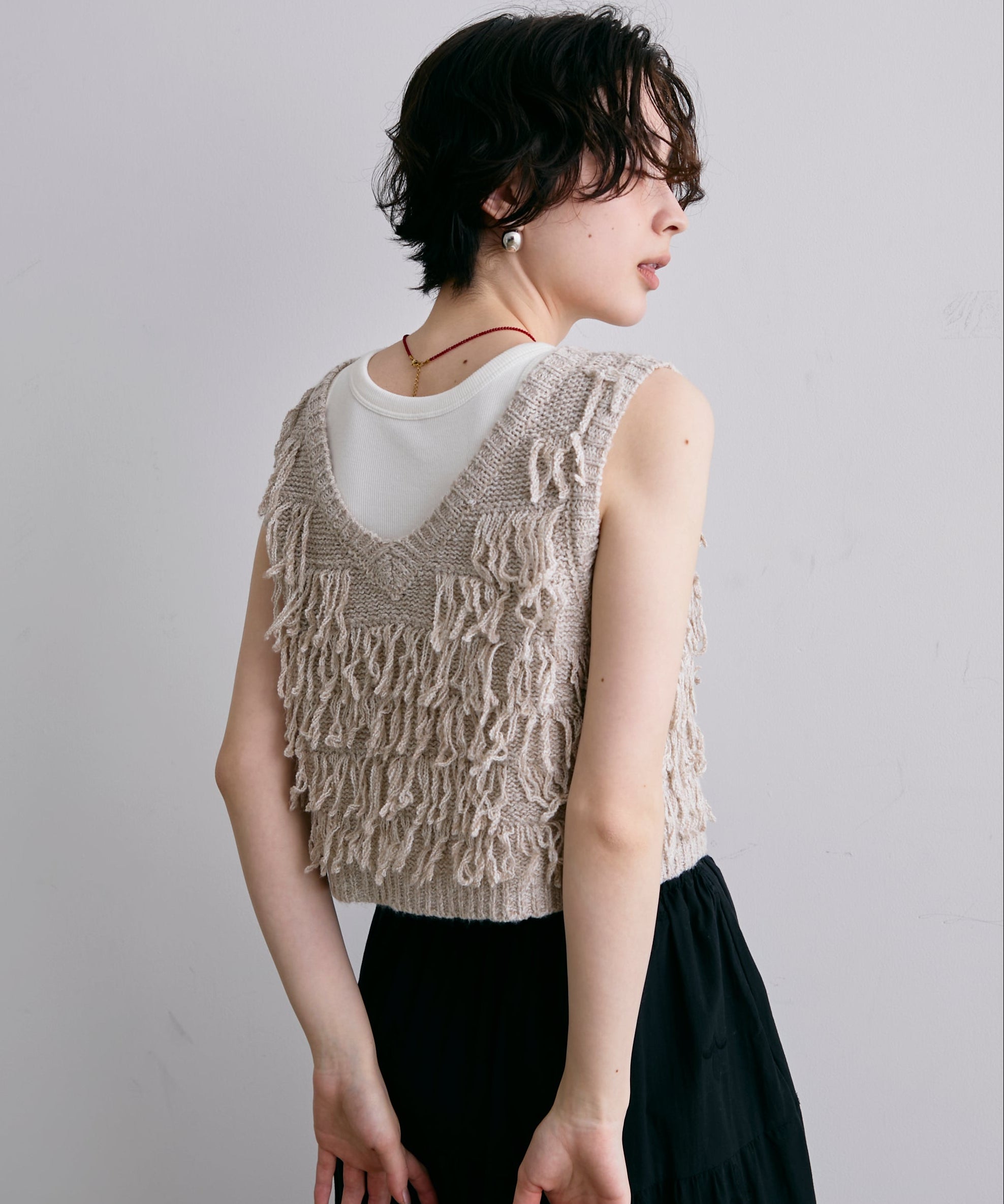 表情豊かなフリンジデザインが目を惹くニットベスト。程よい厚みのニット素材で、レイヤードスタイルに取り入れやすい一枚です。シンプルなトップスに重ねるだけで、コーディネートに動きとトレンド感をプラス。季節の変わり目にはもちろん、ロングシーズン活躍するアイテムです。