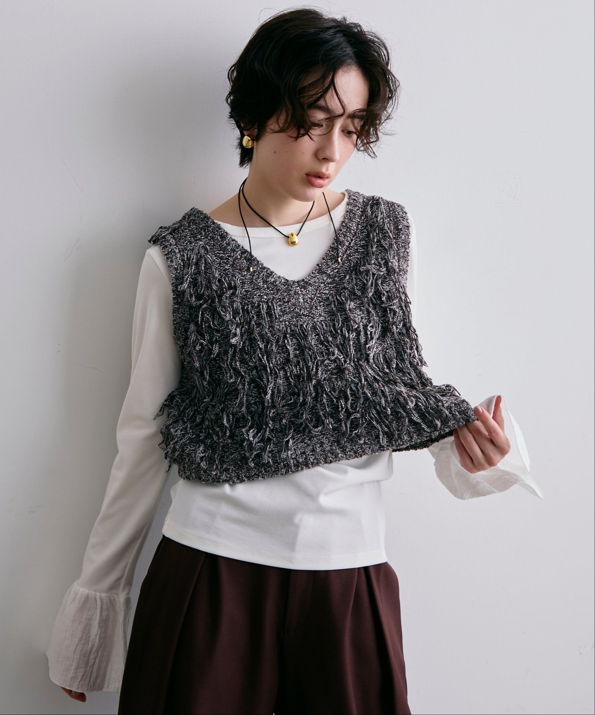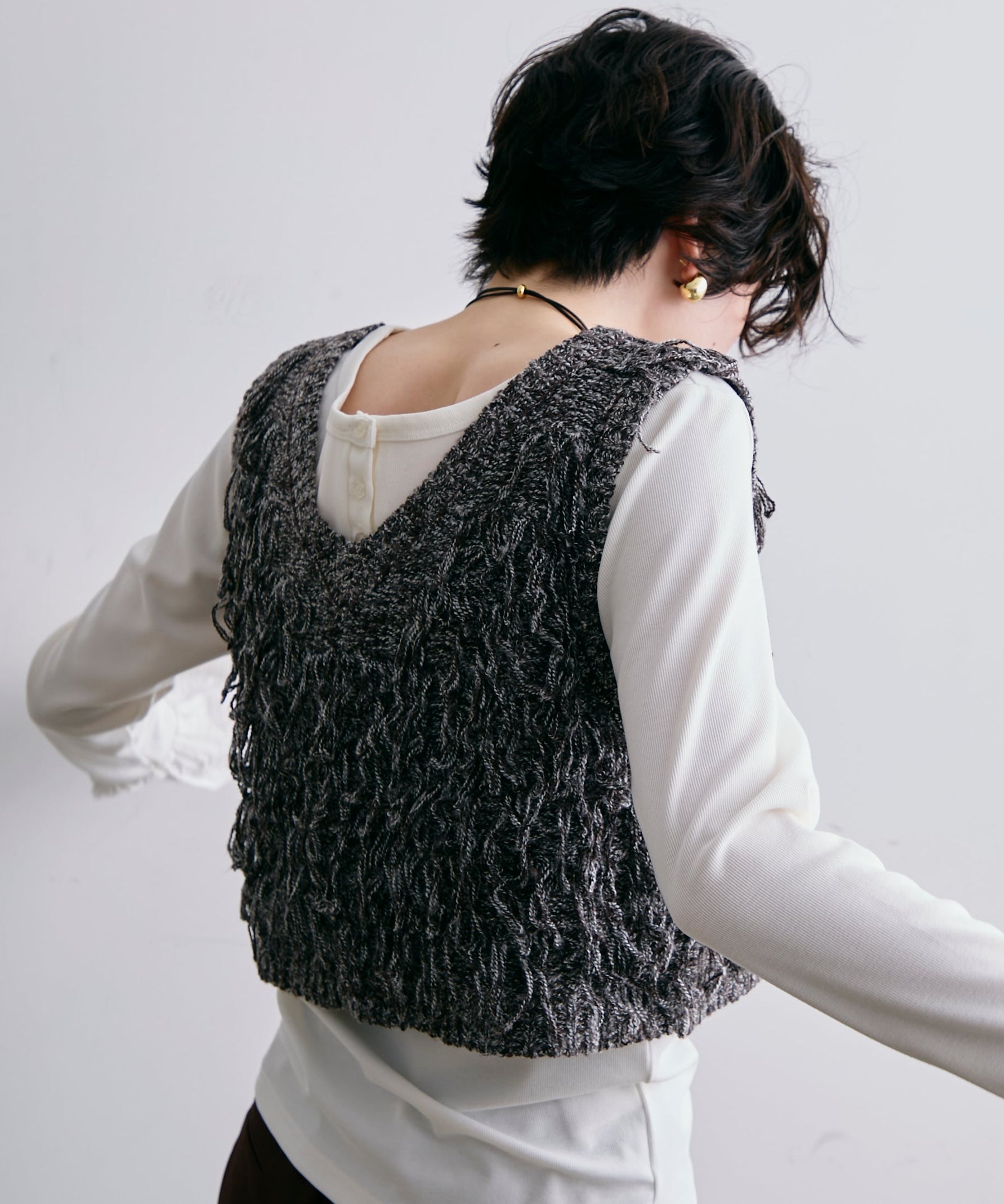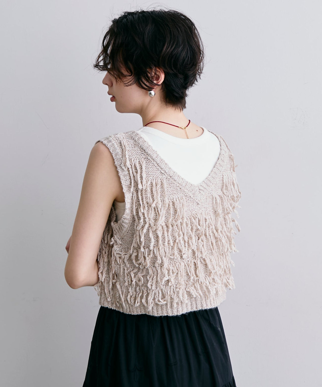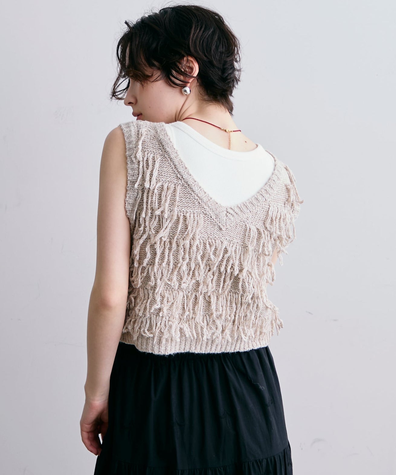 表情豊かなフリンジデザインが目を惹くニットベスト。程よい厚みのニット素材で、レイヤードスタイルに取り入れやすい一枚です。シンプルなトップスに重ねるだけで、コーディネートに動きとトレンド感をプラス。季節の変わり目にはもちろん、ロングシーズン活躍するアイテムです。