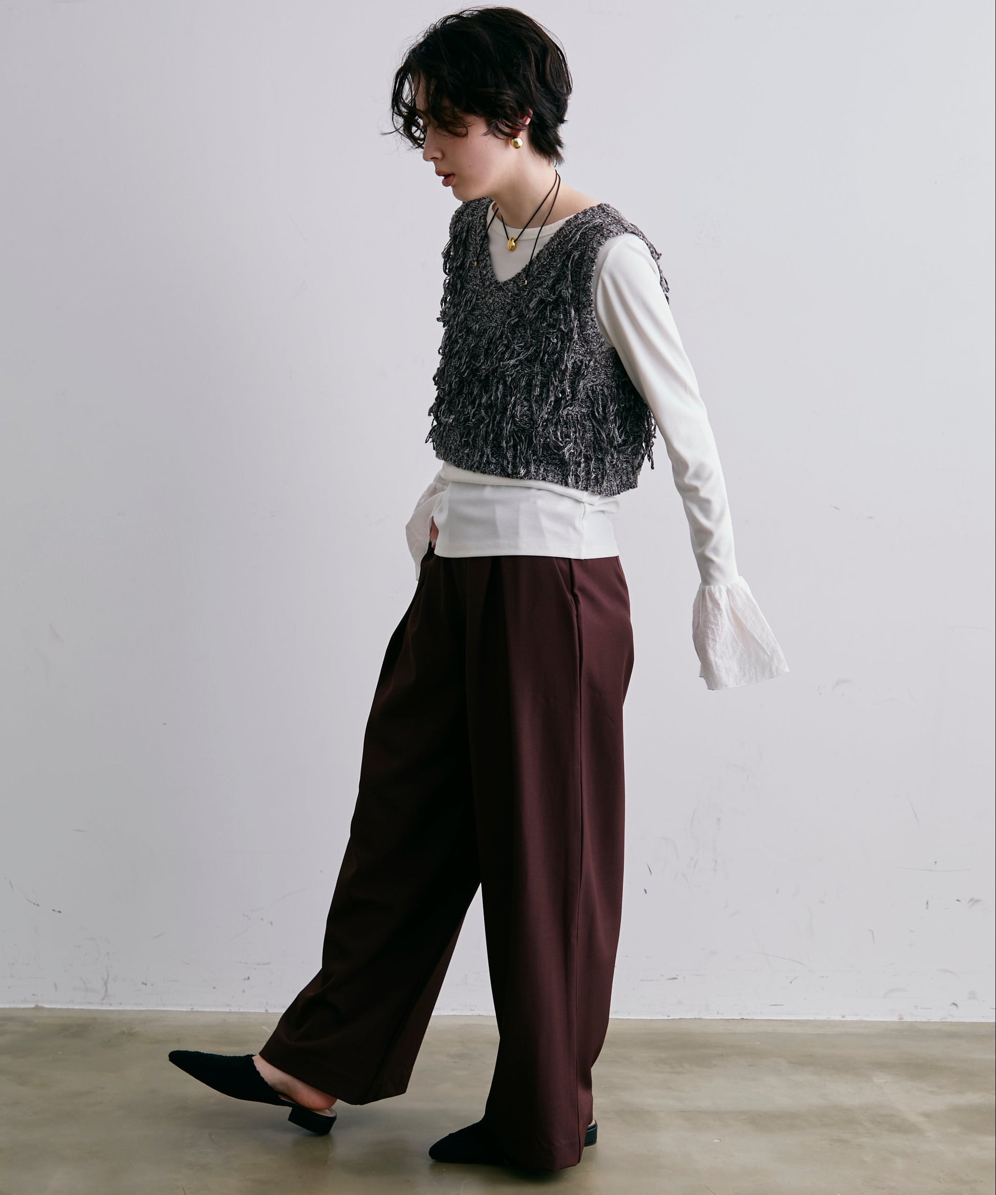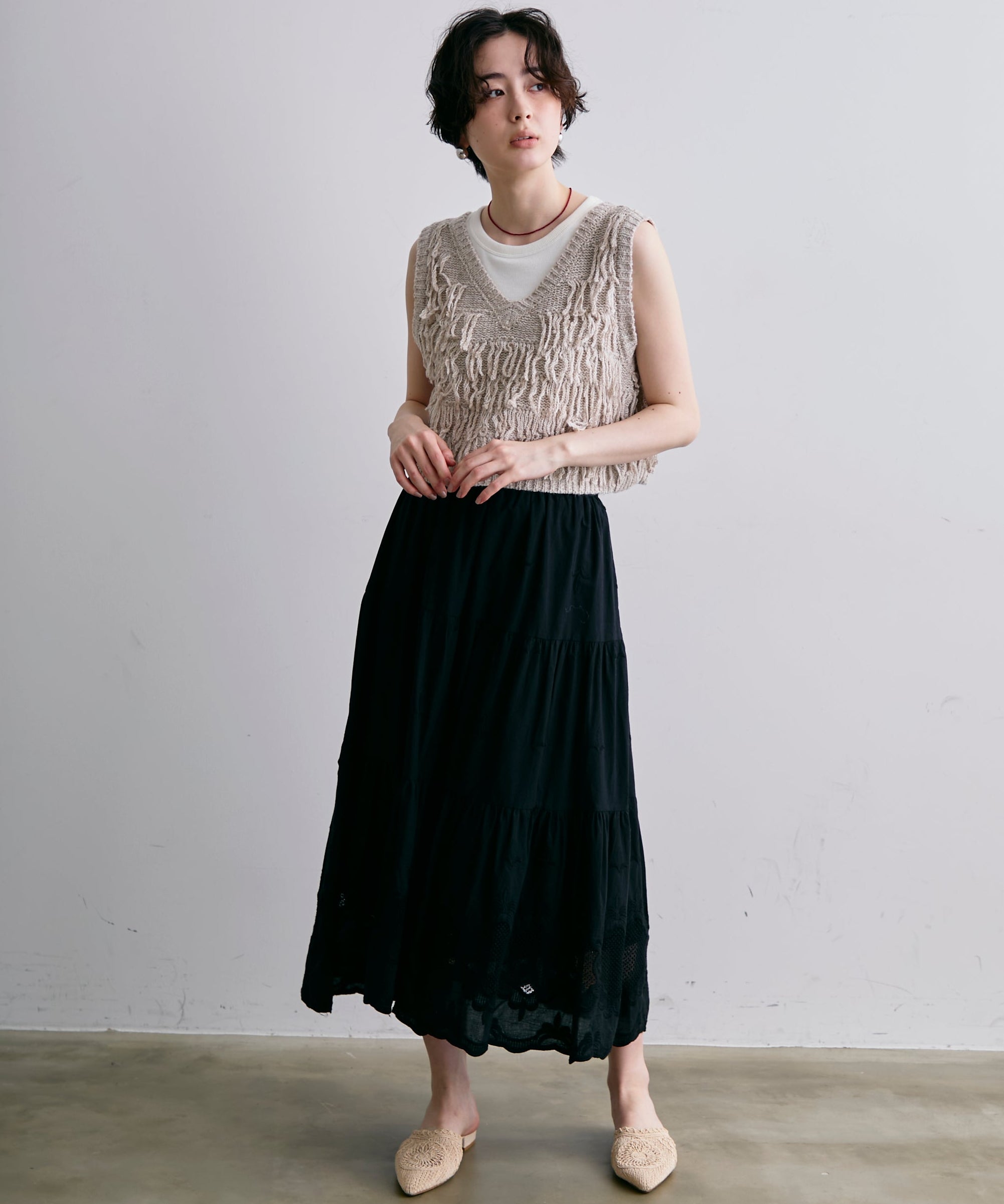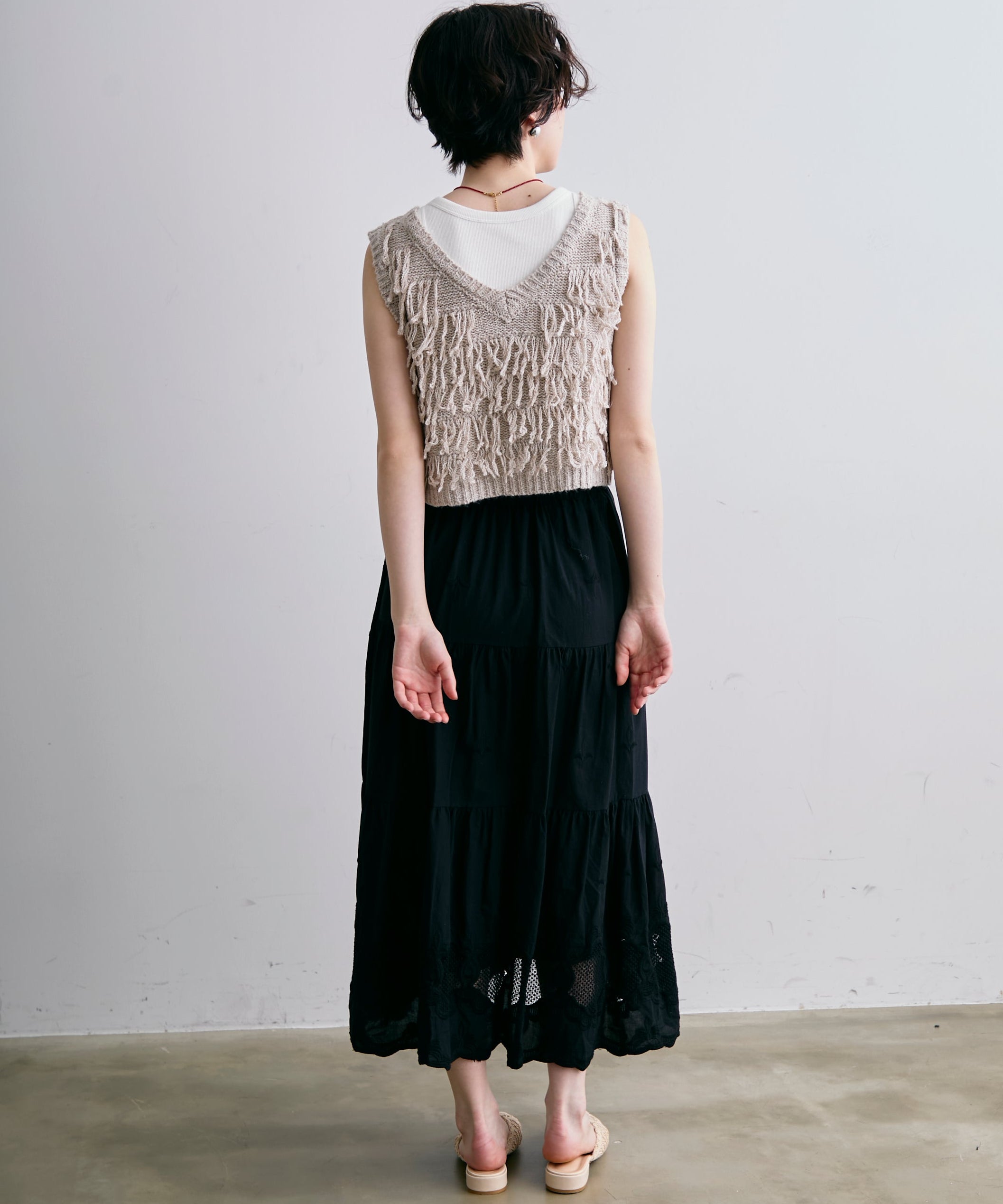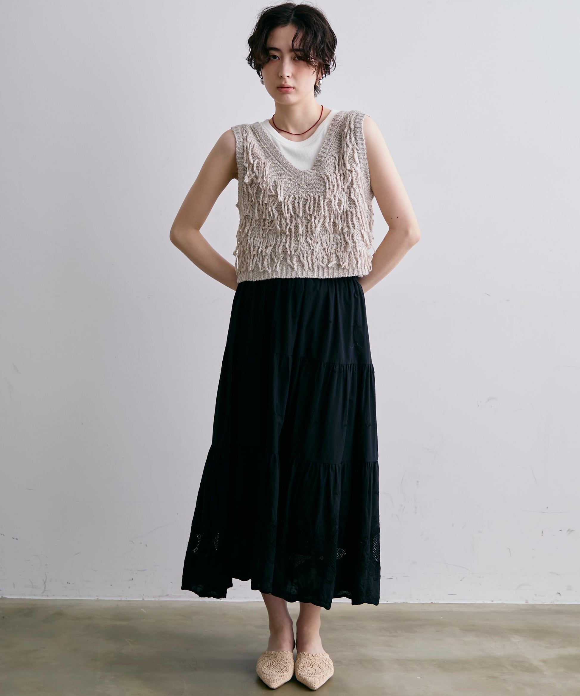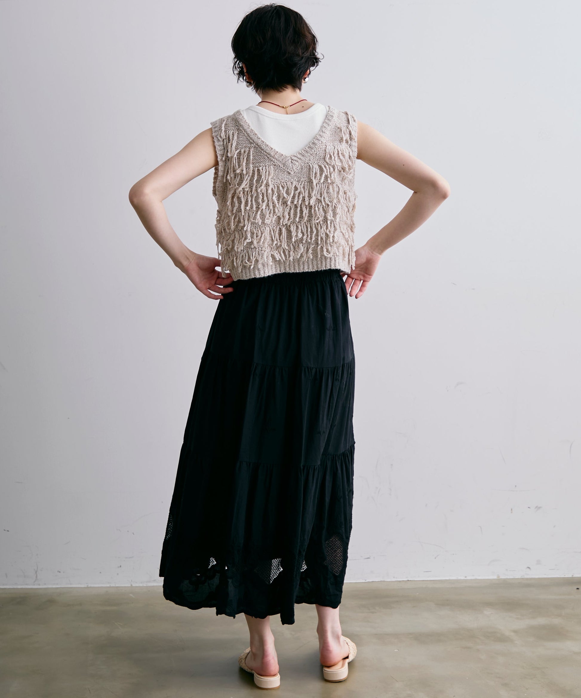 表情豊かなフリンジデザインが目を惹くニットベスト。程よい厚みのニット素材で、レイヤードスタイルに取り入れやすい一枚です。シンプルなトップスに重ねるだけで、コーディネートに動きとトレンド感をプラス。季節の変わり目にはもちろん、ロングシーズン活躍するアイテムです。