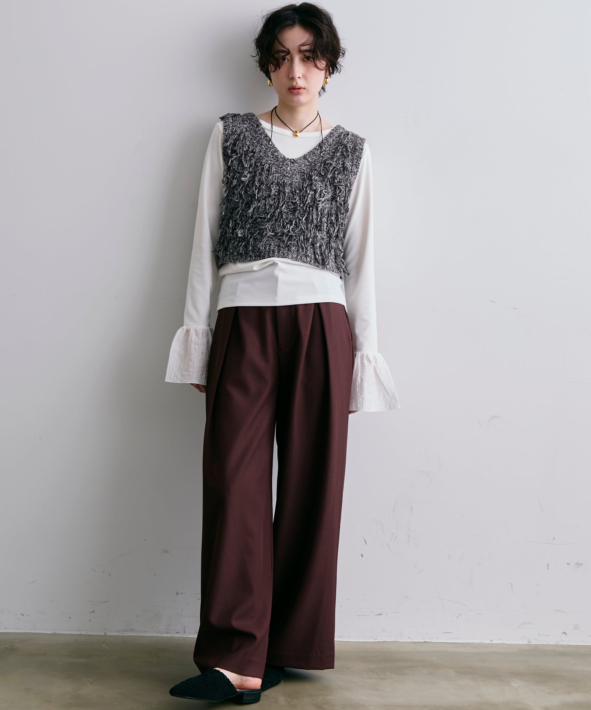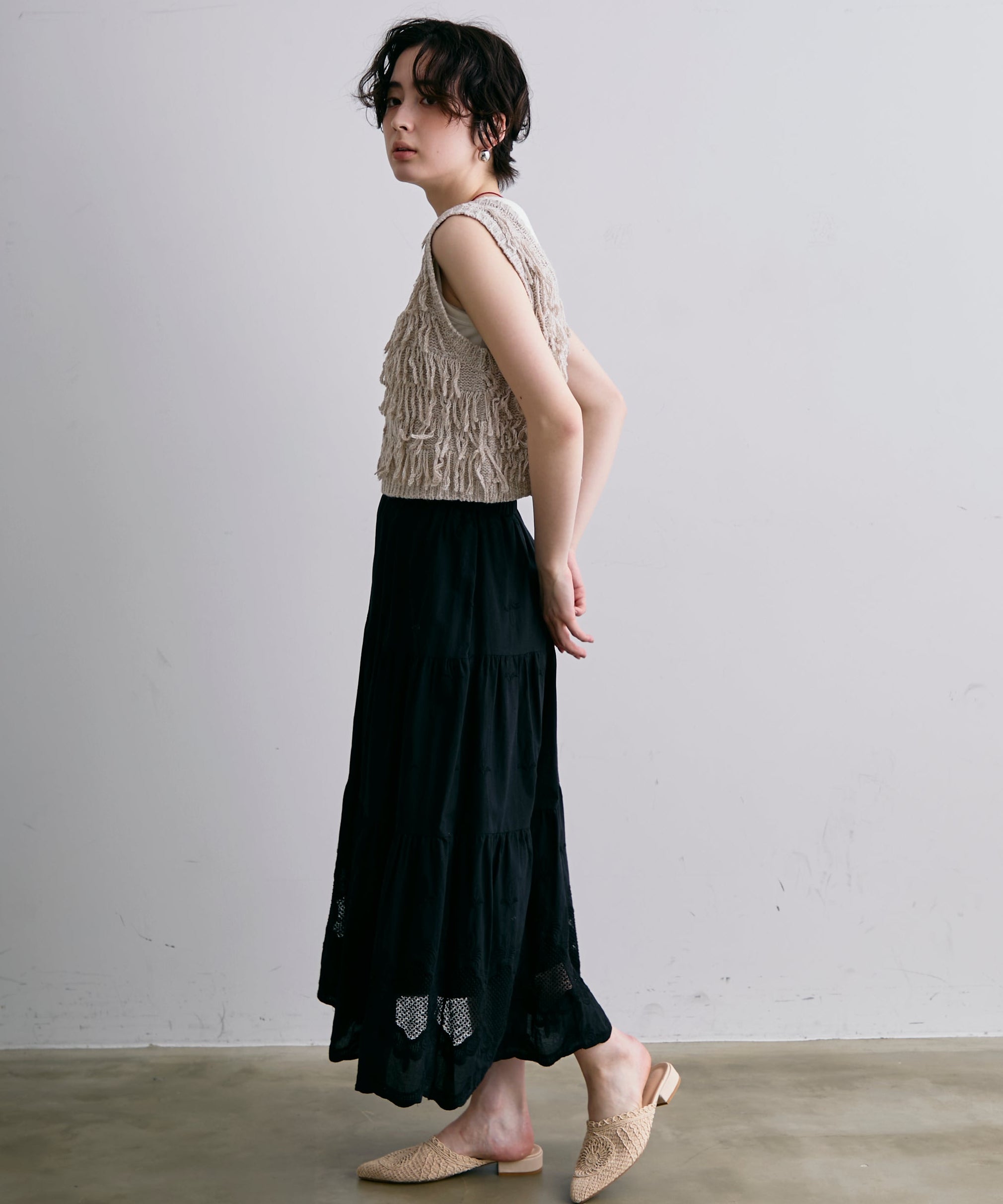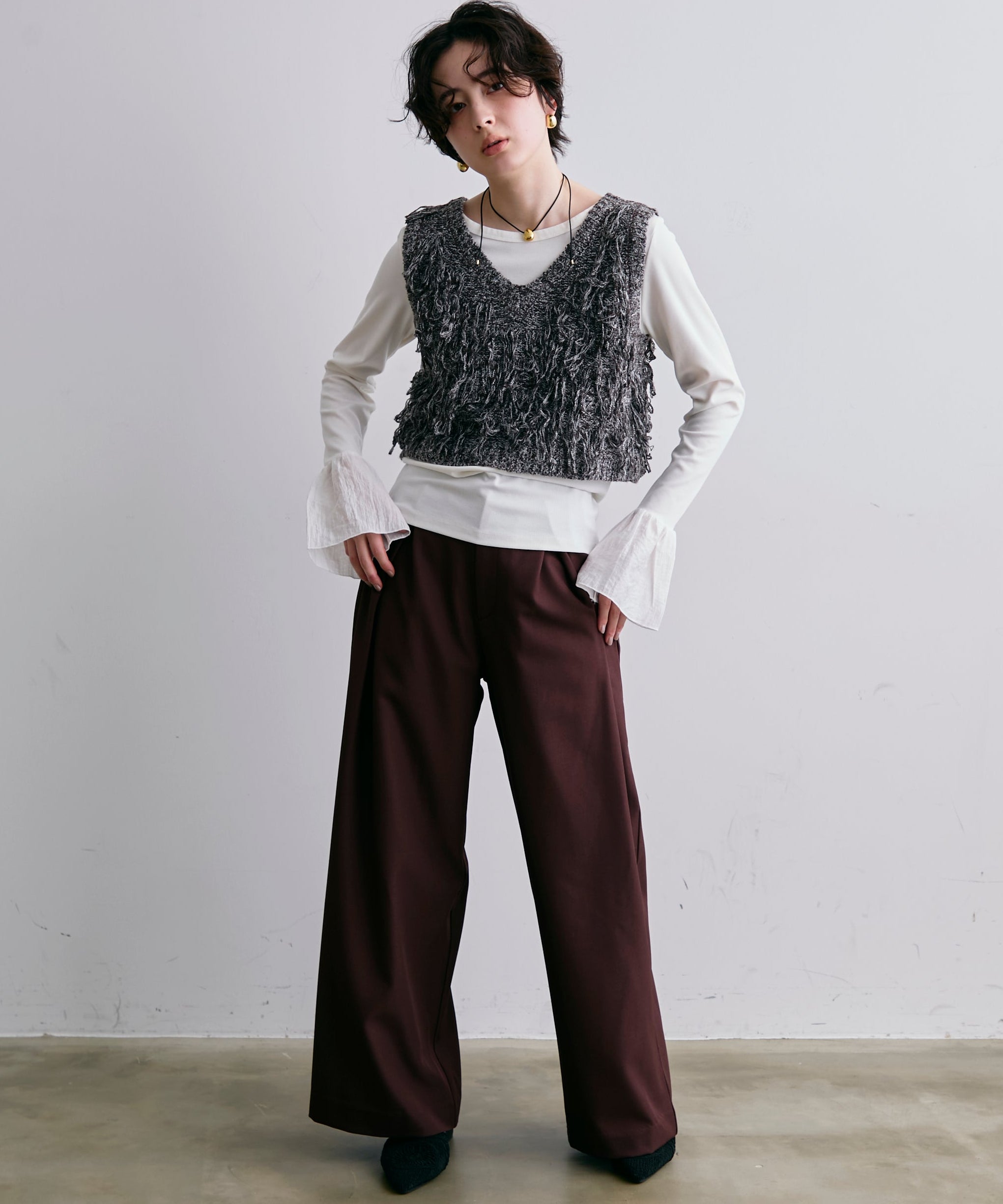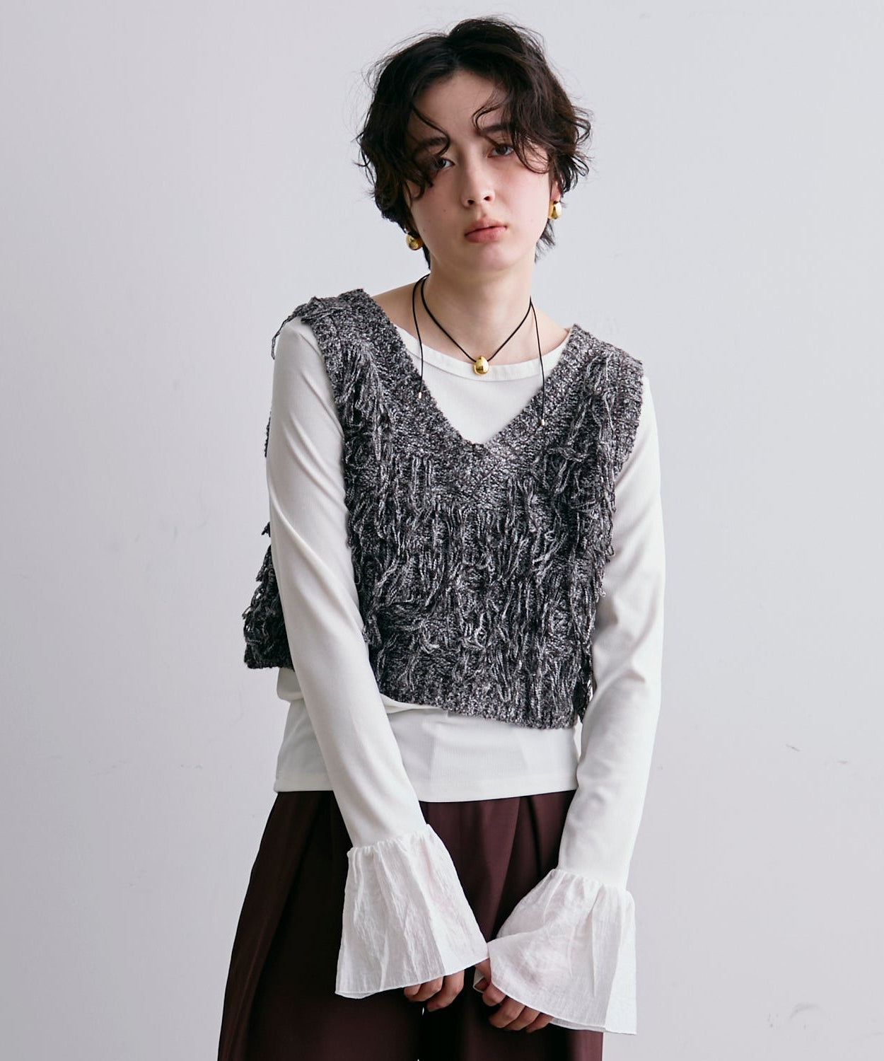 表情豊かなフリンジデザインが目を惹くニットベスト。程よい厚みのニット素材で、レイヤードスタイルに取り入れやすい一枚です。シンプルなトップスに重ねるだけで、コーディネートに動きとトレンド感をプラス。季節の変わり目にはもちろん、ロングシーズン活躍するアイテムです。