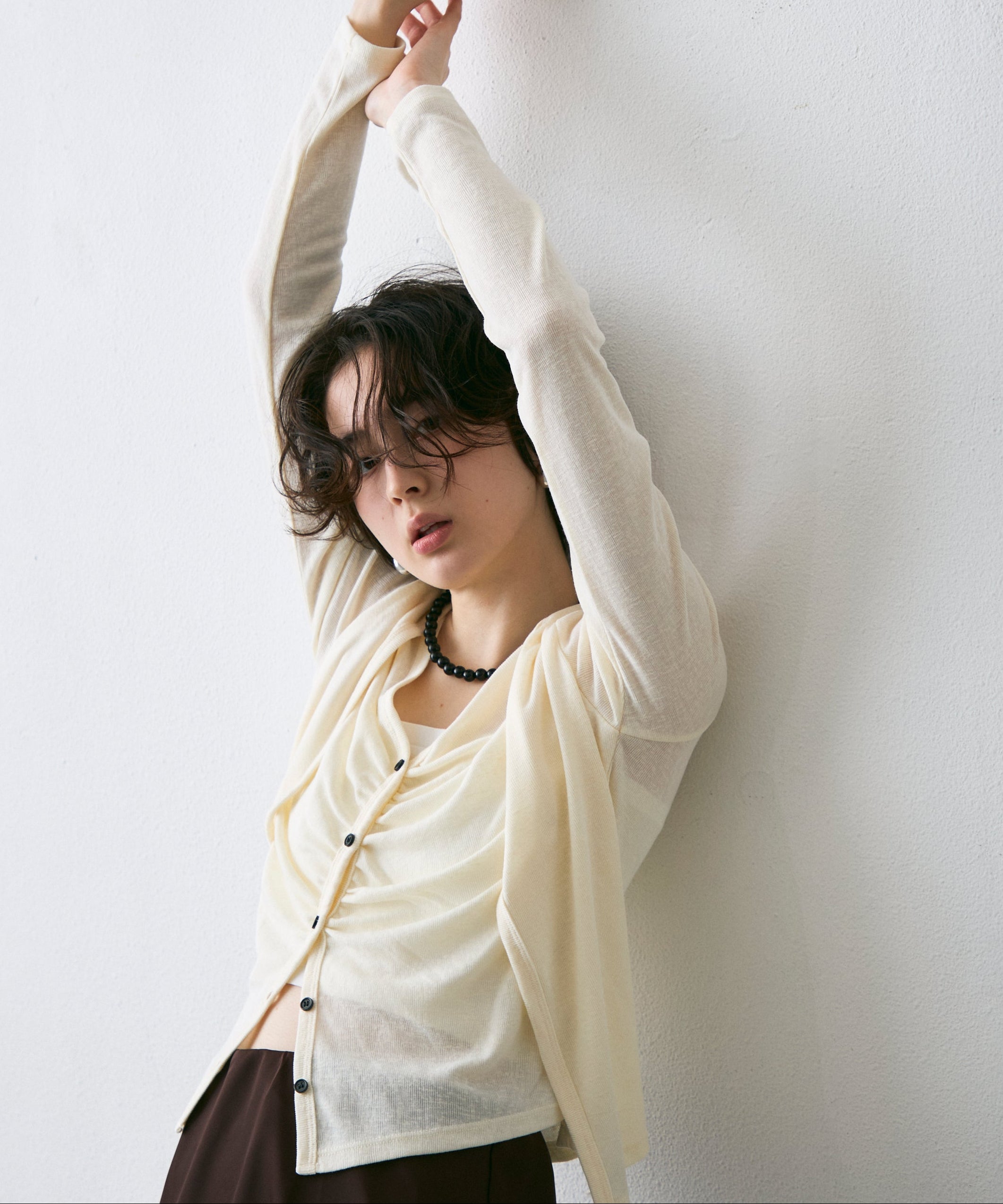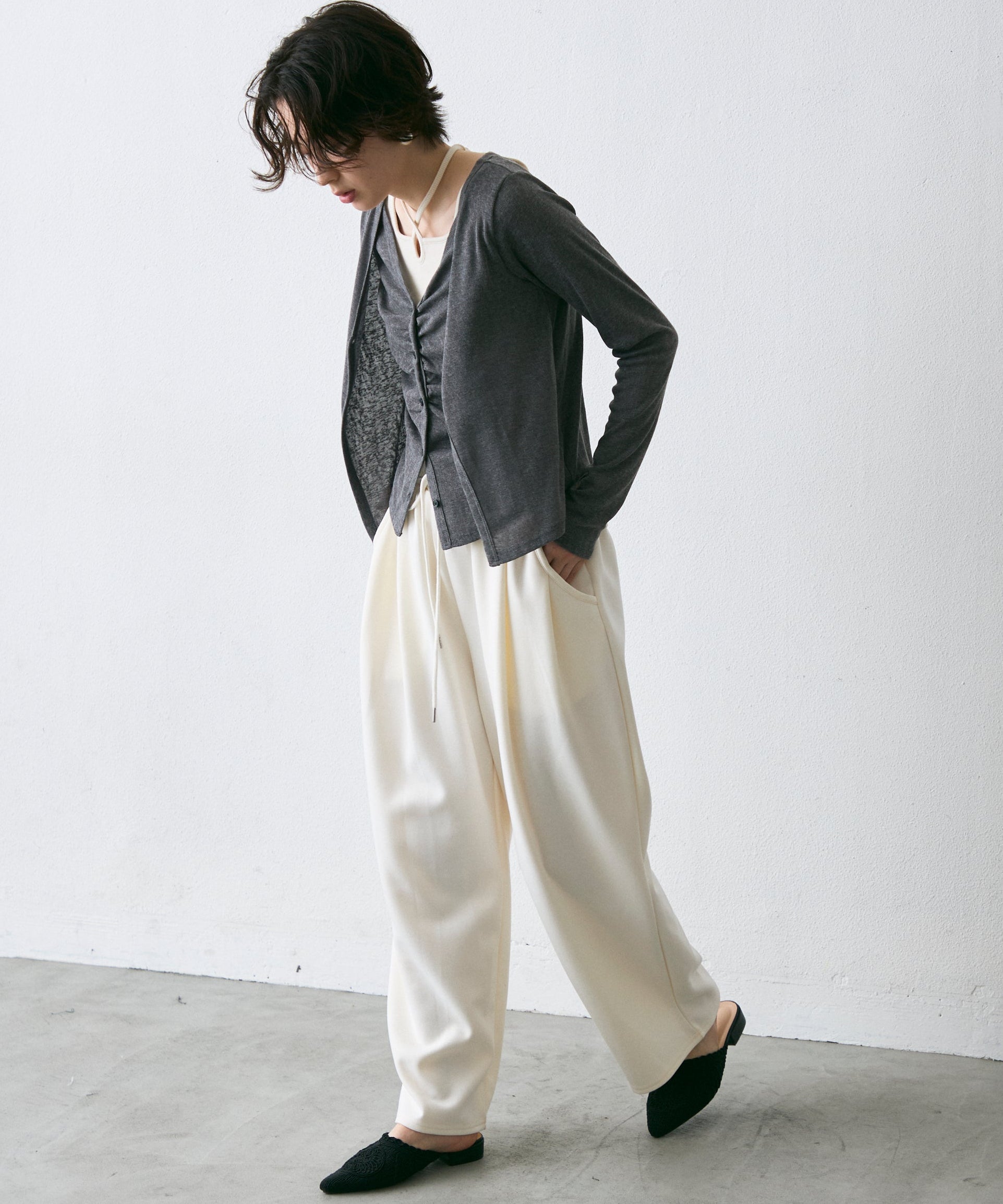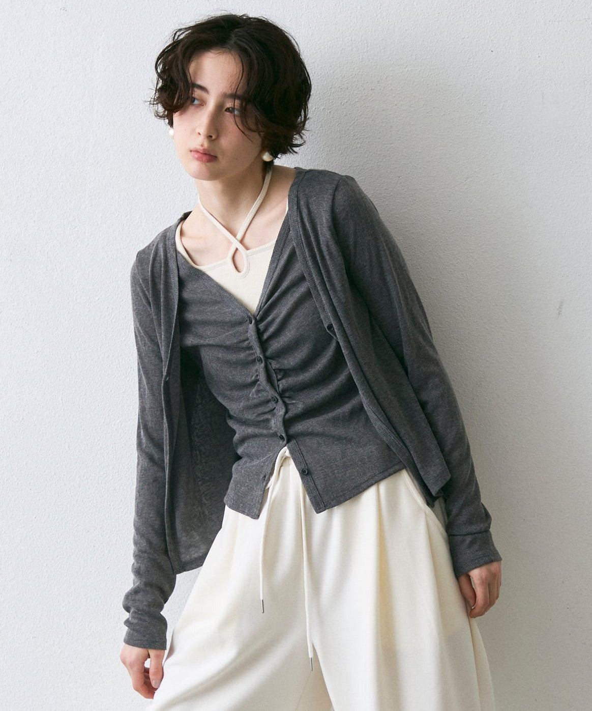 スラブ素材のナチュラルな風合いが魅力の、Vネックレイヤード風カーディガン。