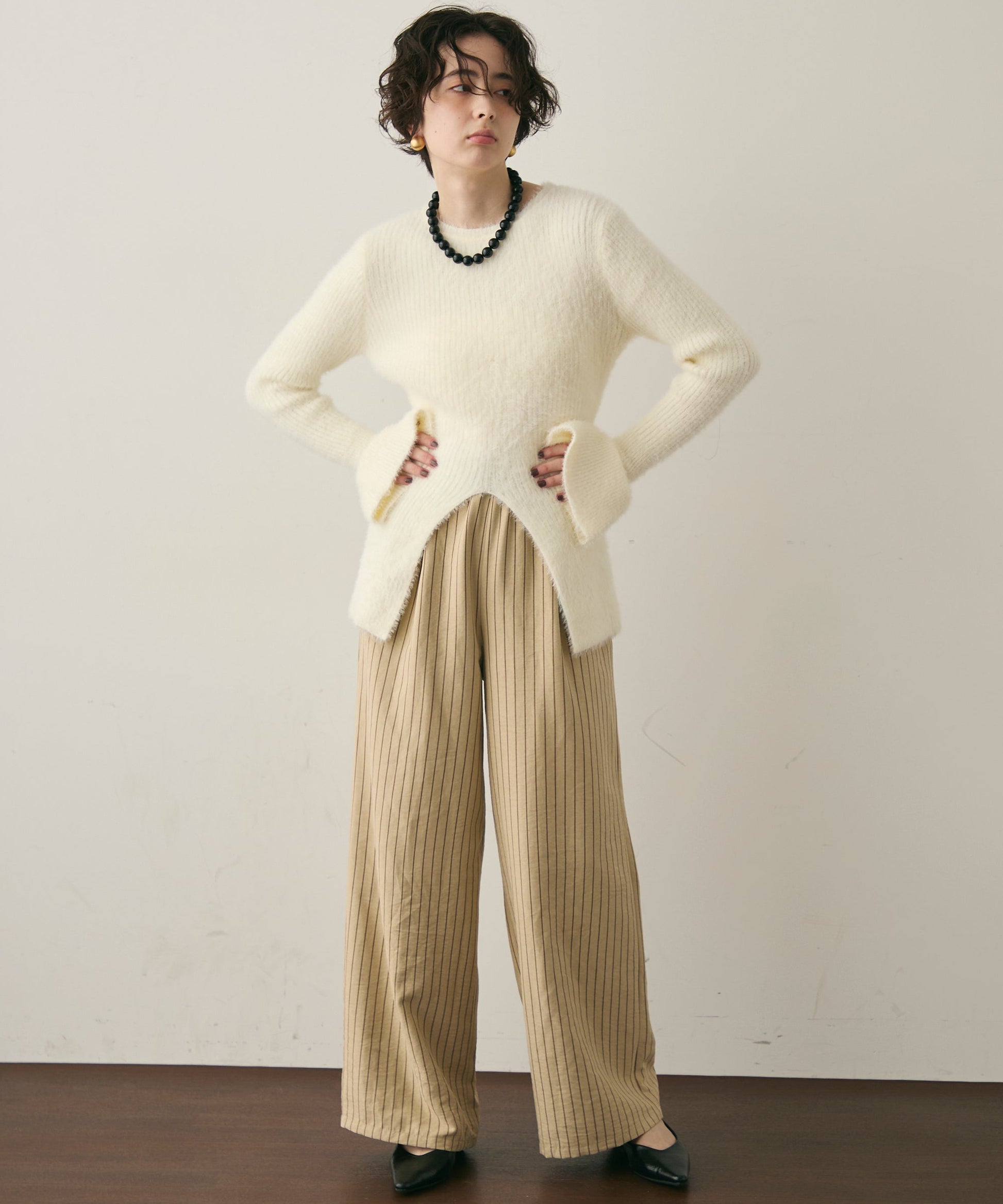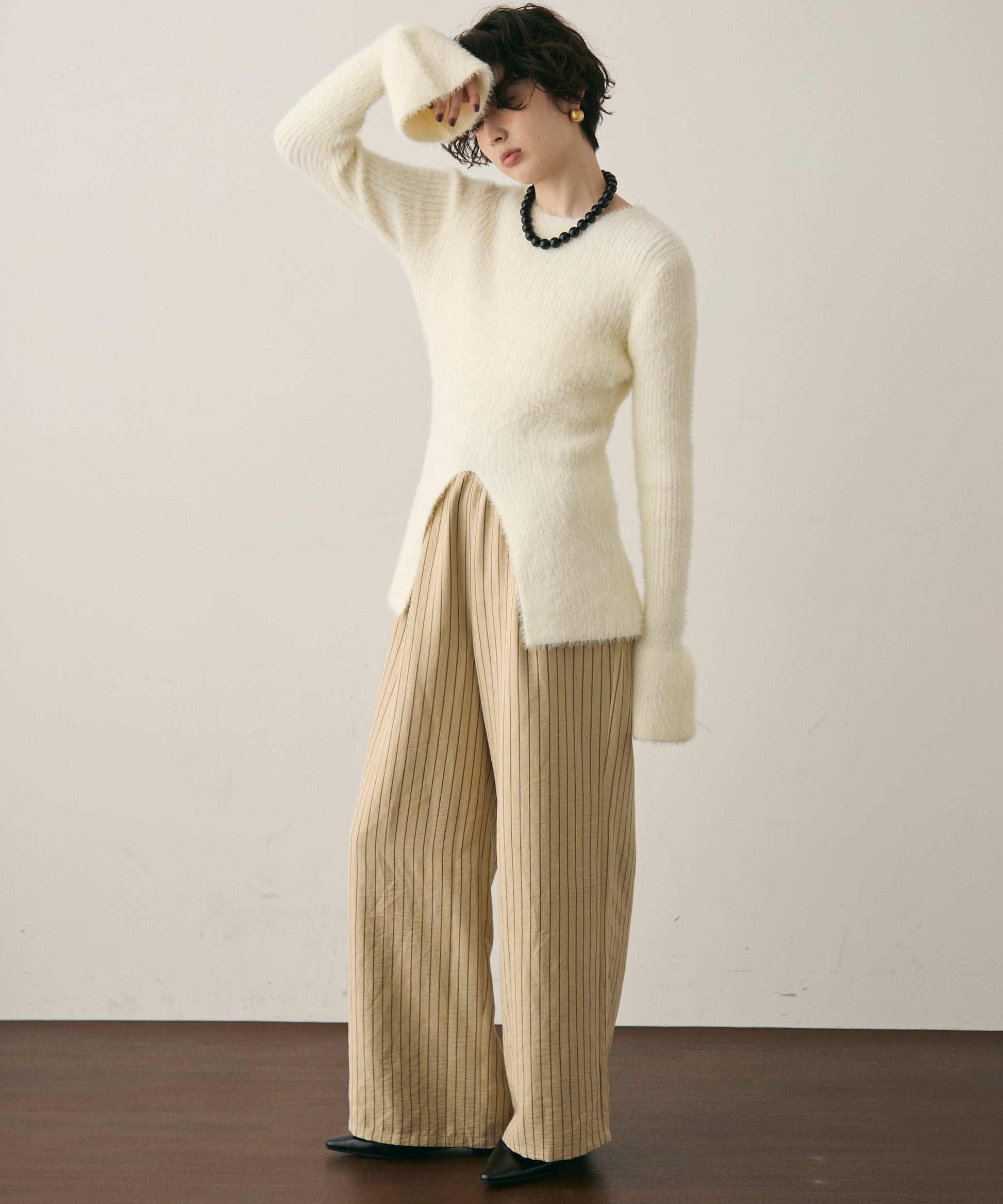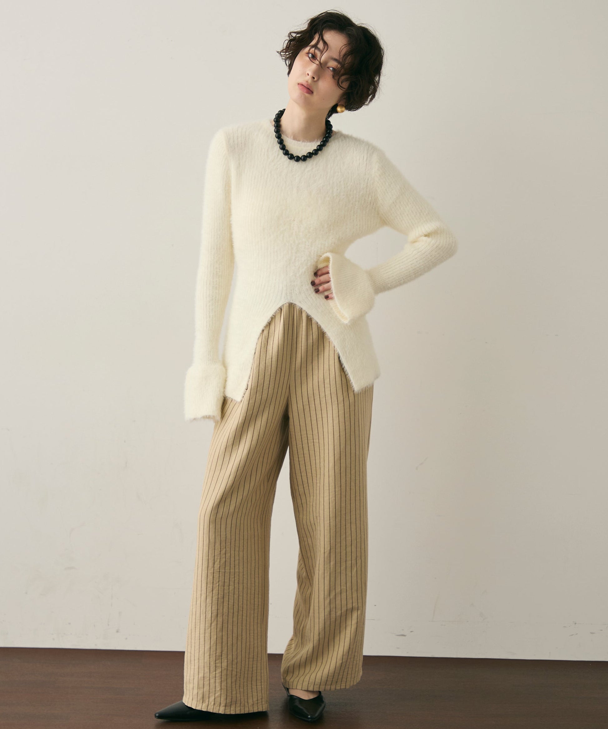 柔らかく微起毛した素材感が肌あたりよく、秋冬のスタイリングにぴったりです。