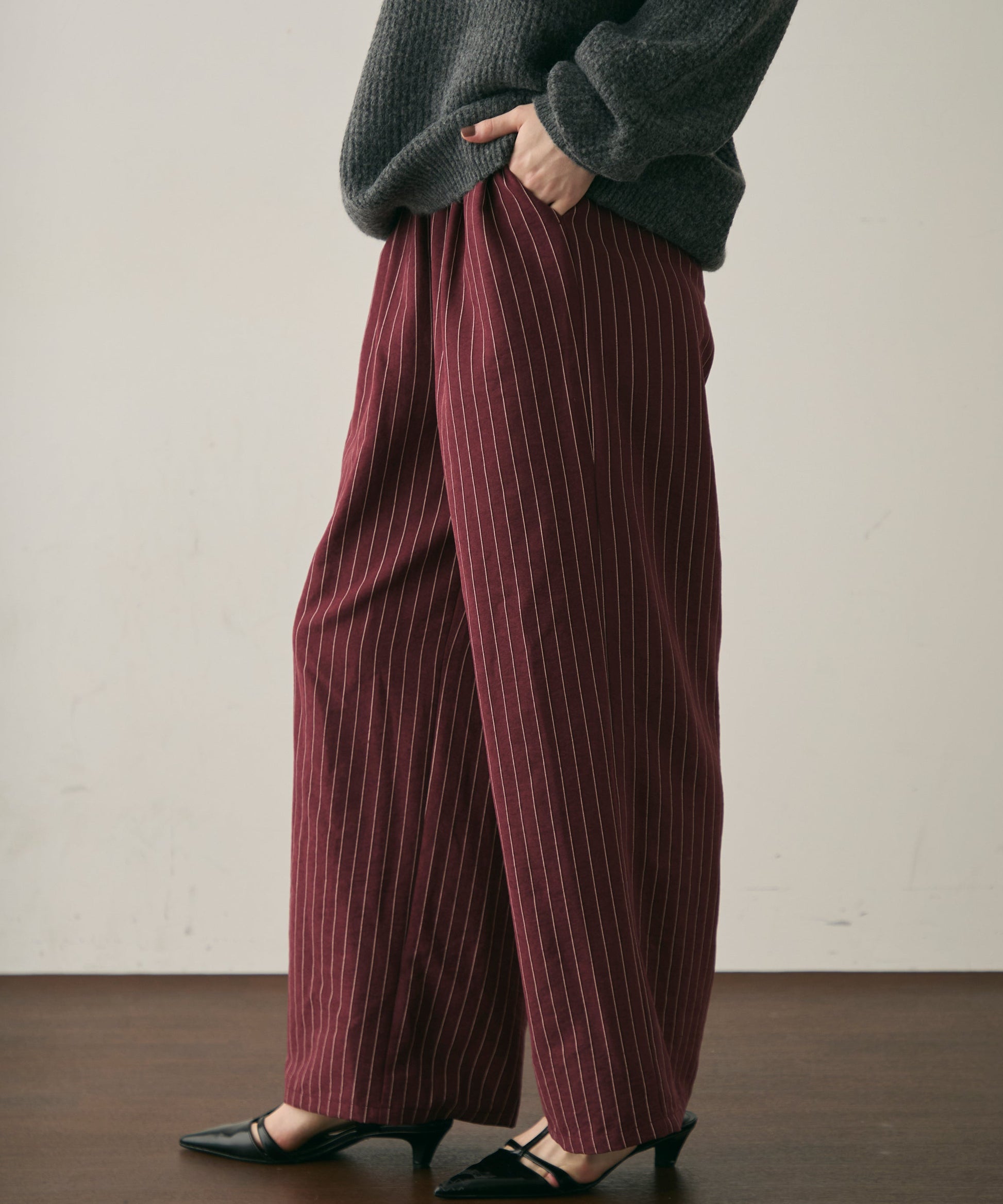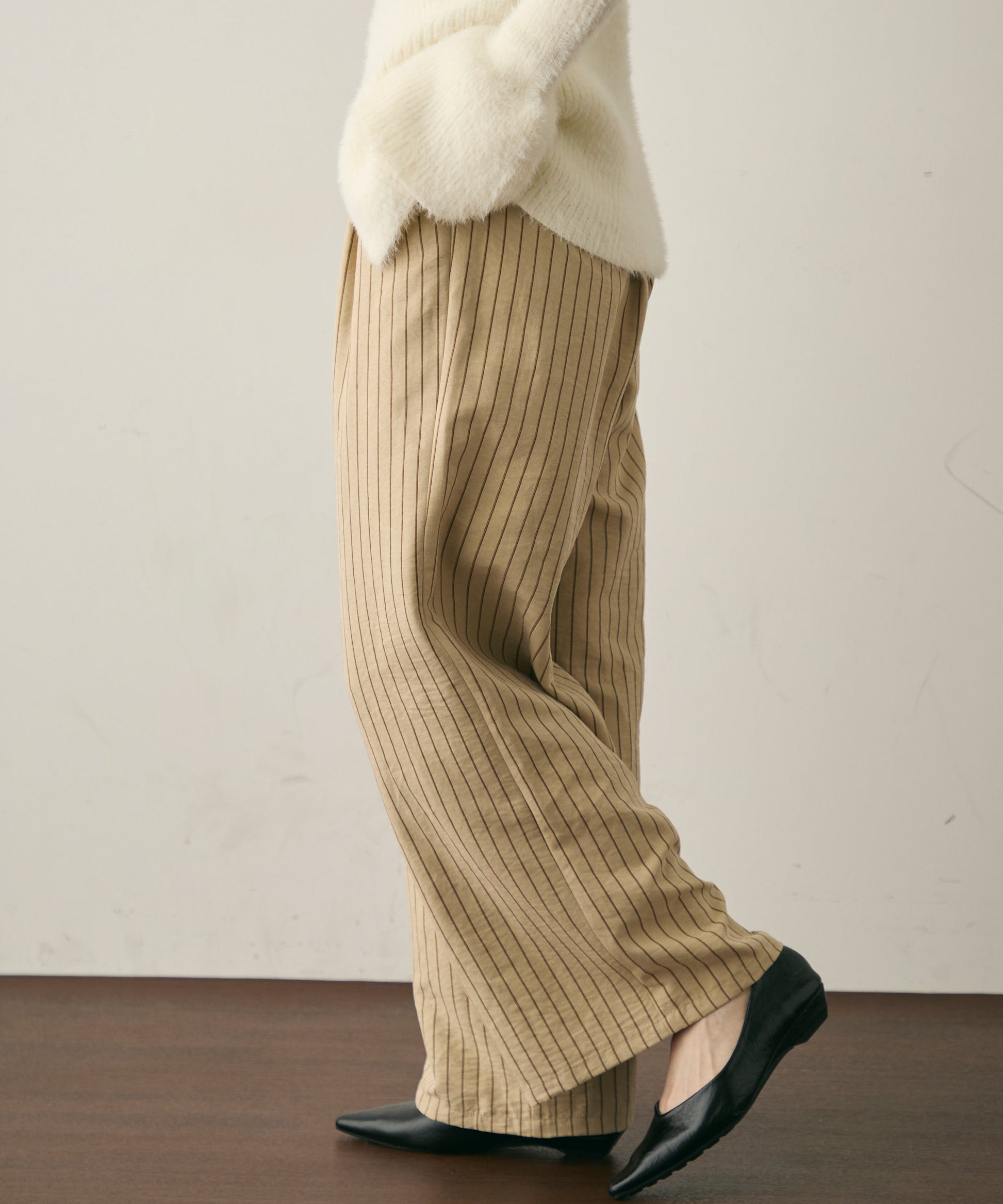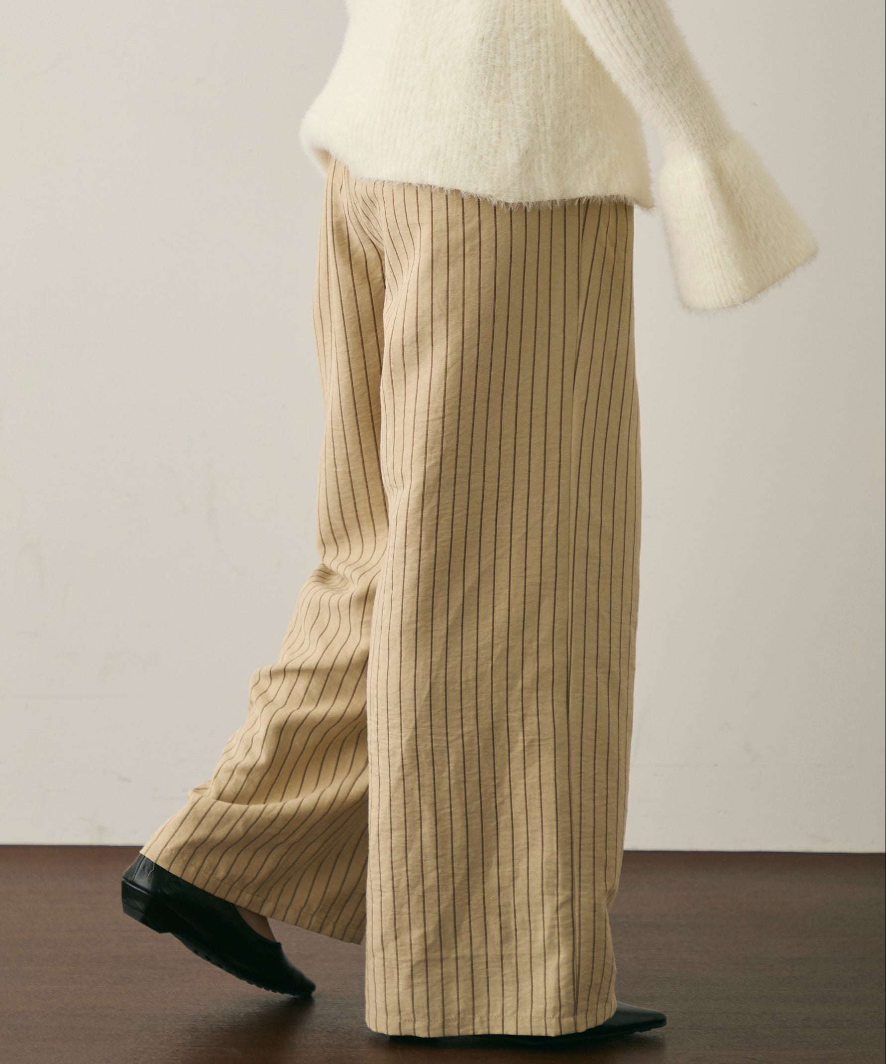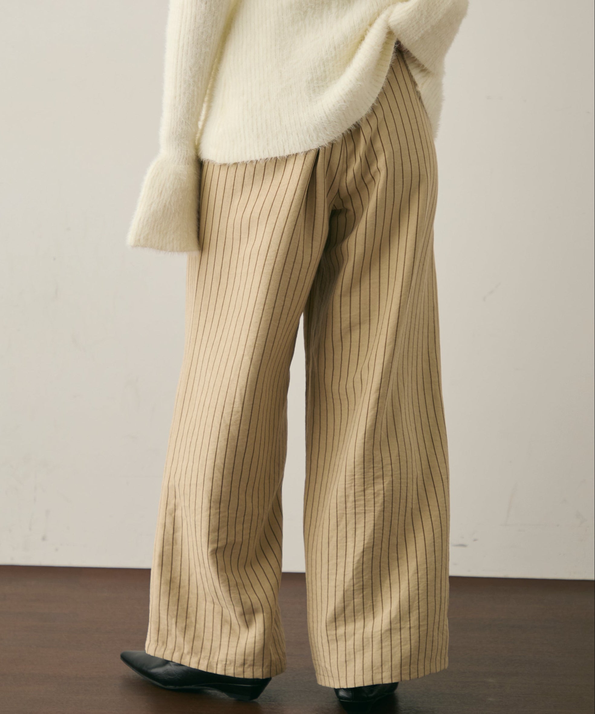上品なストライプ柄と、なめらかなピーチスキン素材が魅力のイージーパンツ。