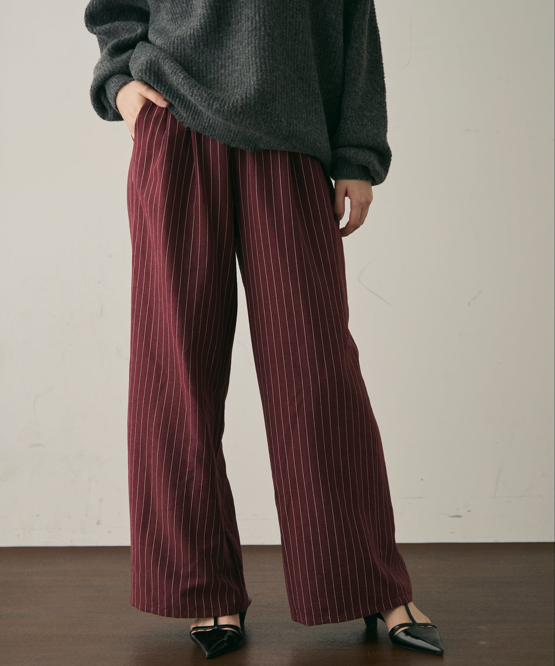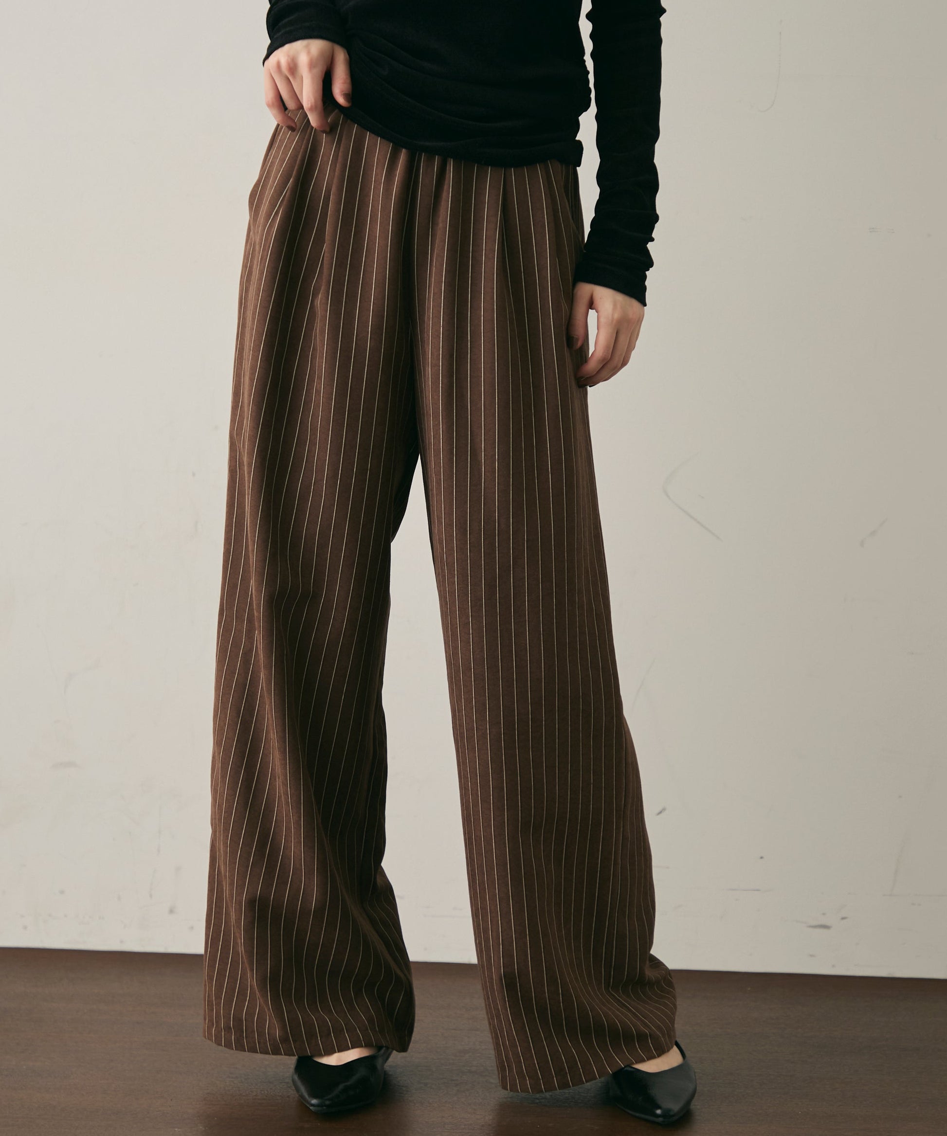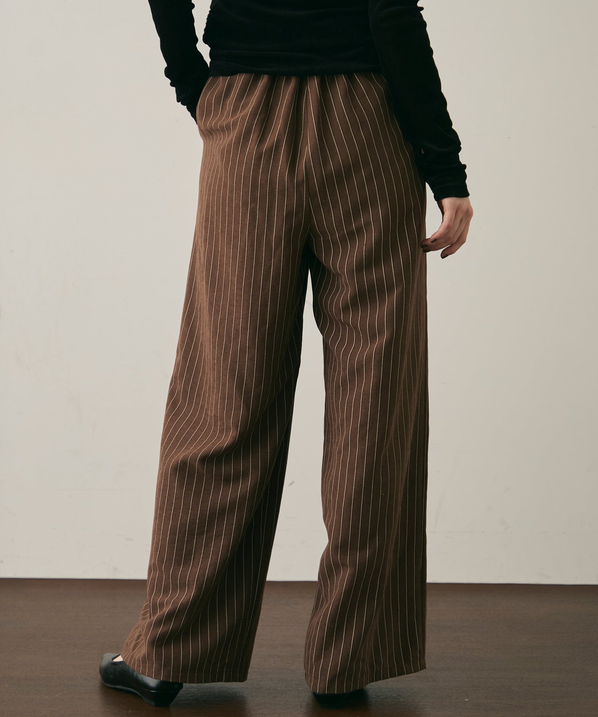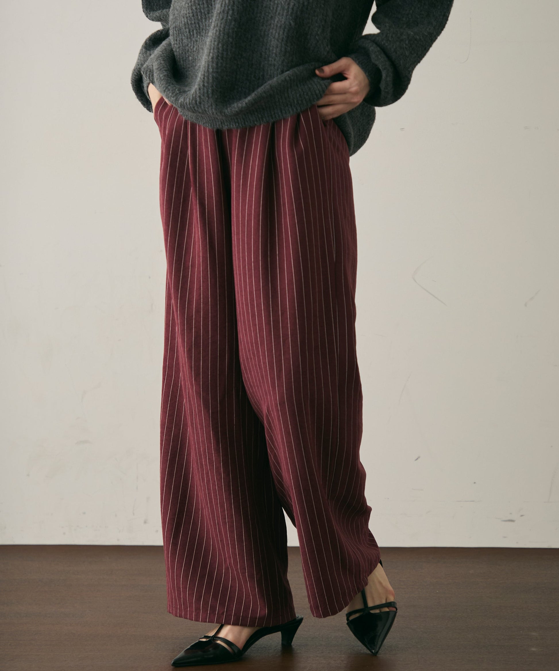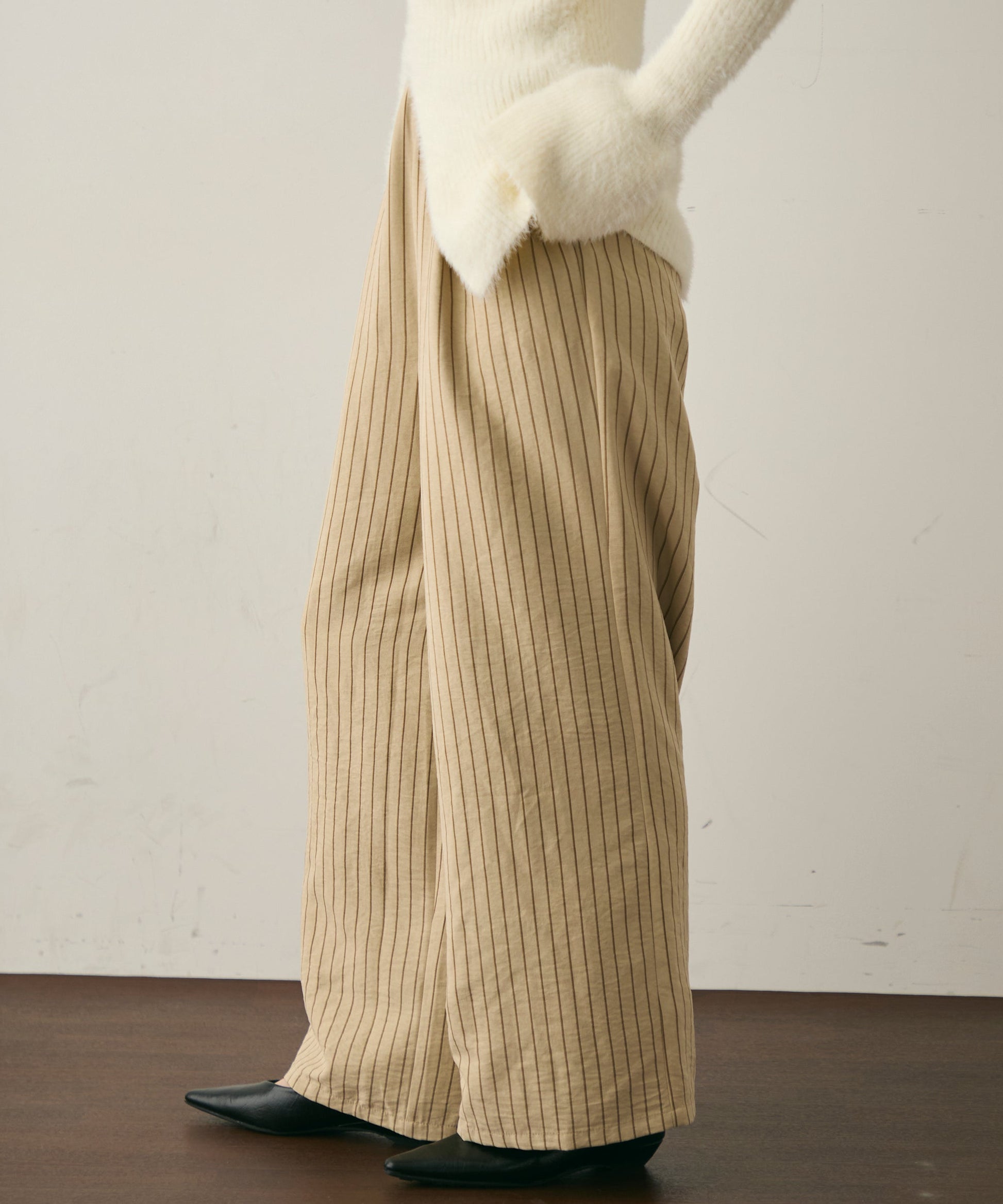 上品なストライプ柄と、なめらかなピーチスキン素材が魅力のイージーパンツ。