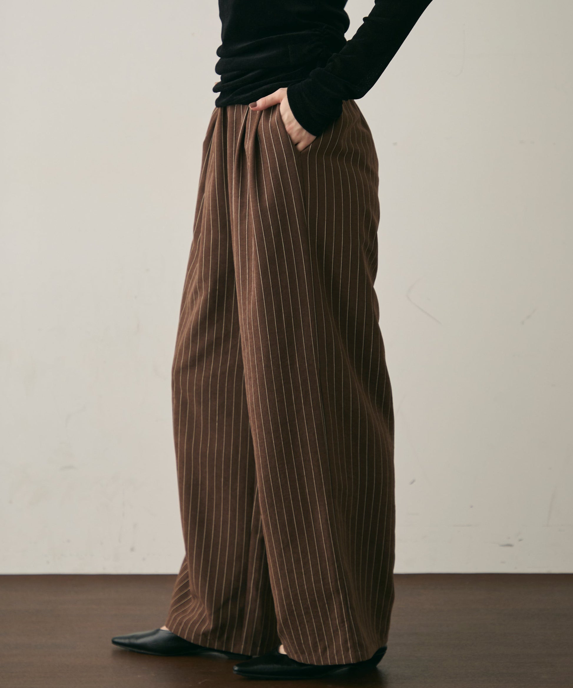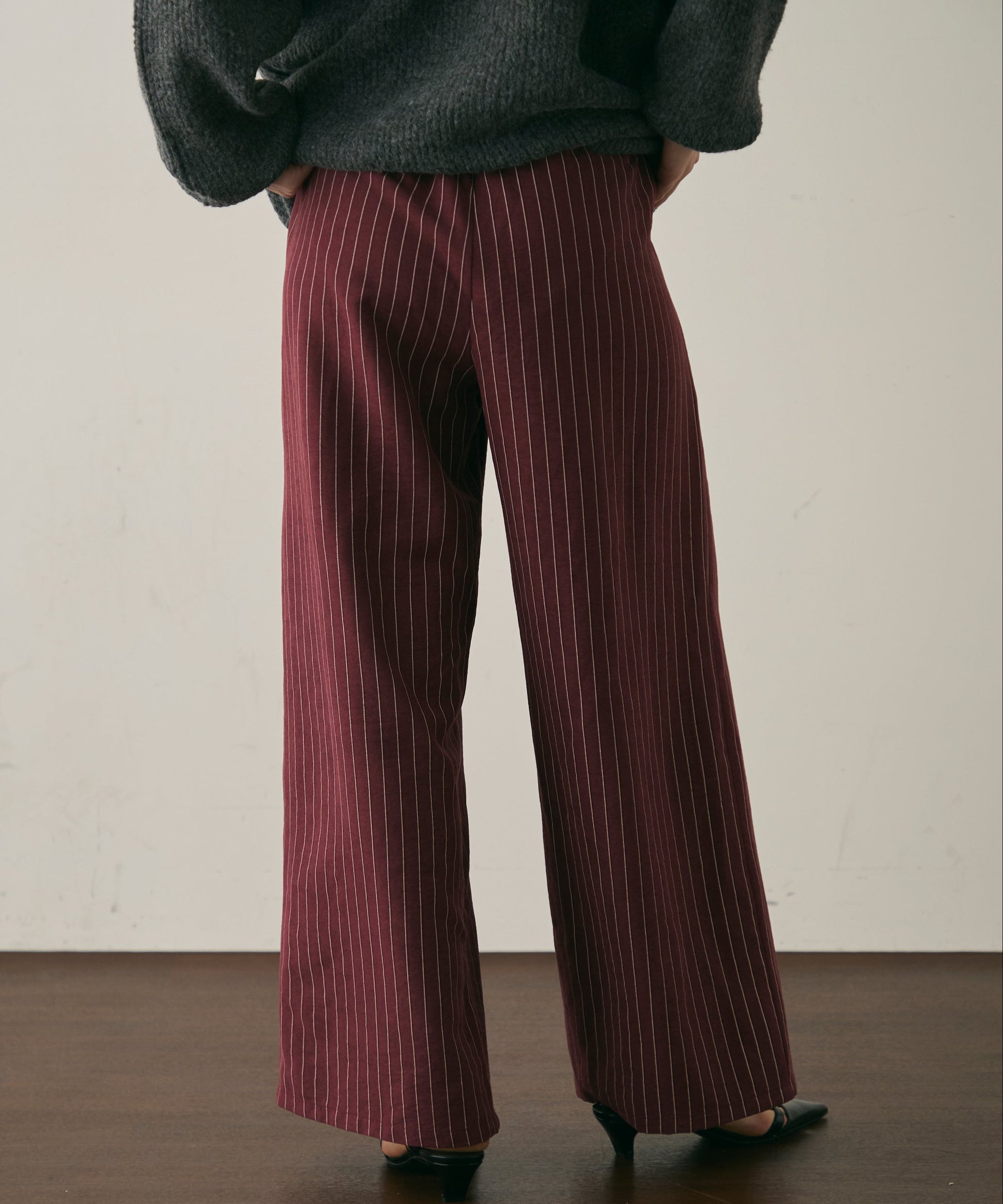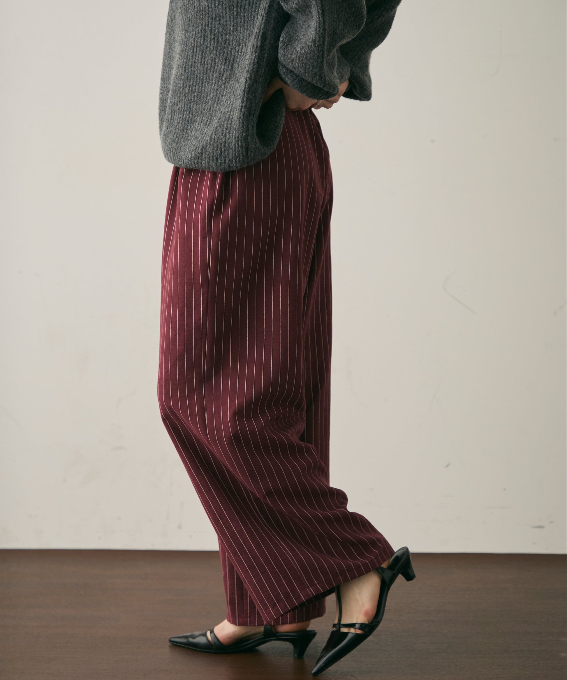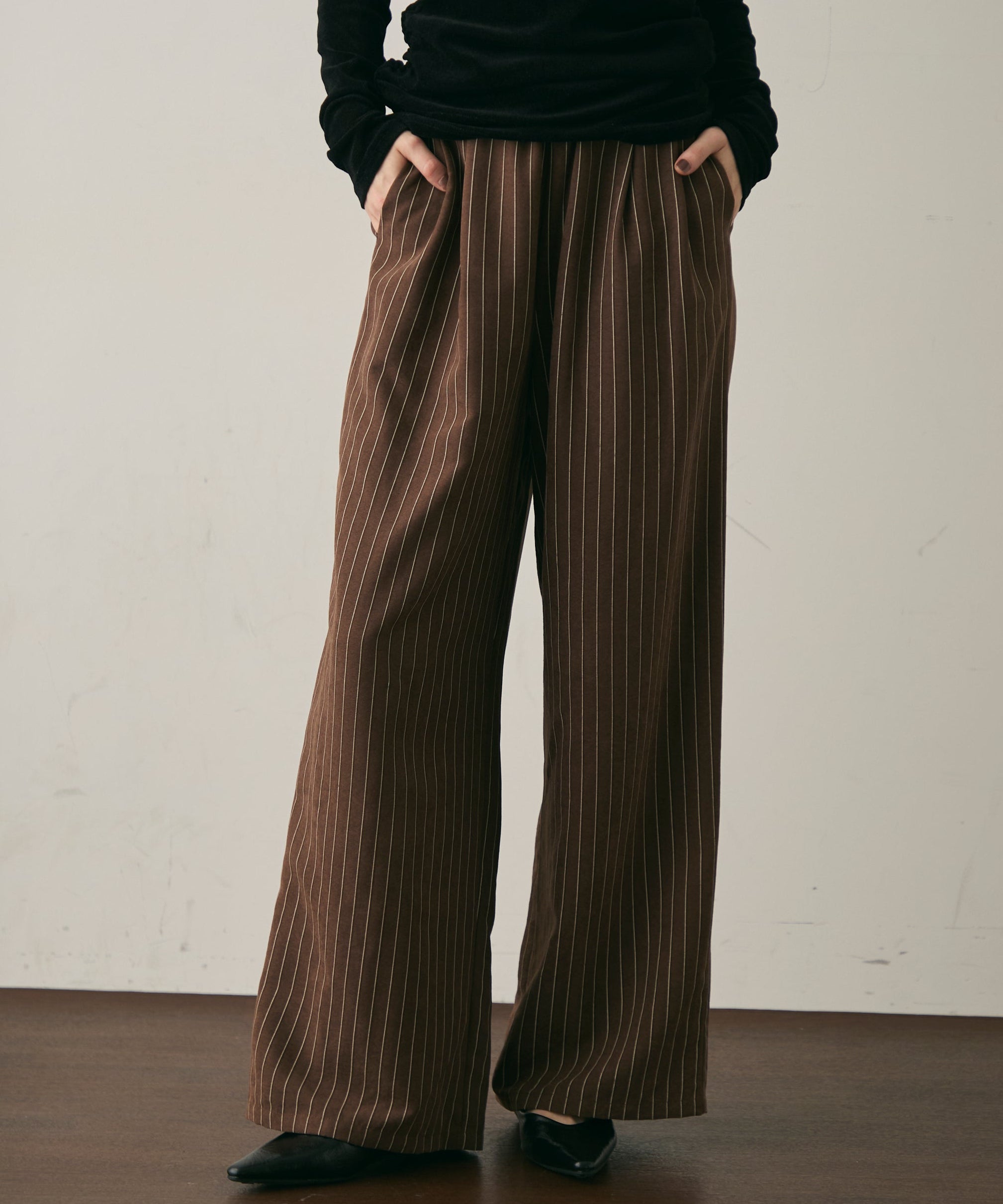 上品なストライプ柄と、なめらかなピーチスキン素材が魅力のイージーパンツ。