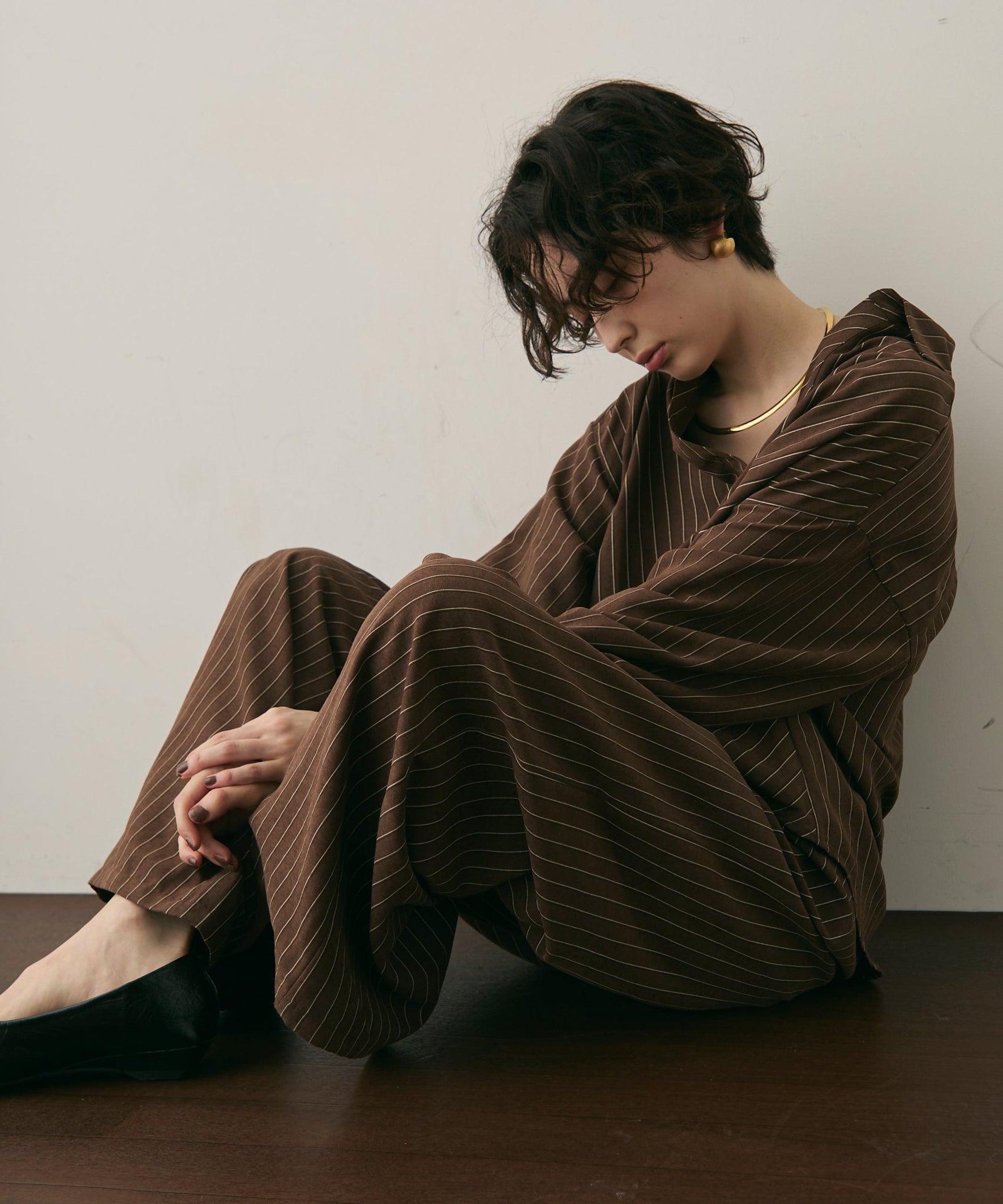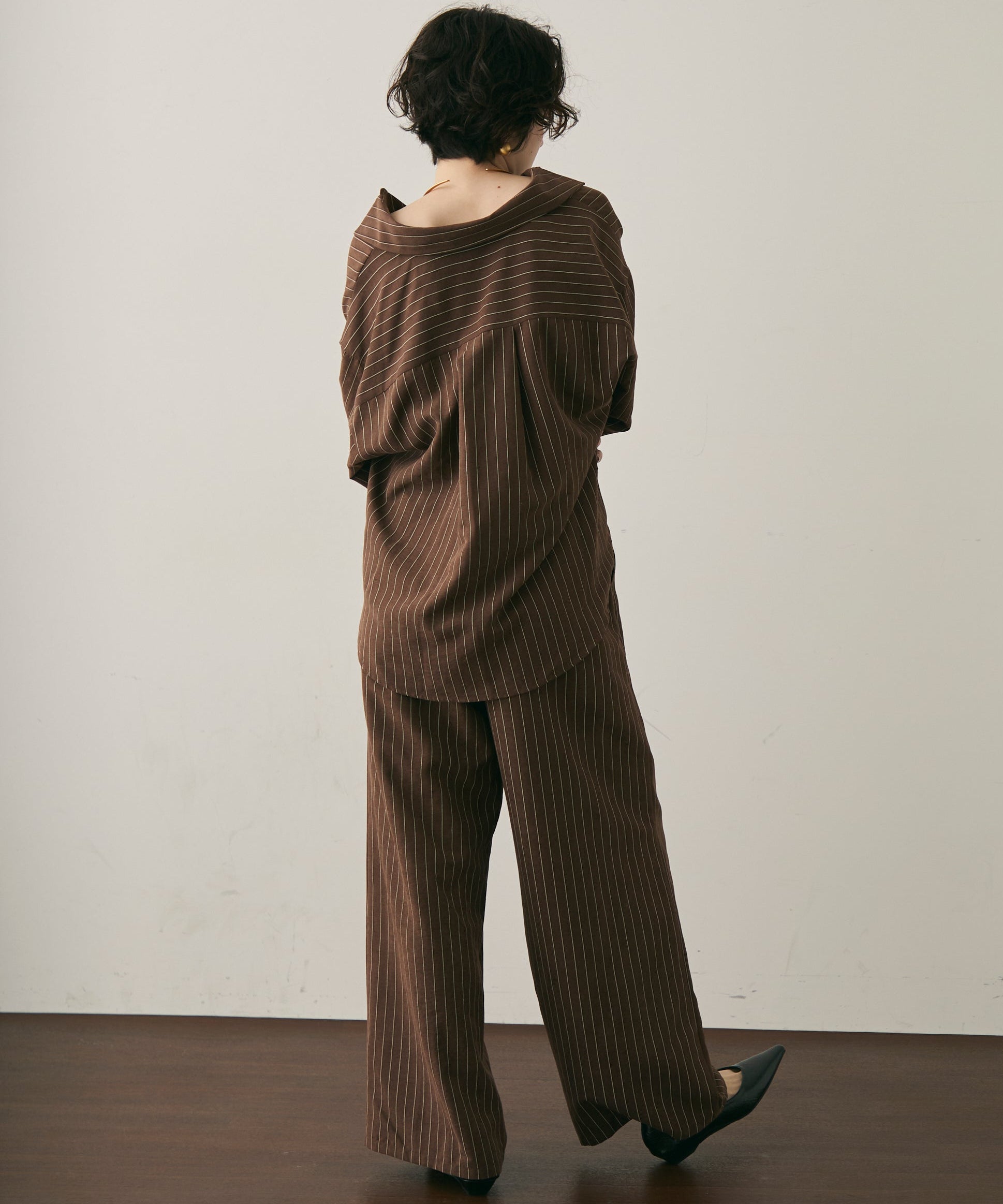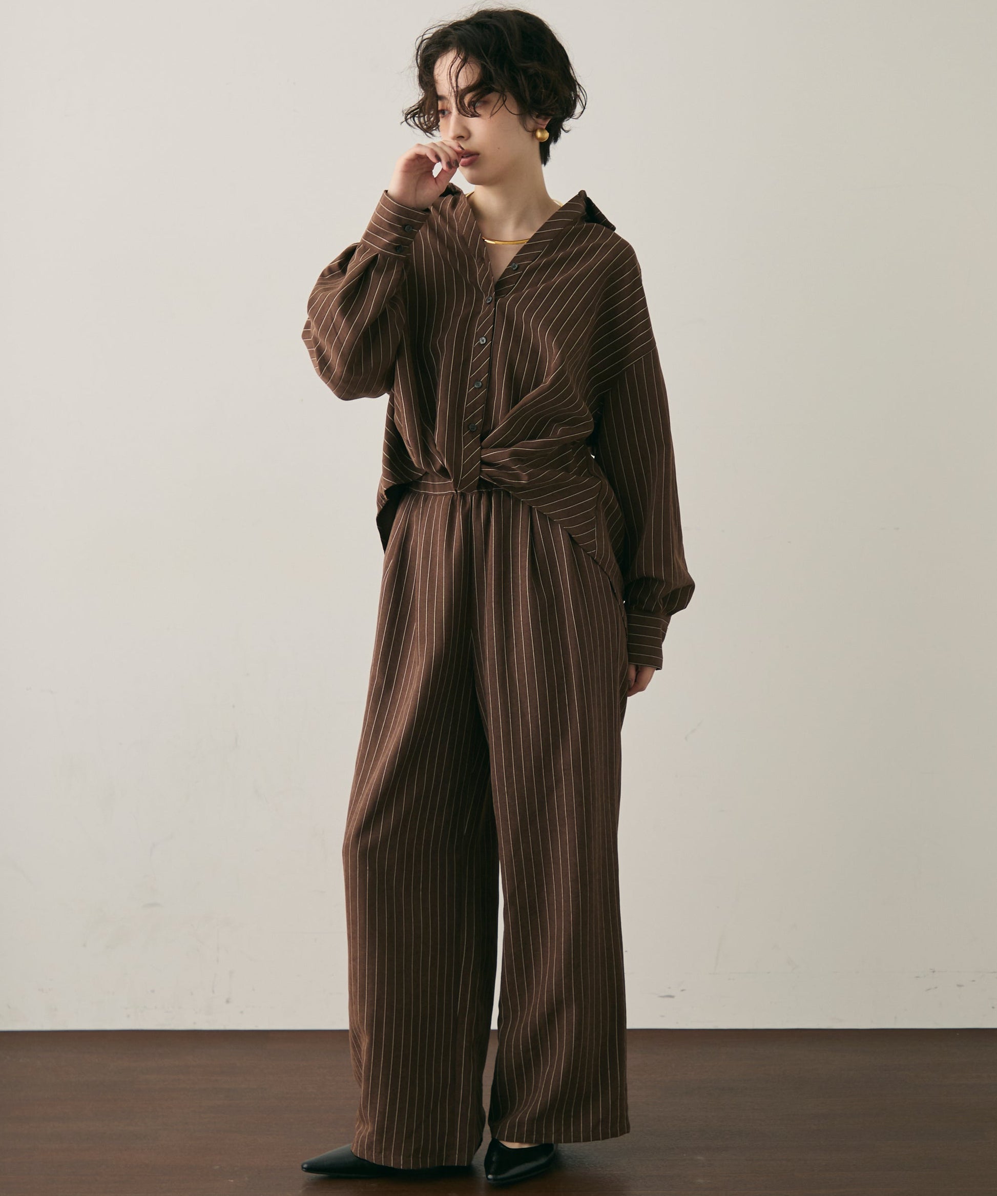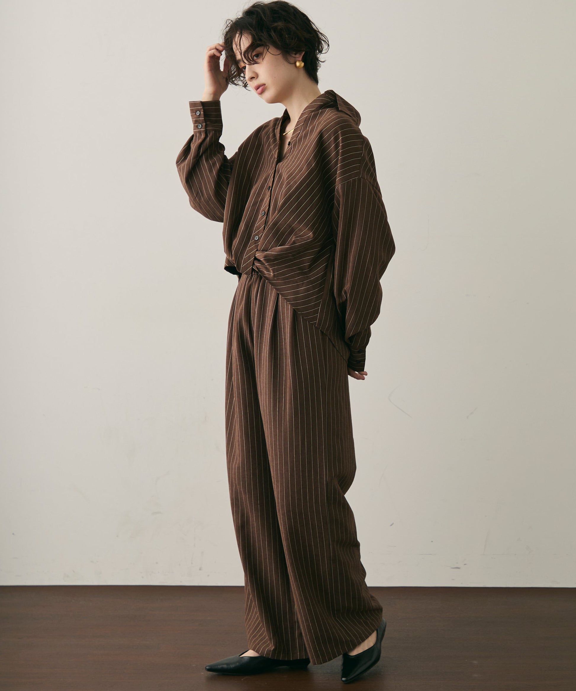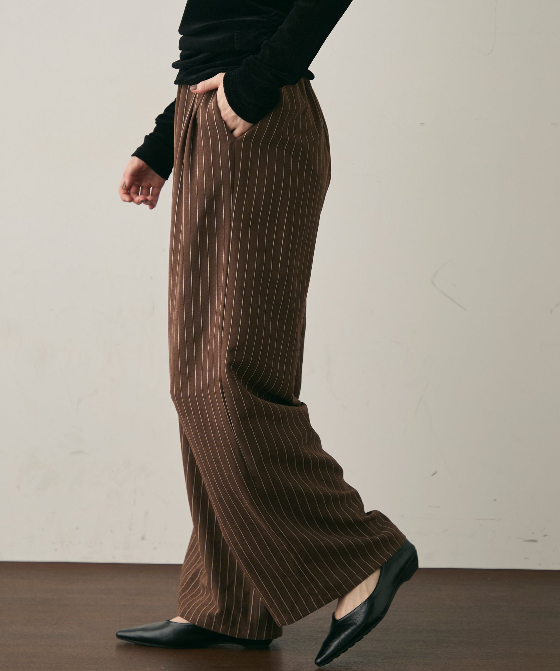 上品なストライプ柄と、なめらかなピーチスキン素材が魅力のイージーパンツ。