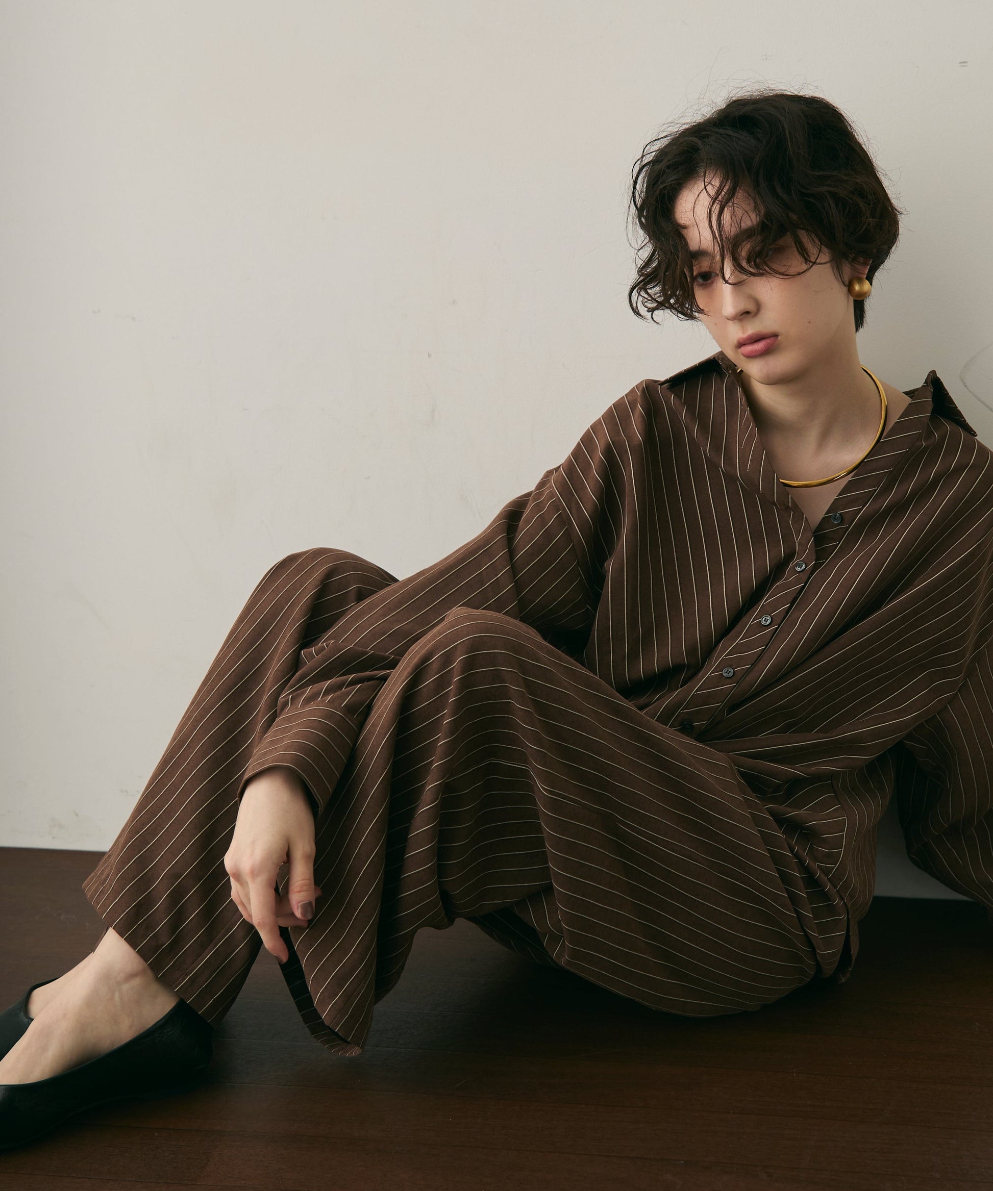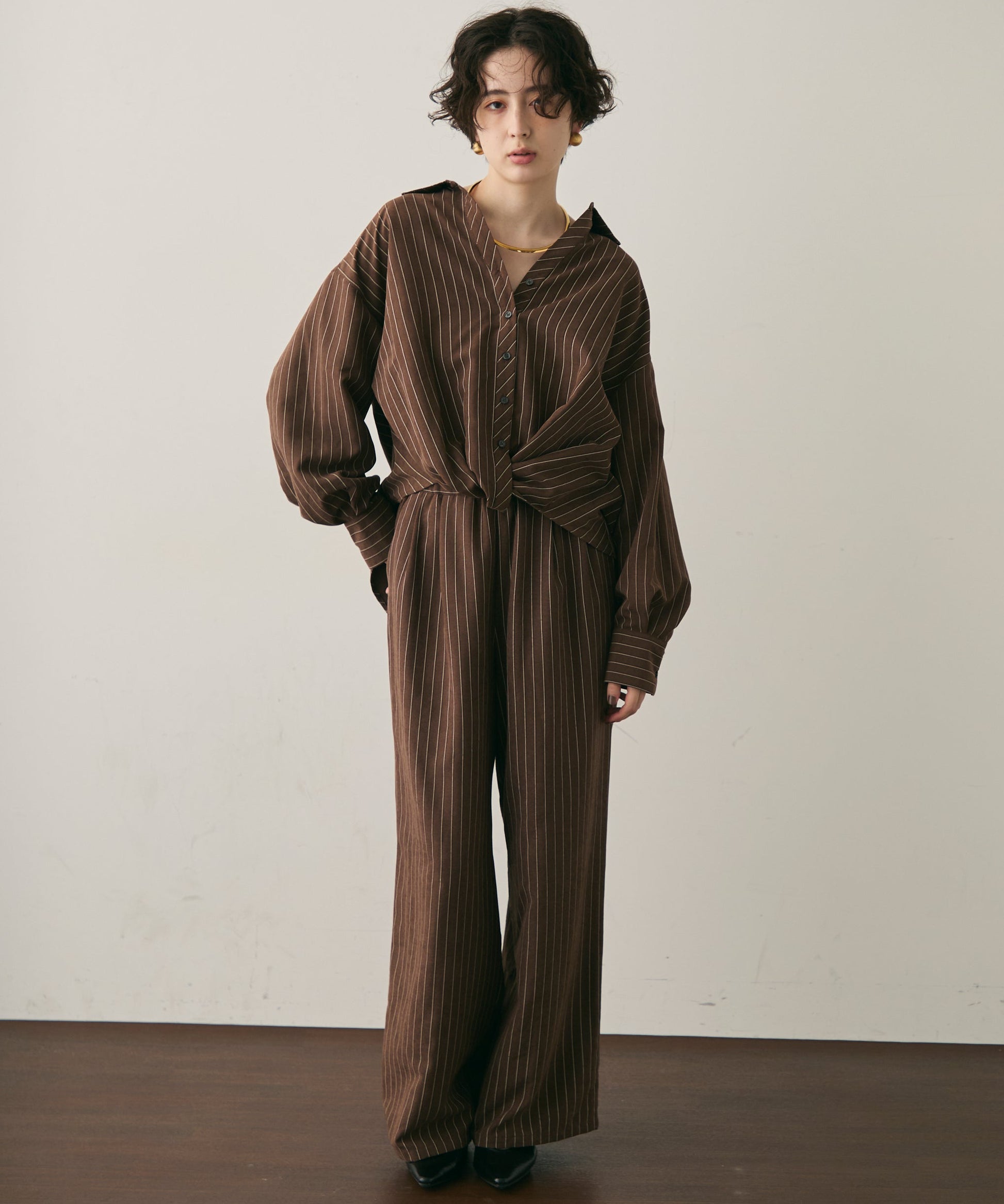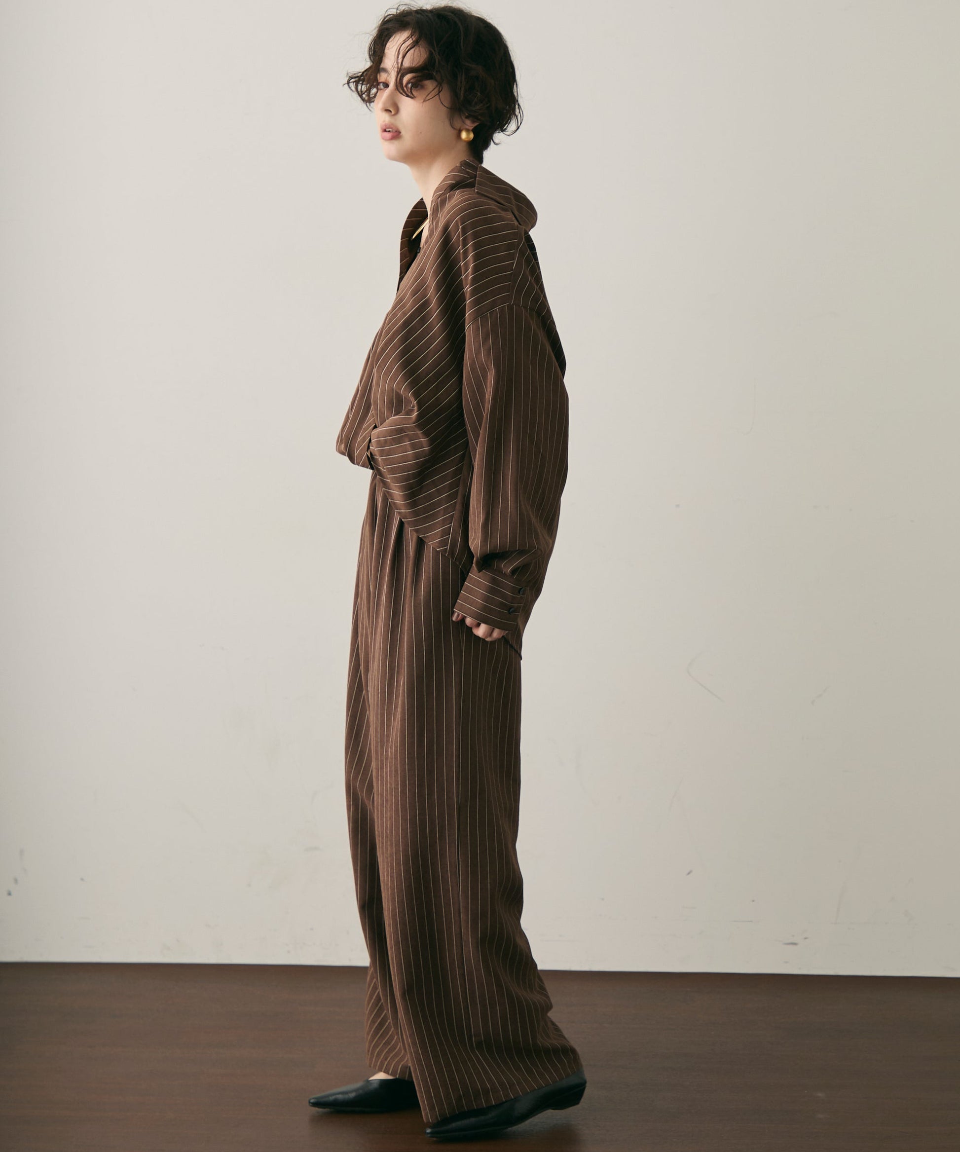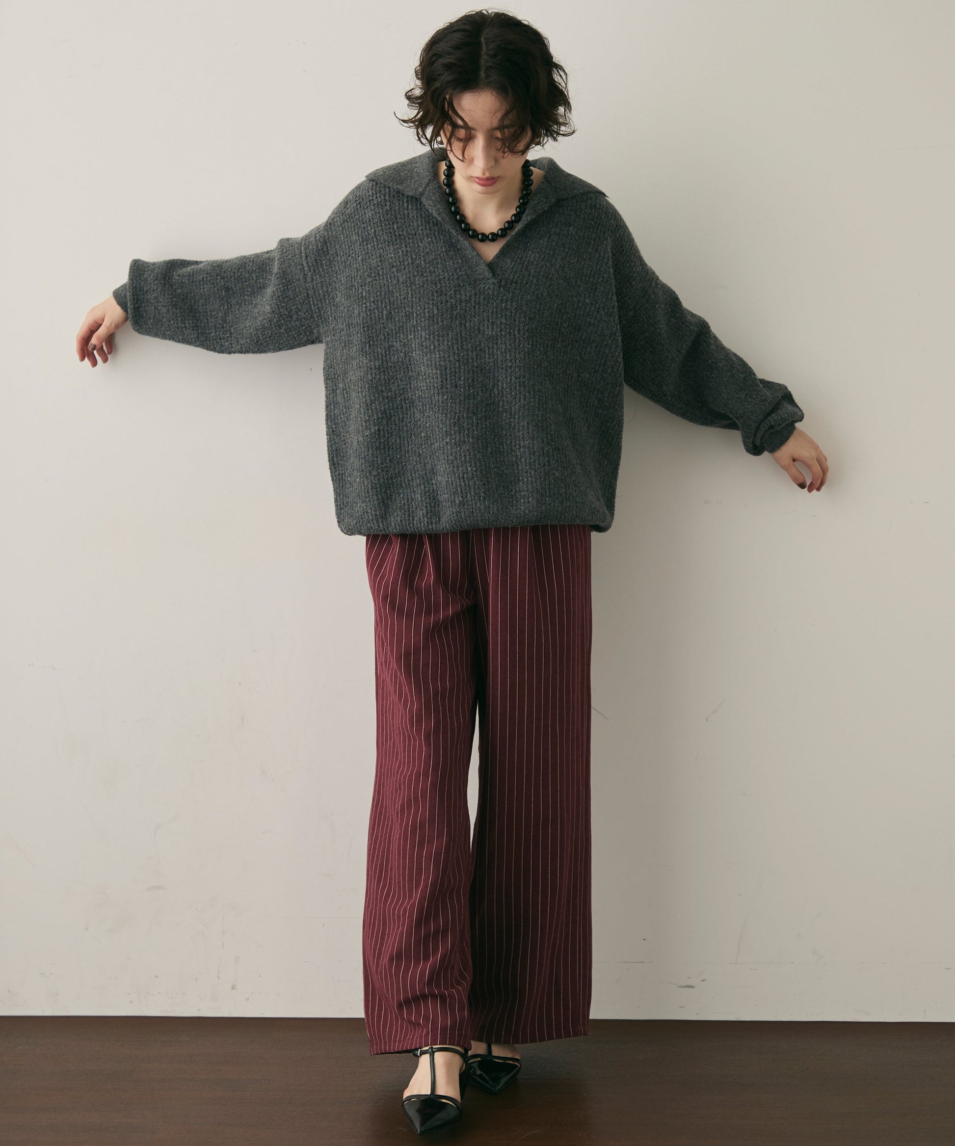 上品なストライプ柄と、なめらかなピーチスキン素材が魅力のイージーパンツ。