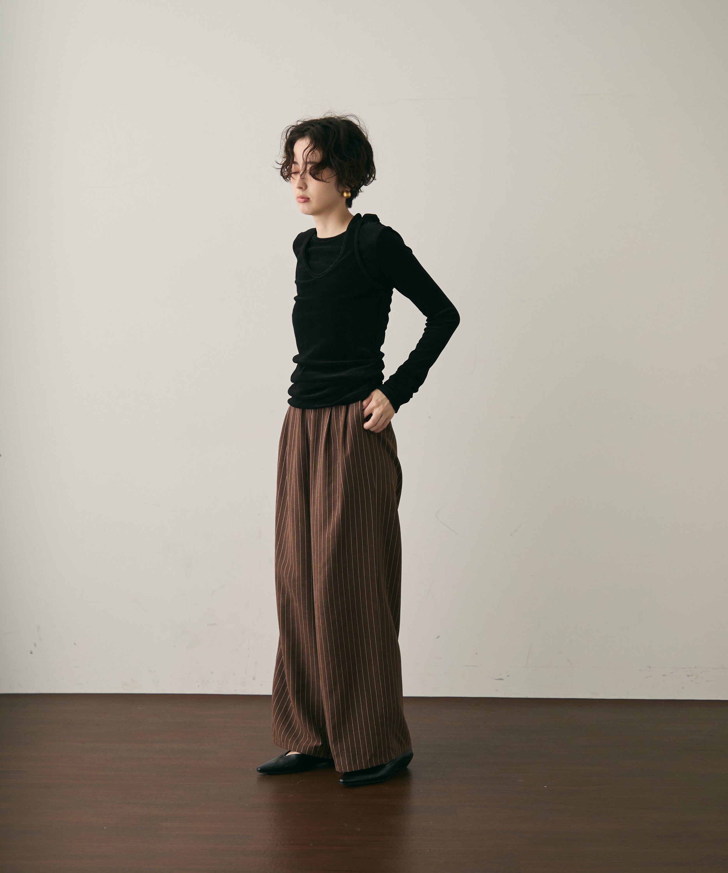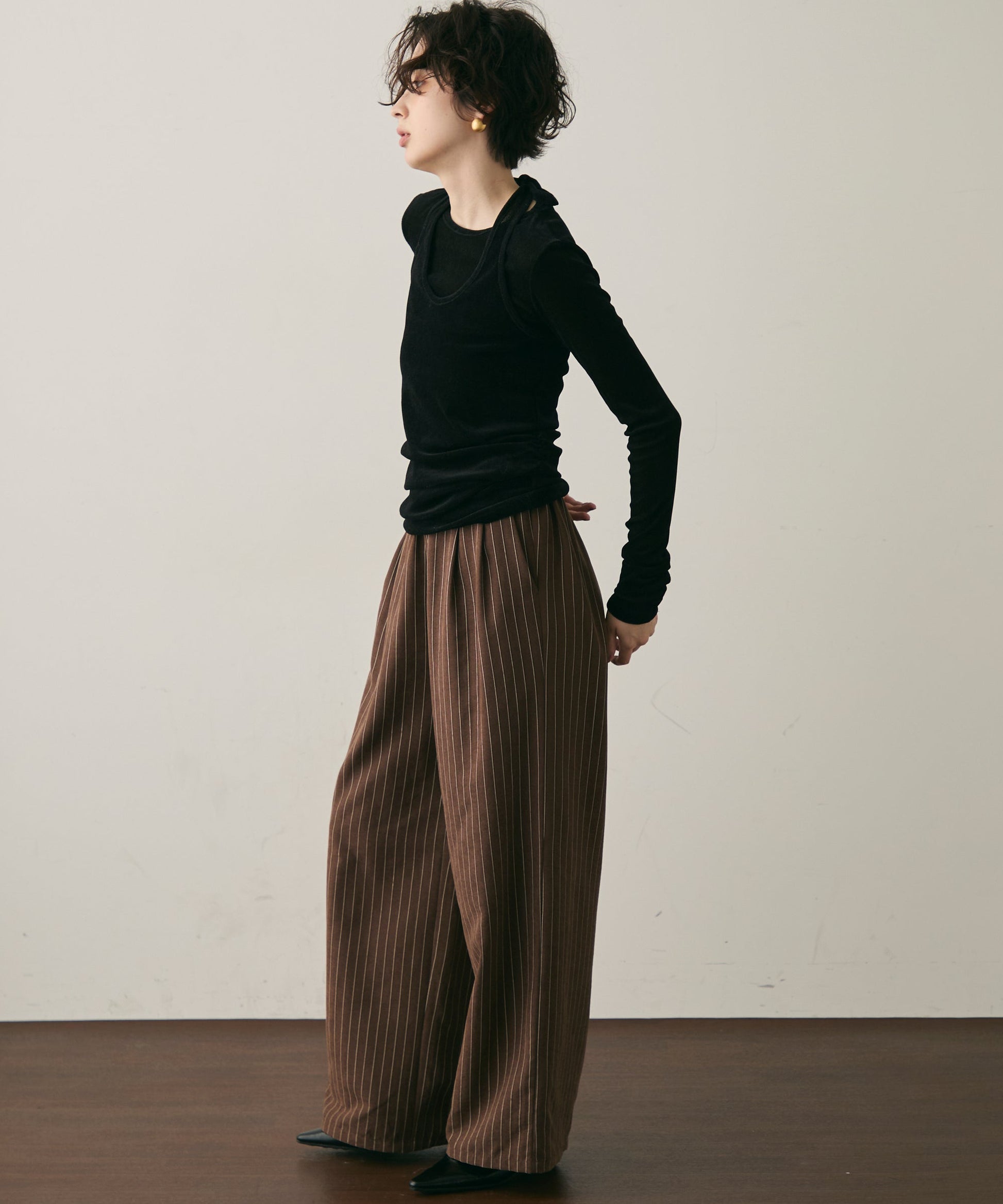 ウエストはギャザー仕様でリラックス感のあるはき心地ながら、タック入りのデザインがきちんと感をプラス。