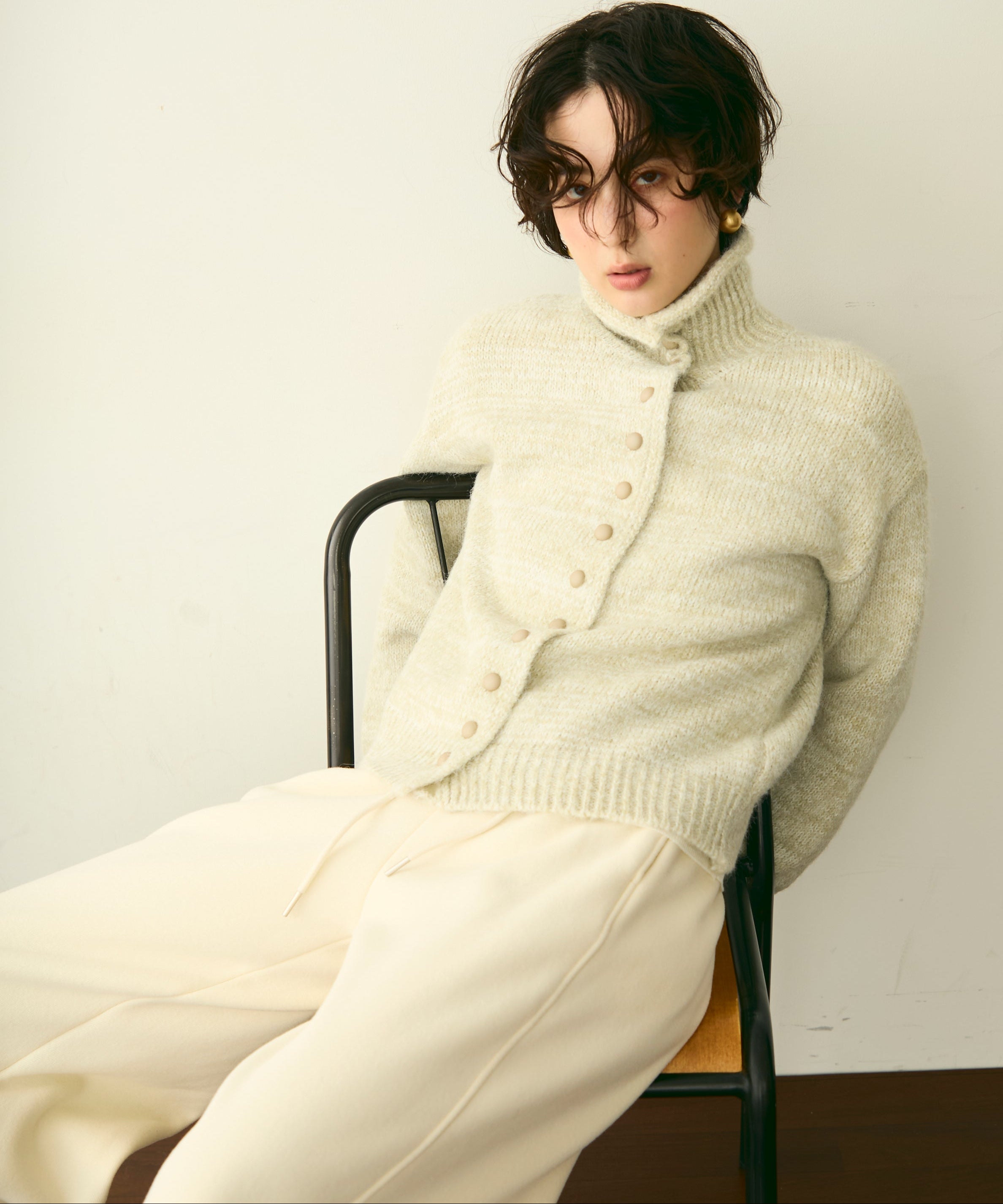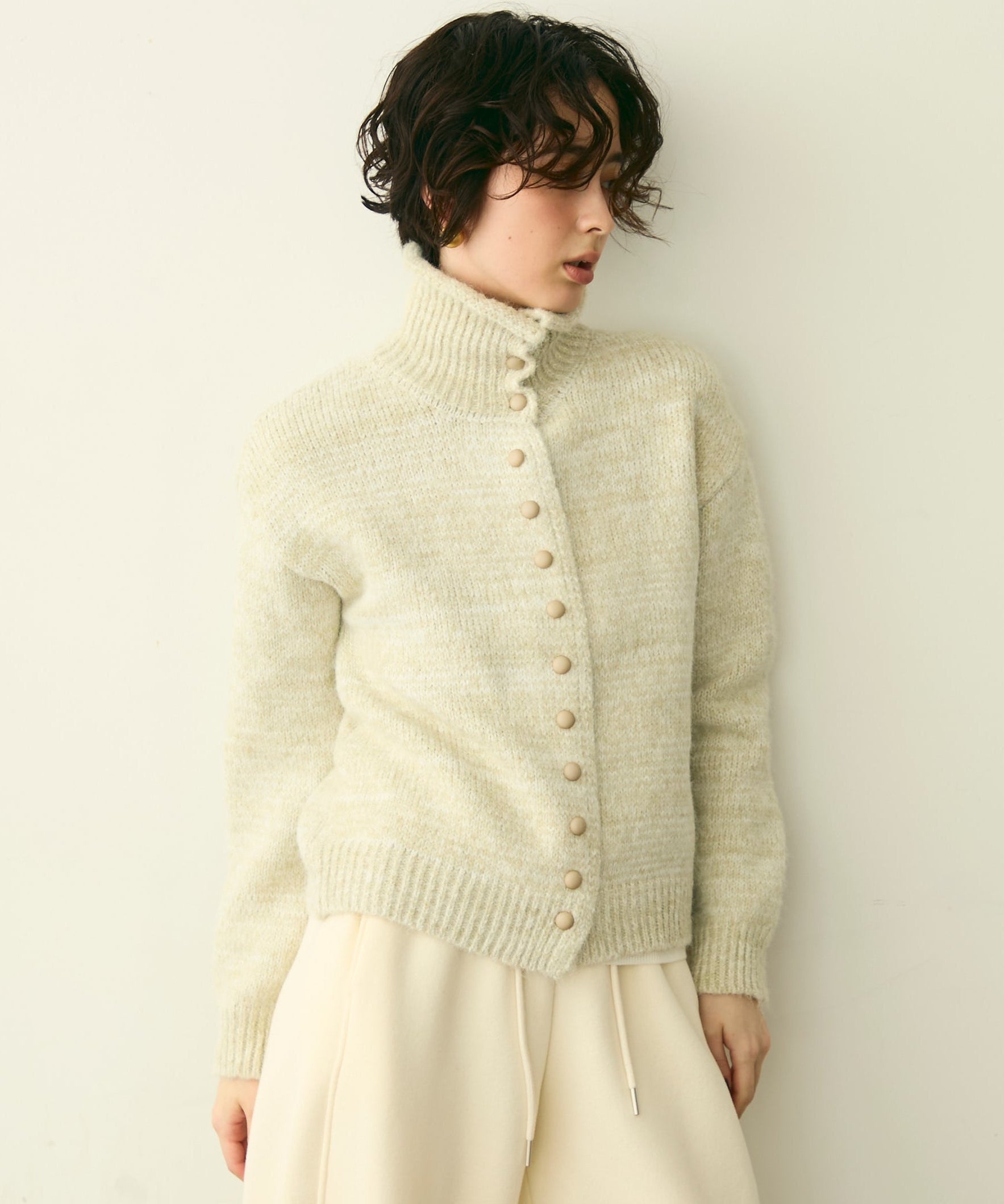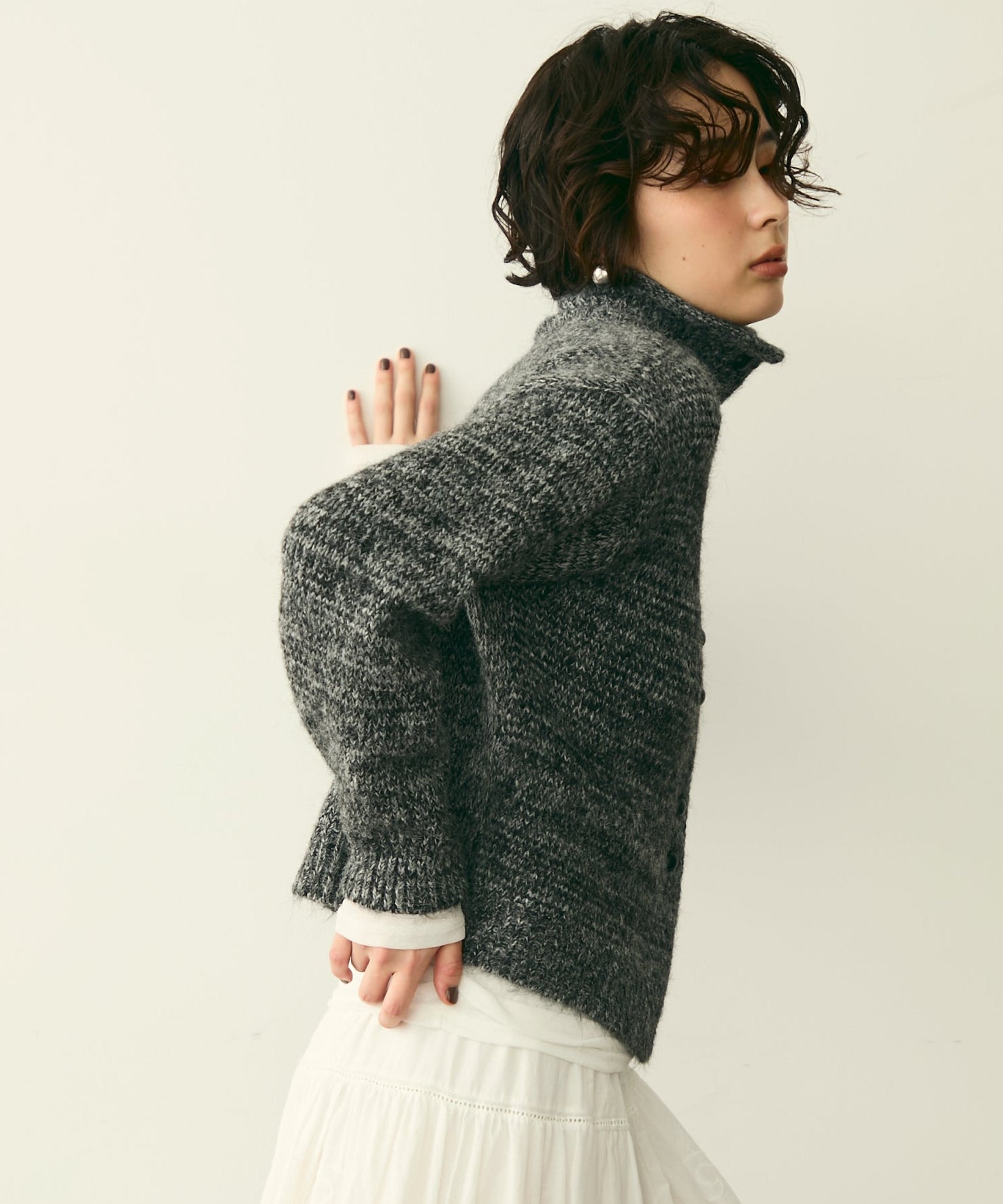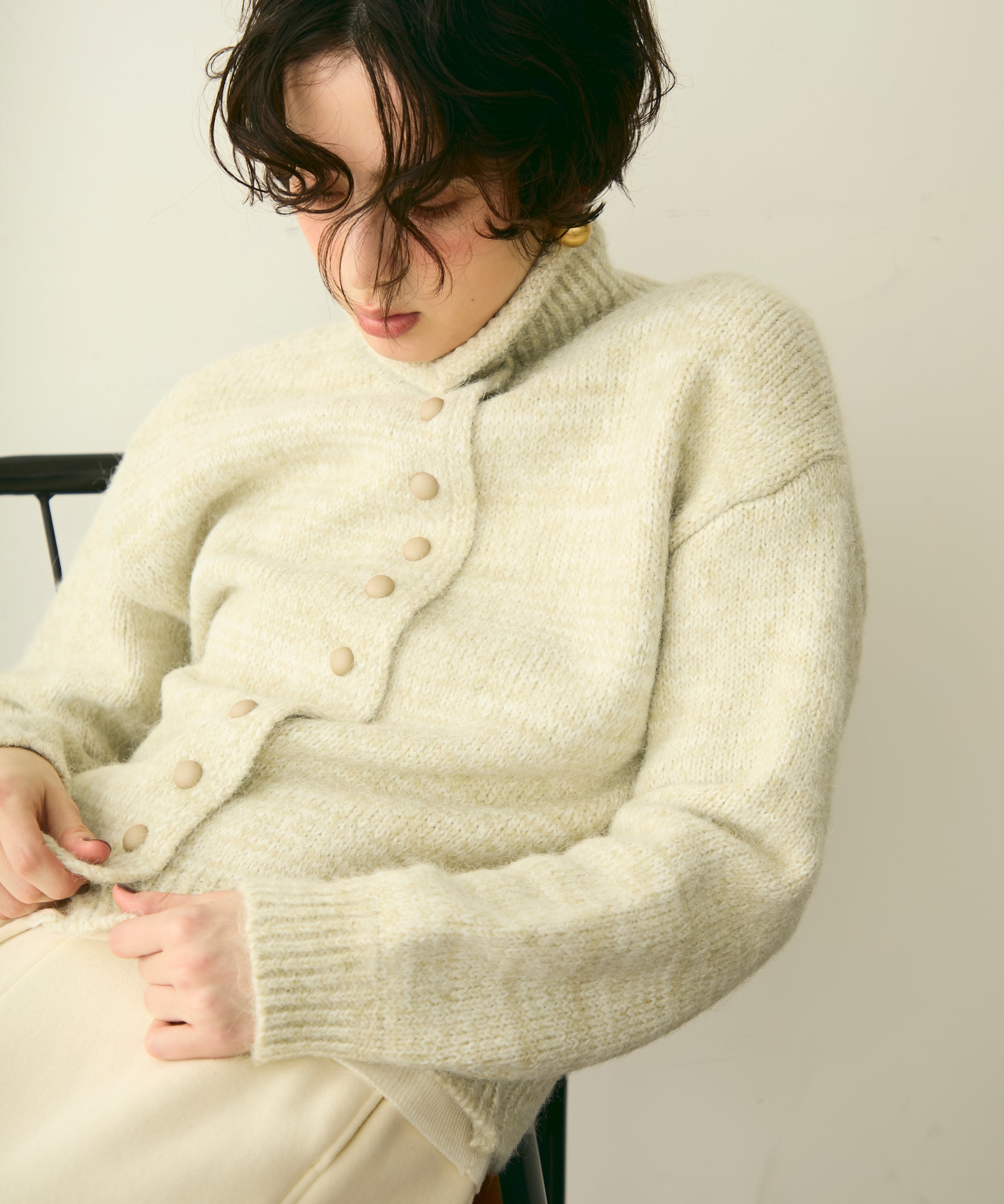 上品なメランジ素材を使用した、存在感のある多釦デザインニット。
