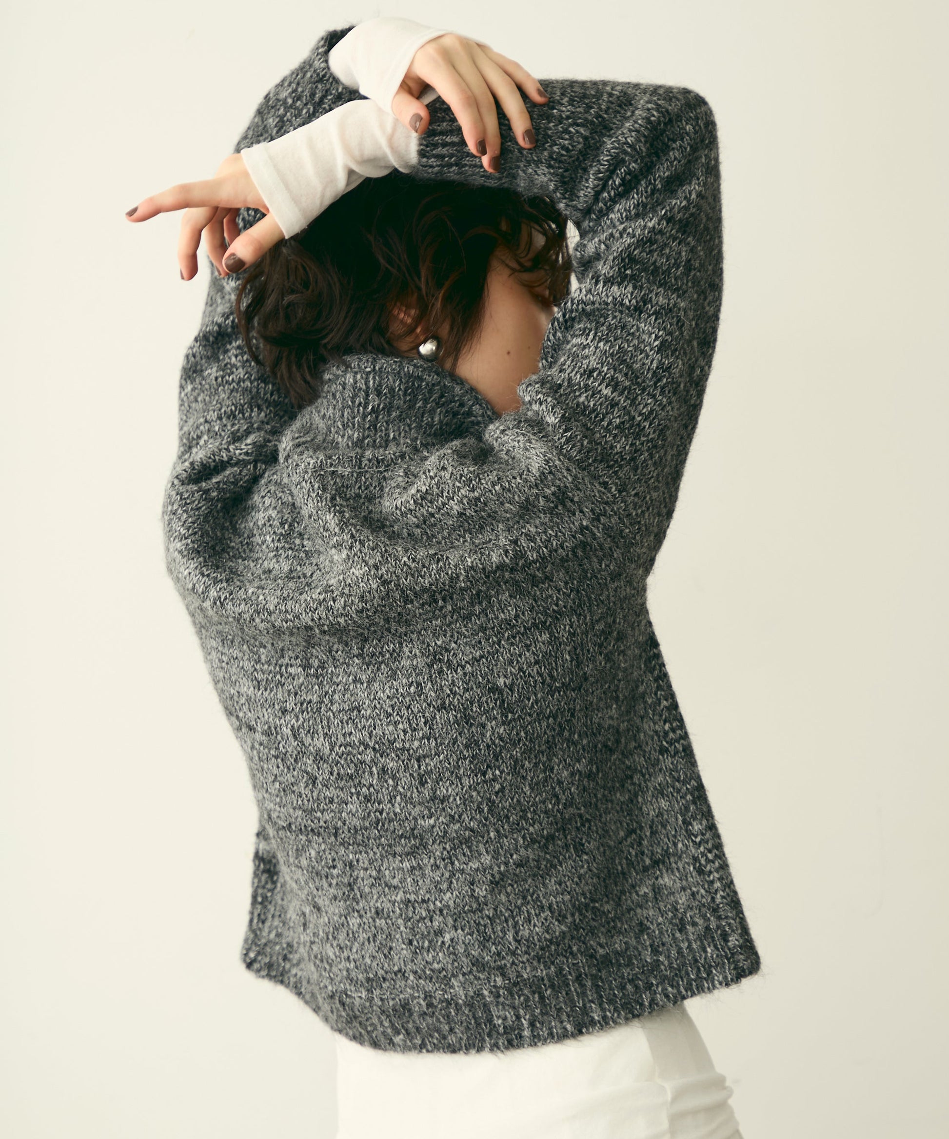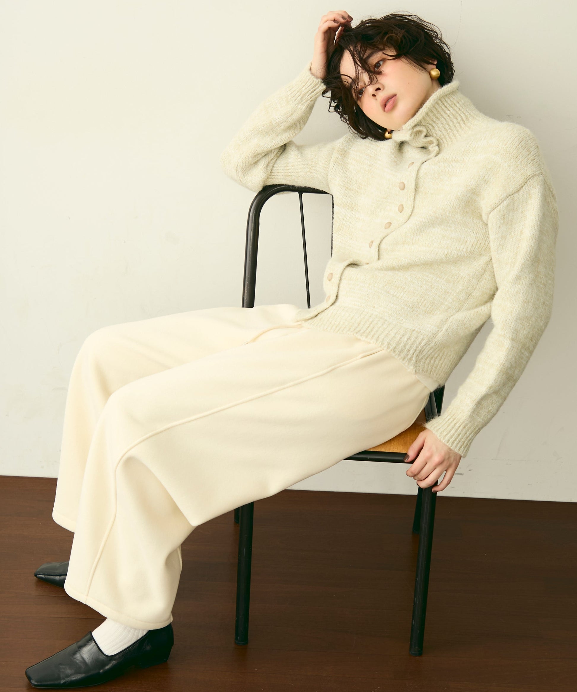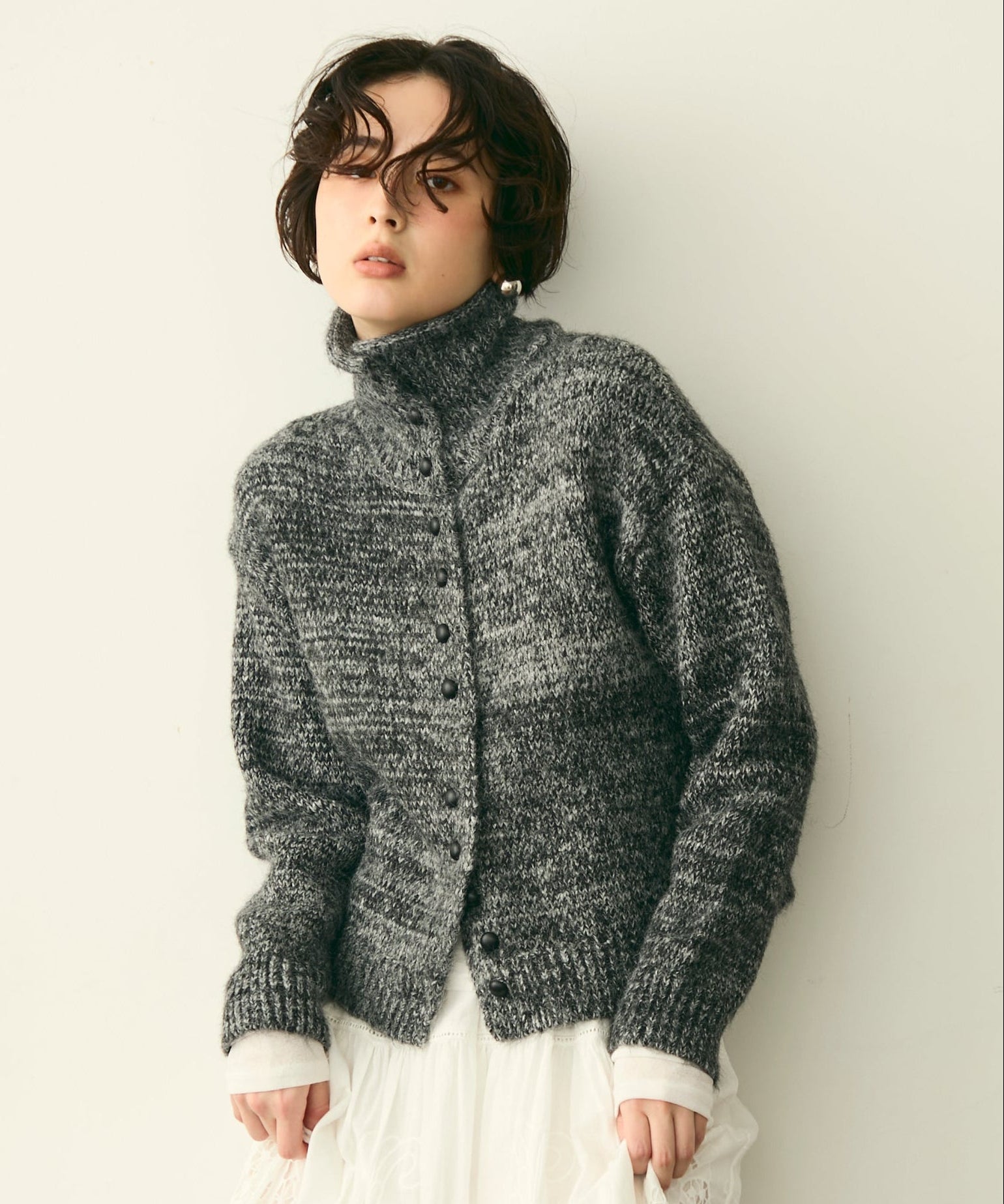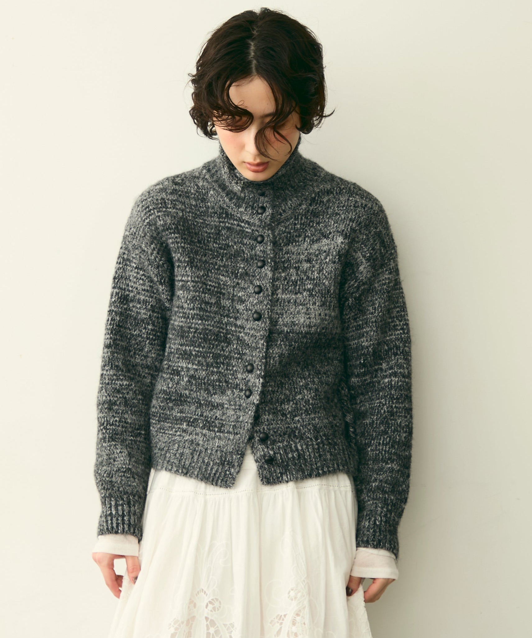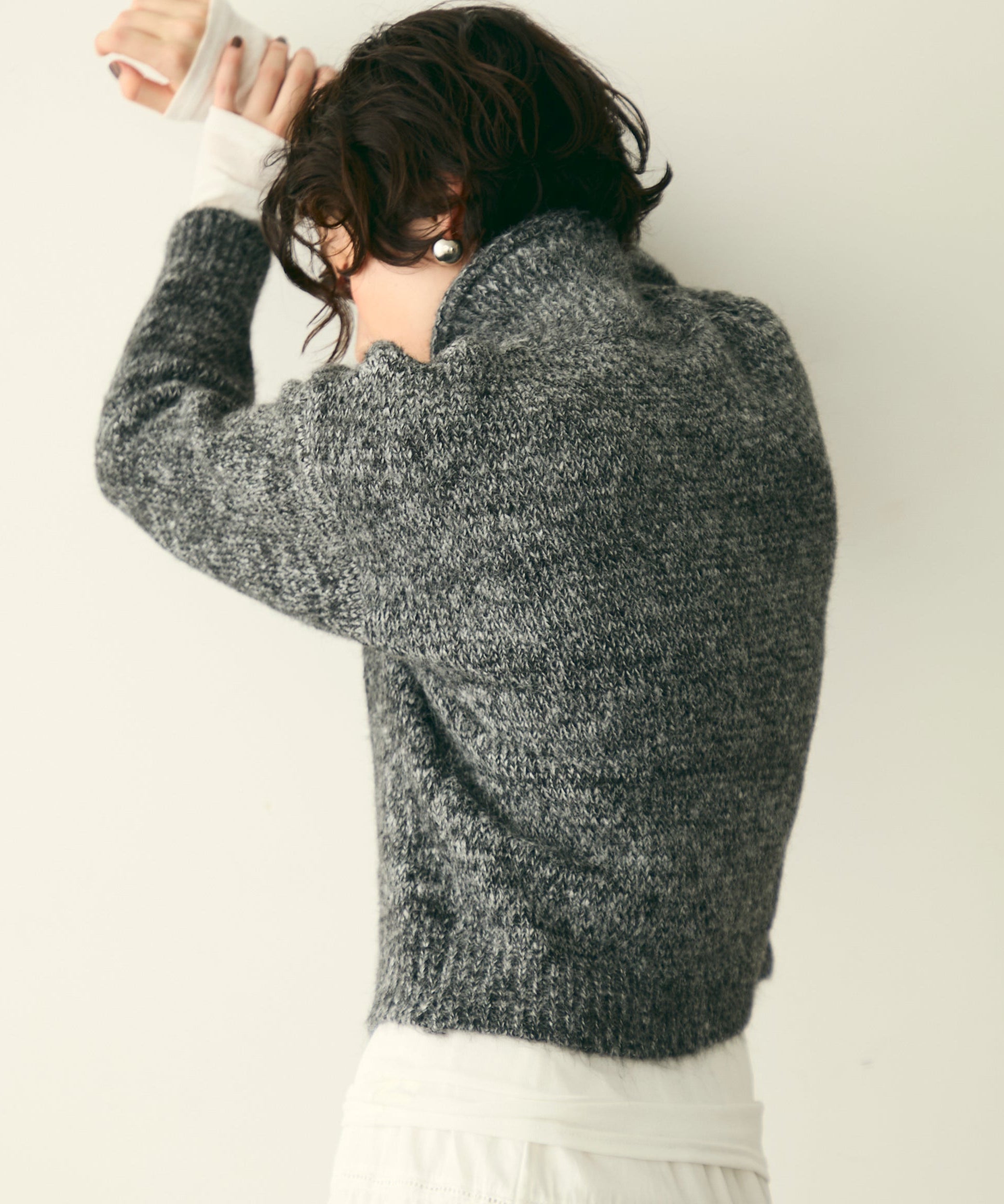 上品なメランジ素材を使用した、存在感のある多釦デザインニット。
