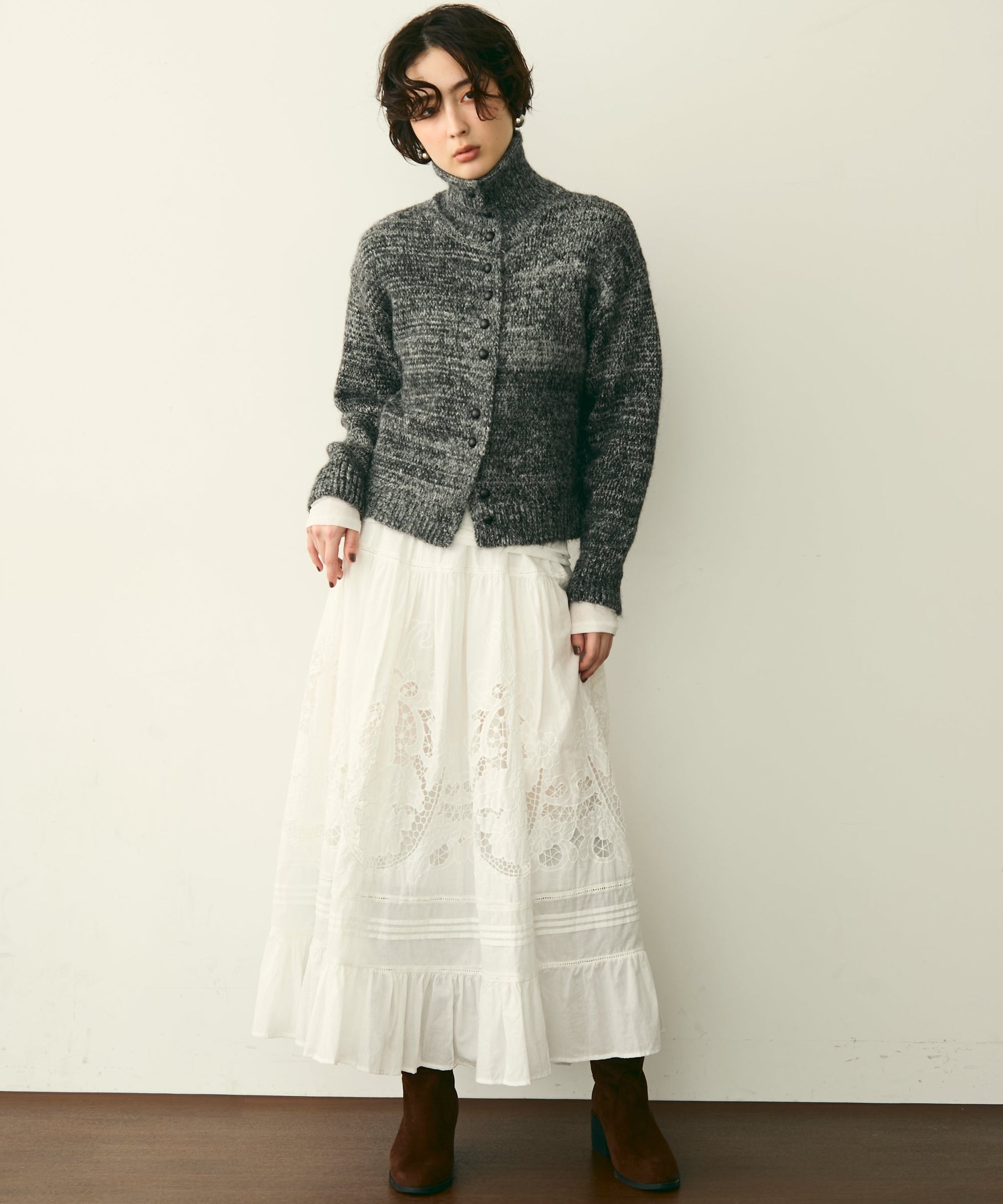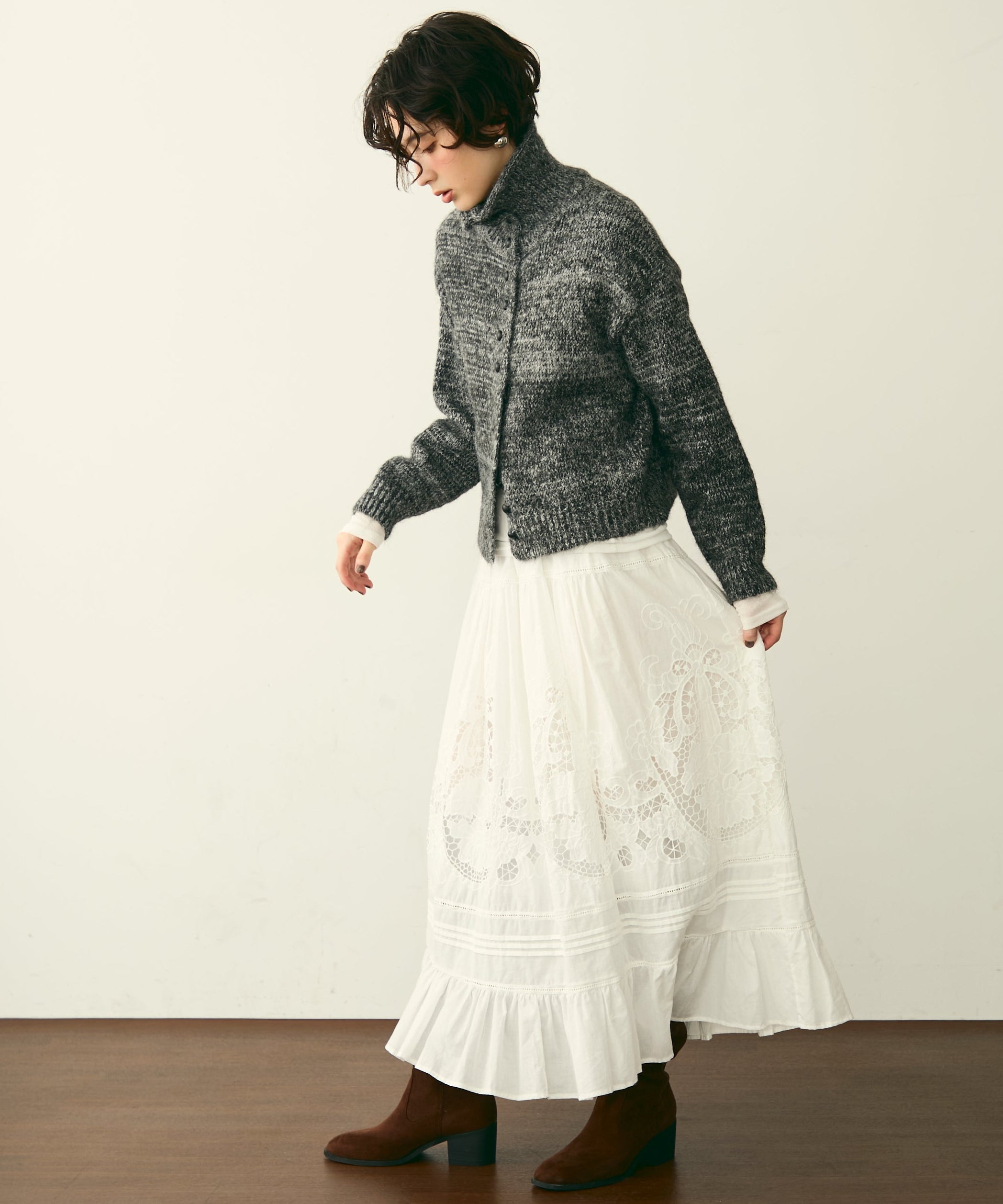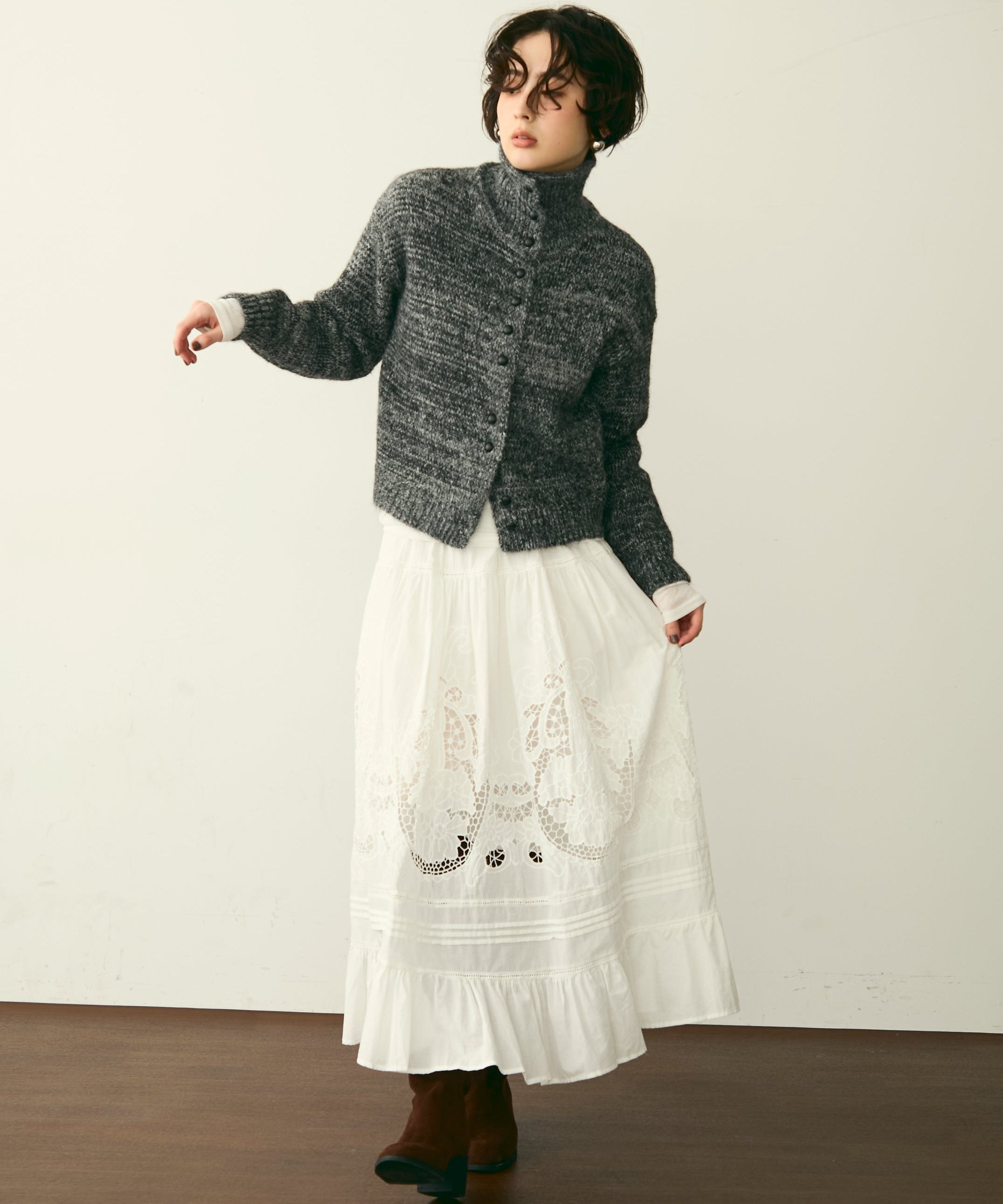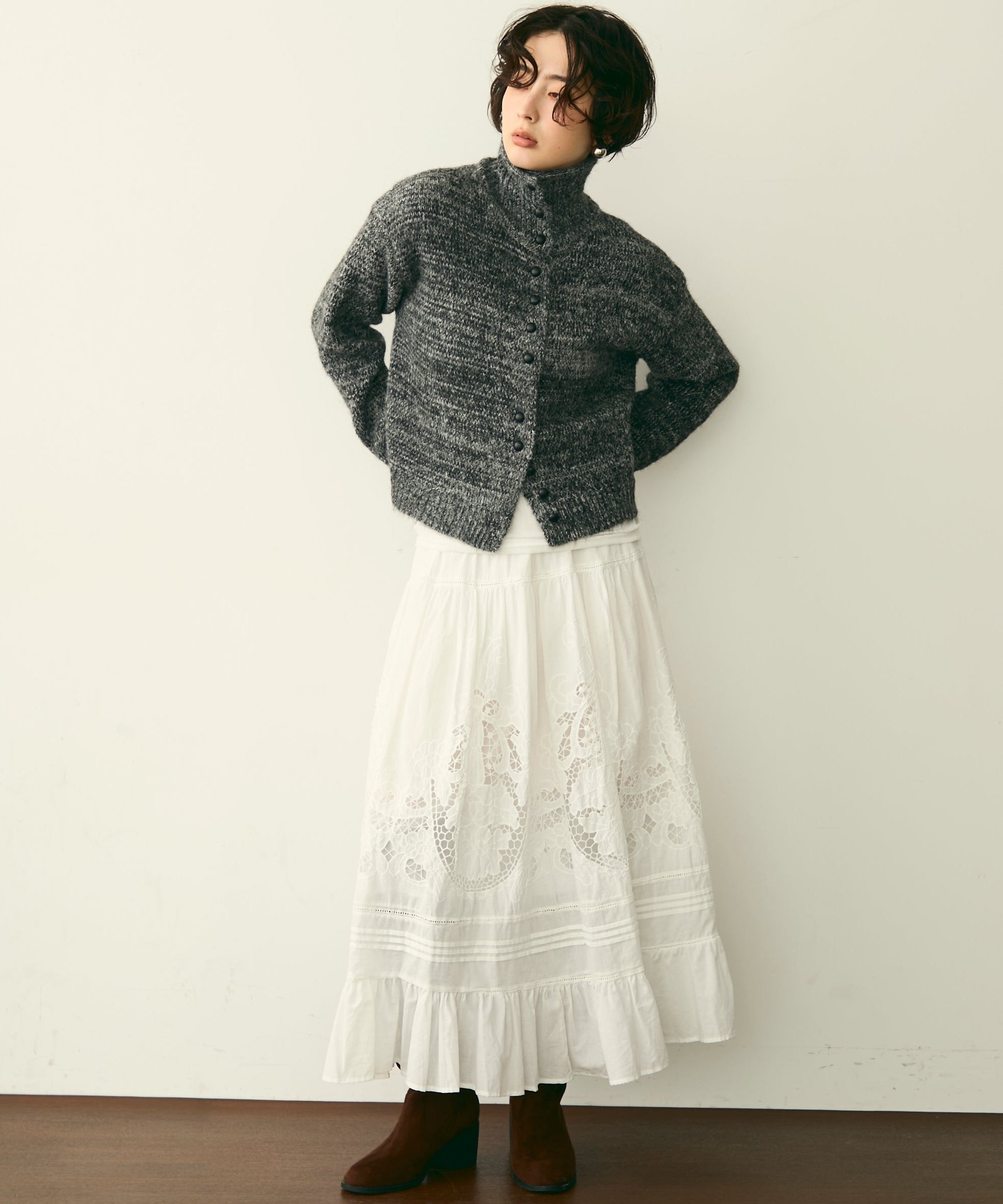上品なメランジ素材を使用した、存在感のある多釦デザインニット。