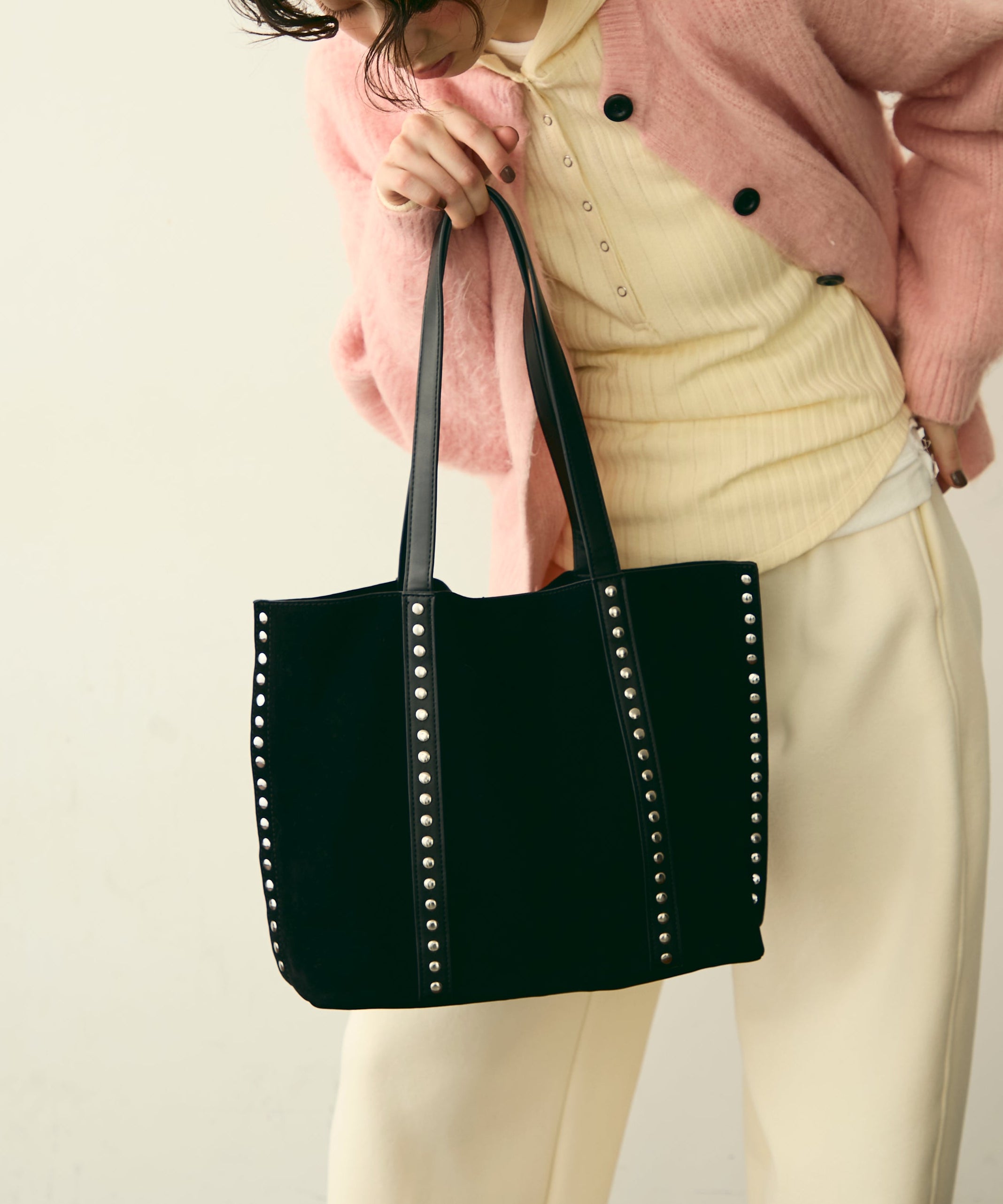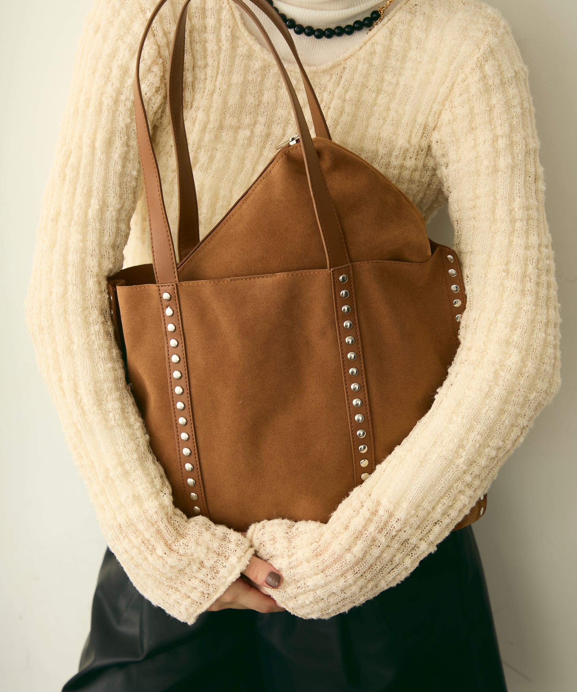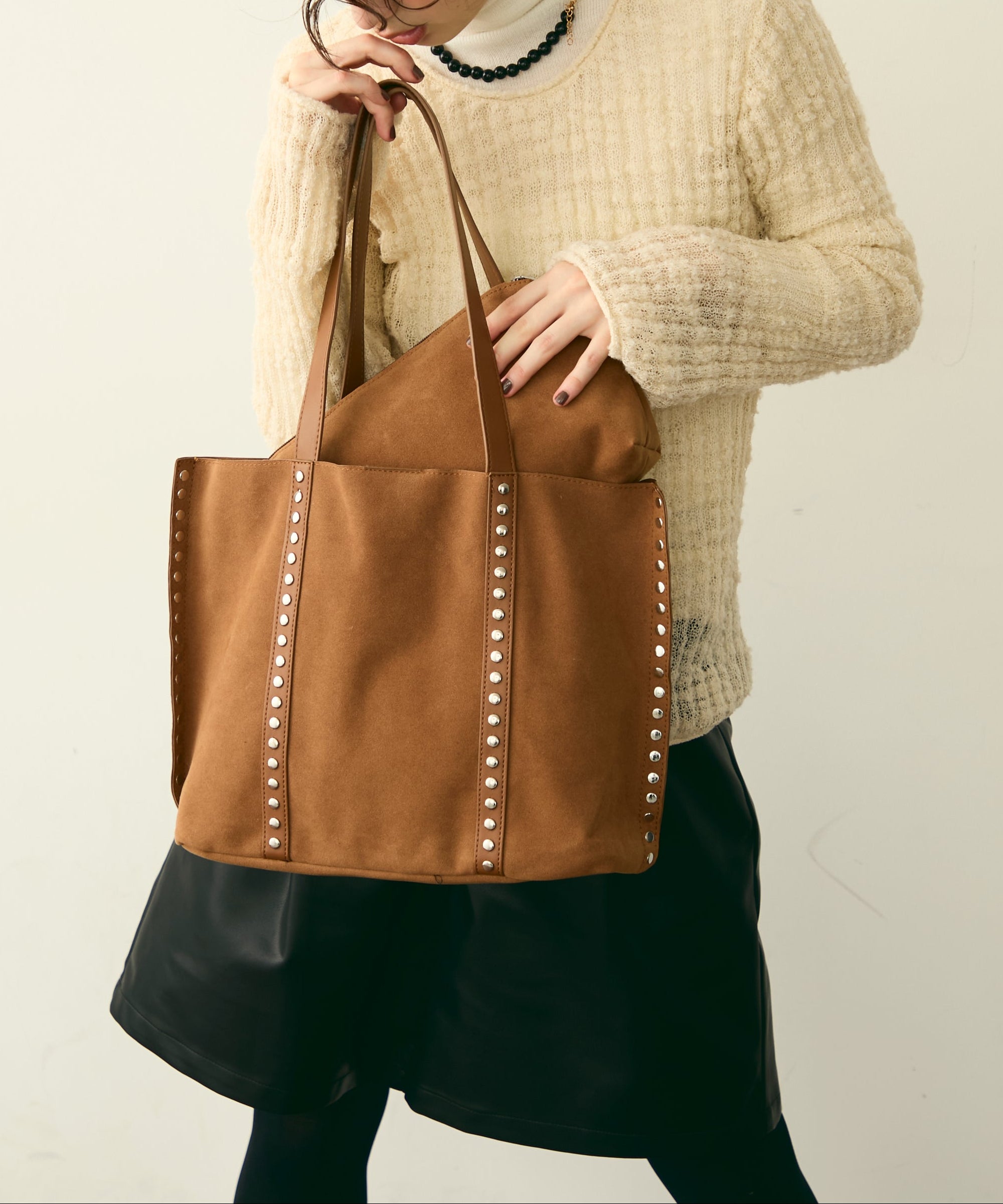 上質なスエード風素材にスタッズをあしらった、トレンド感あふれるショルダーバッグ。
