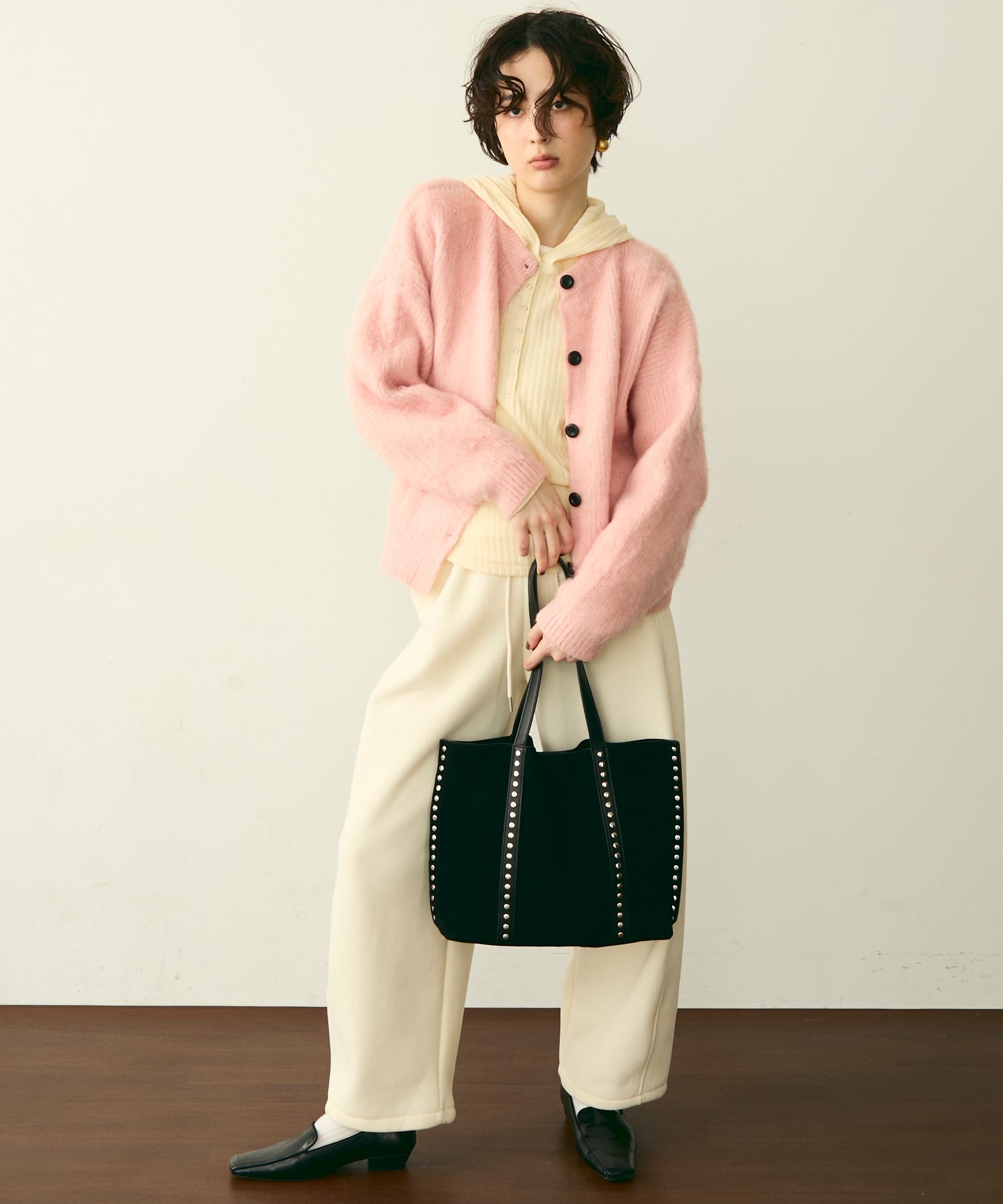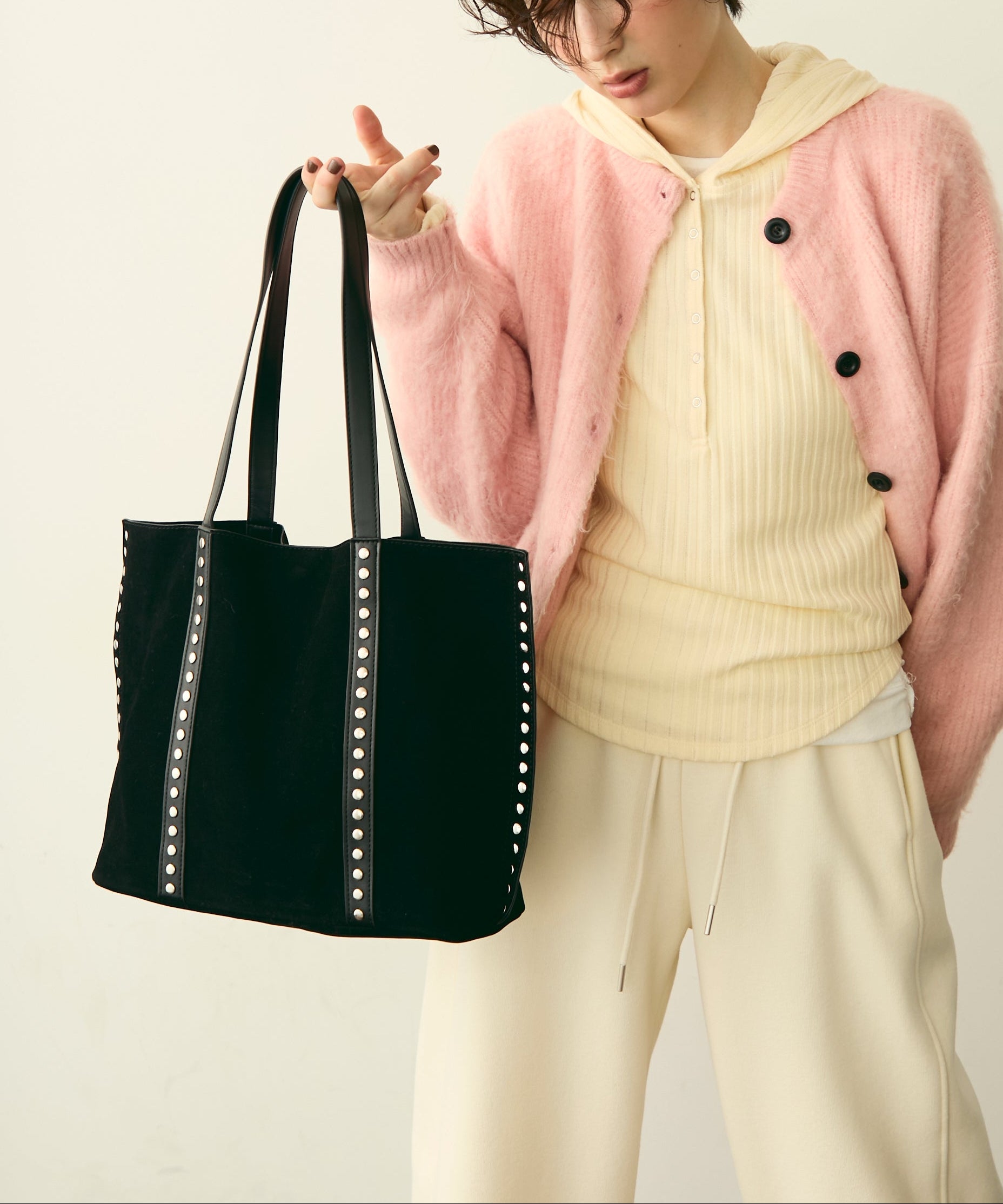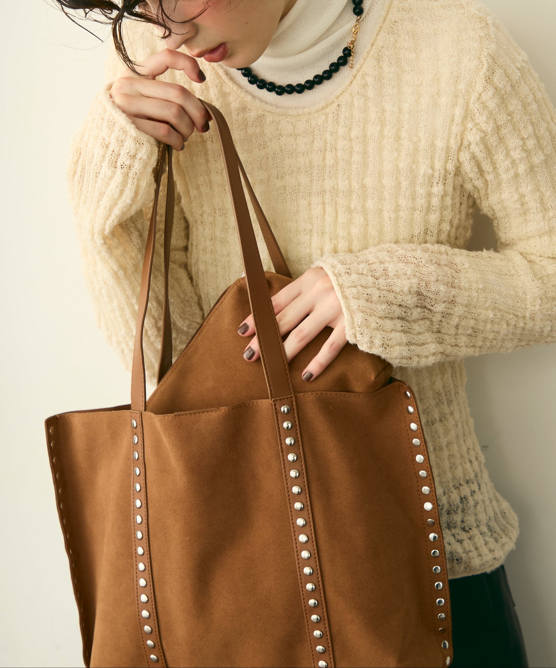 上質なスエード風素材にスタッズをあしらった、トレンド感あふれるショルダーバッグ。