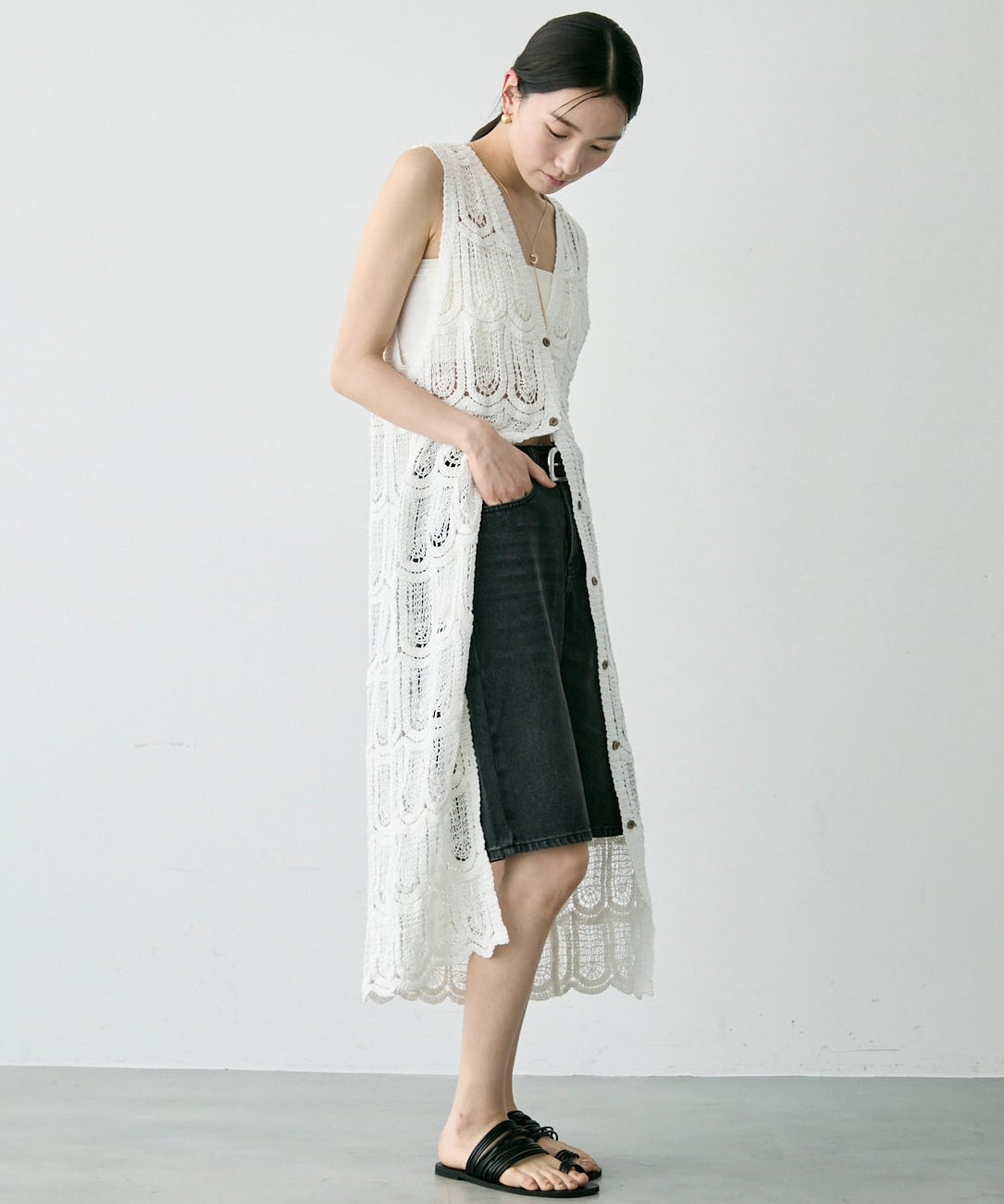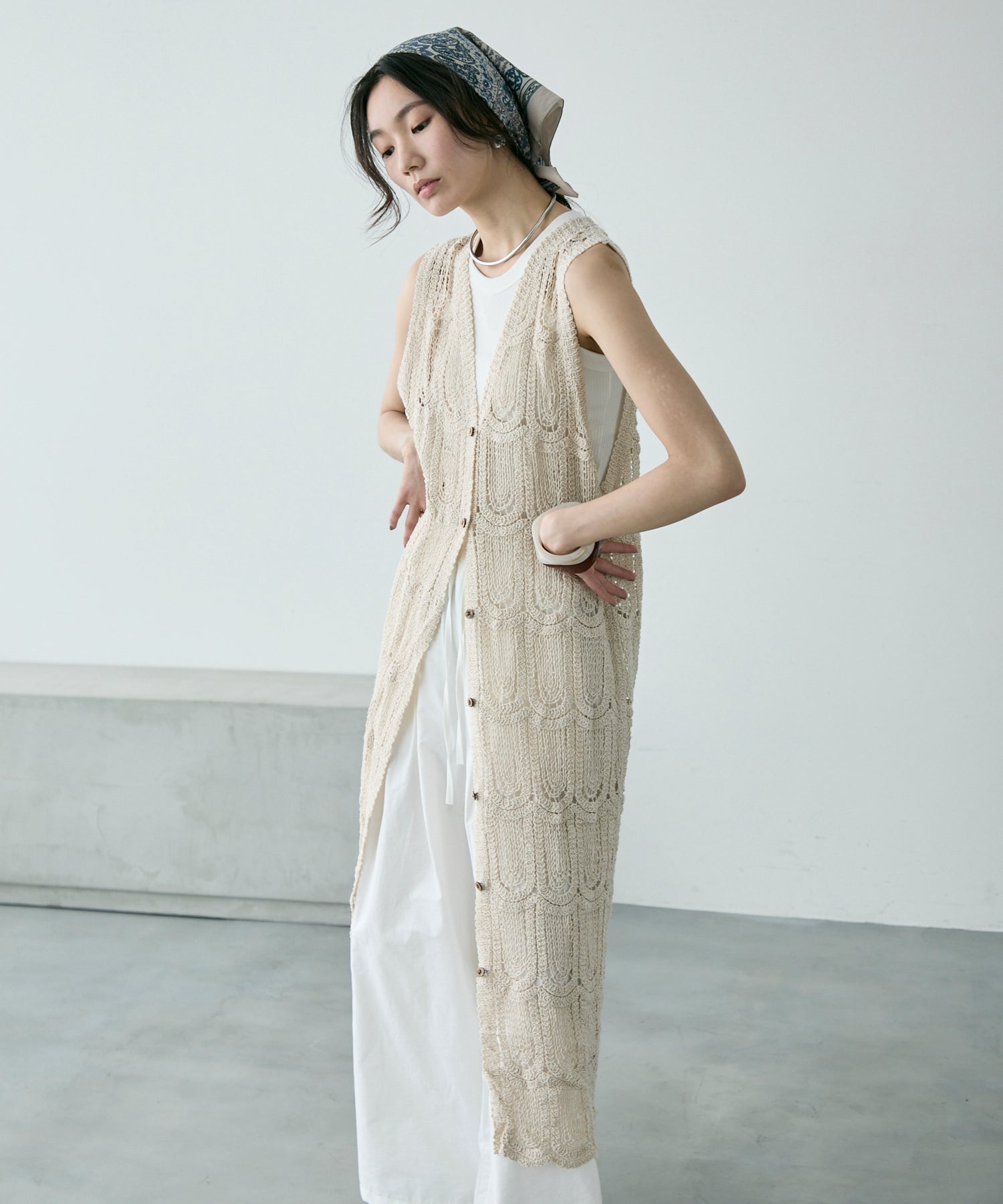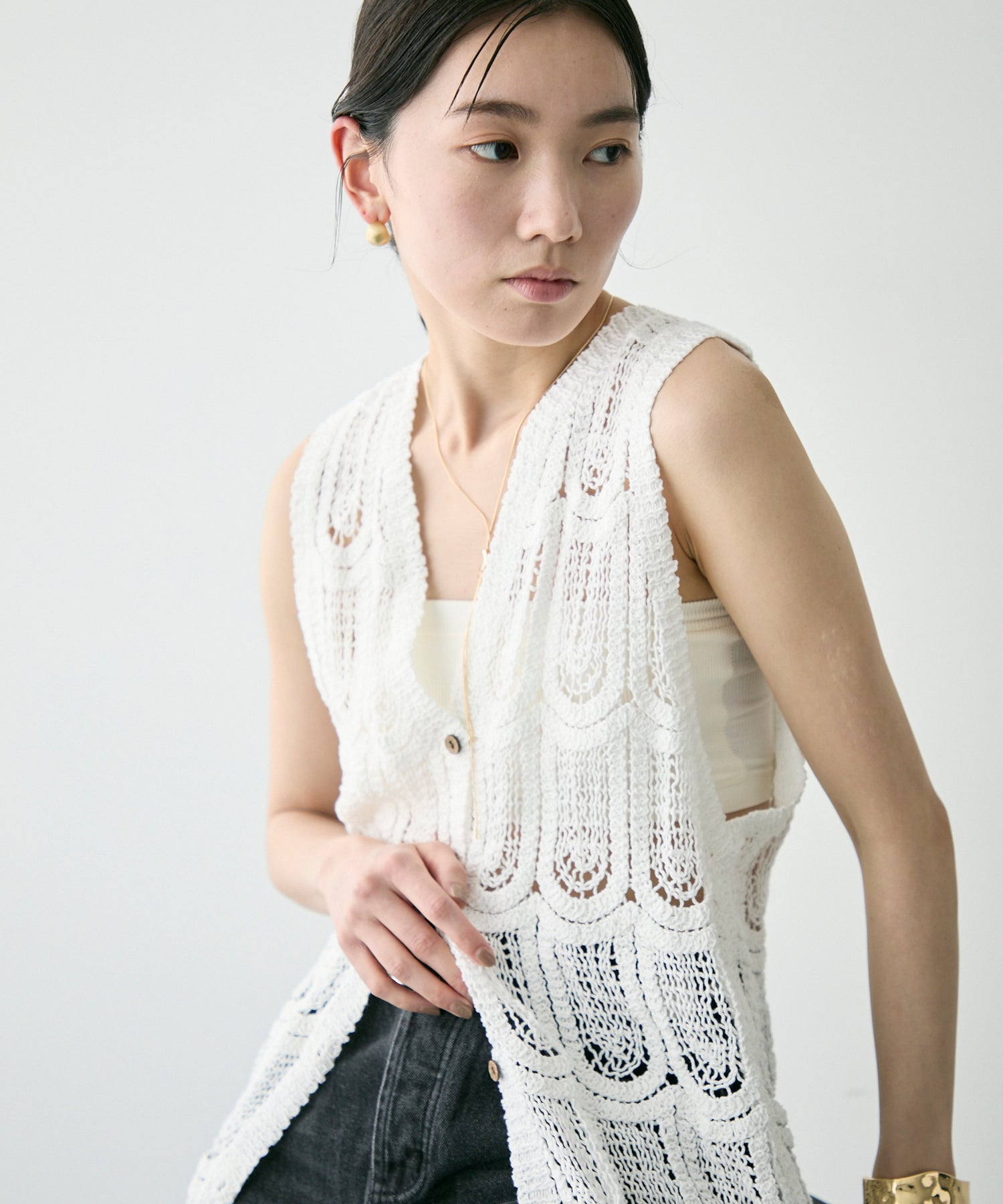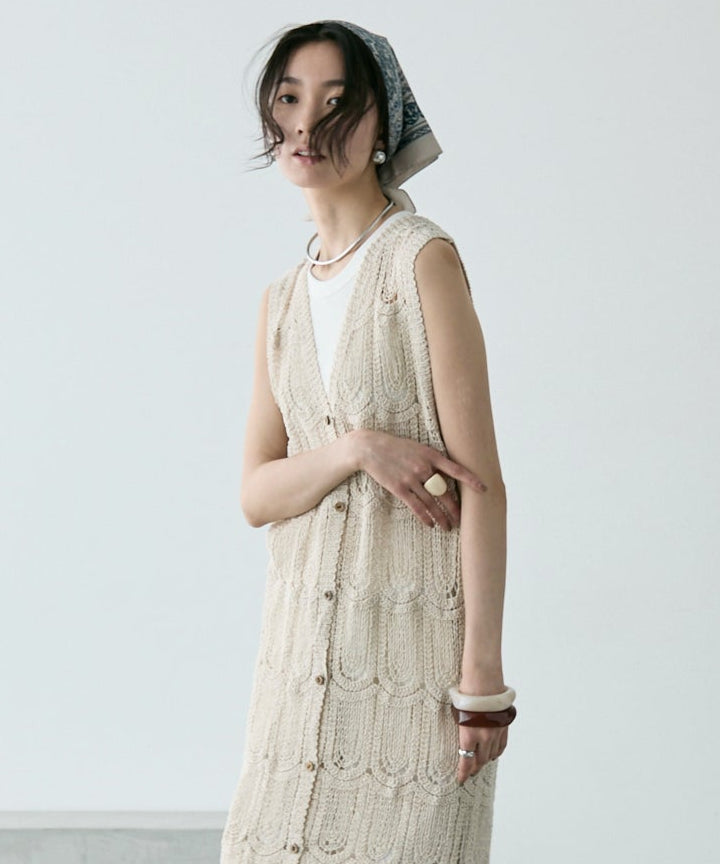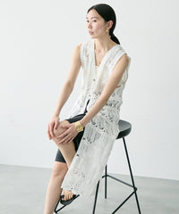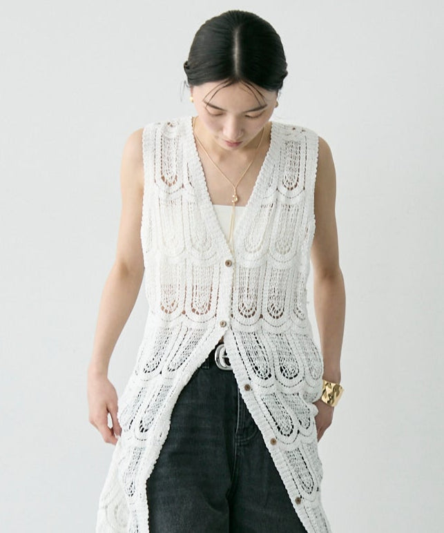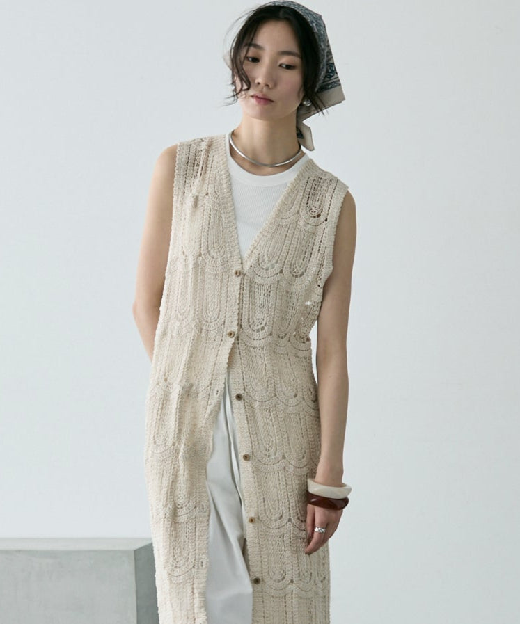透かし編み前ボタンロングジレ