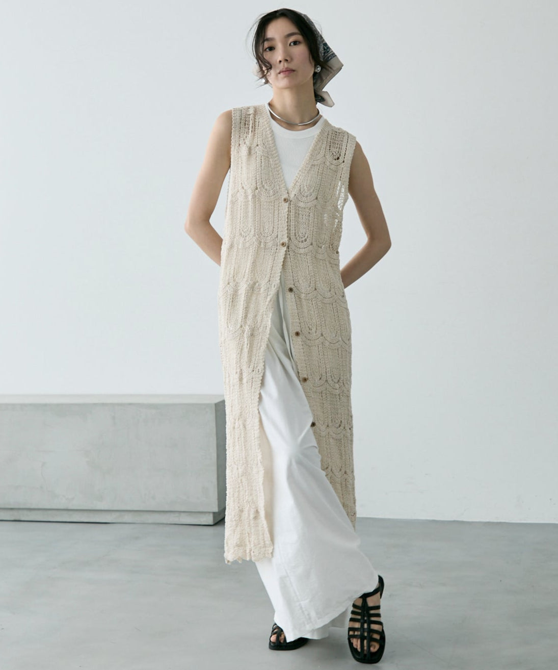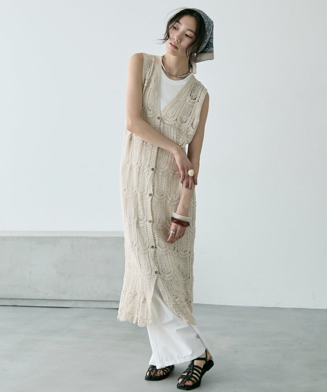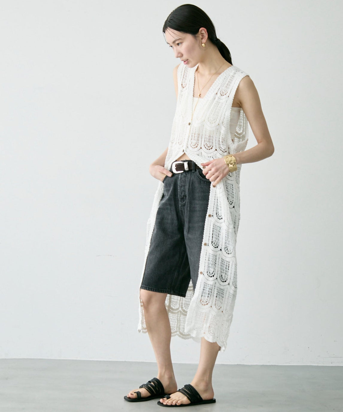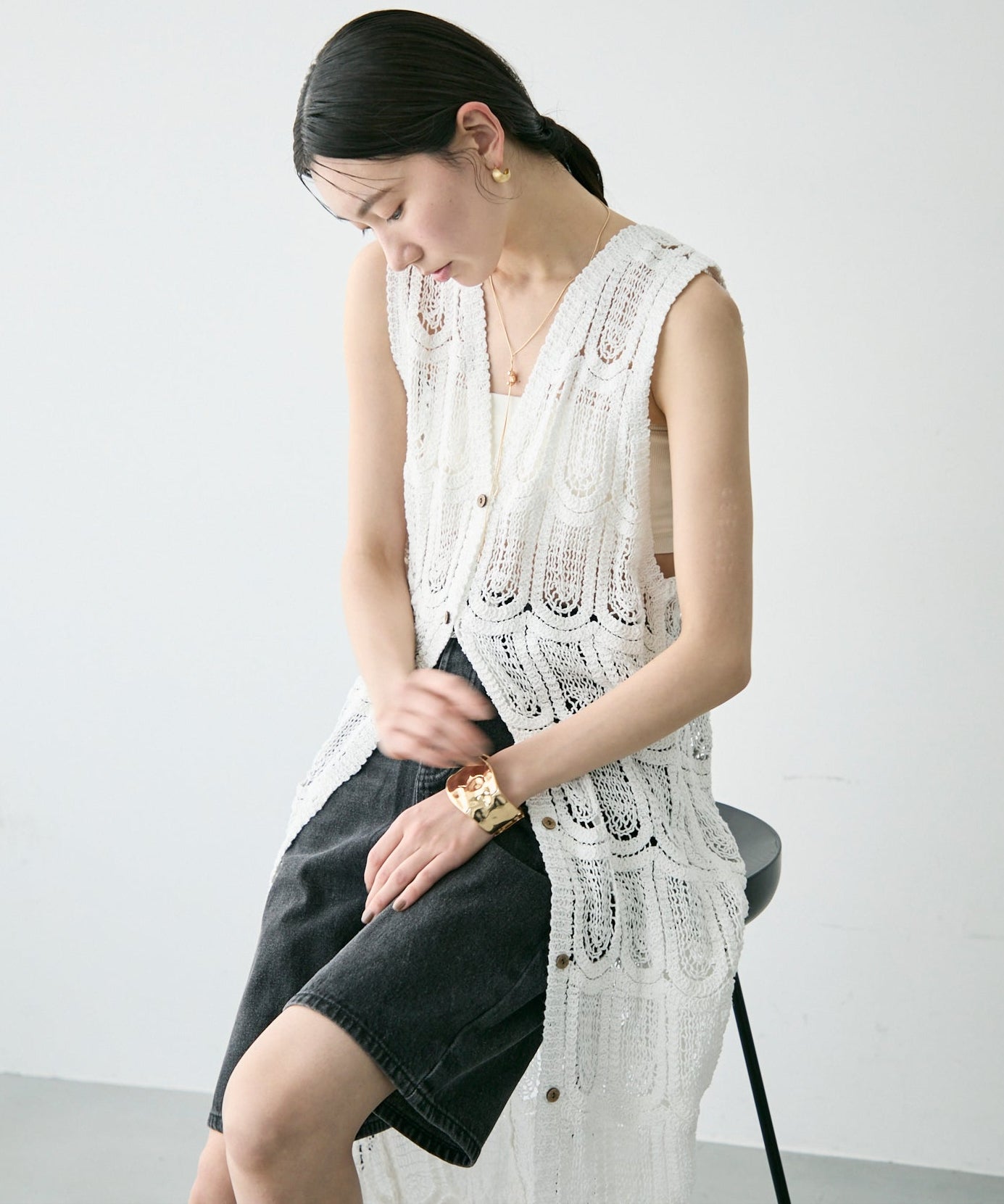 透かし編み前ボタンロングジレ