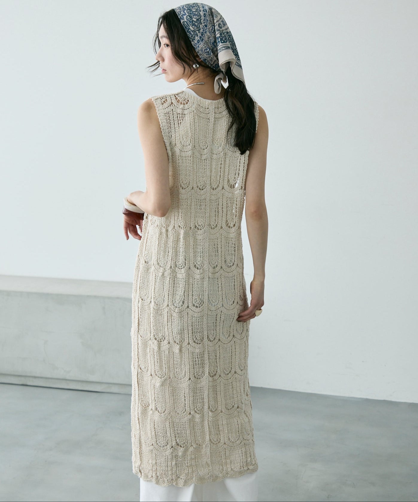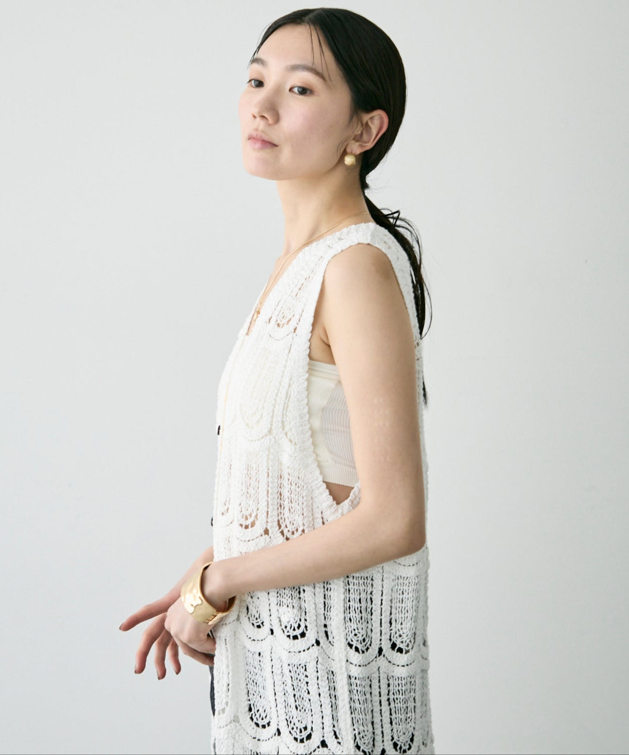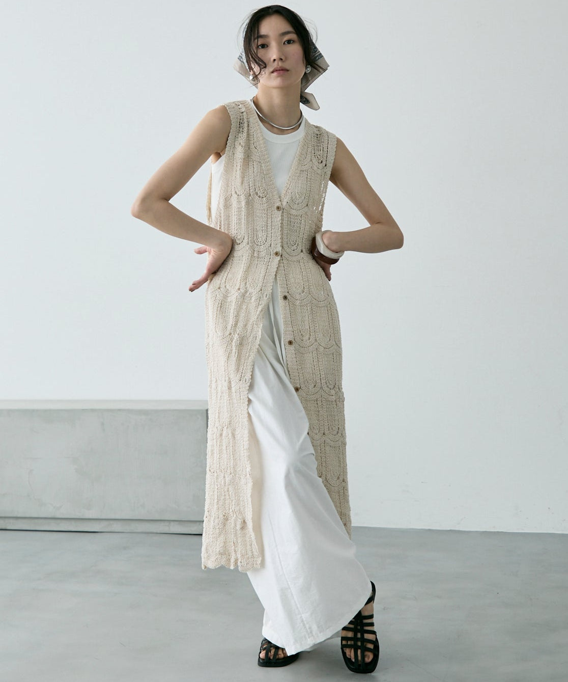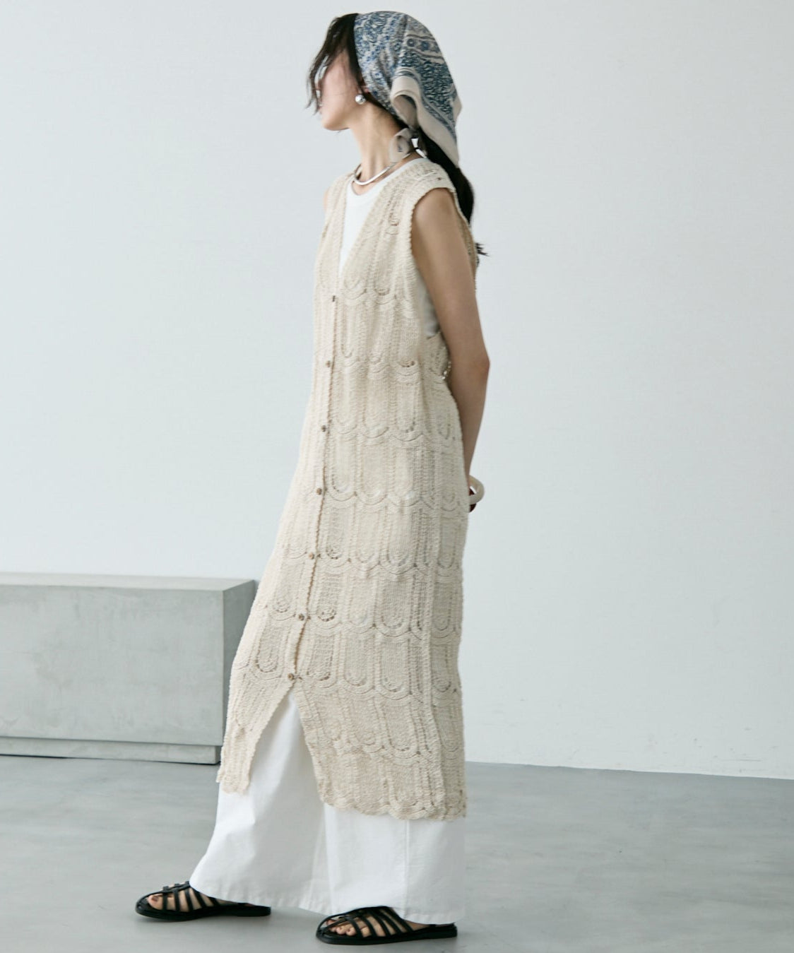 透かし編み前ボタンロングジレ