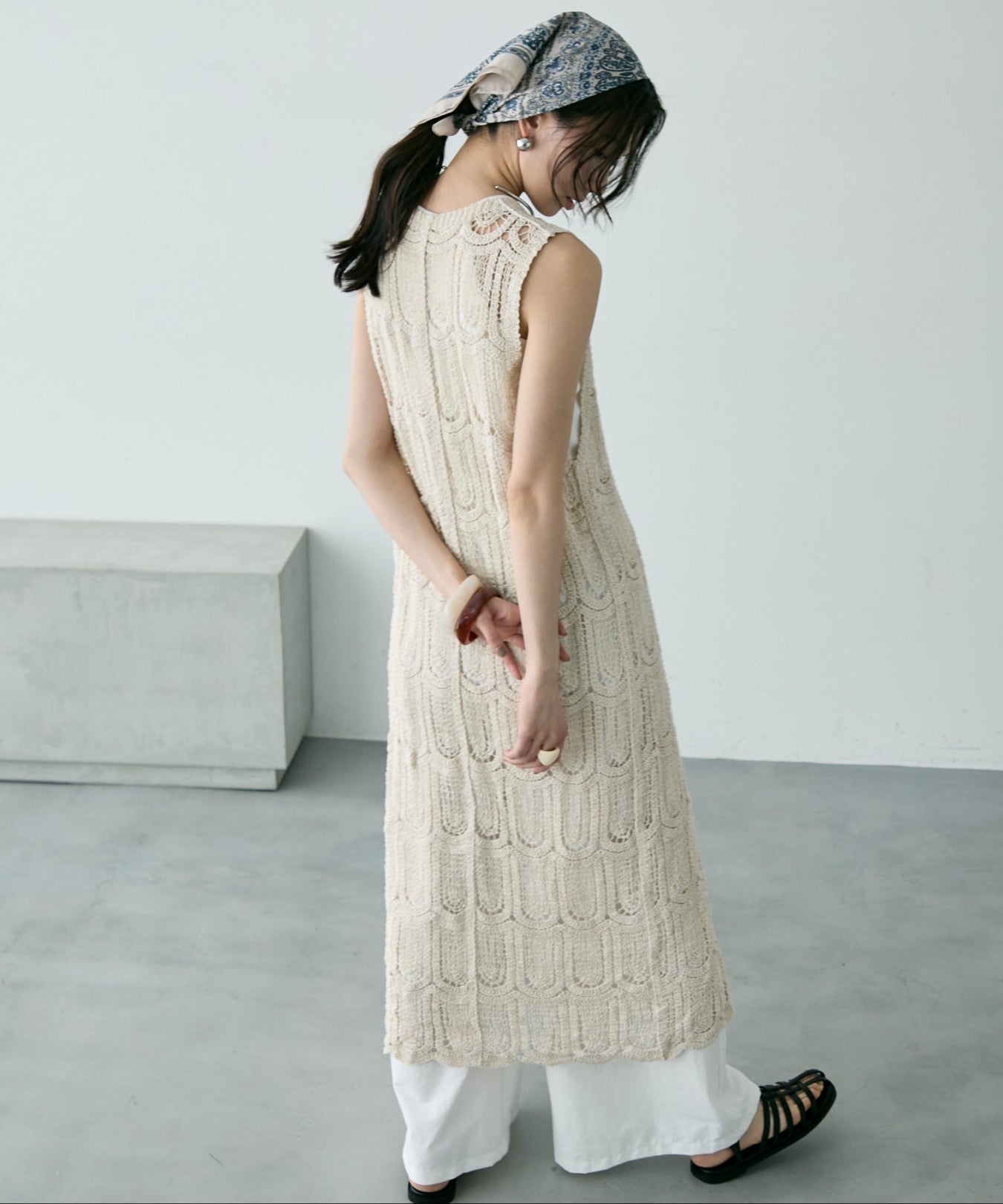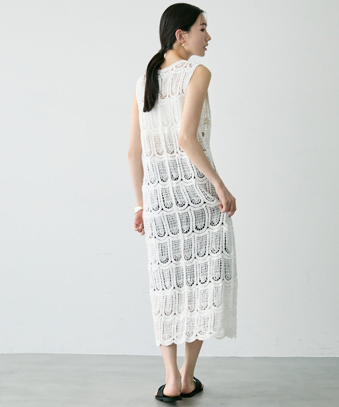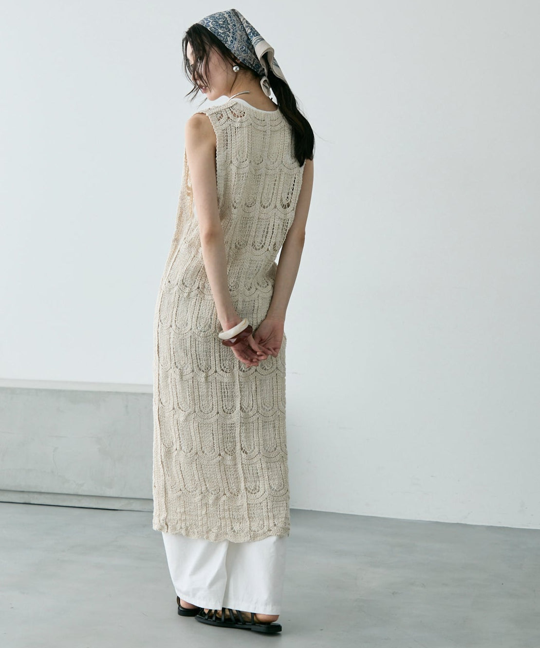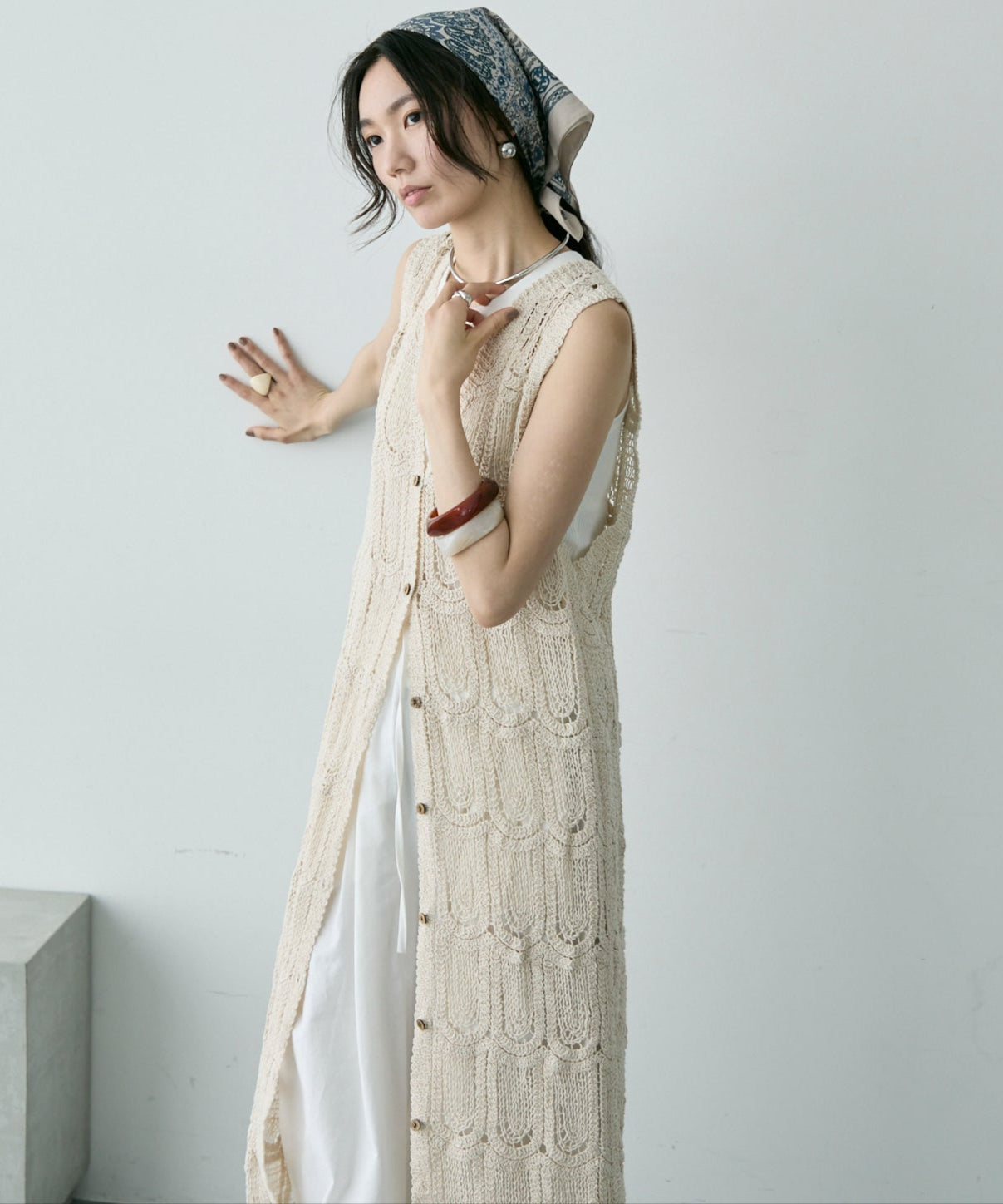 透かし編み前ボタンロングジレ