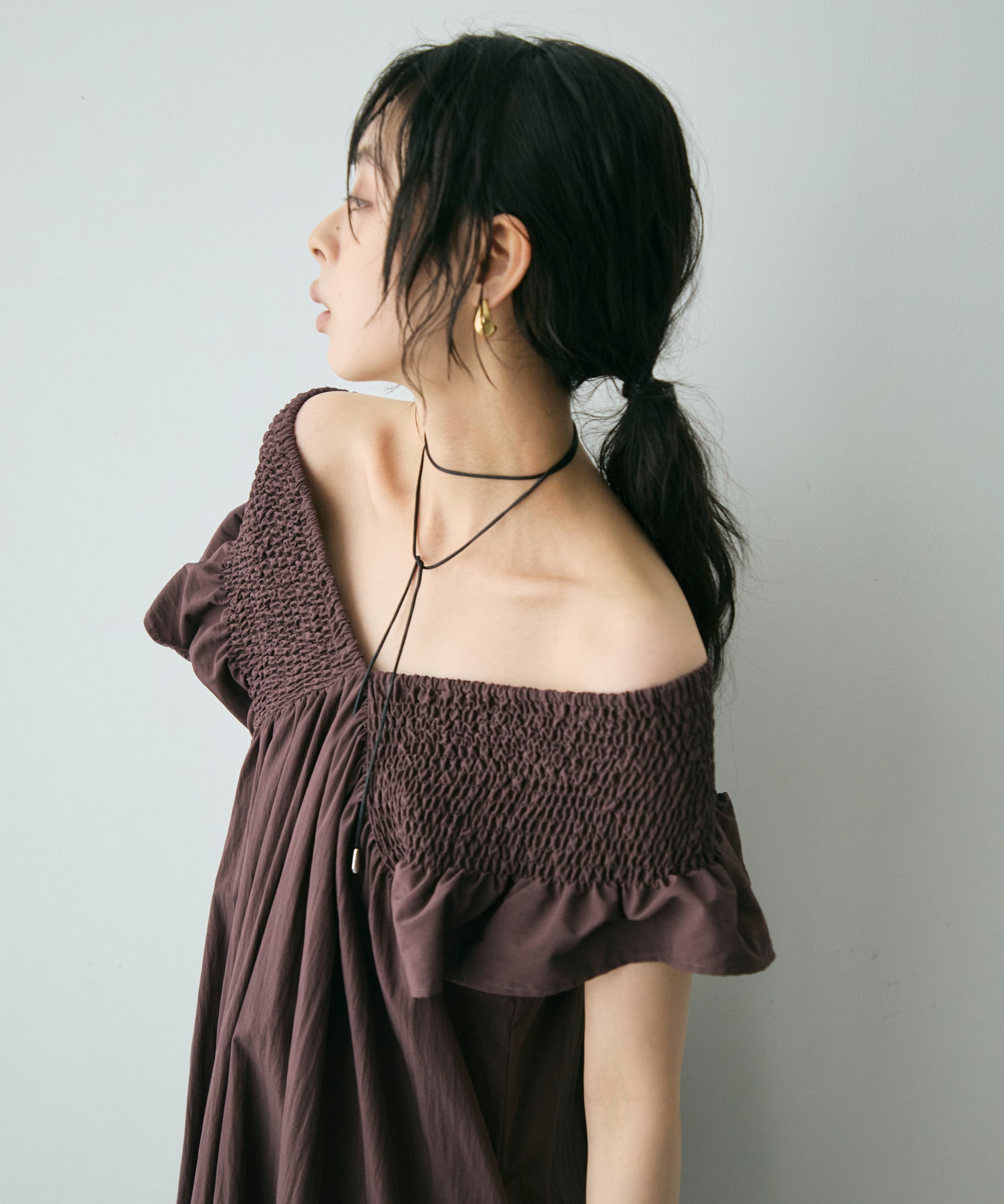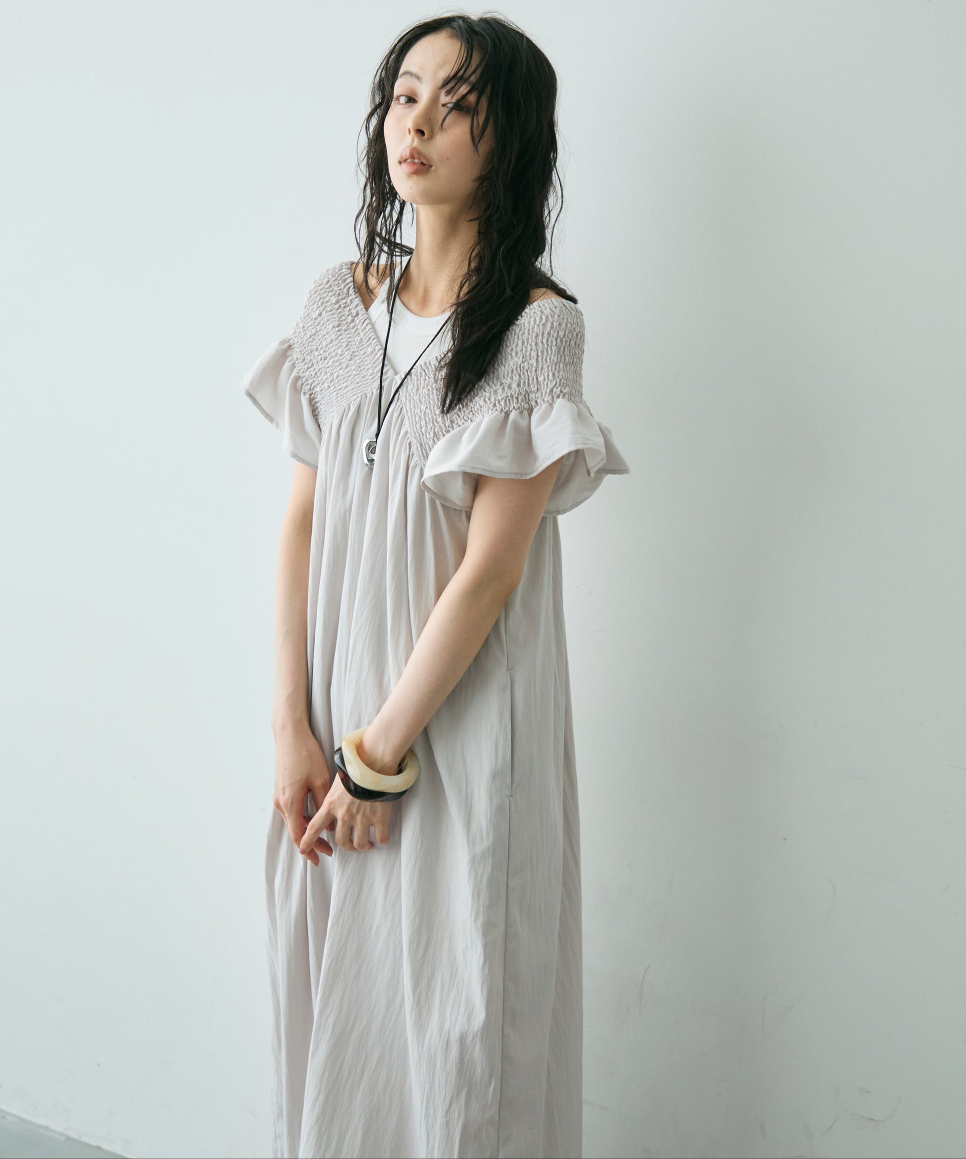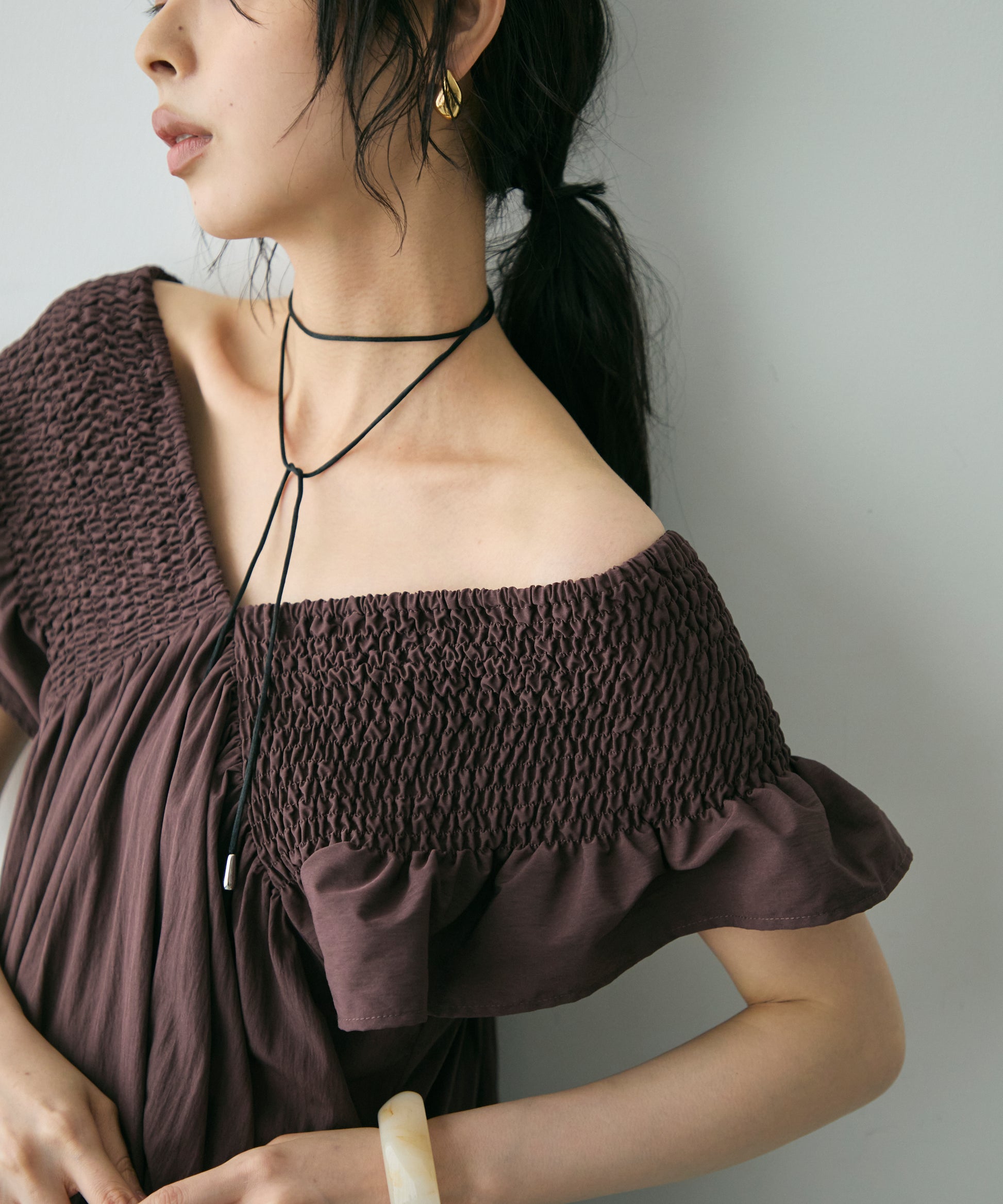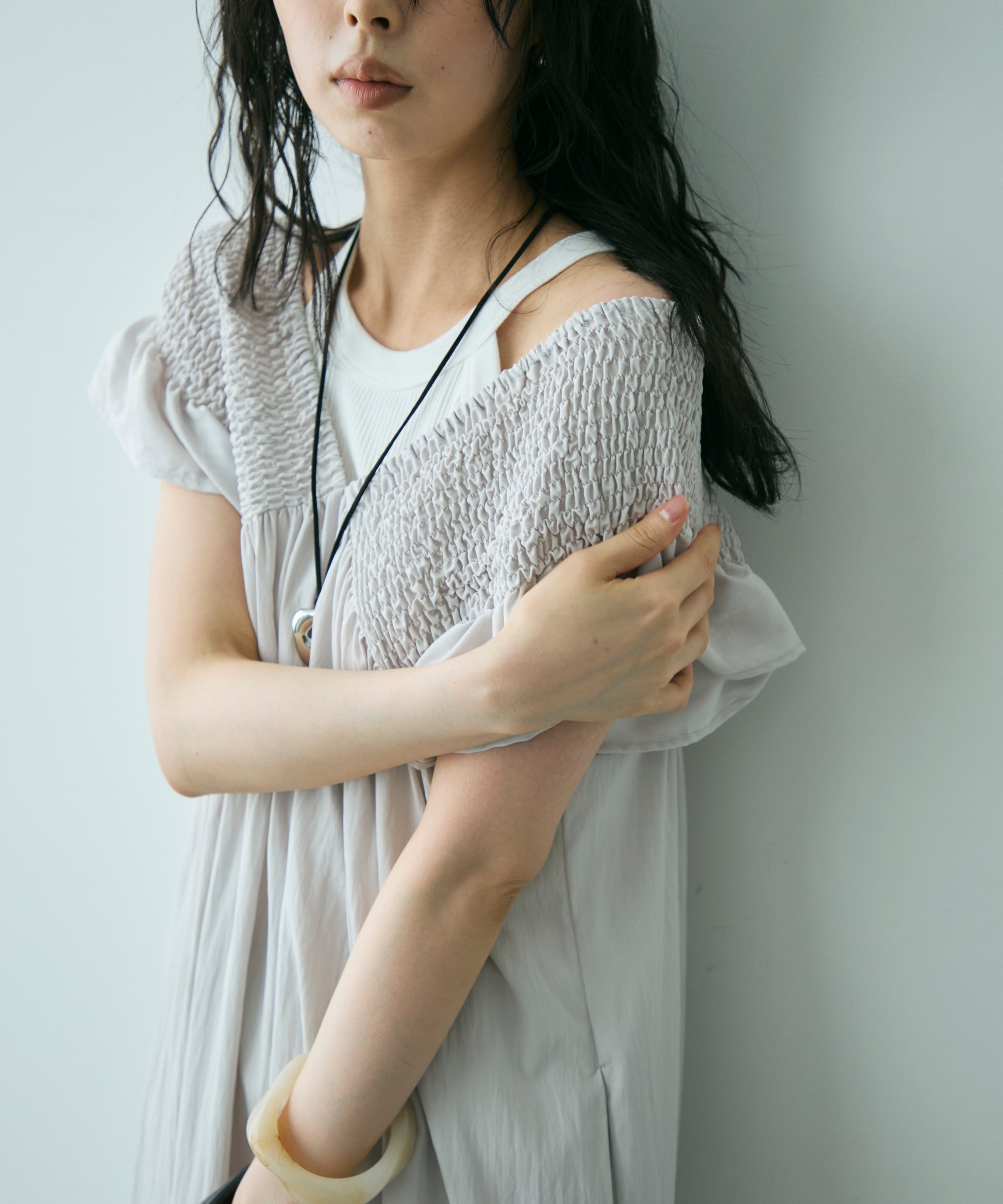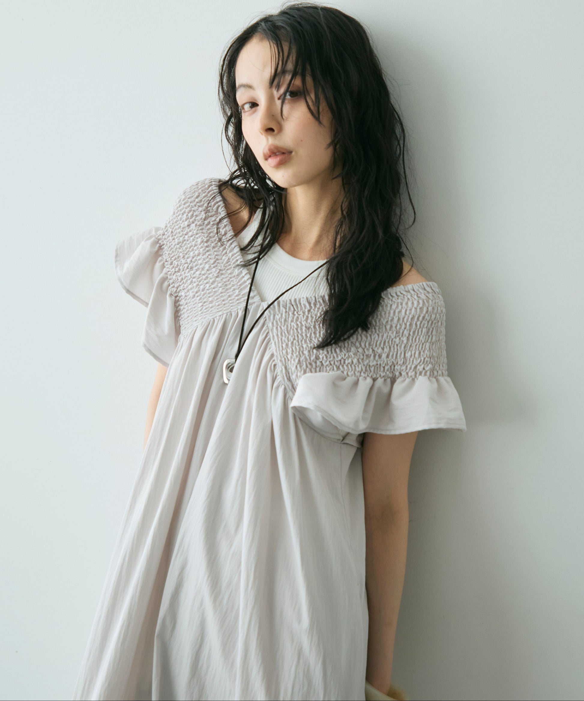 上身ごろにふんだんにシャーリングをあしらった2WAYのワンピース。