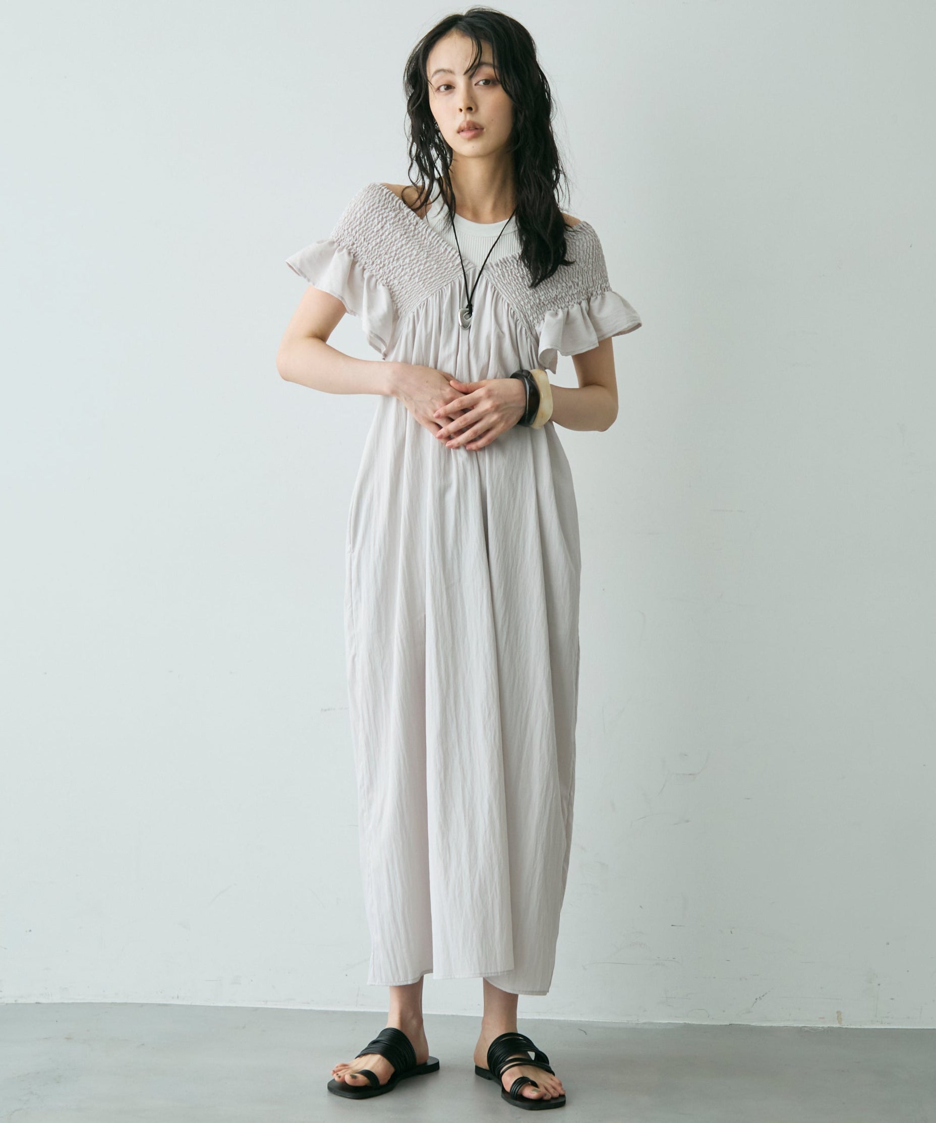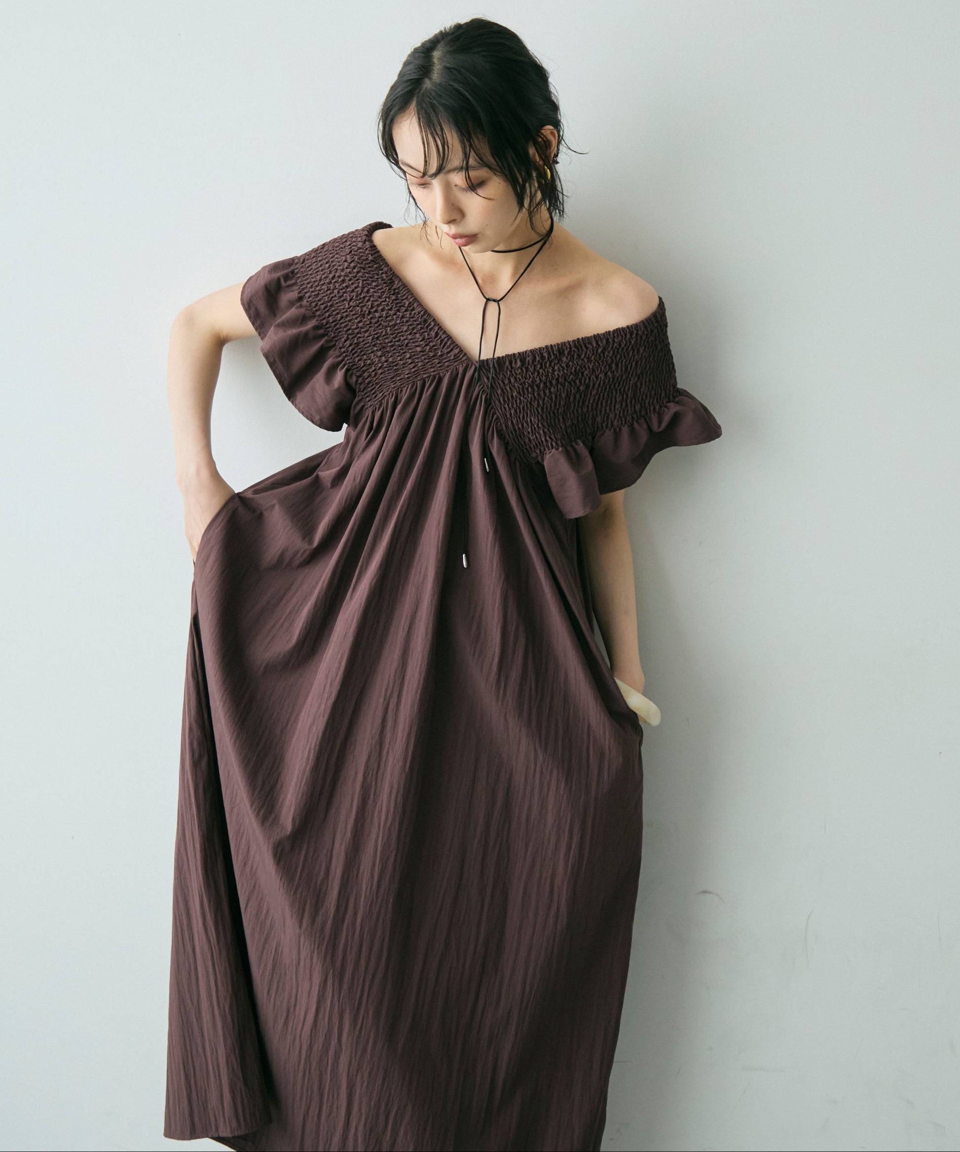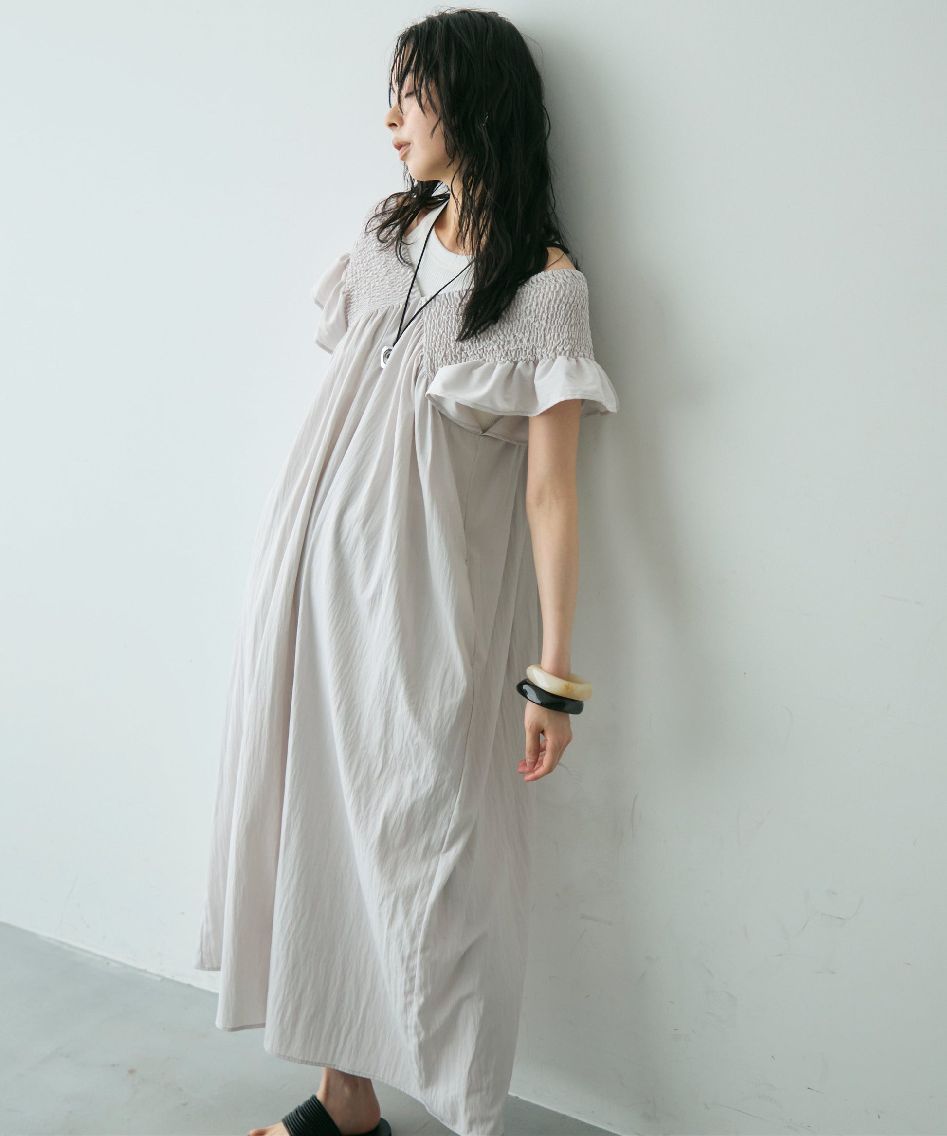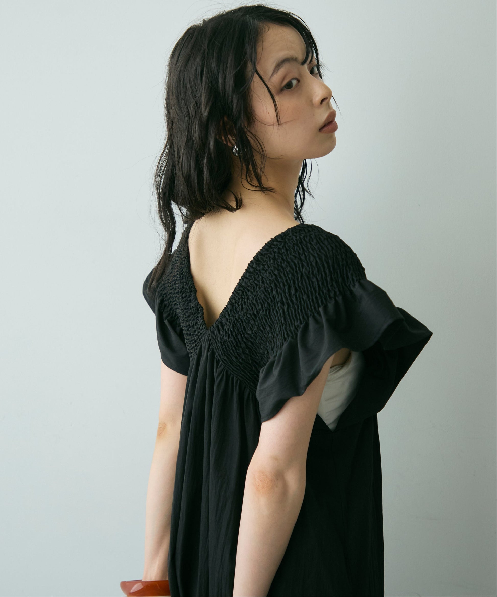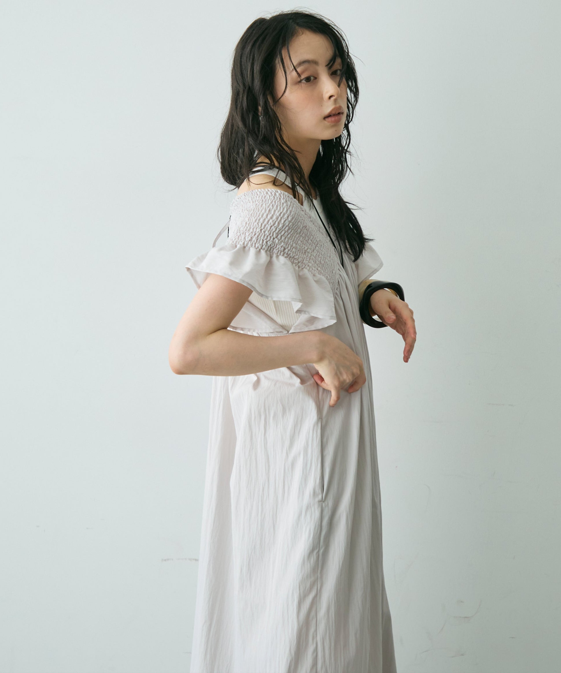 上身ごろにふんだんにシャーリングをあしらった2WAYのワンピース。
