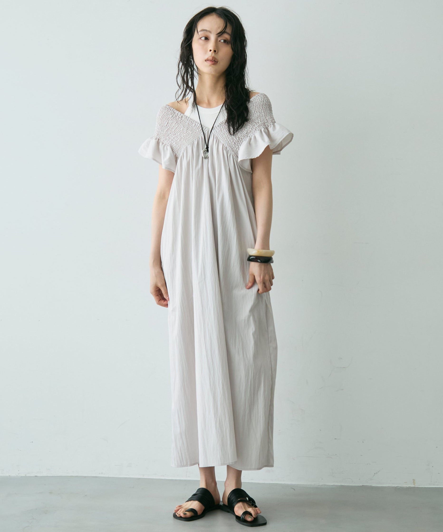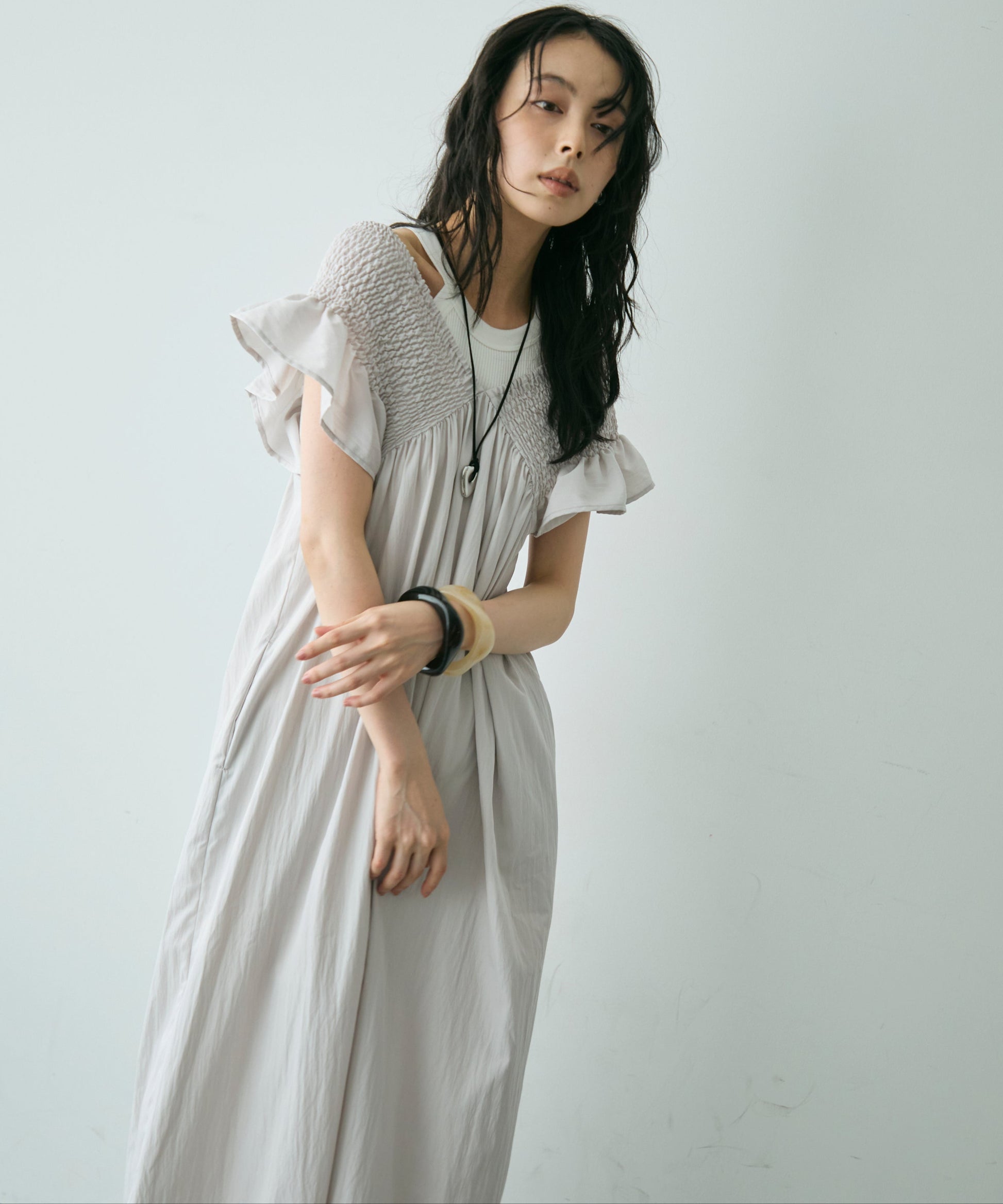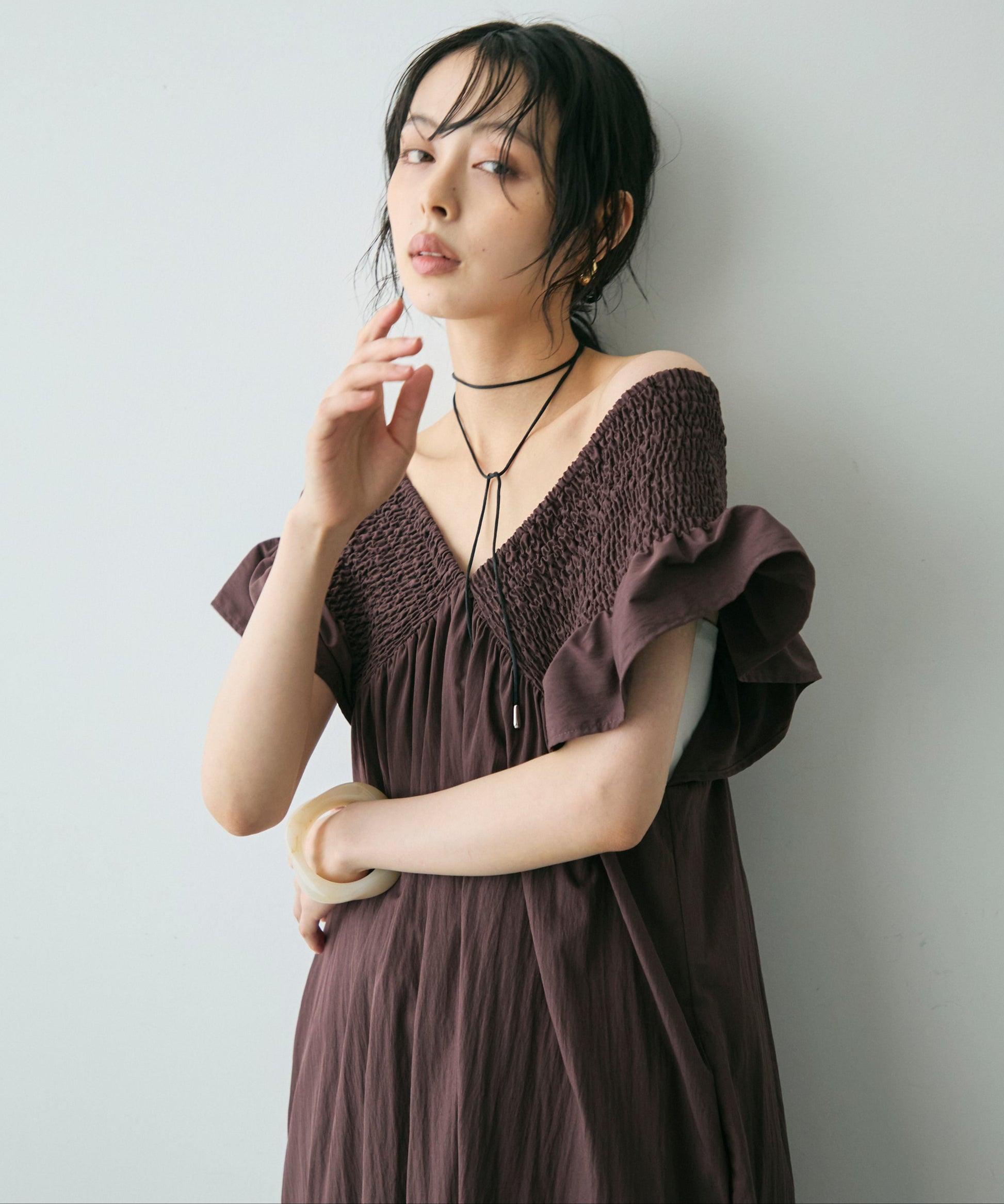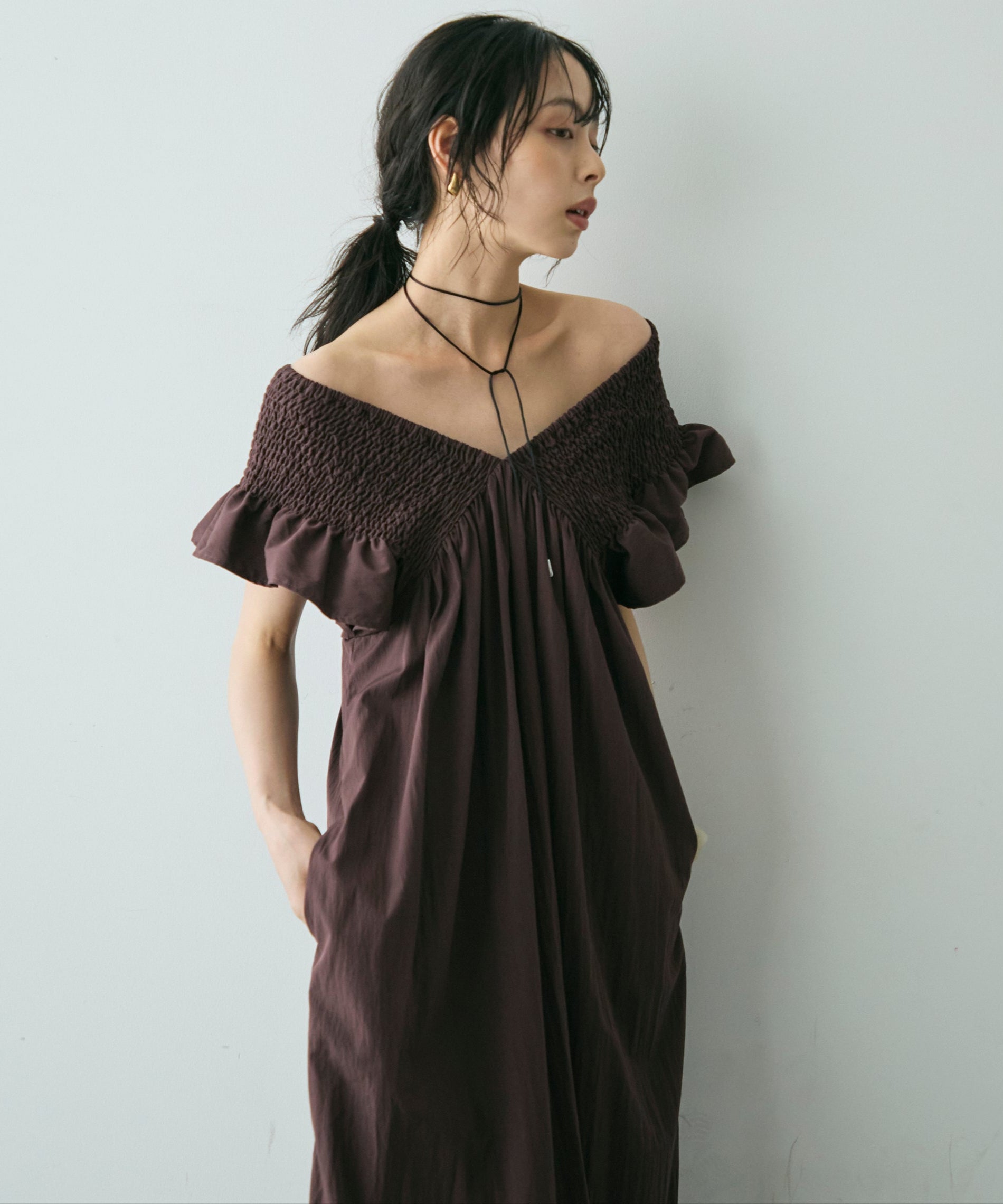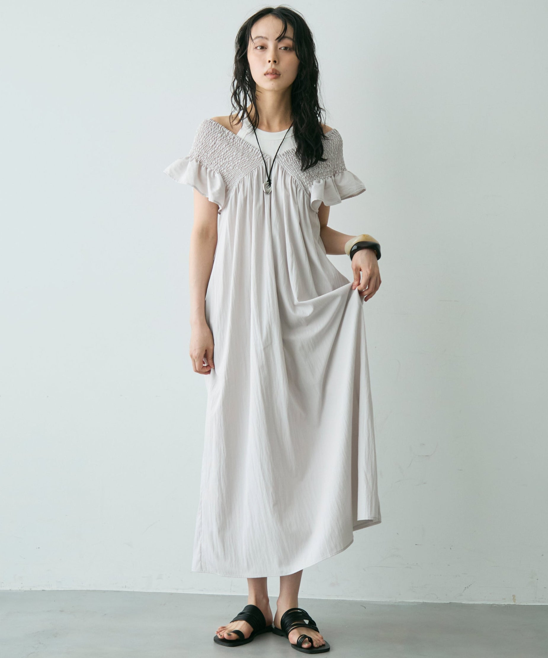 上身ごろにふんだんにシャーリングをあしらった2WAYのワンピース。
