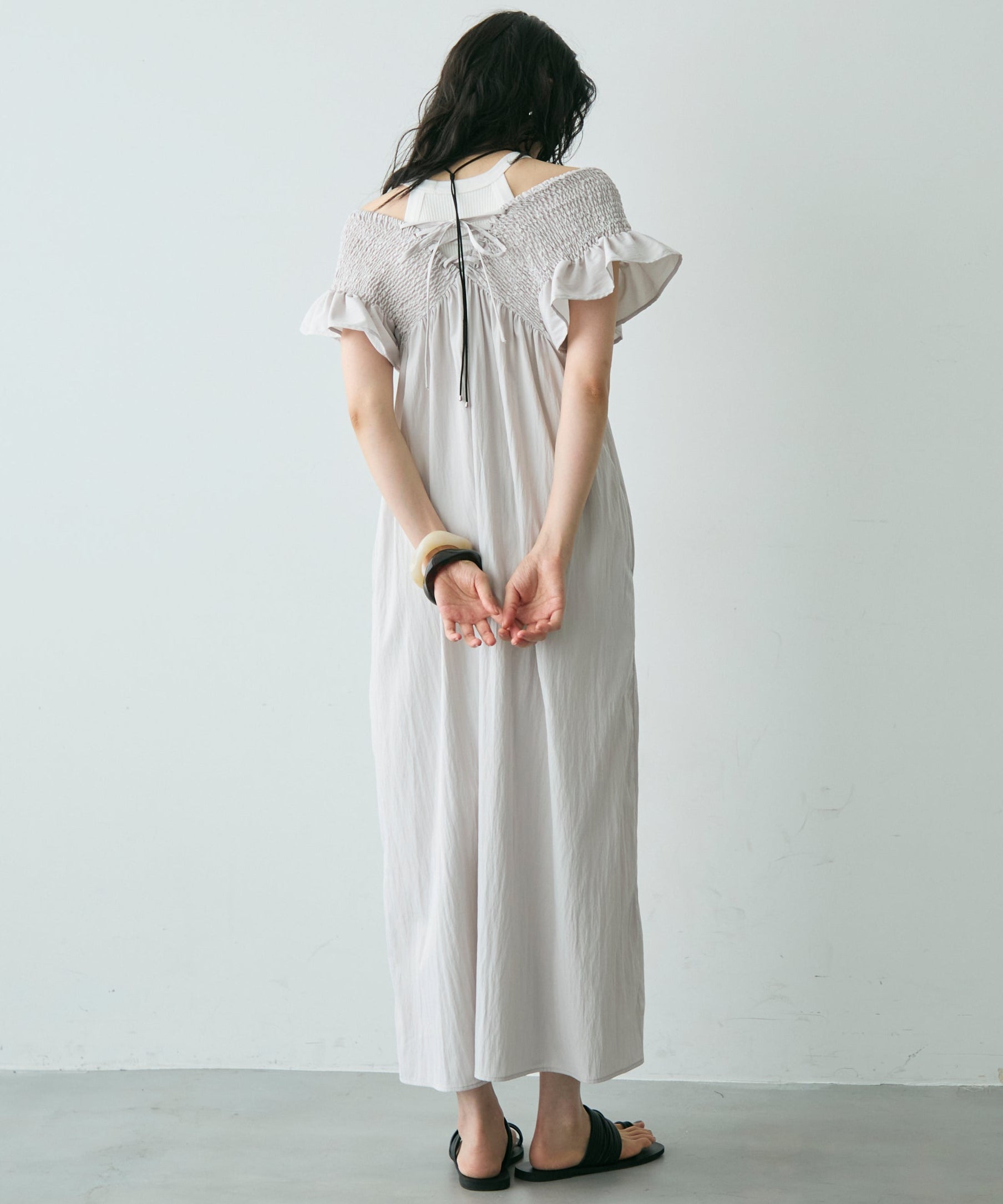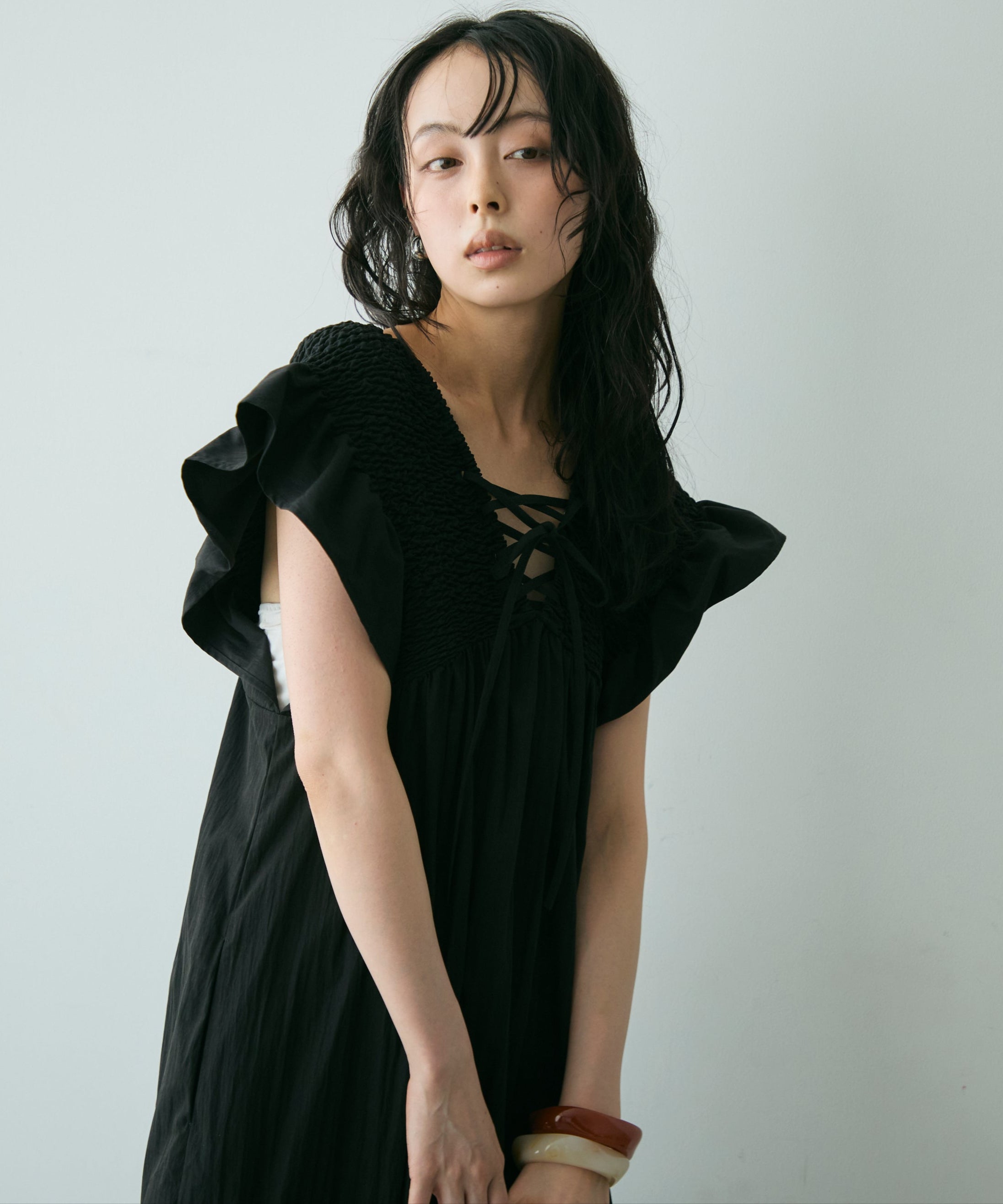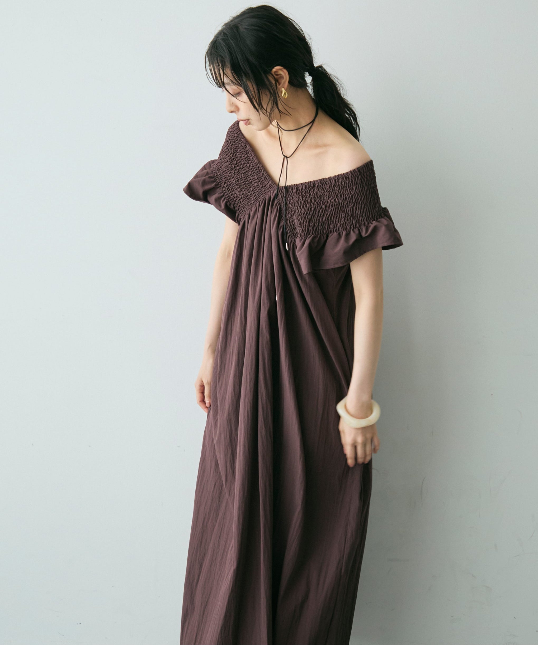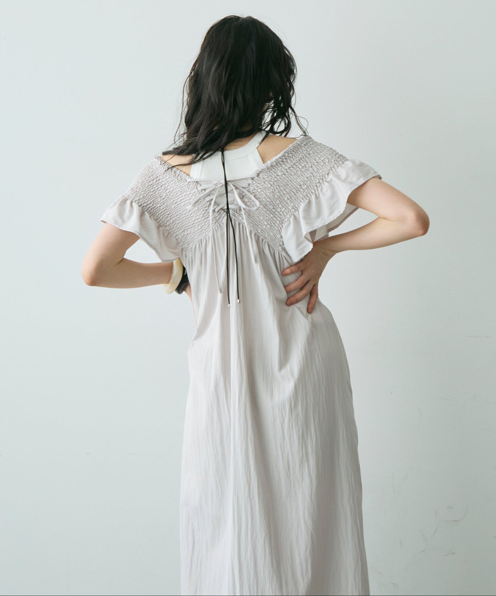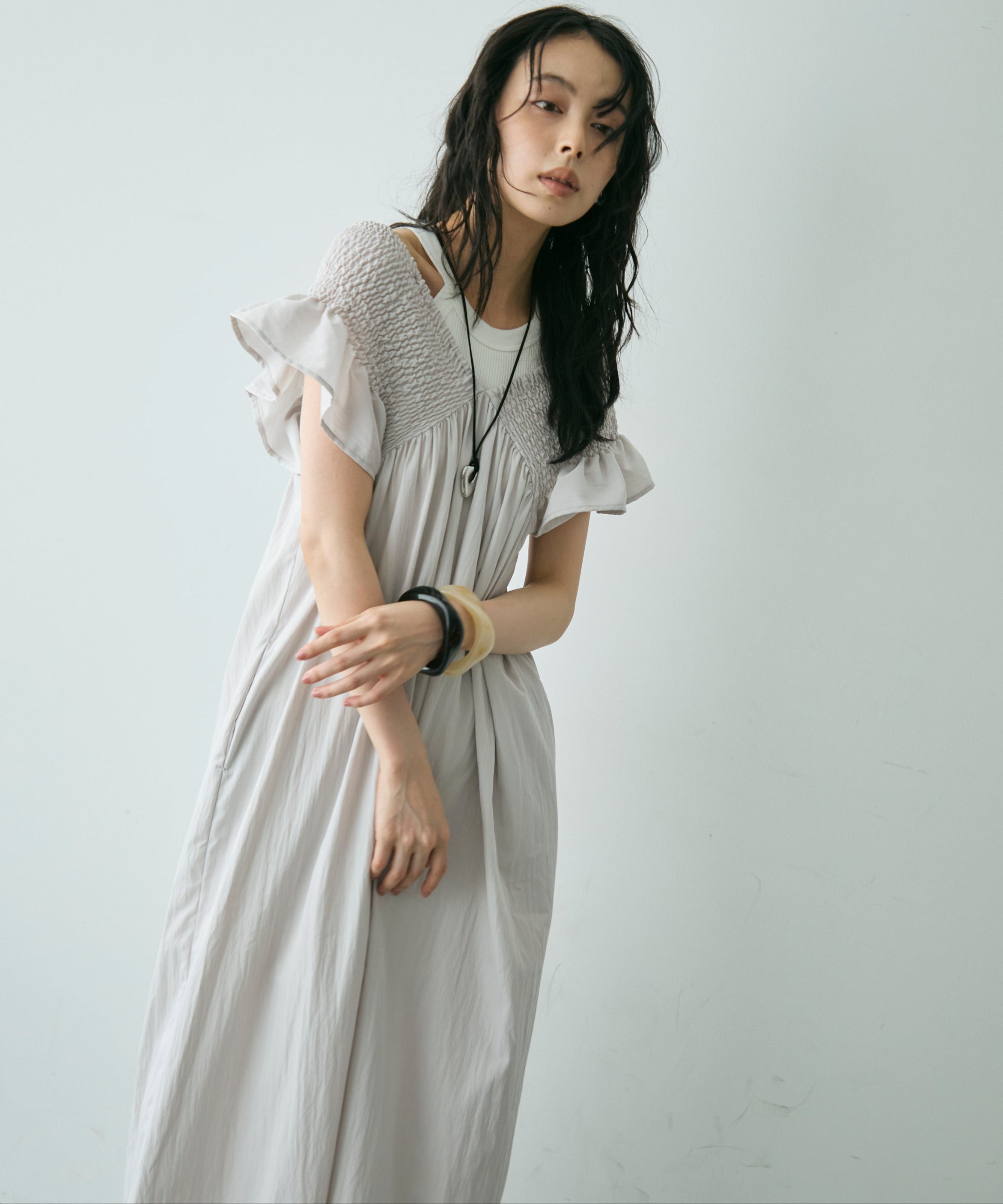 上身ごろにふんだんにシャーリングをあしらった2WAYのワンピース。