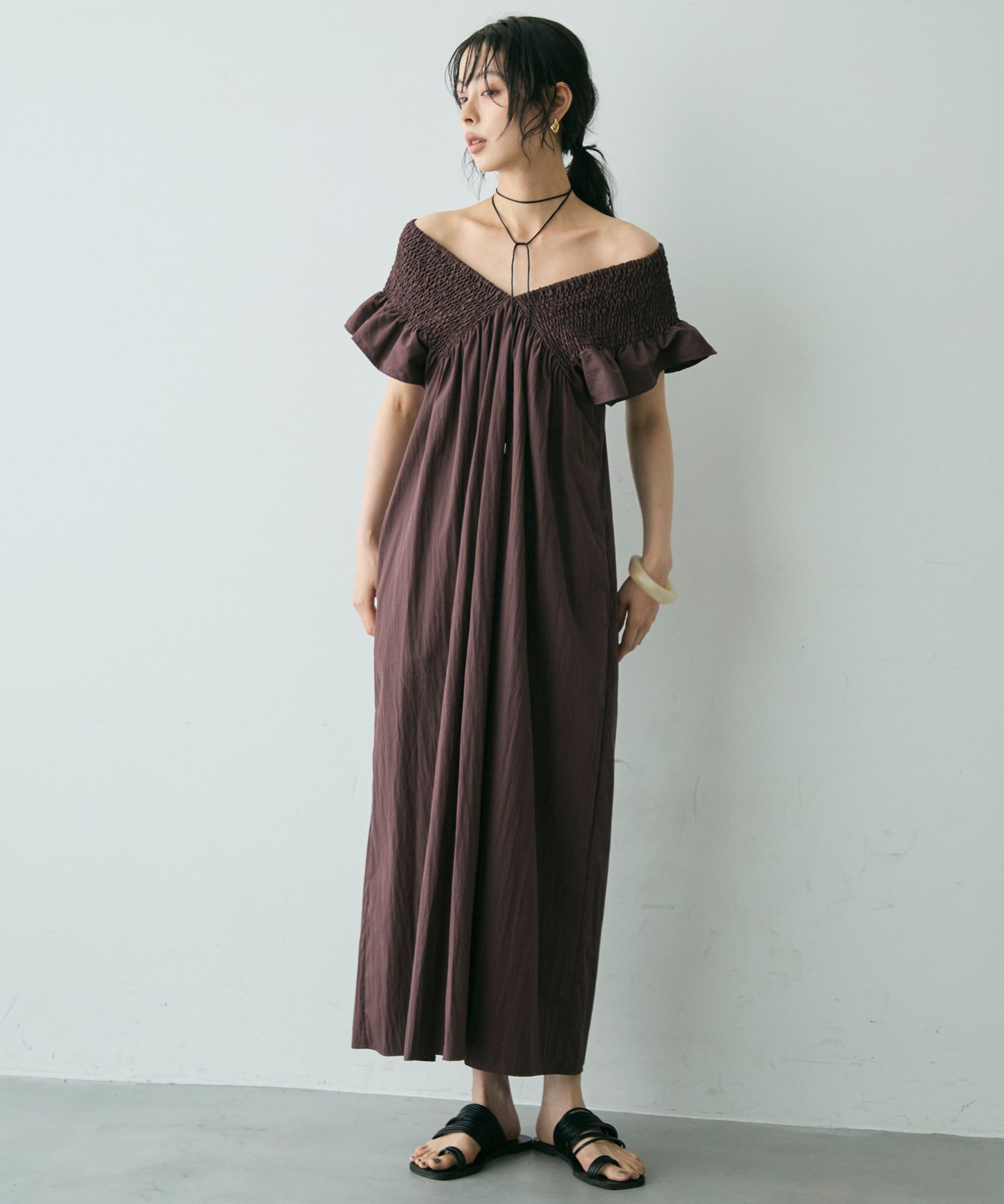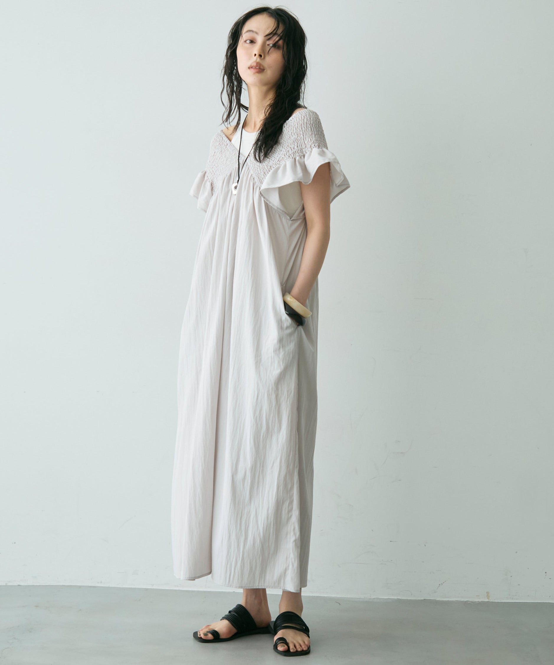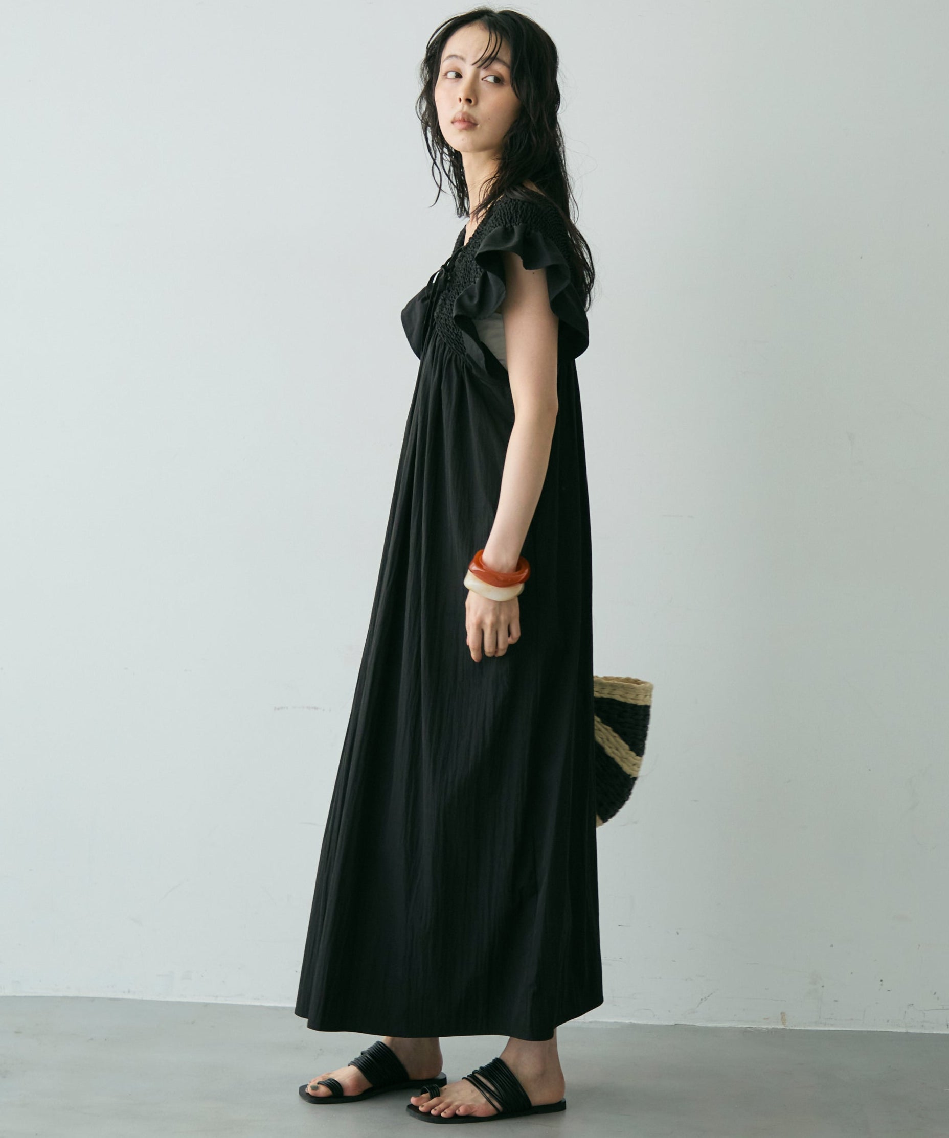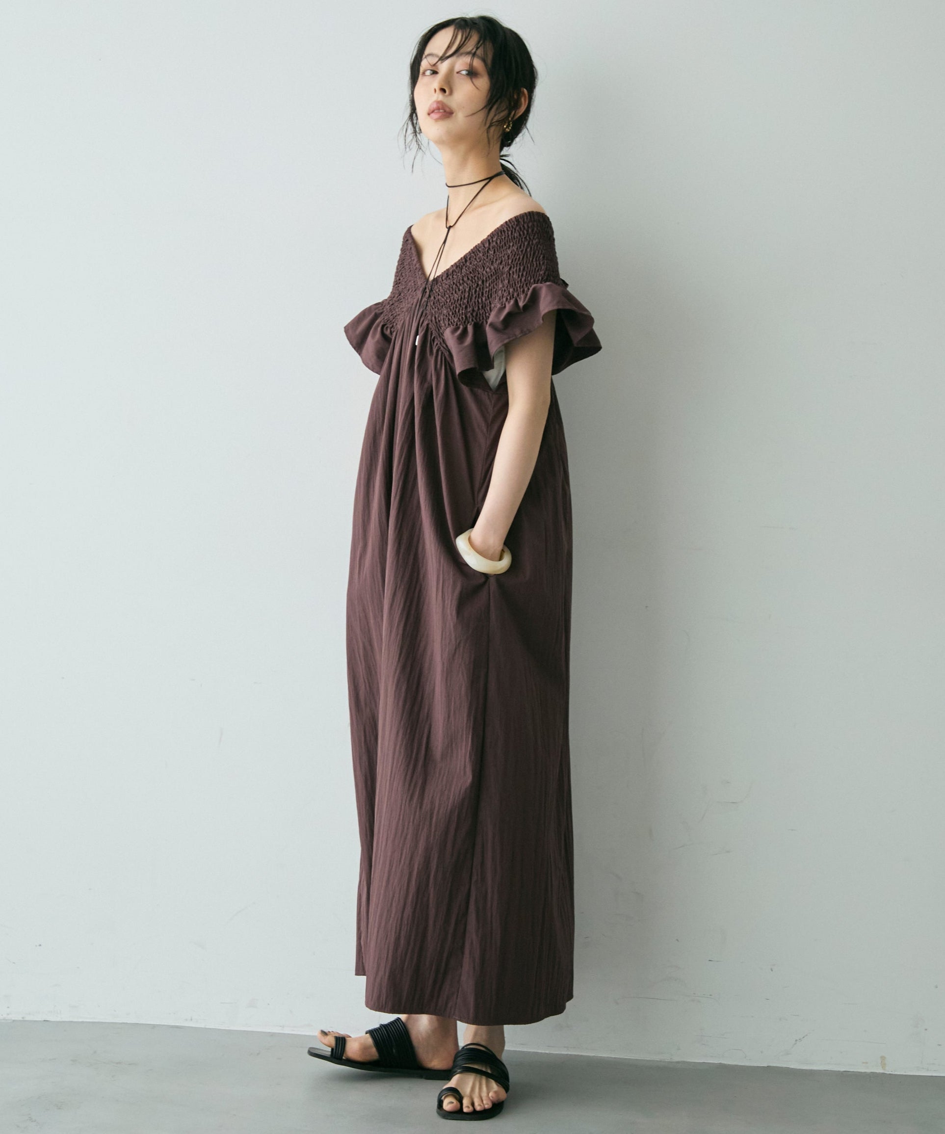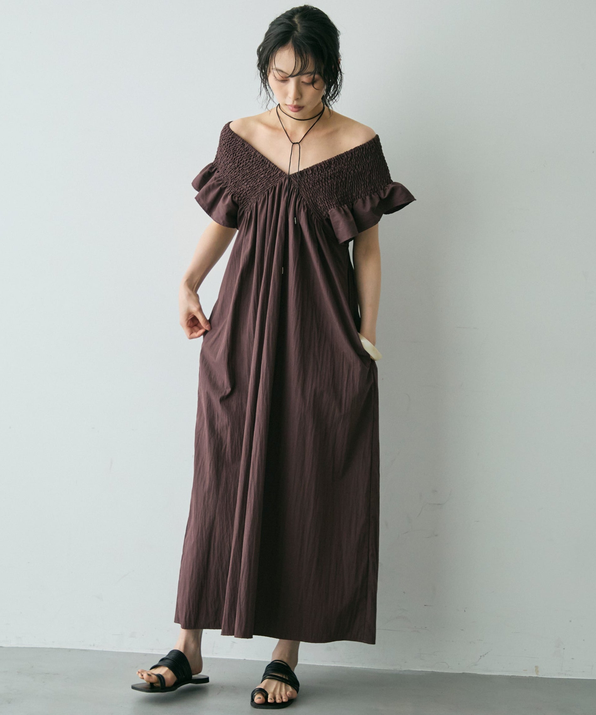 上身ごろにふんだんにシャーリングをあしらった2WAYのワンピース。