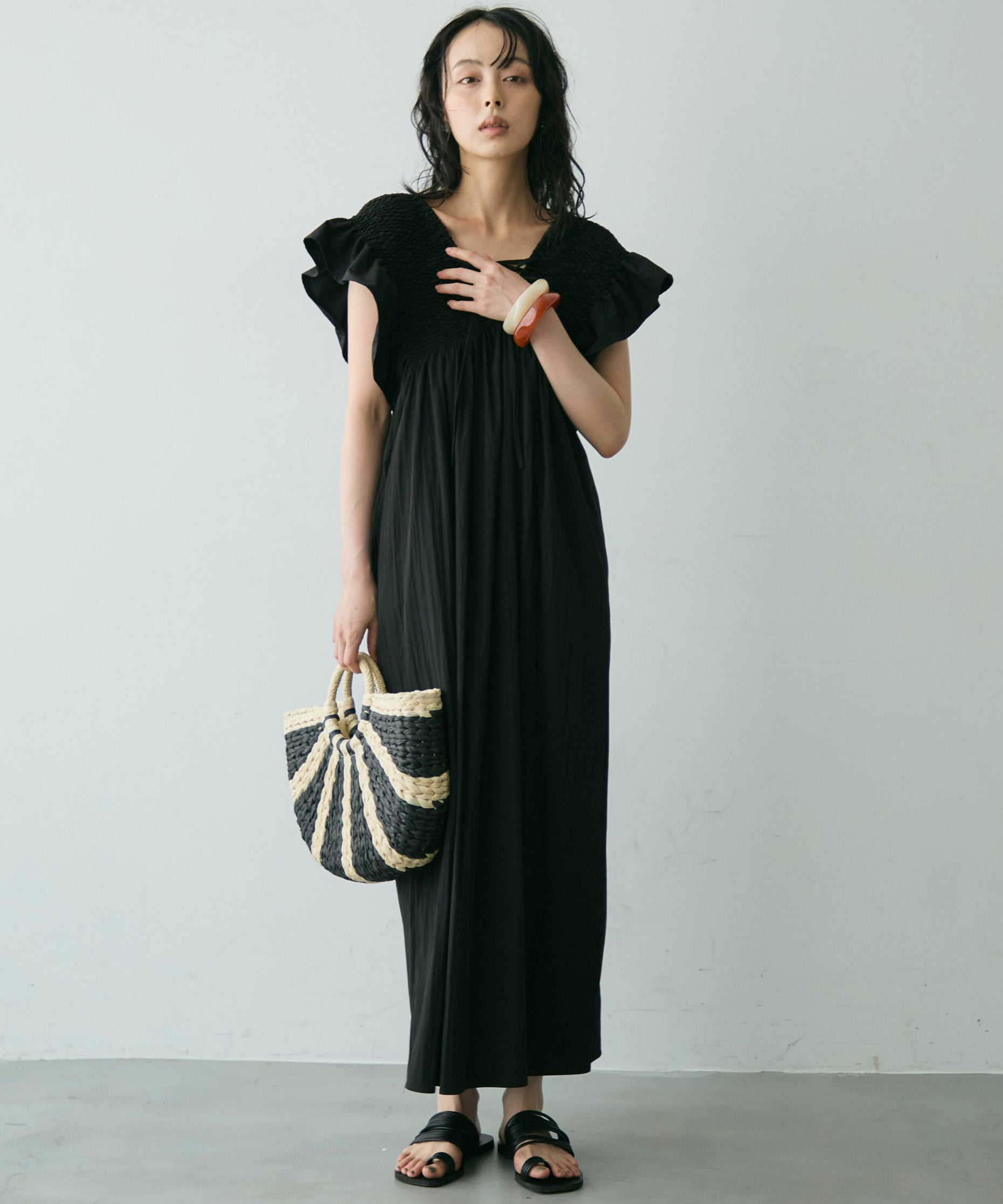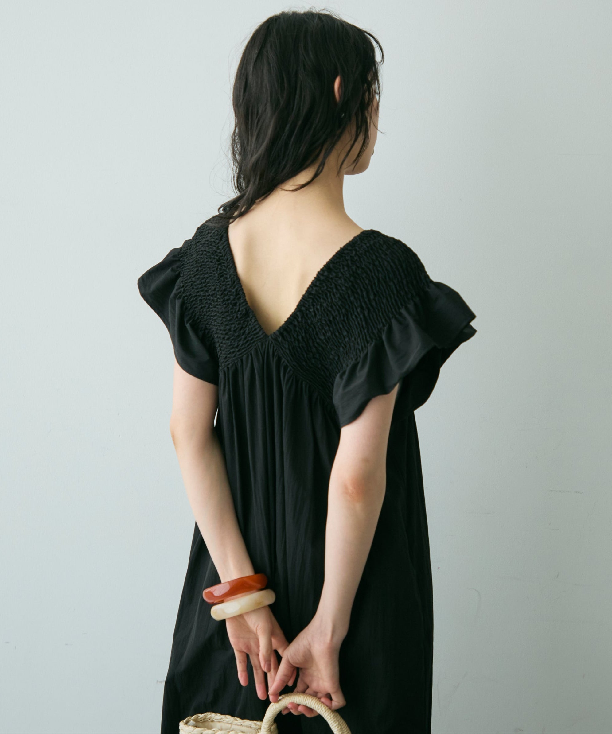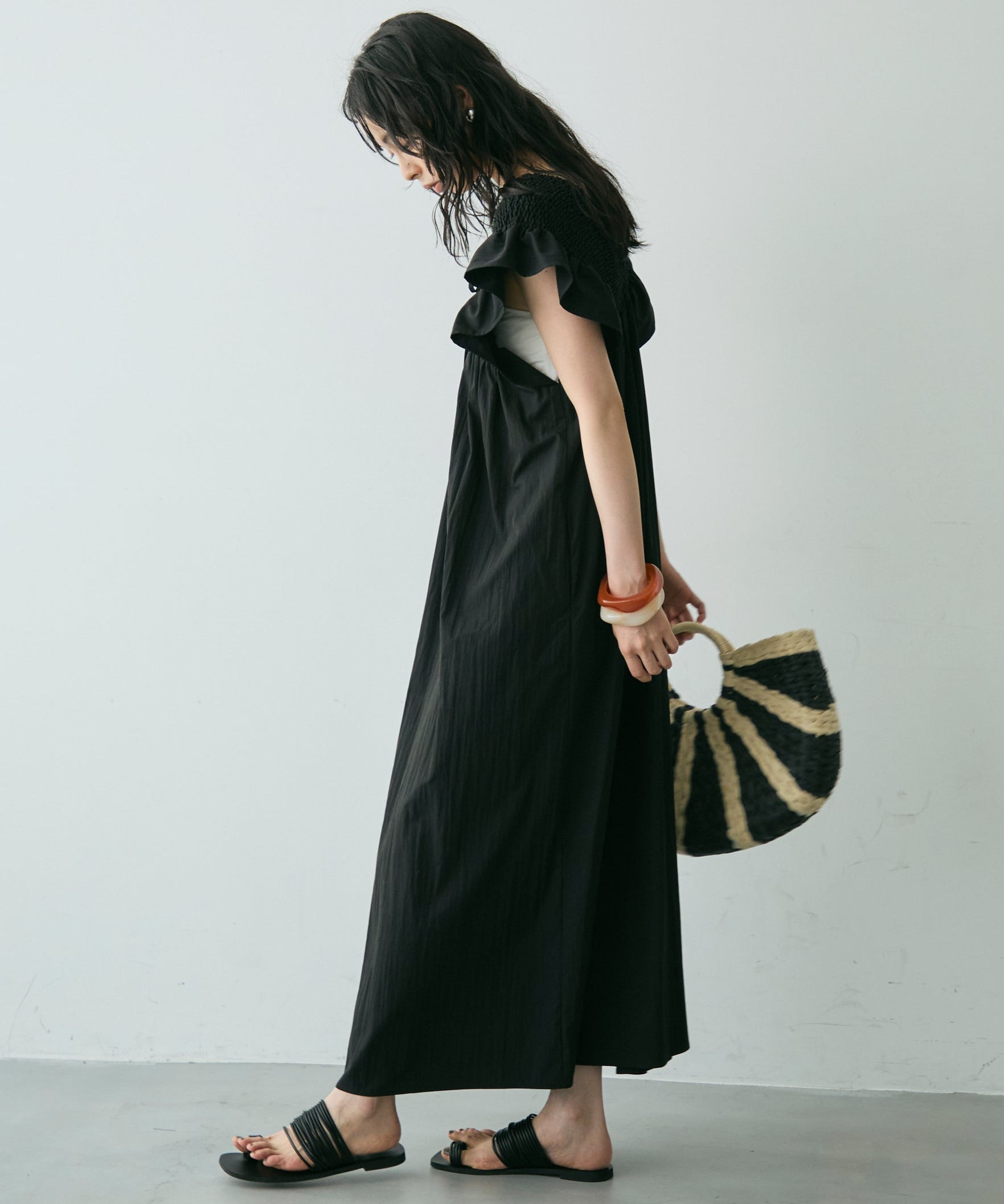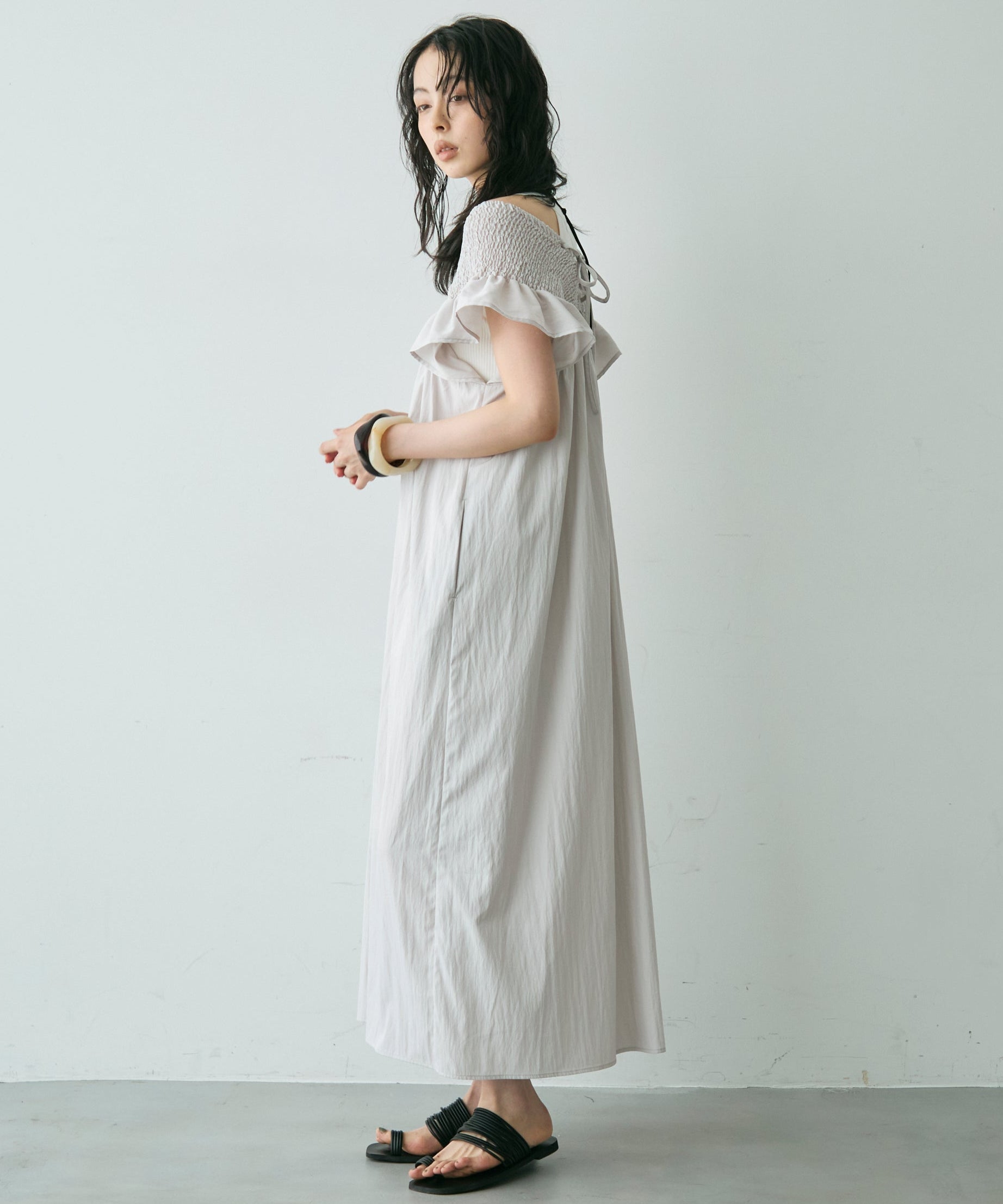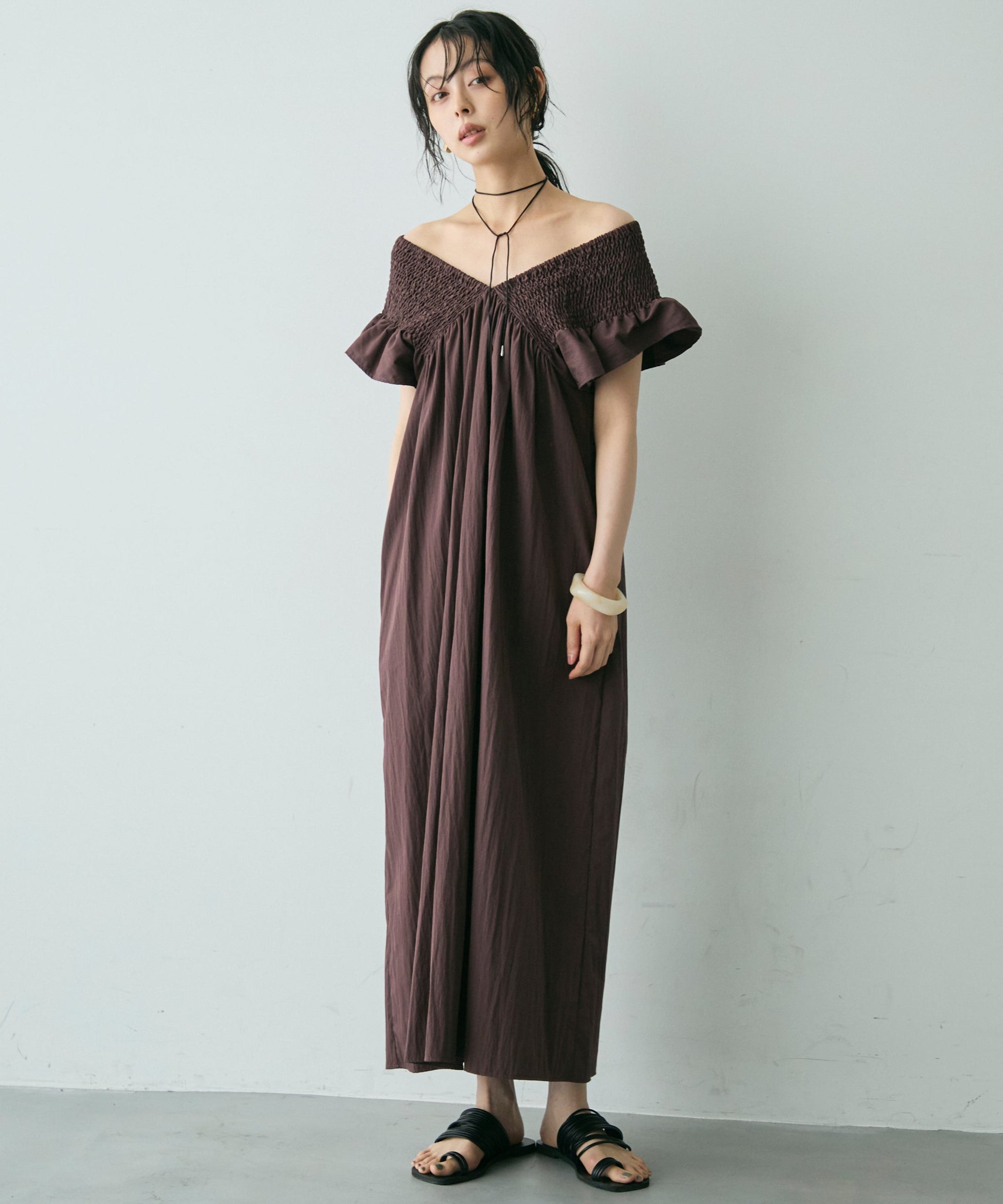 上身ごろにふんだんにシャーリングをあしらった2WAYのワンピース。