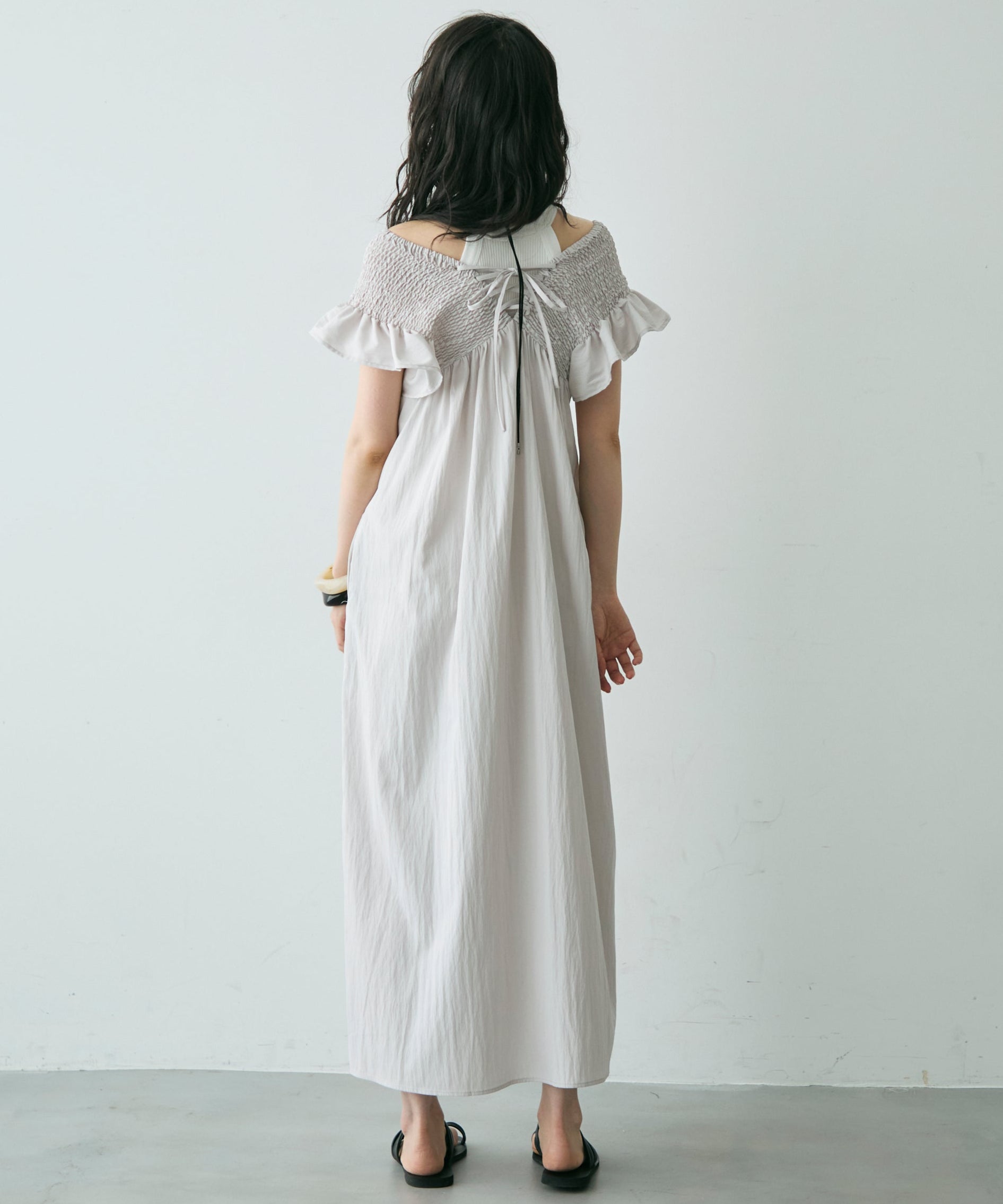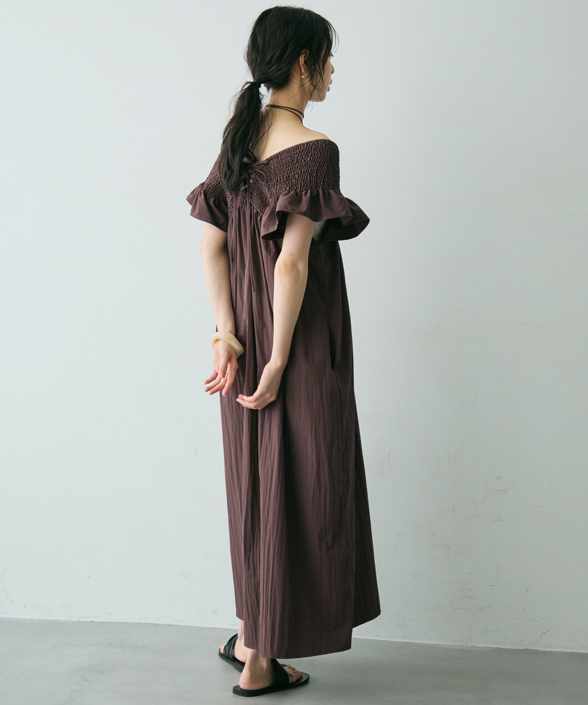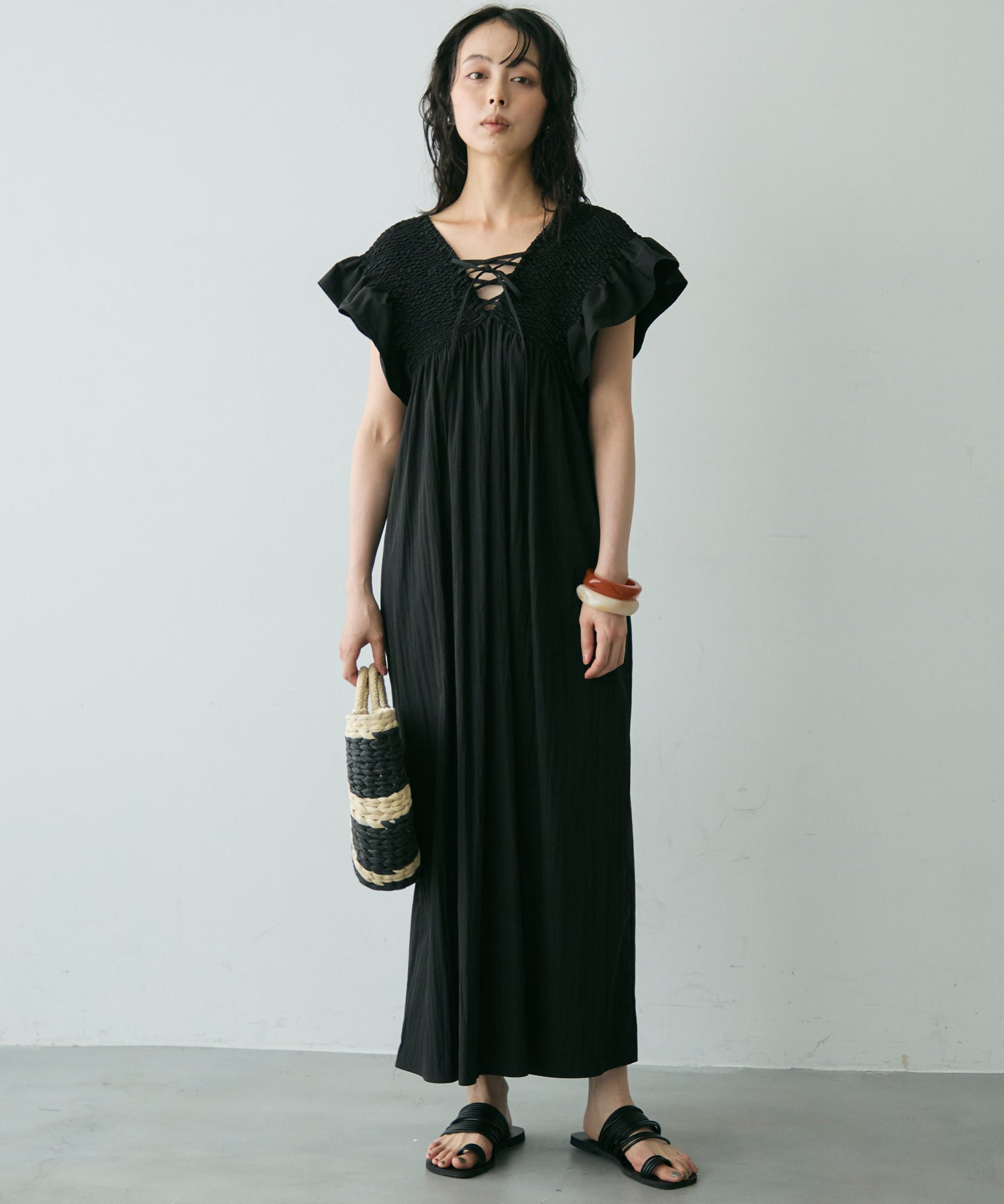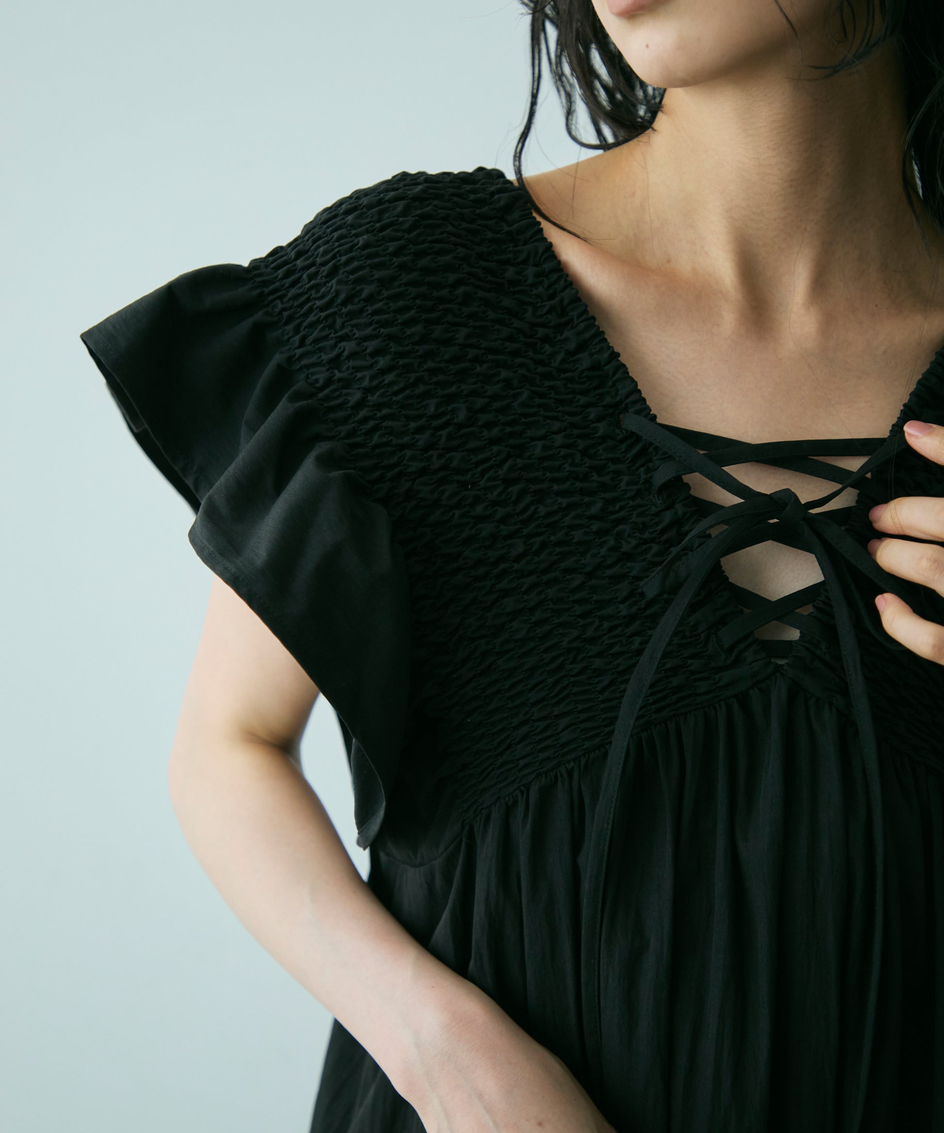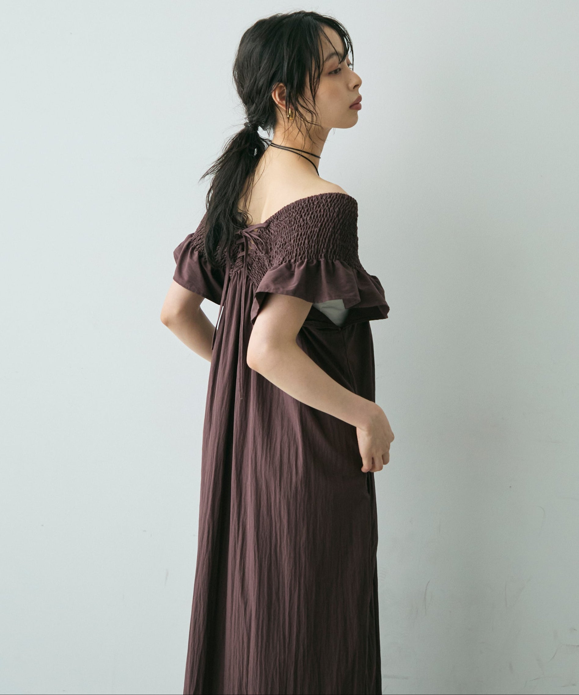 上身ごろにふんだんにシャーリングをあしらった2WAYのワンピース。