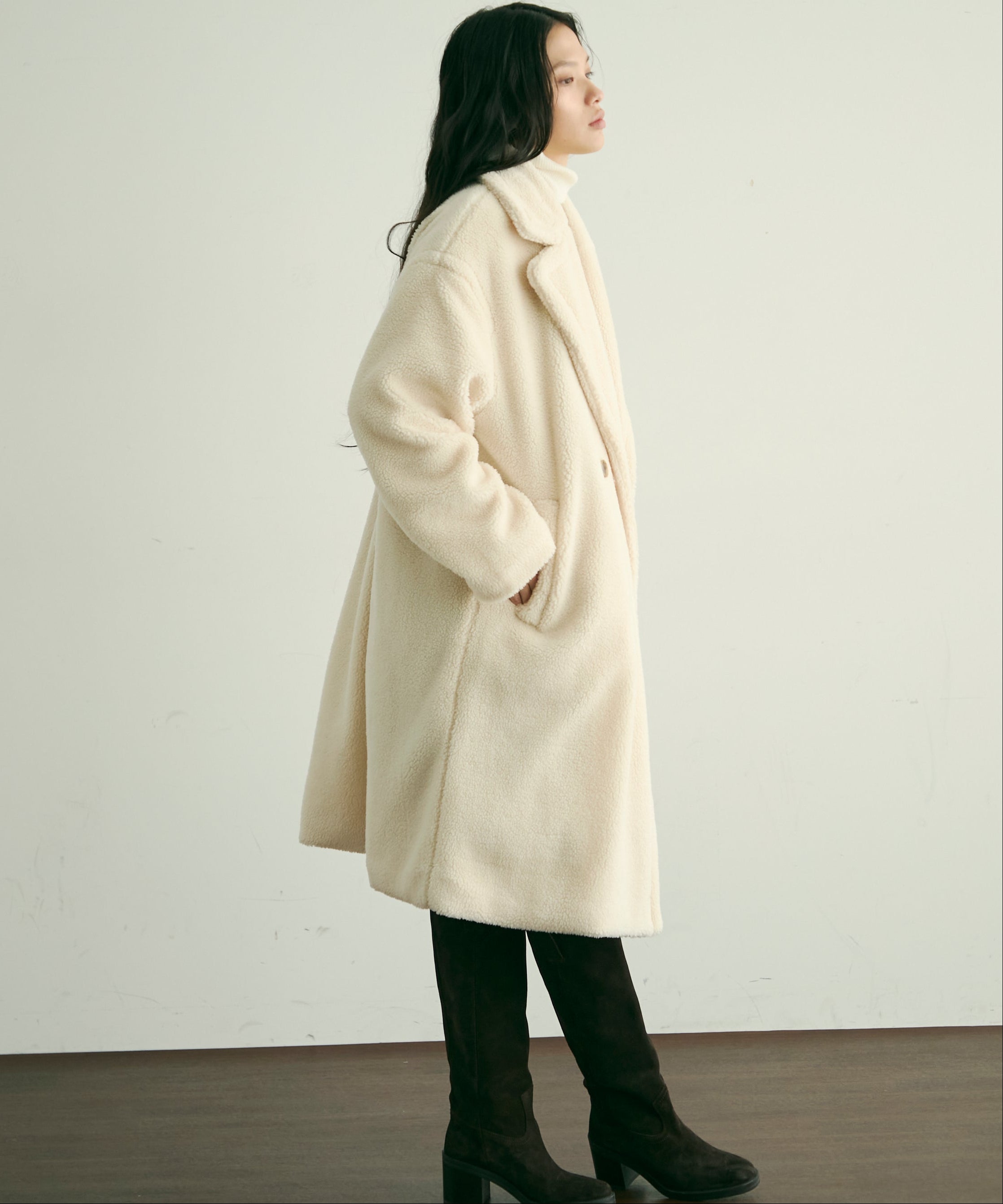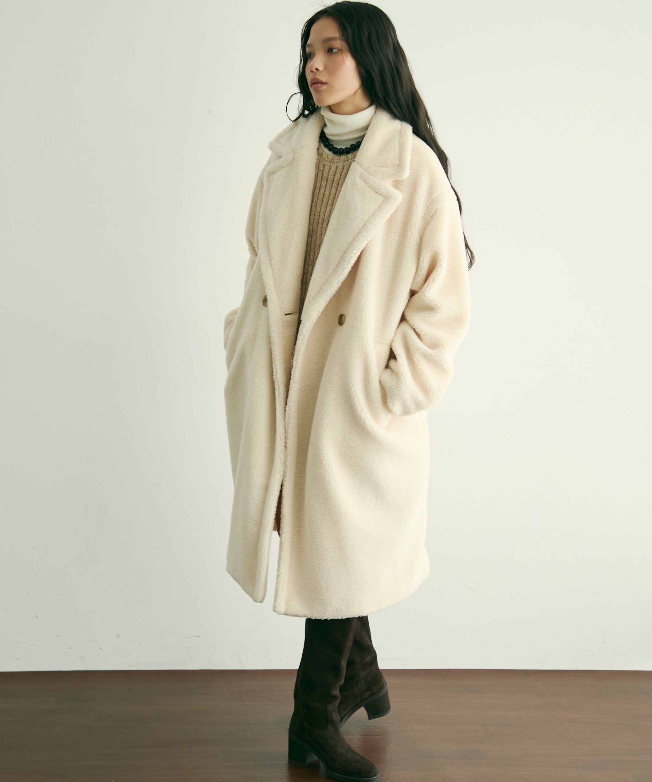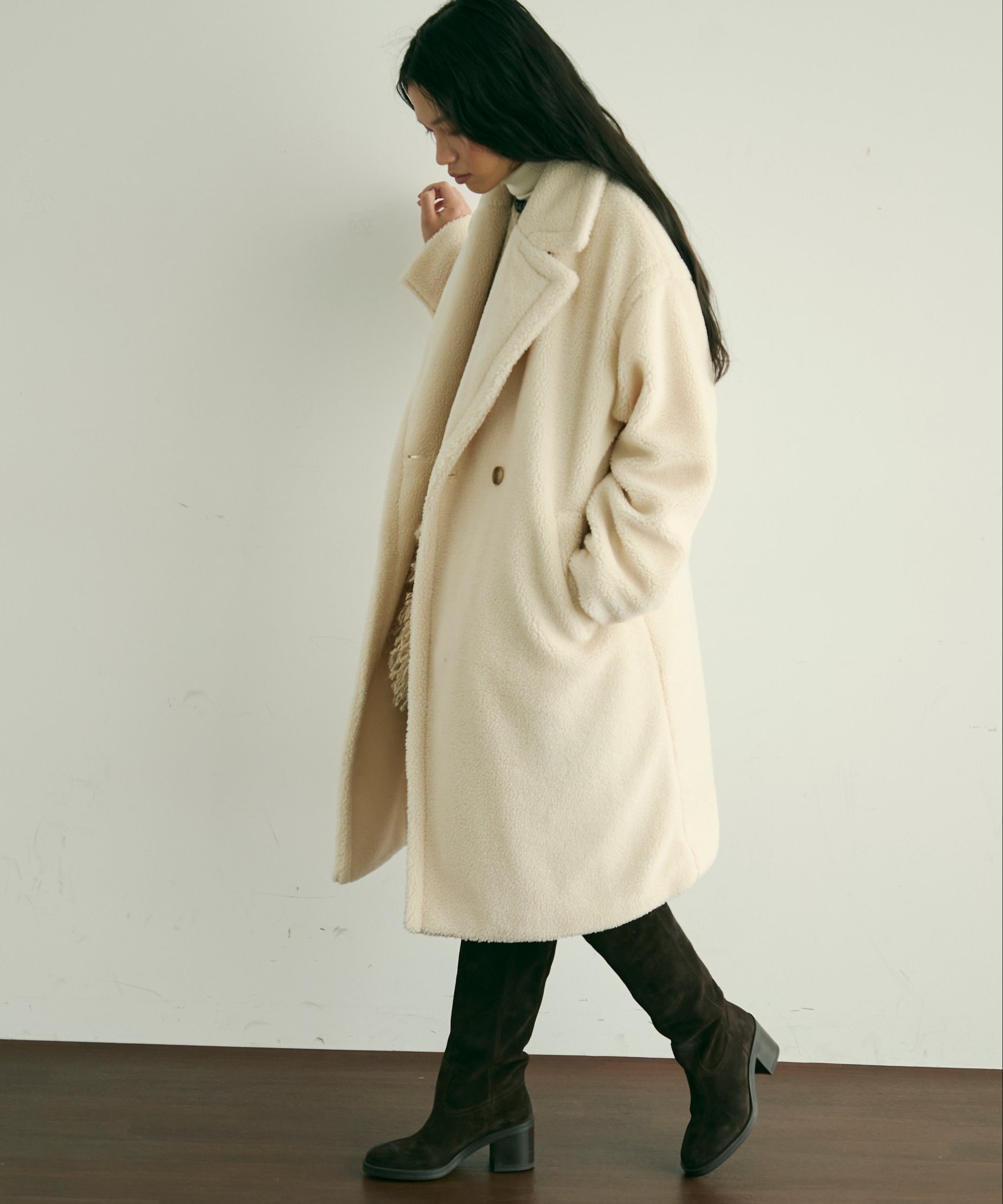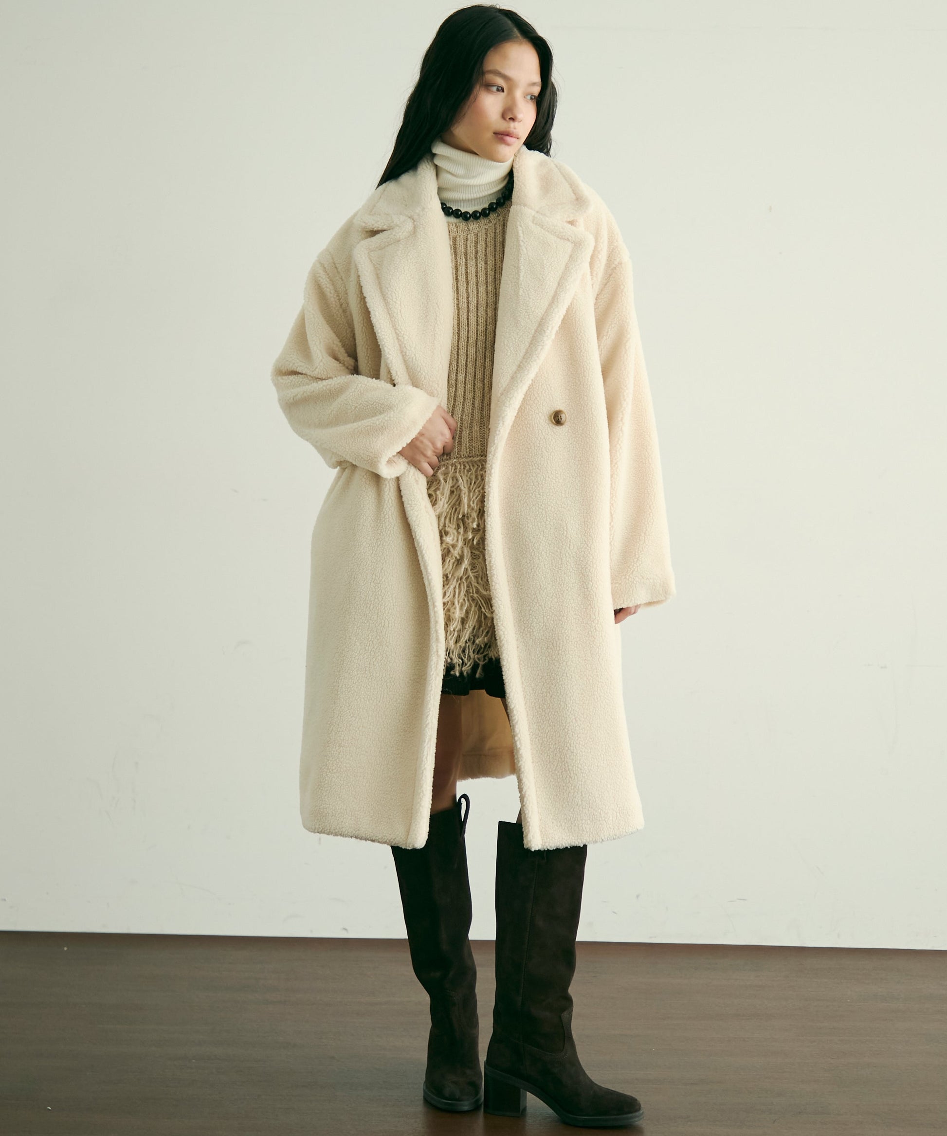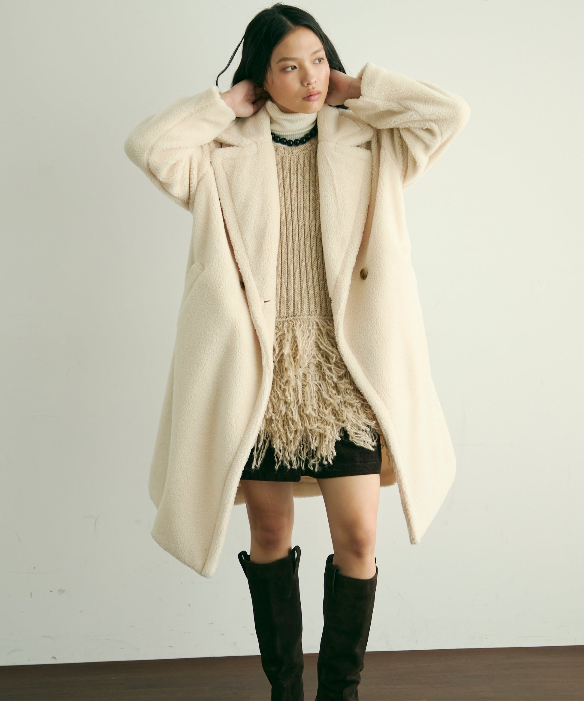 ふんわりとしたボア素材が季節感たっぷりのダブルロングコート。