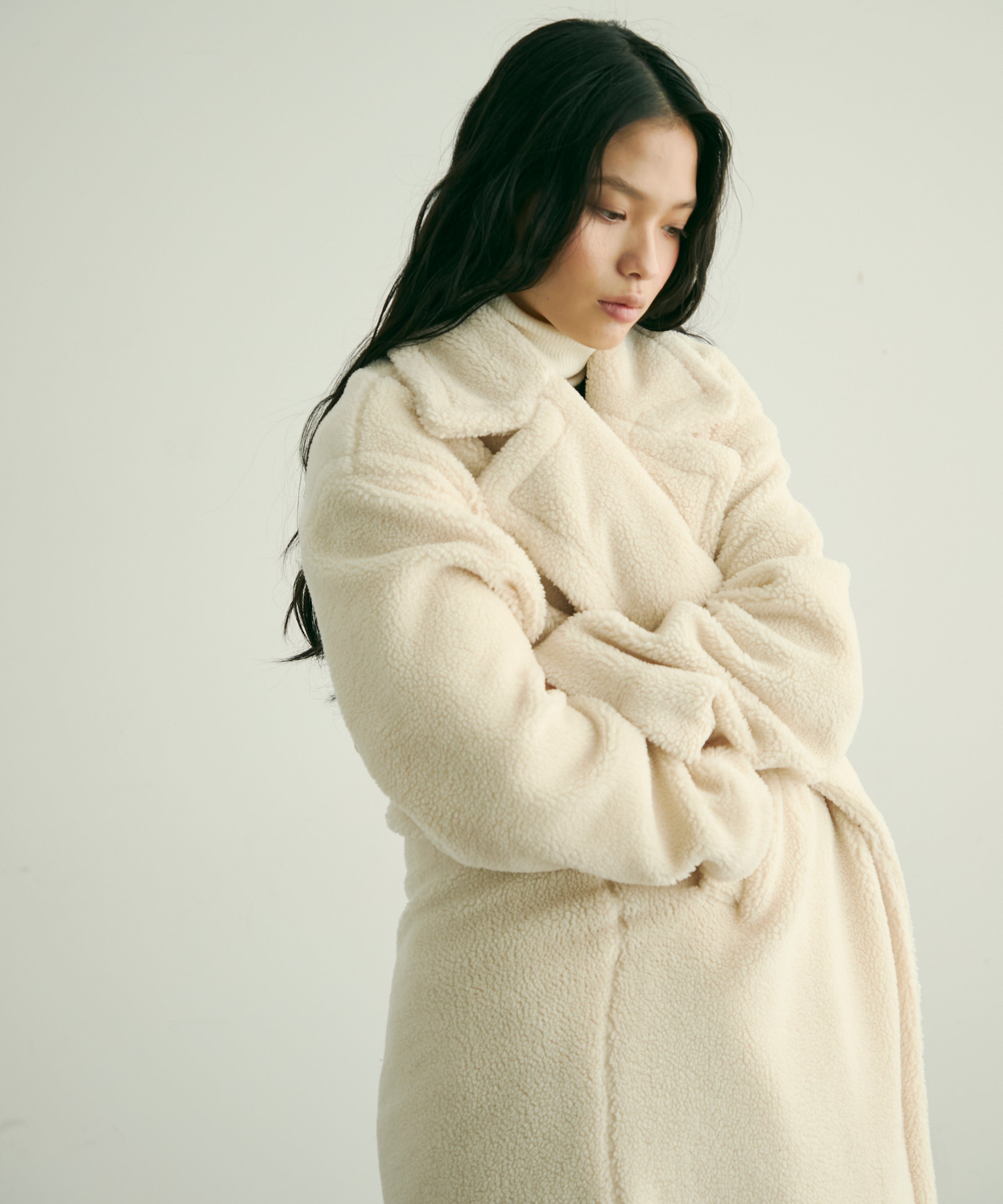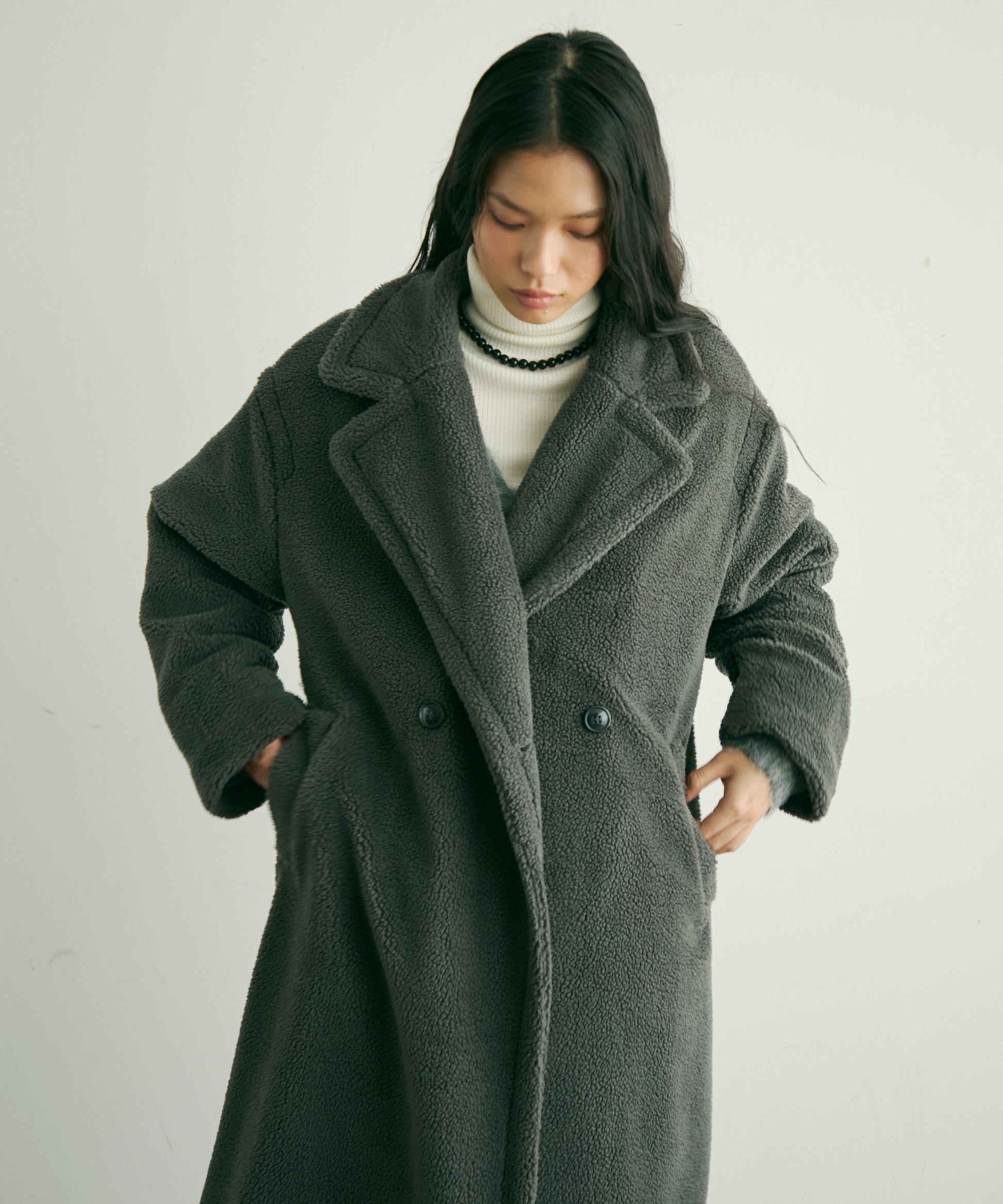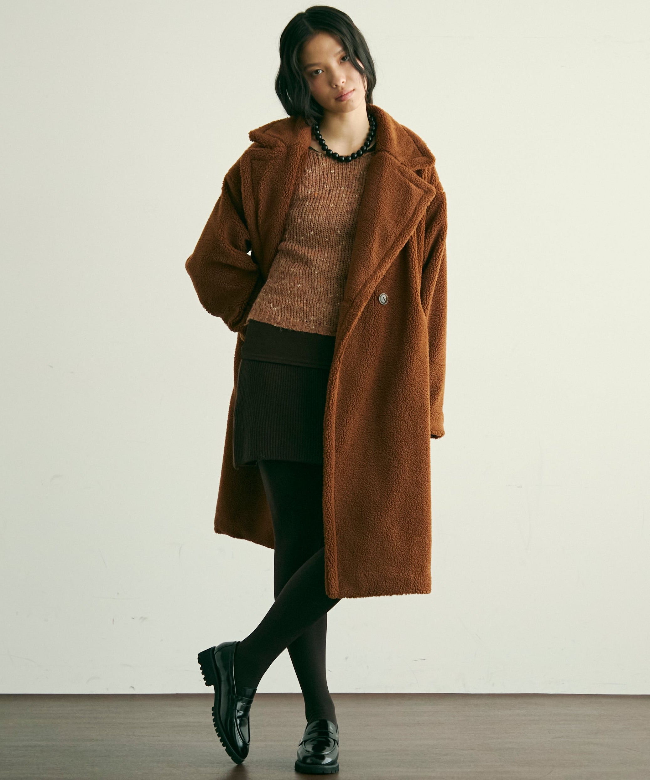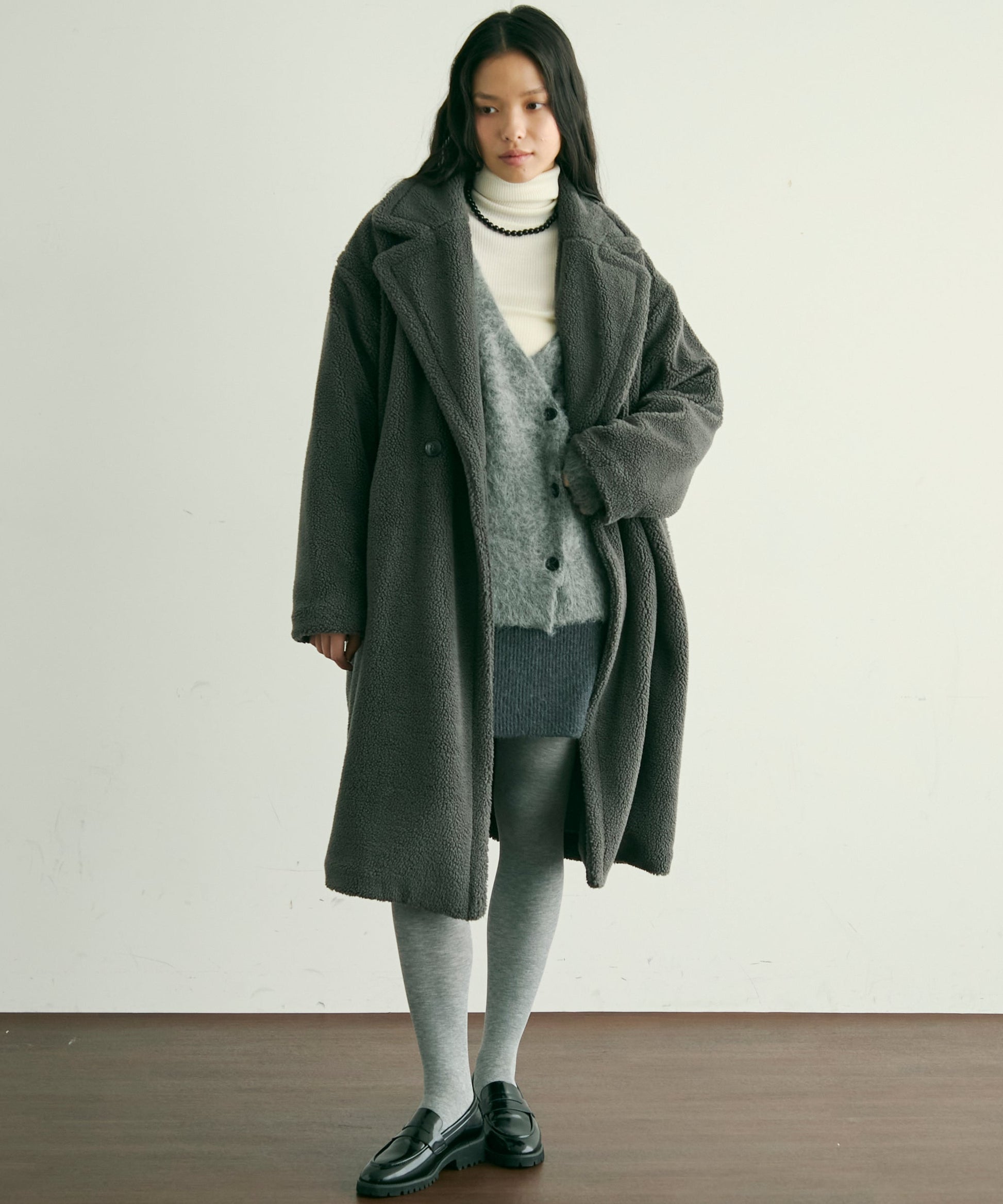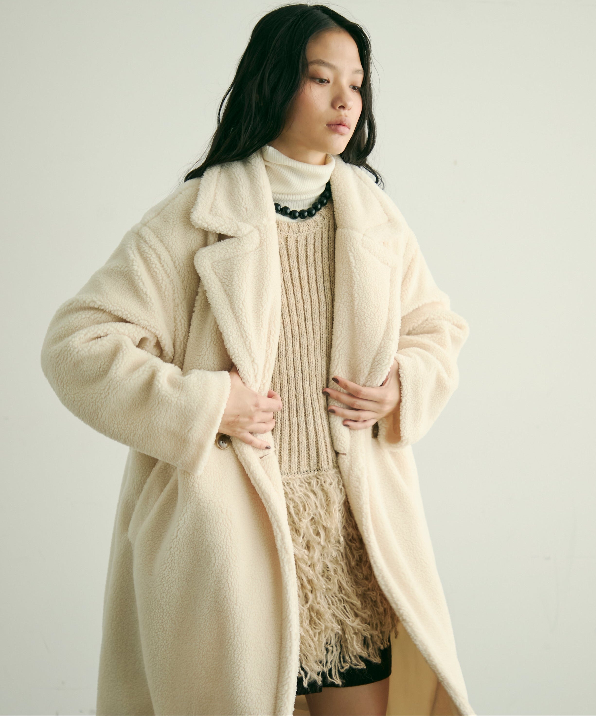 ふんわりとしたボア素材が季節感たっぷりのダブルロングコート。