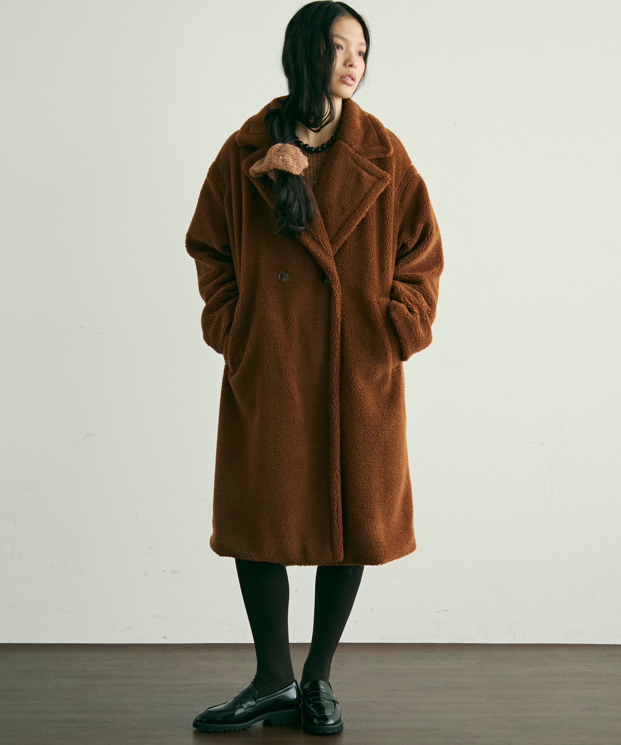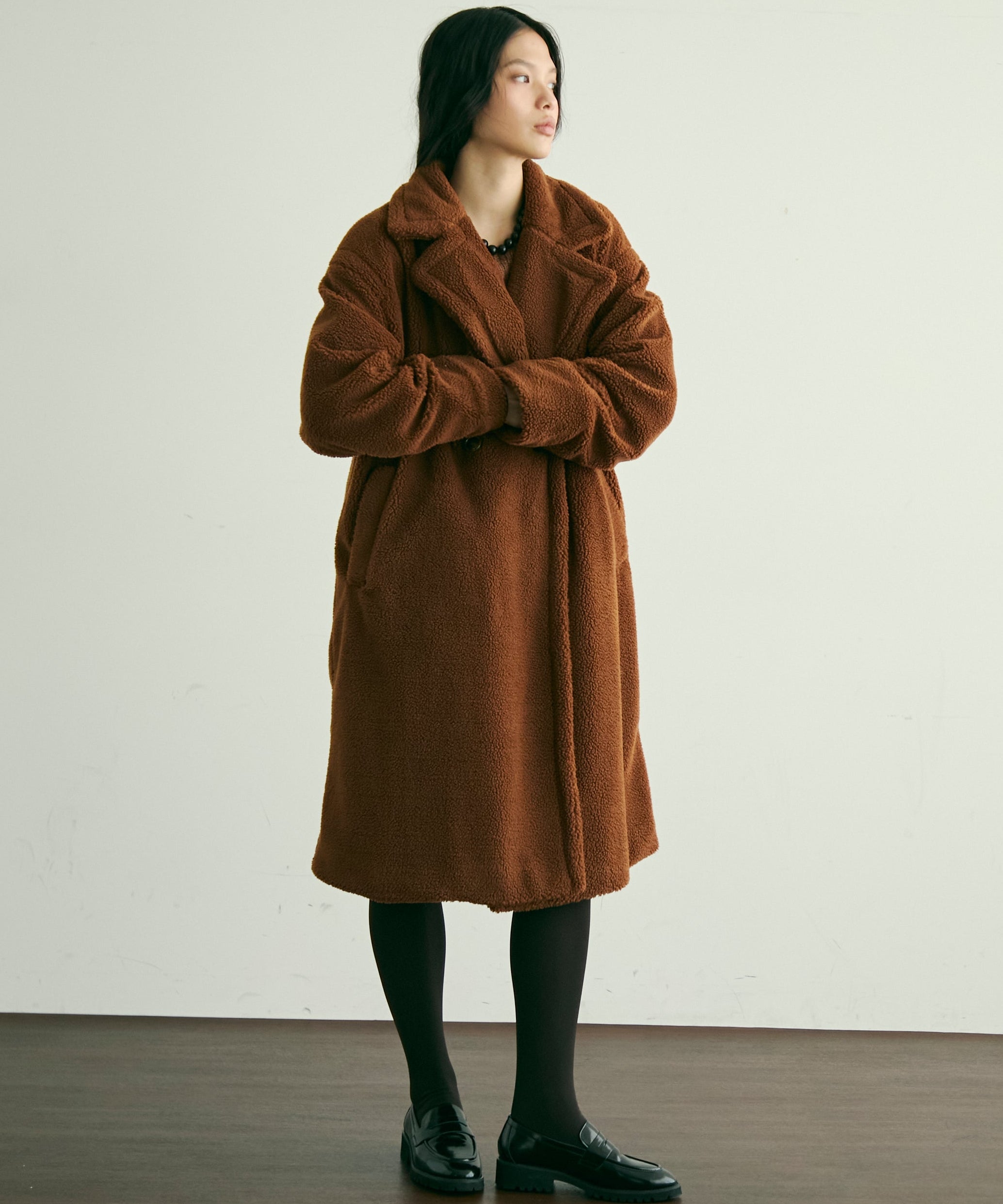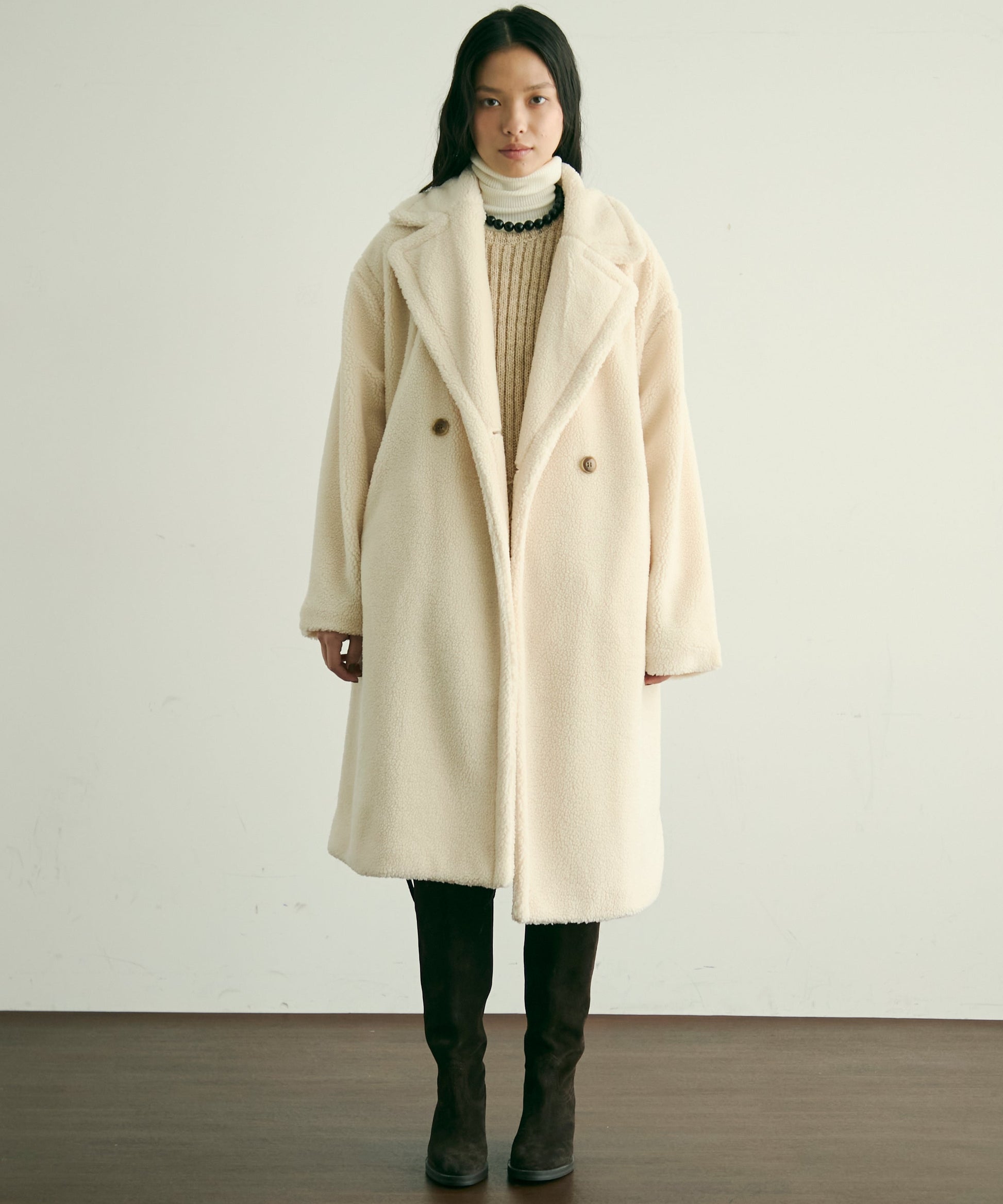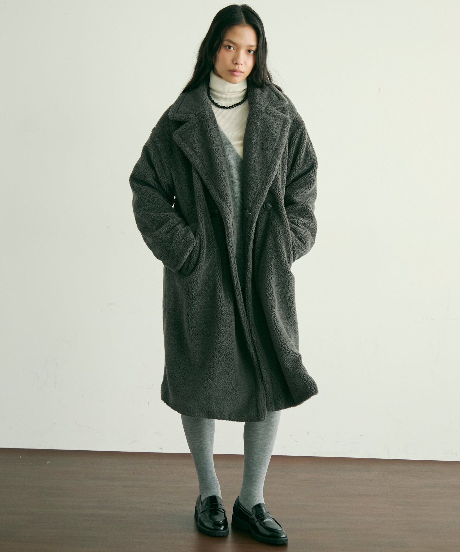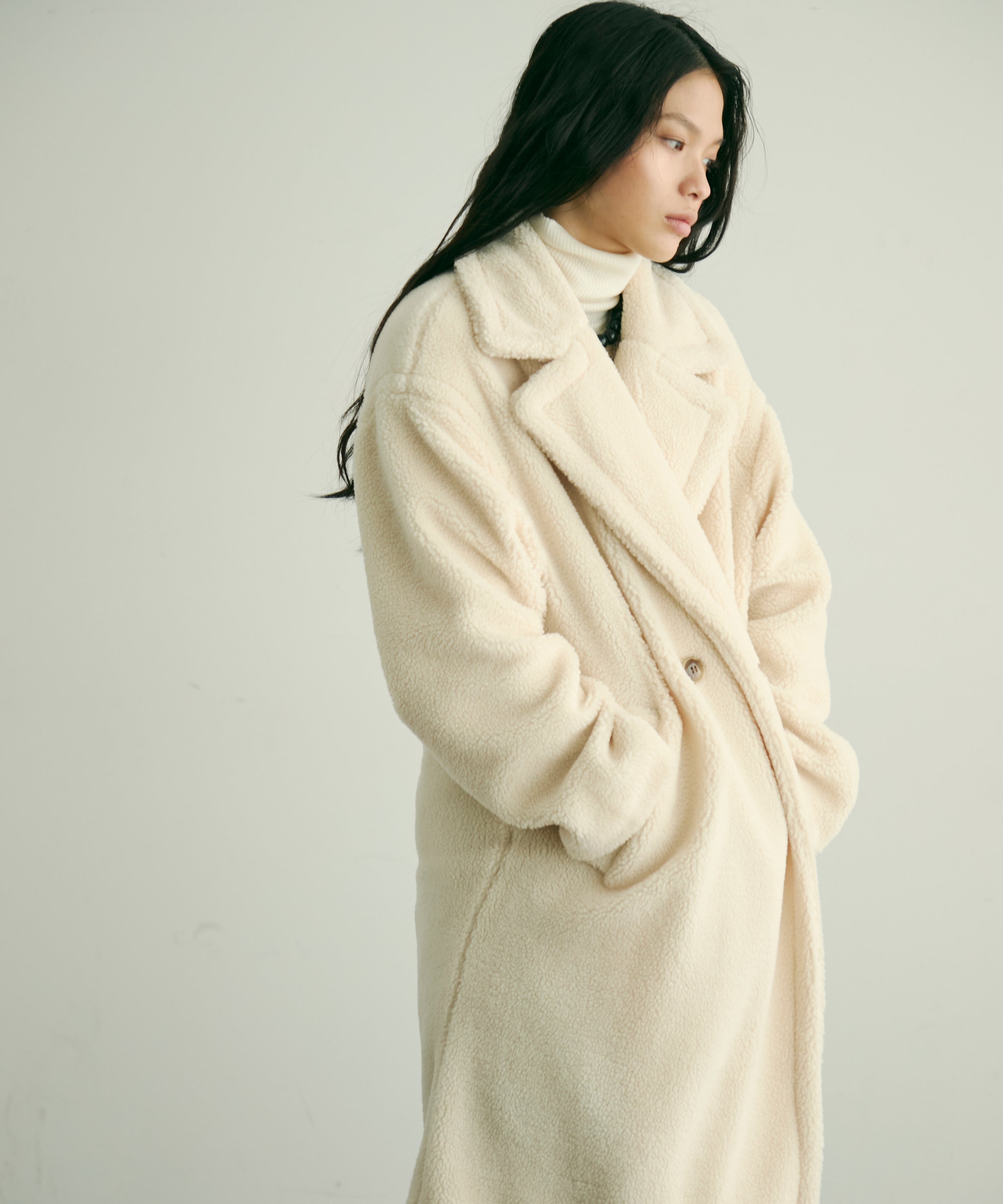 ふんわりとしたボア素材が季節感たっぷりのダブルロングコート。