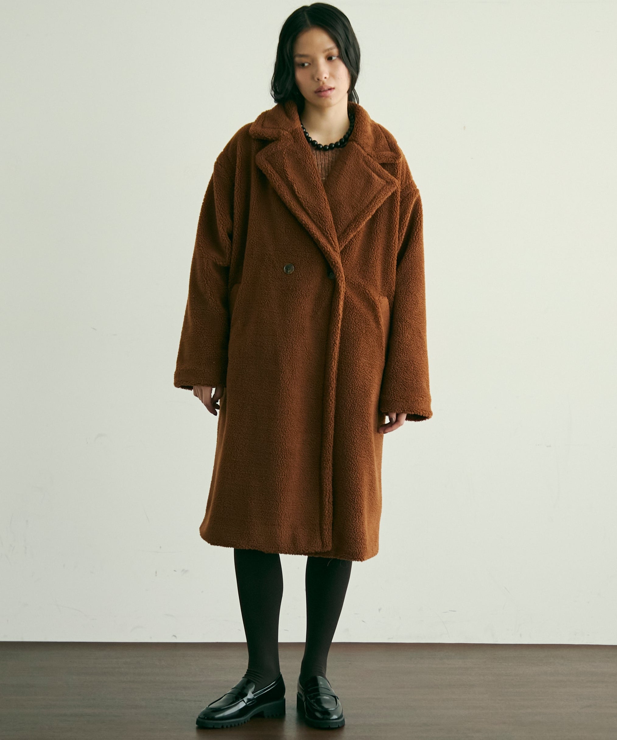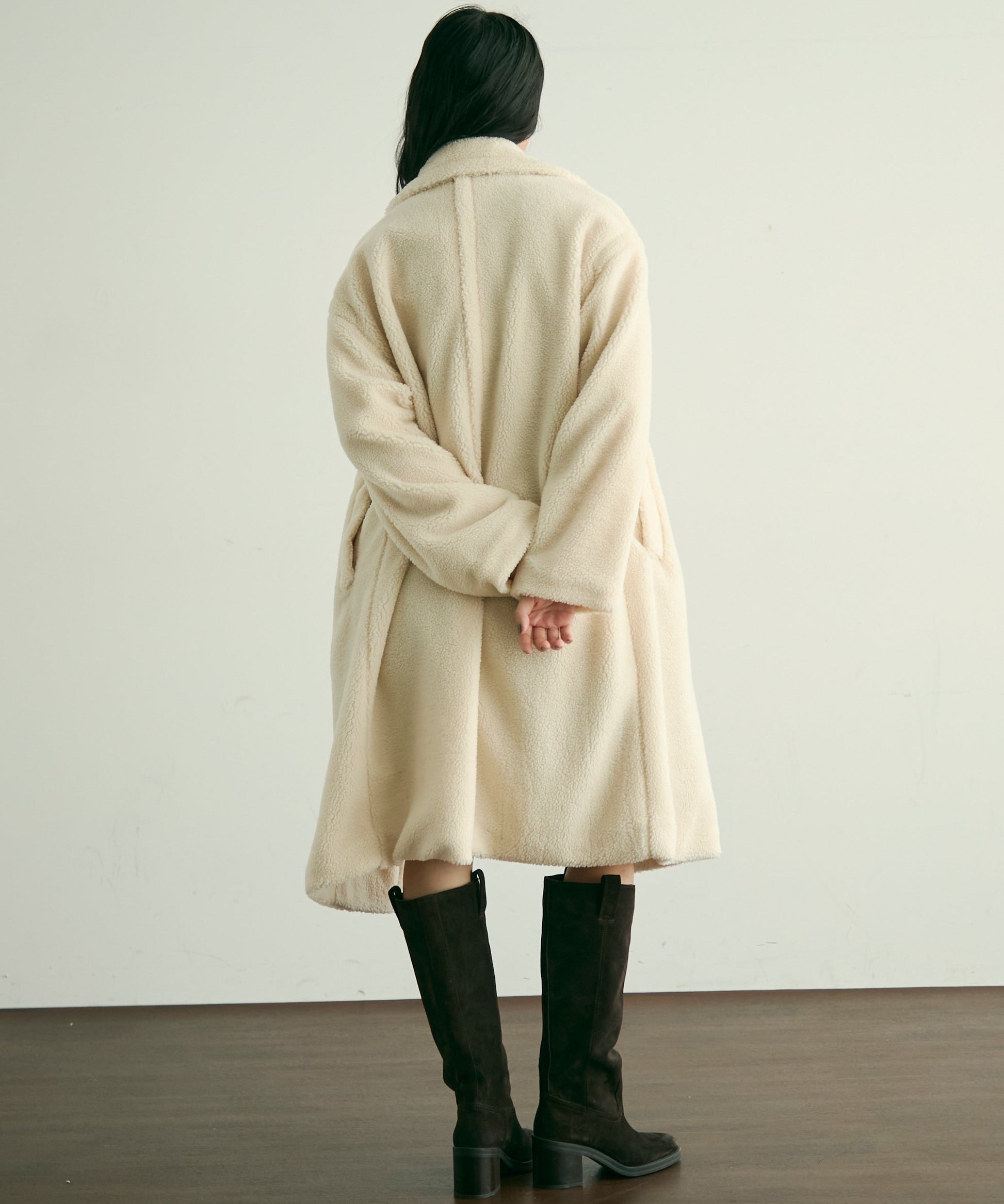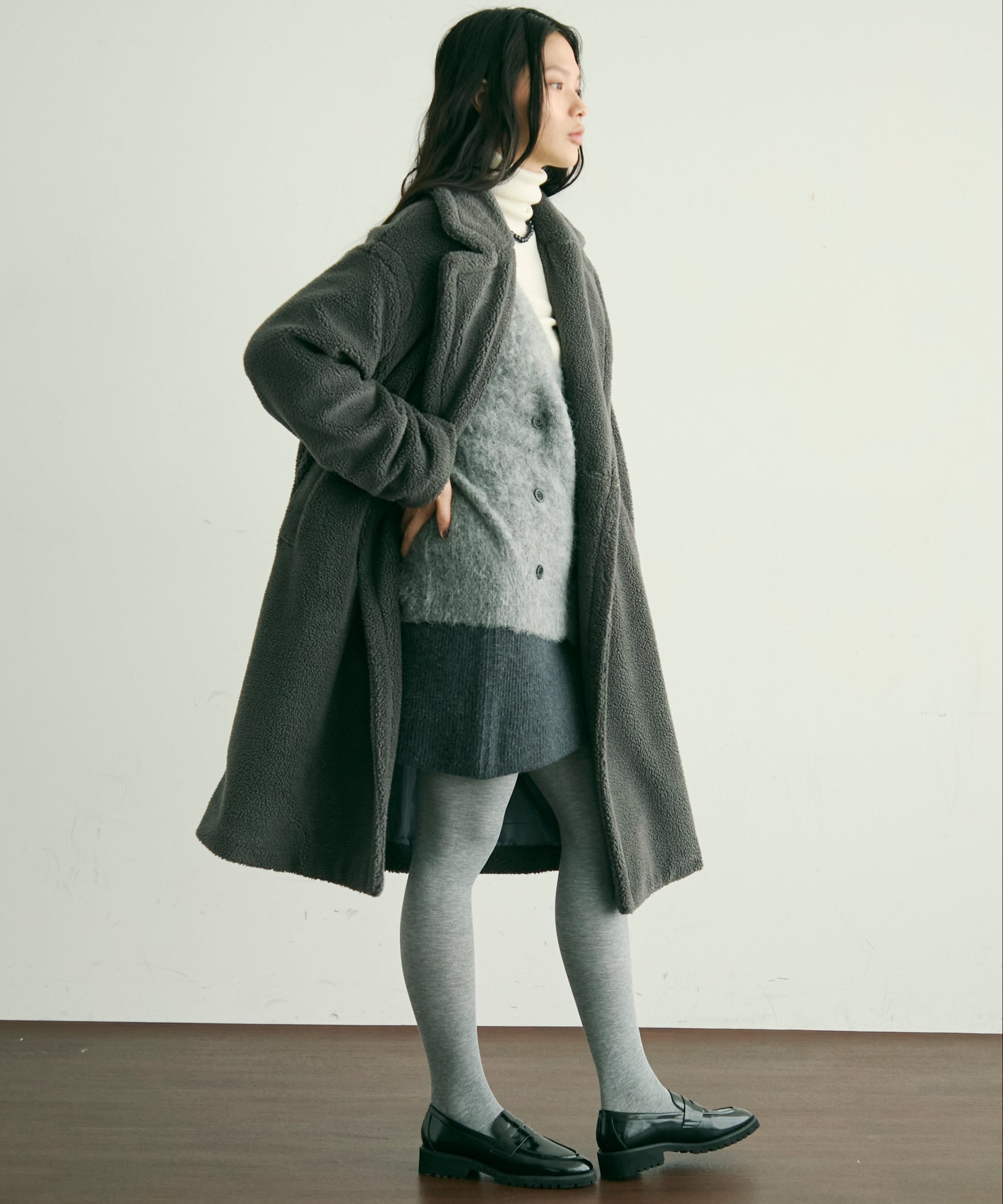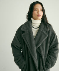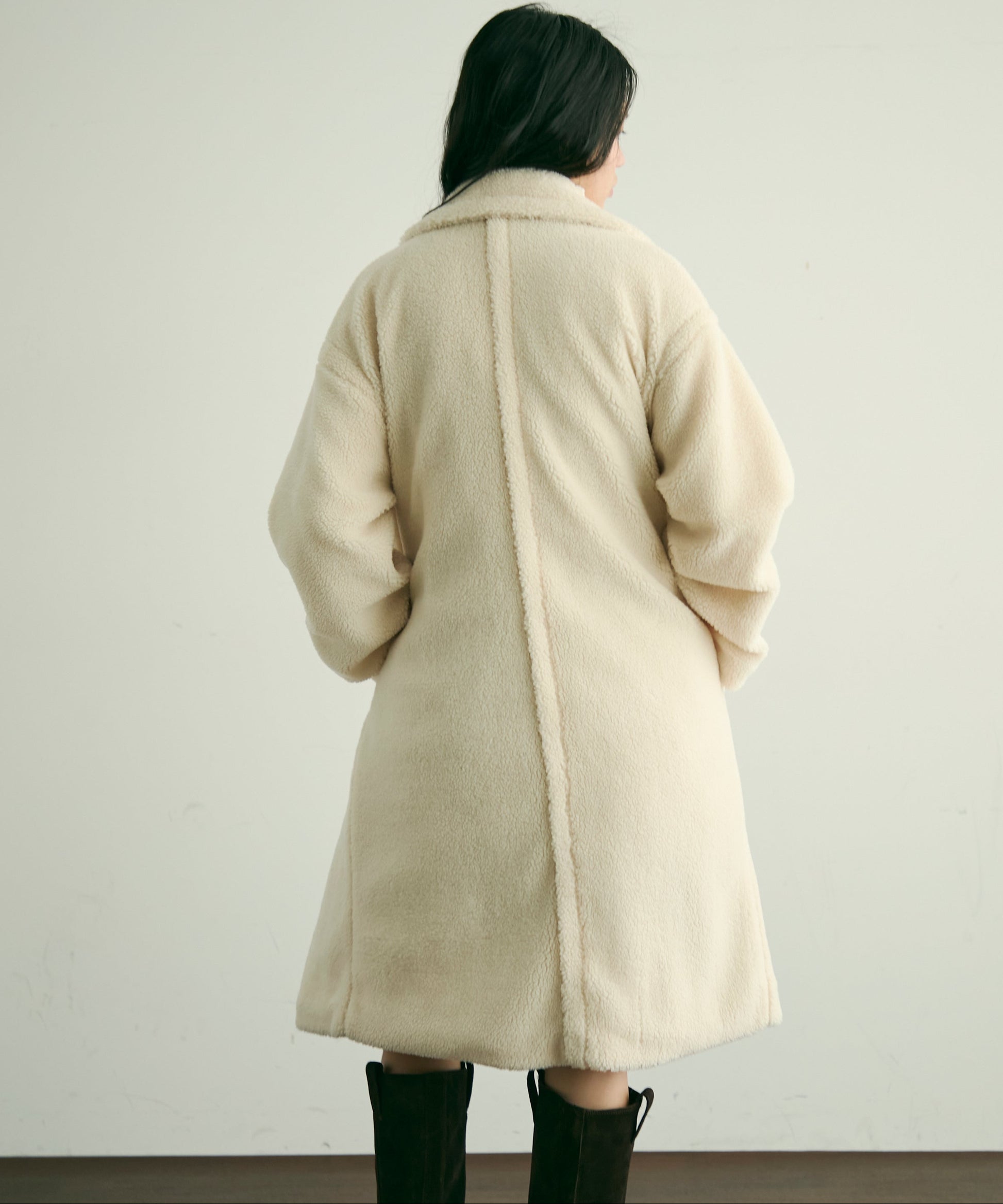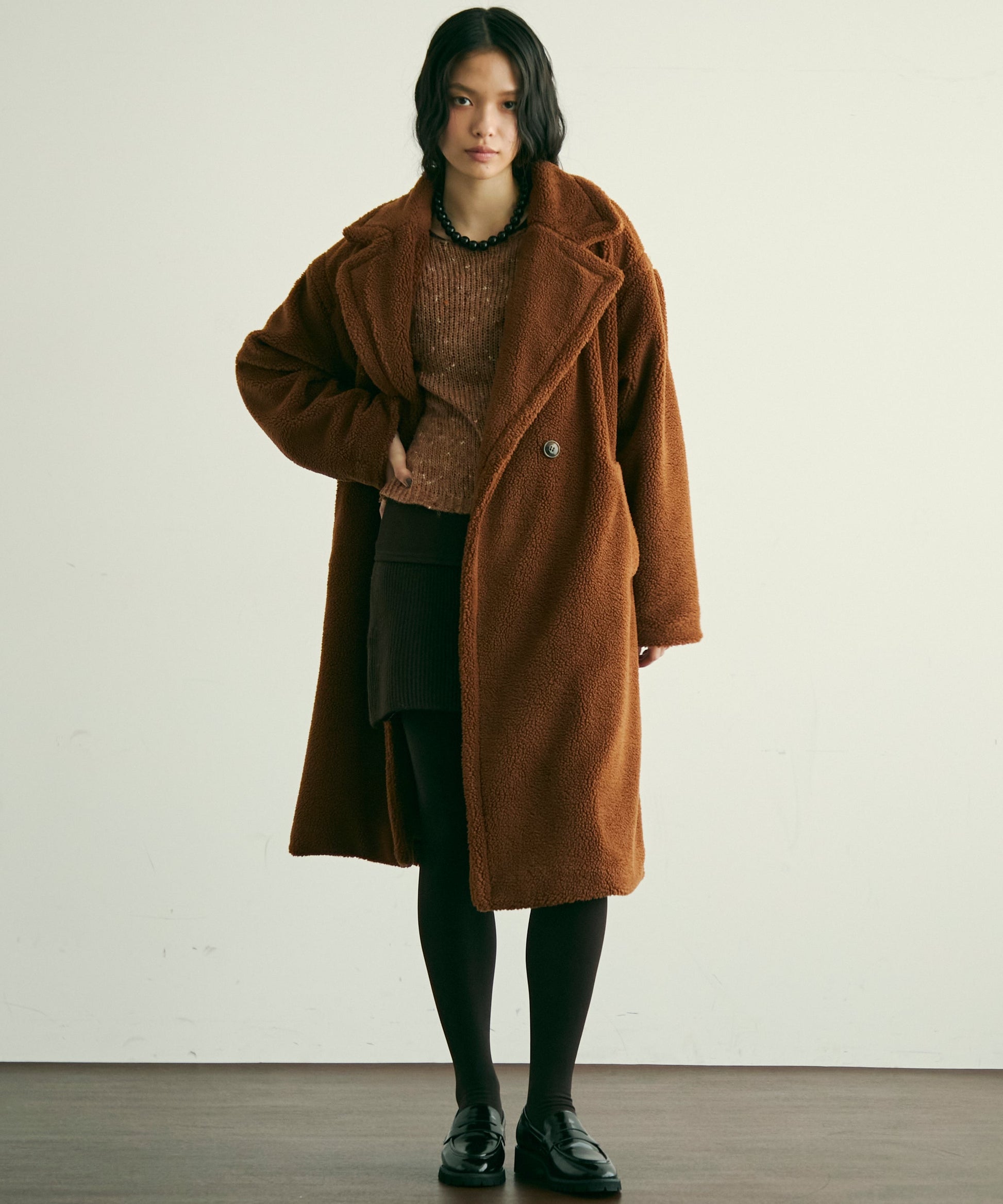 ふんわりとしたボア素材が季節感たっぷりのダブルロングコート。