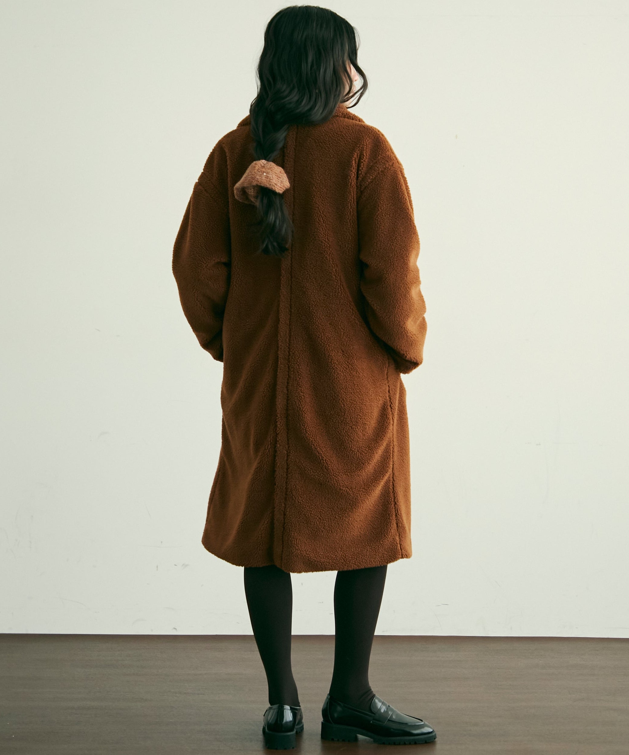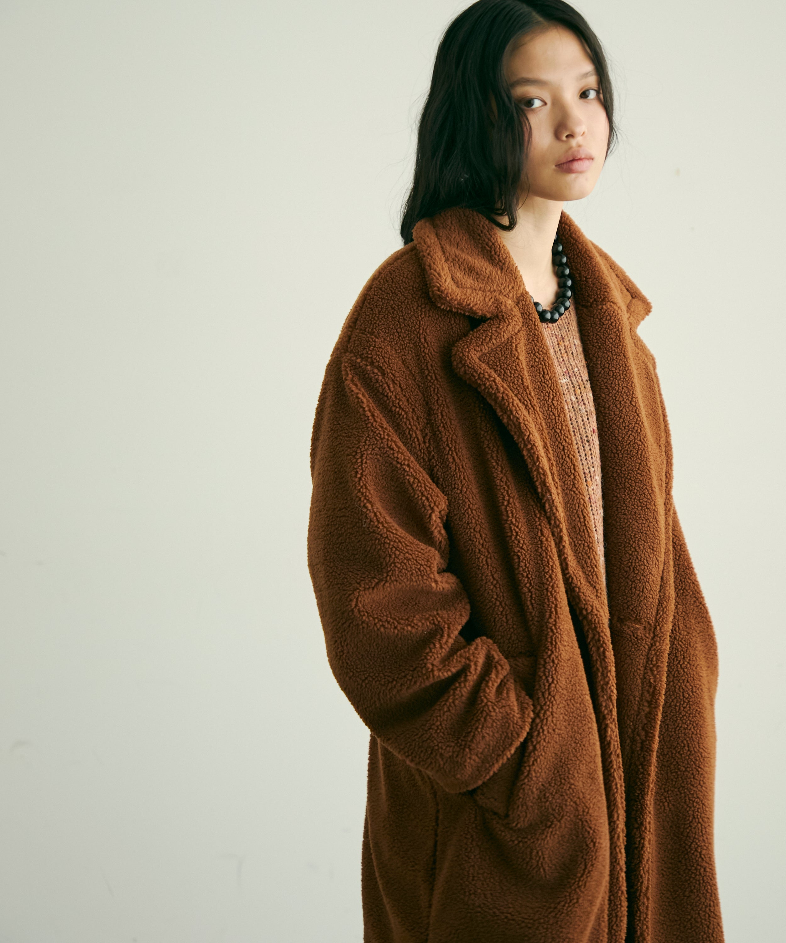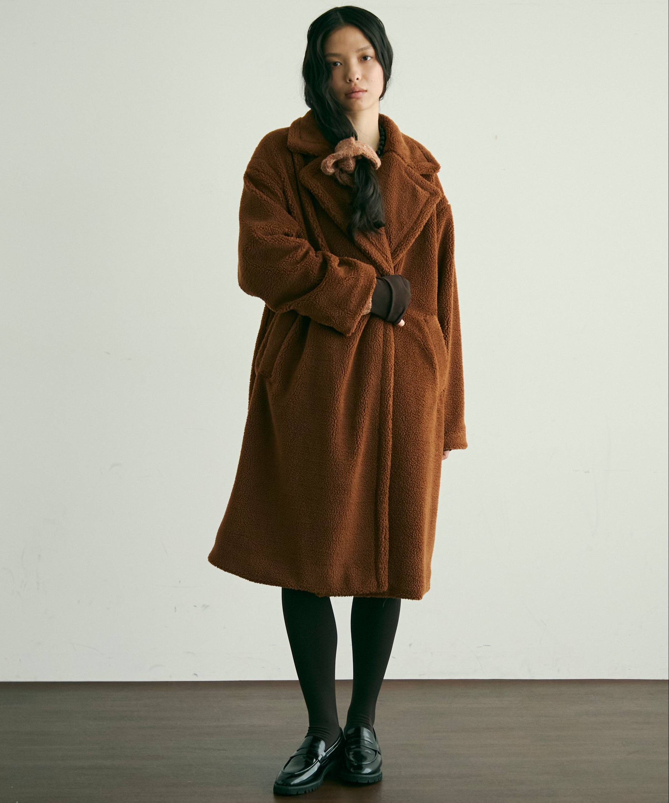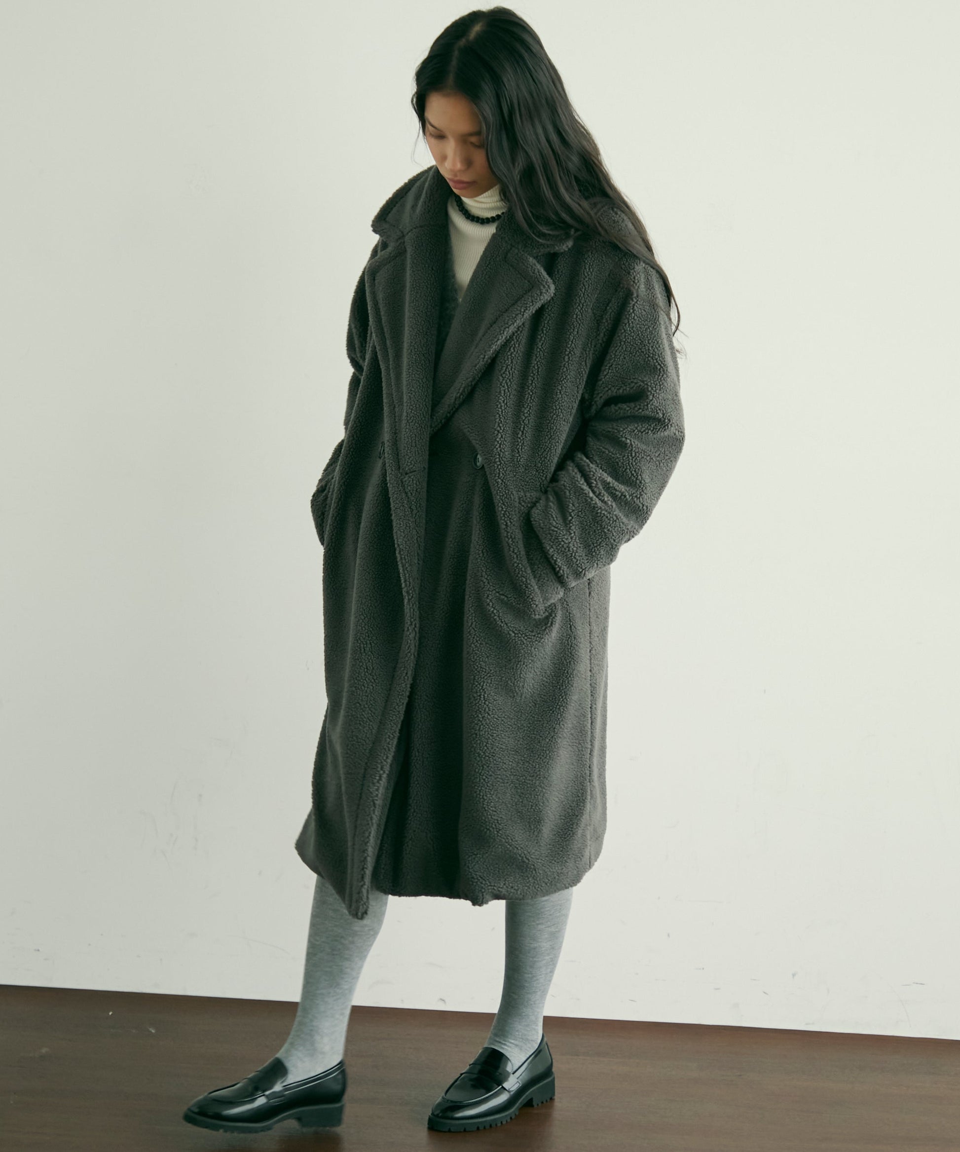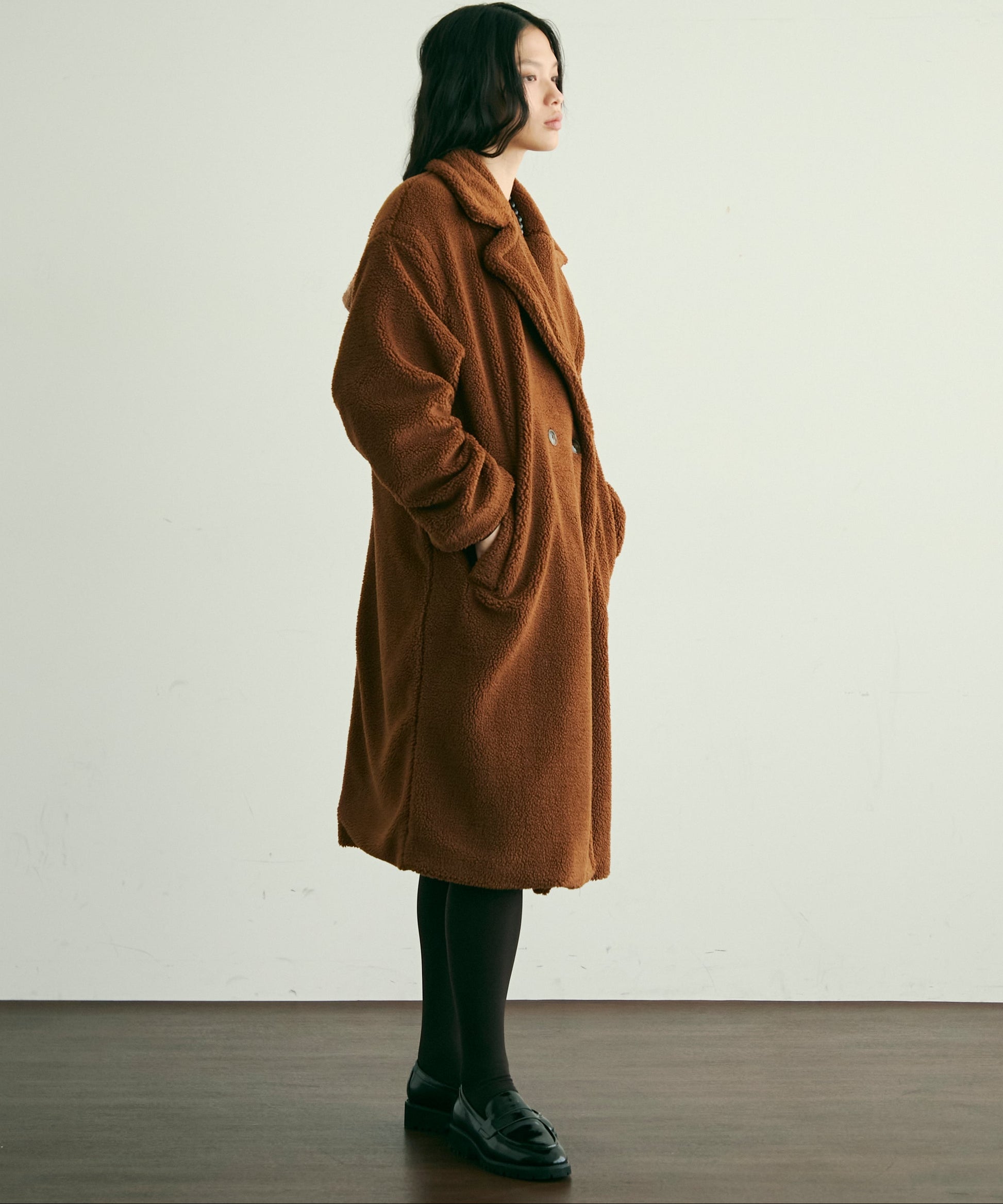 ふんわりとしたボア素材が季節感たっぷりのダブルロングコート。