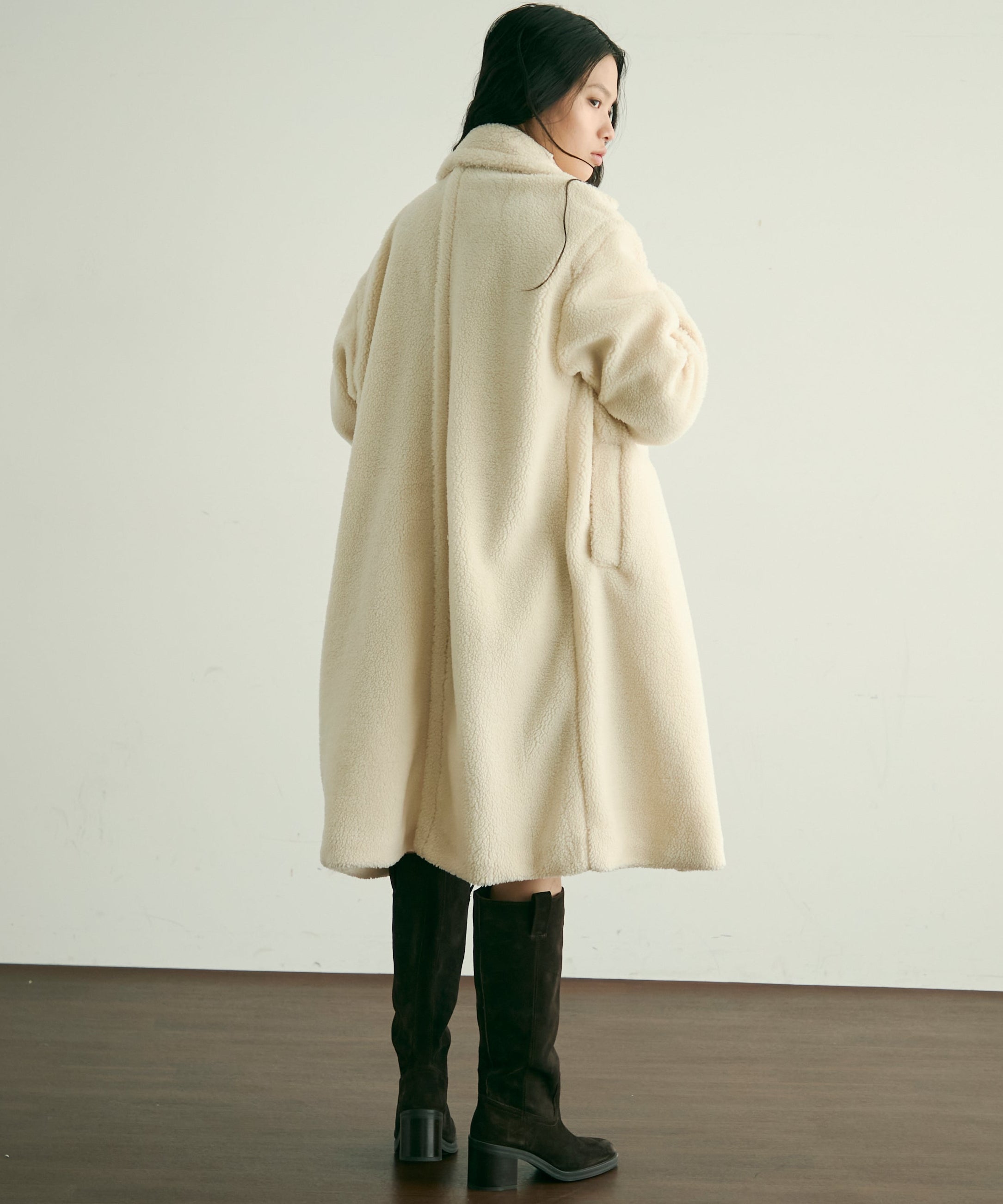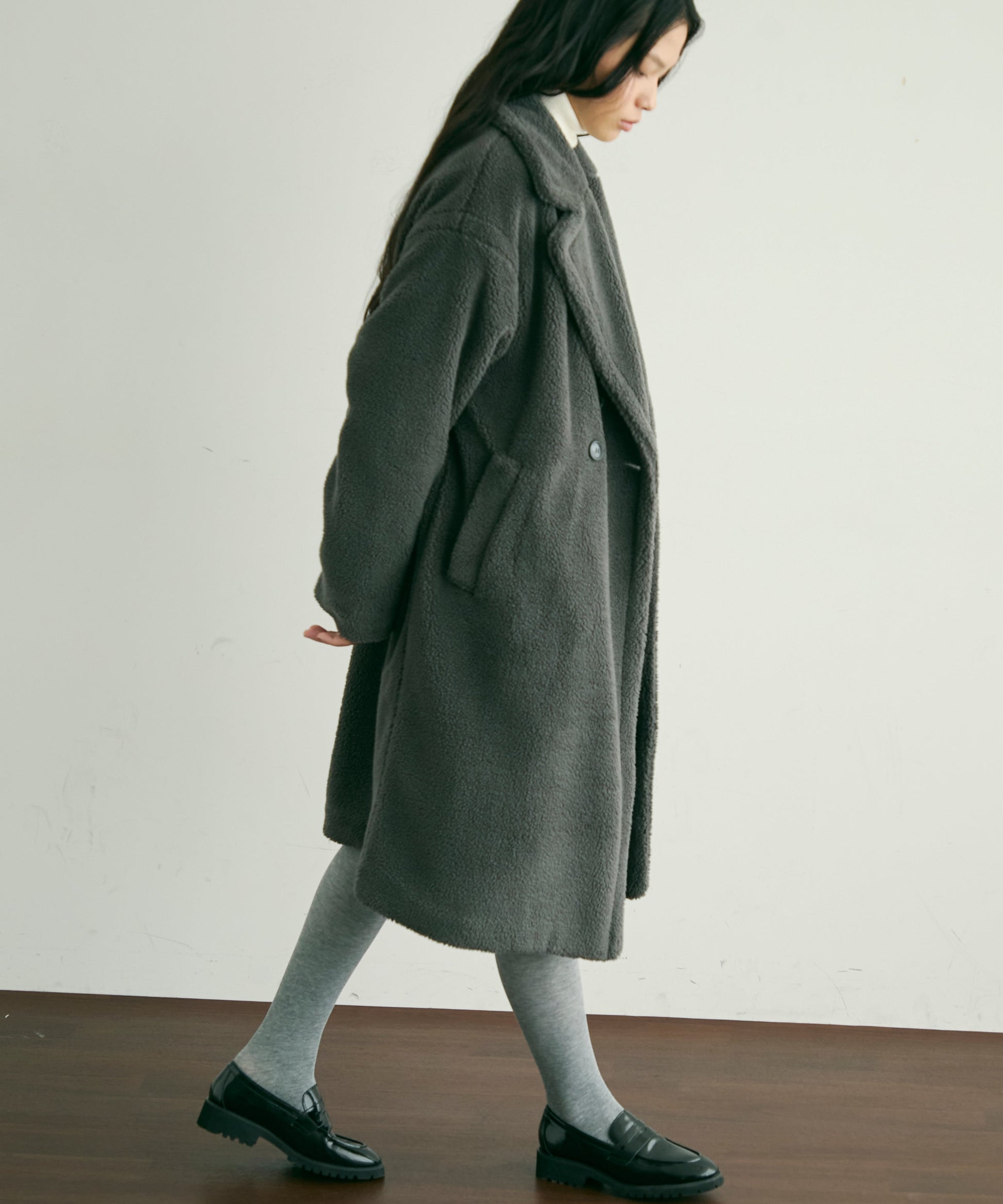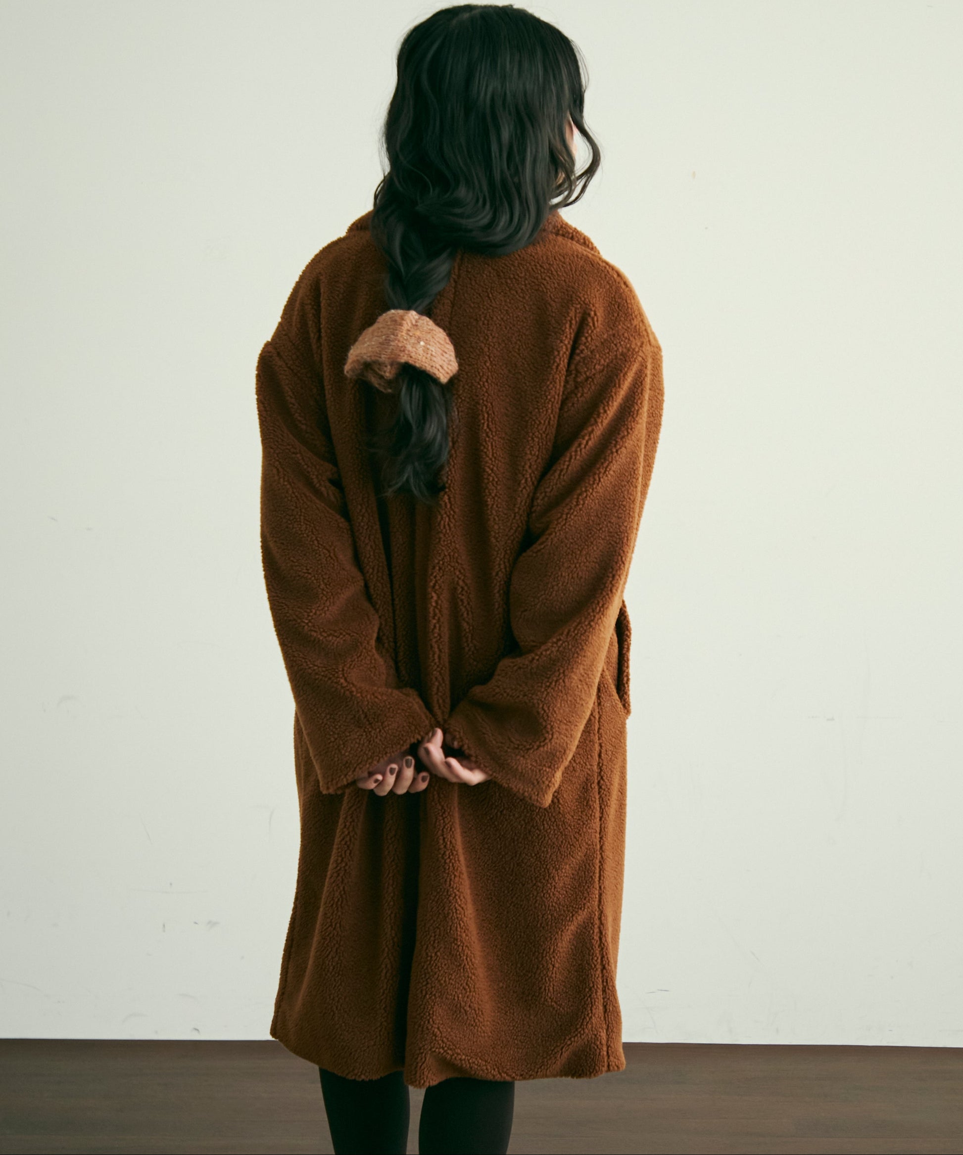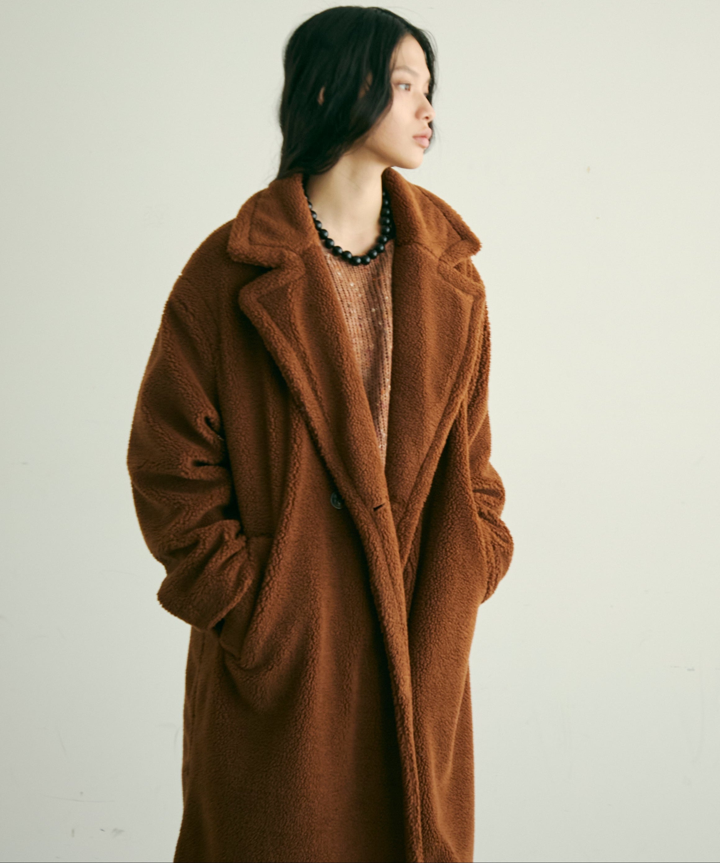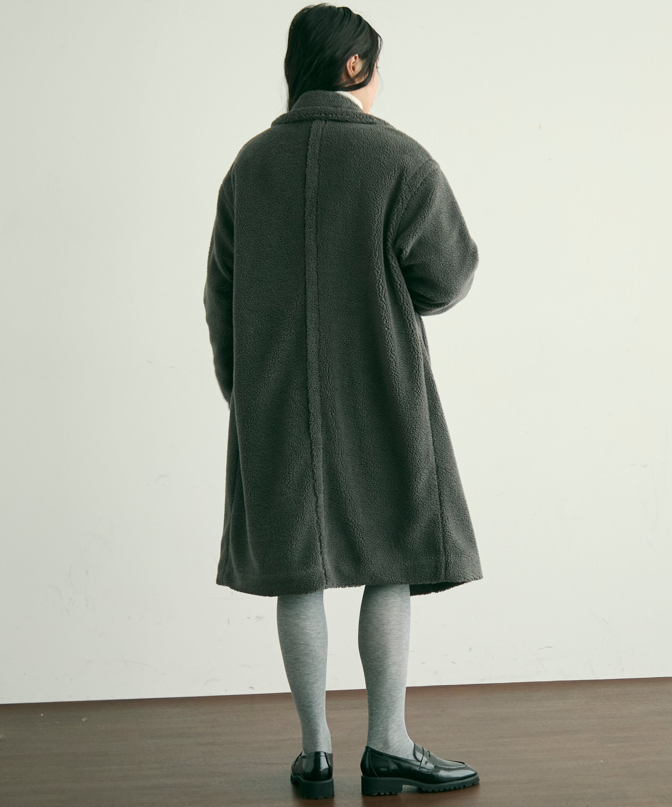 ふんわりとしたボア素材が季節感たっぷりのダブルロングコート。