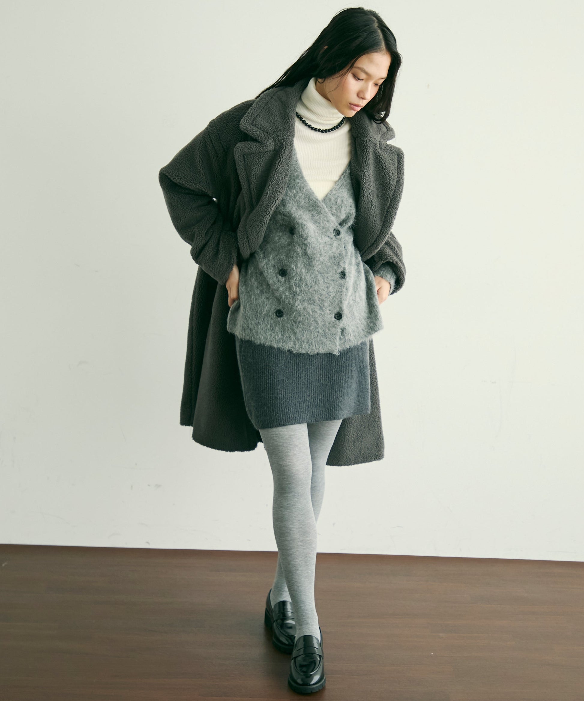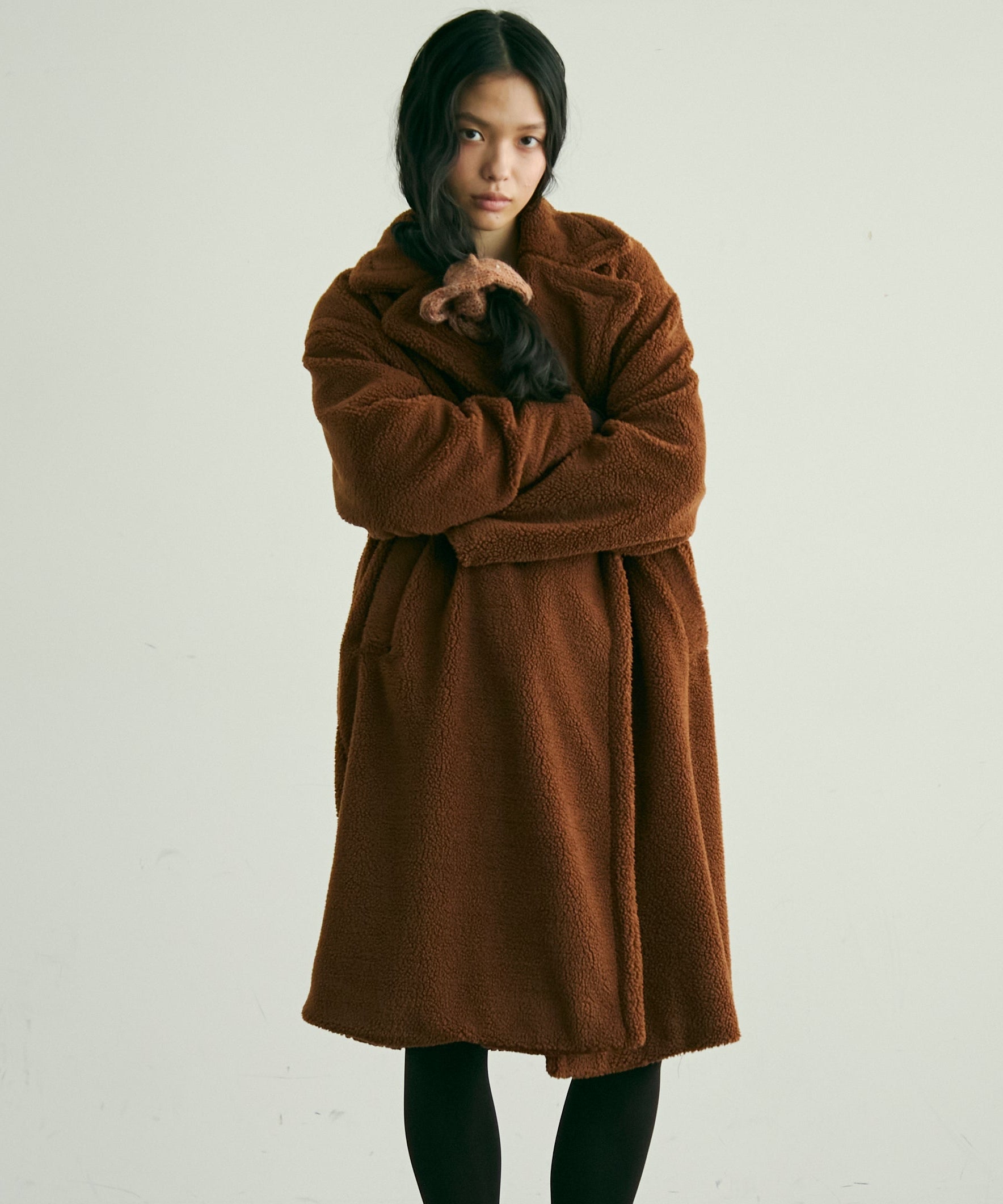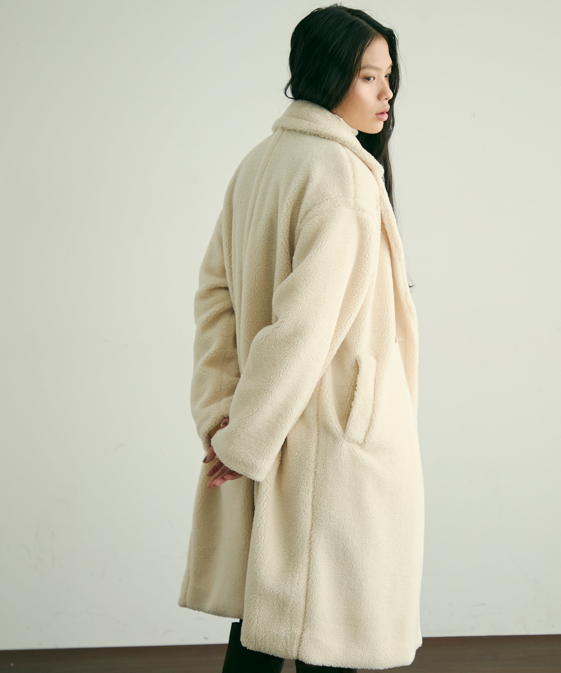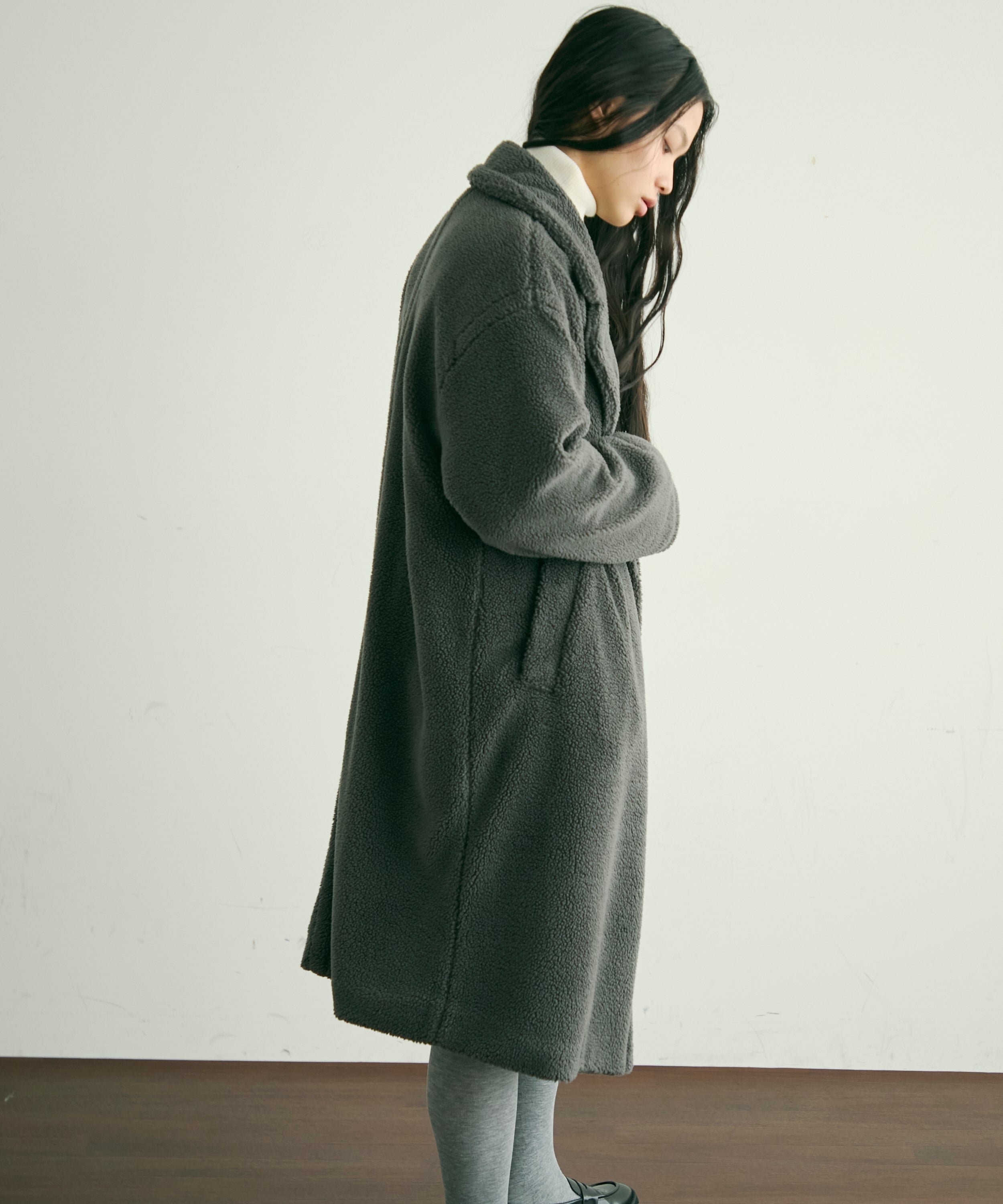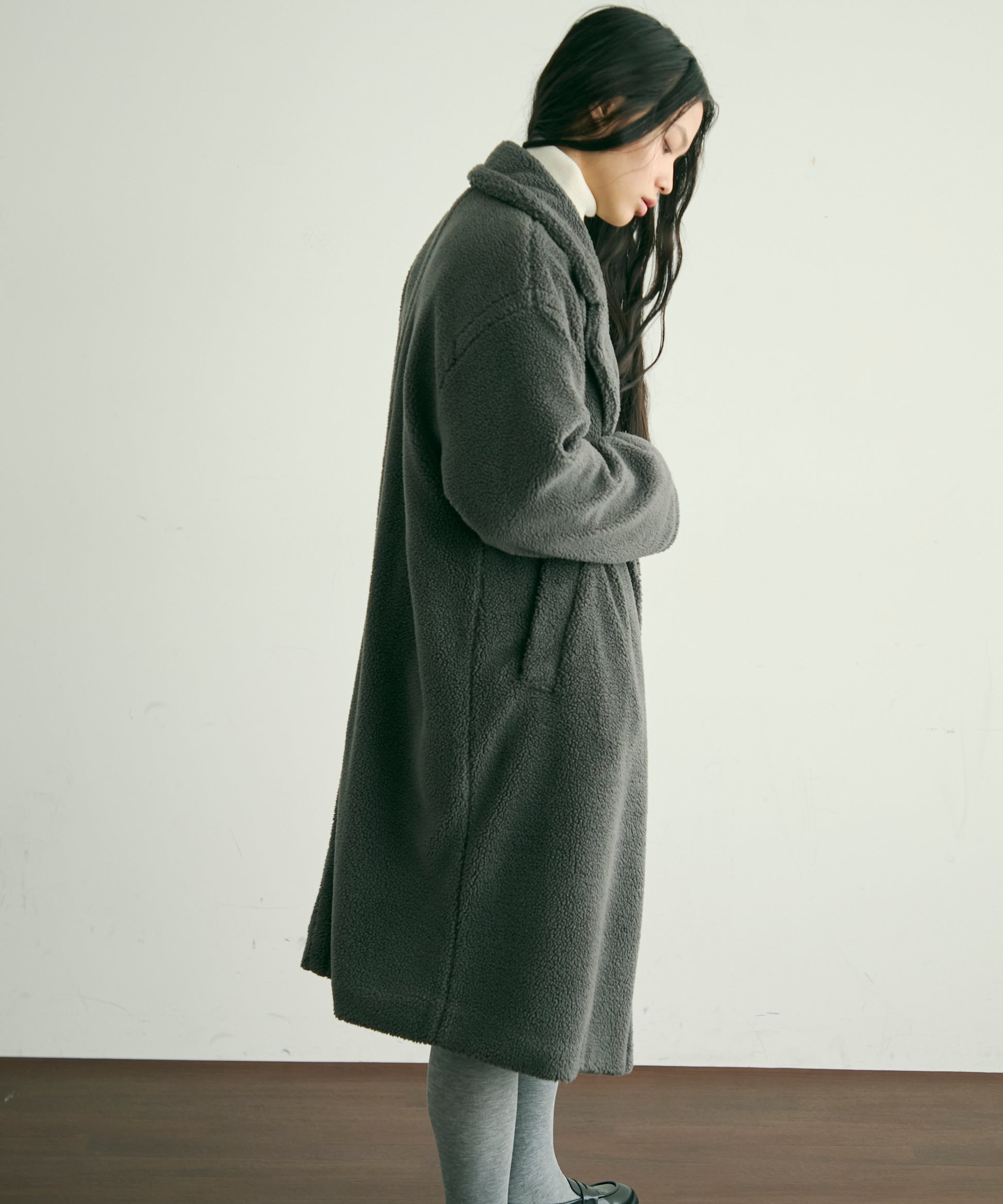 ふんわりとしたボア素材が季節感たっぷりのダブルロングコート。
