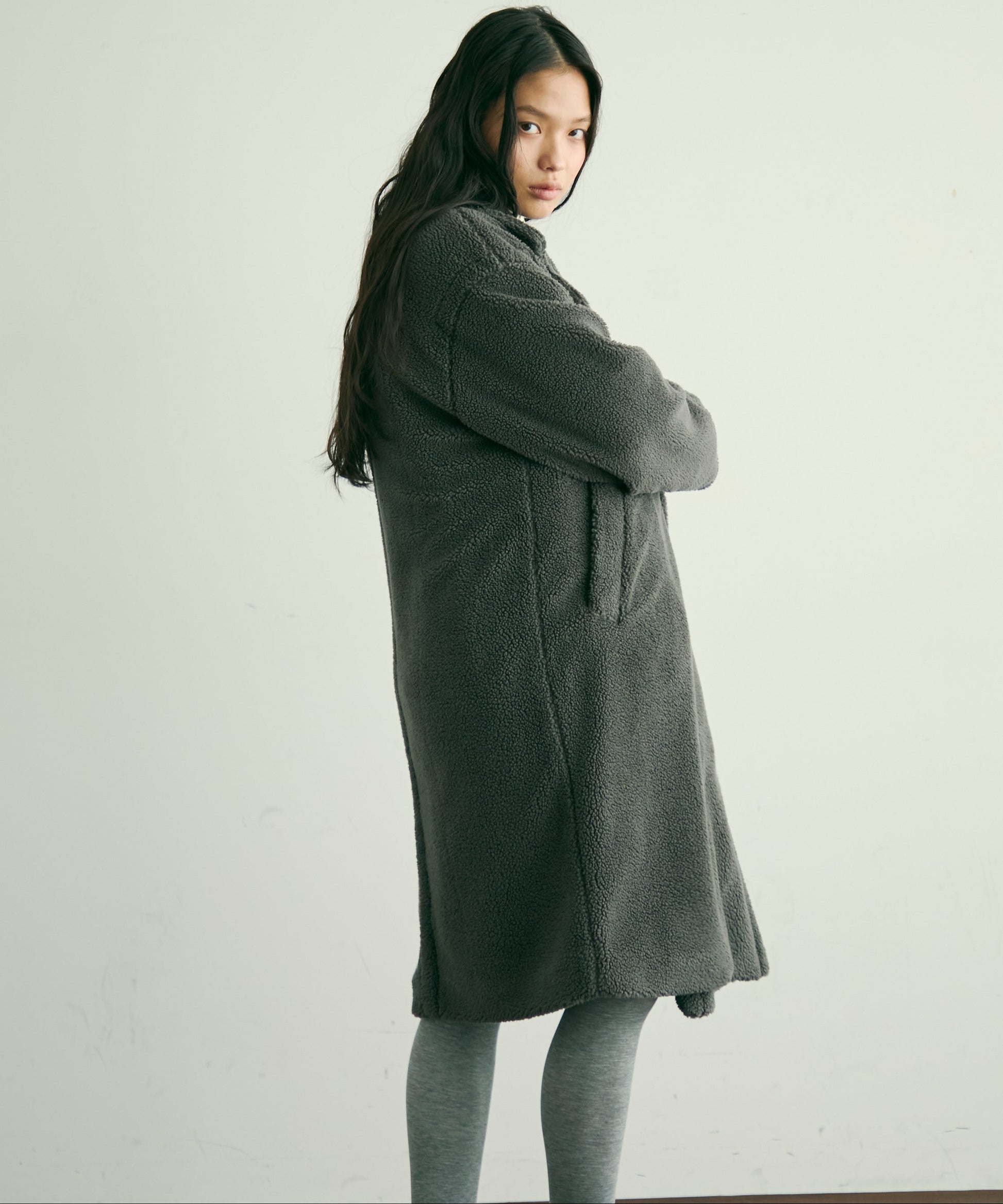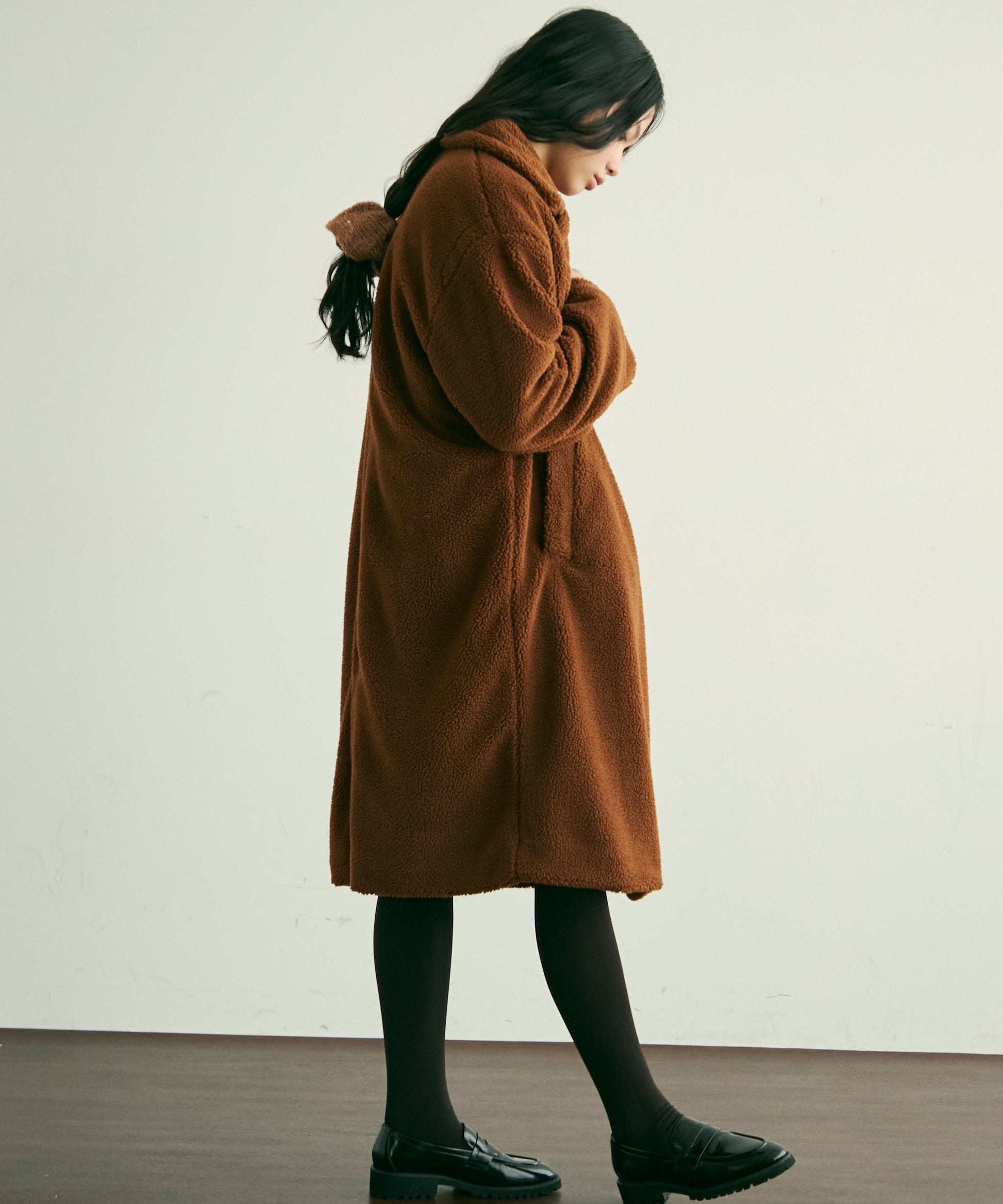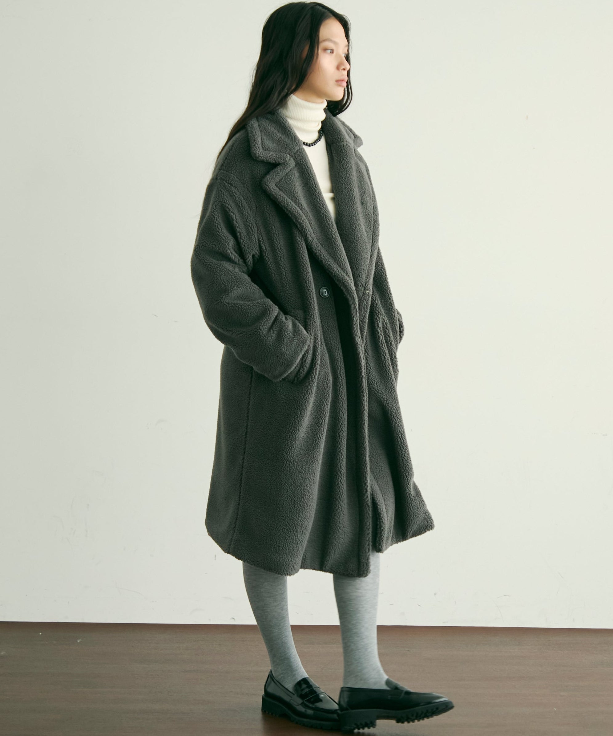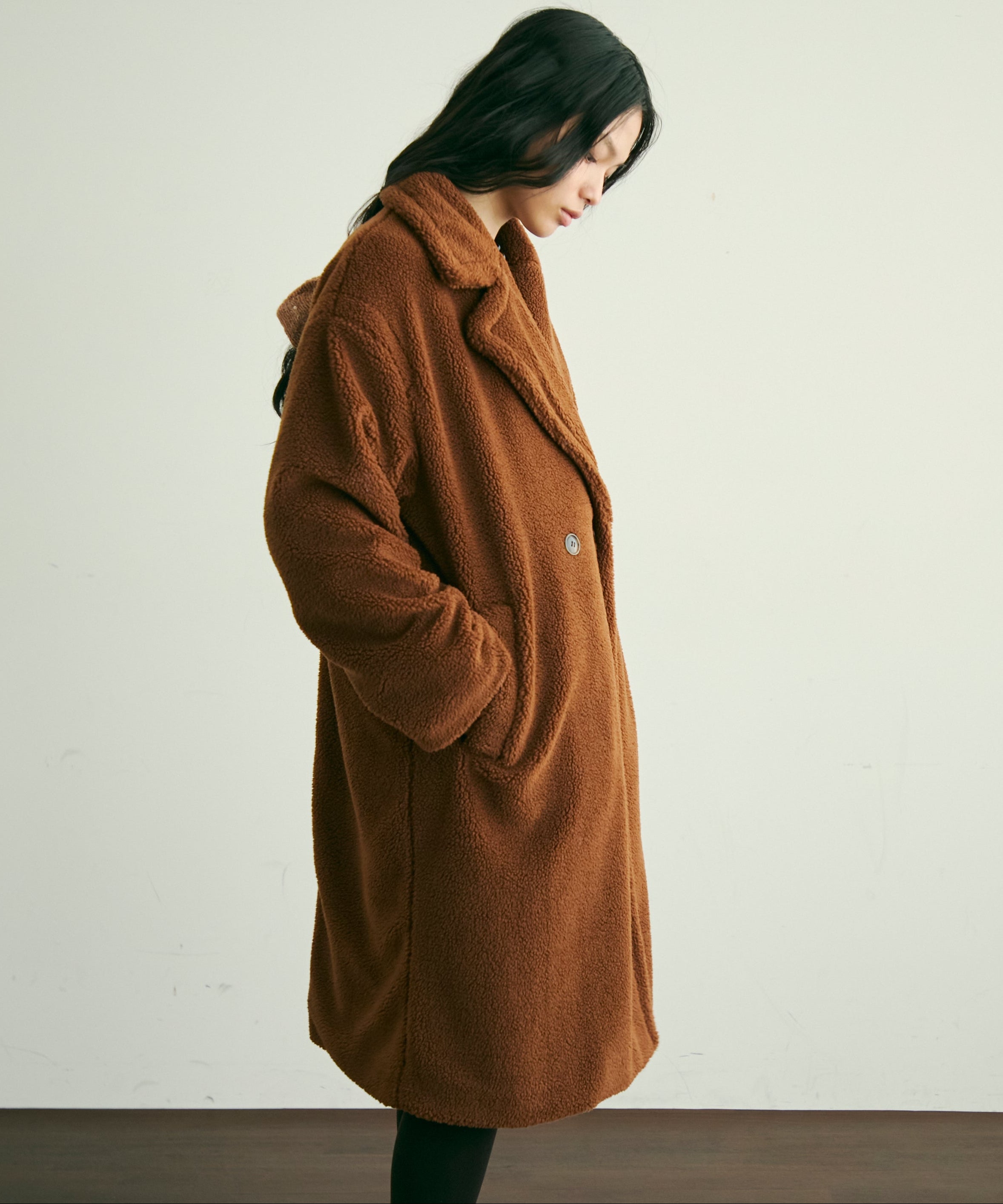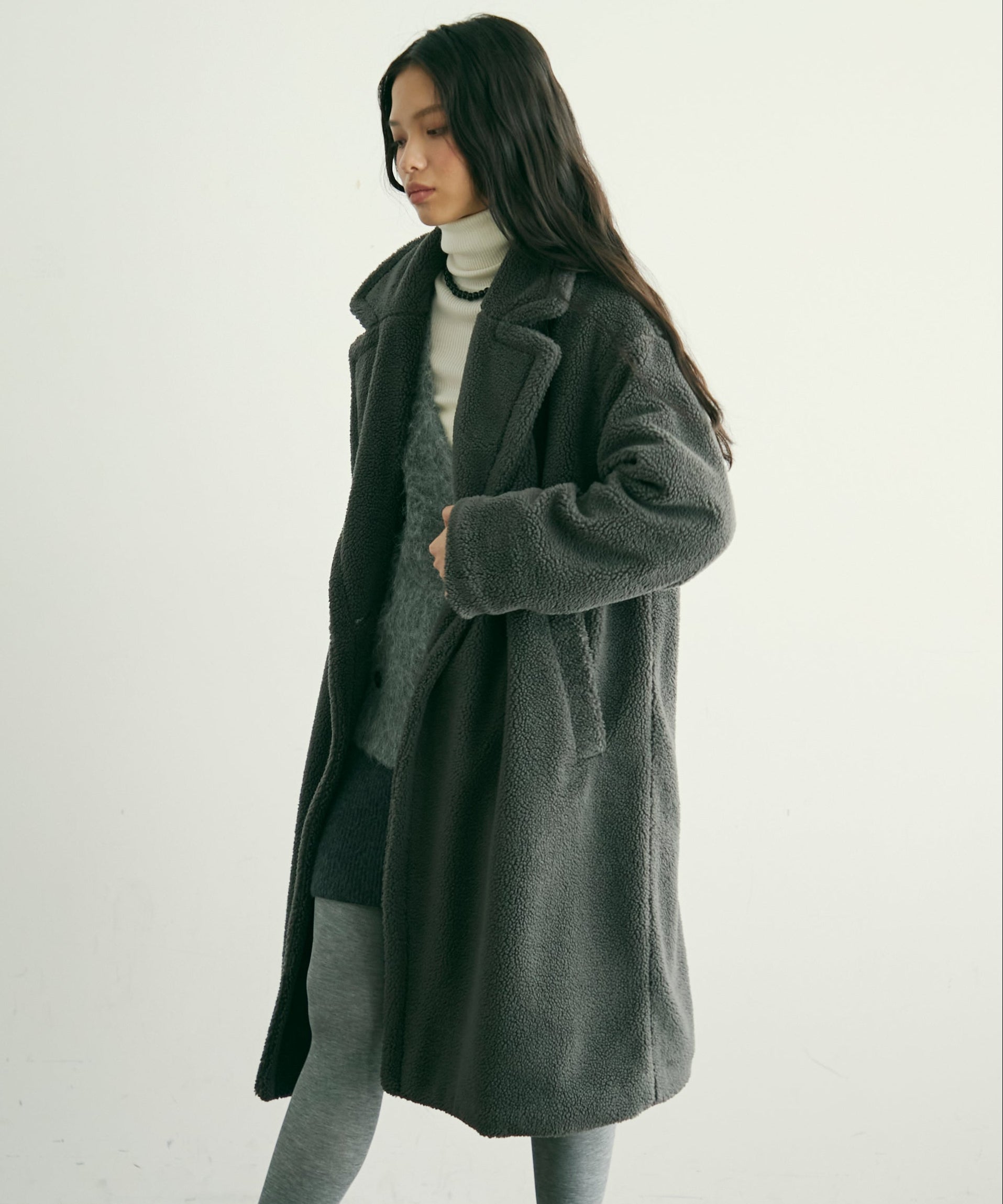 ふんわりとしたボア素材が季節感たっぷりのダブルロングコート。