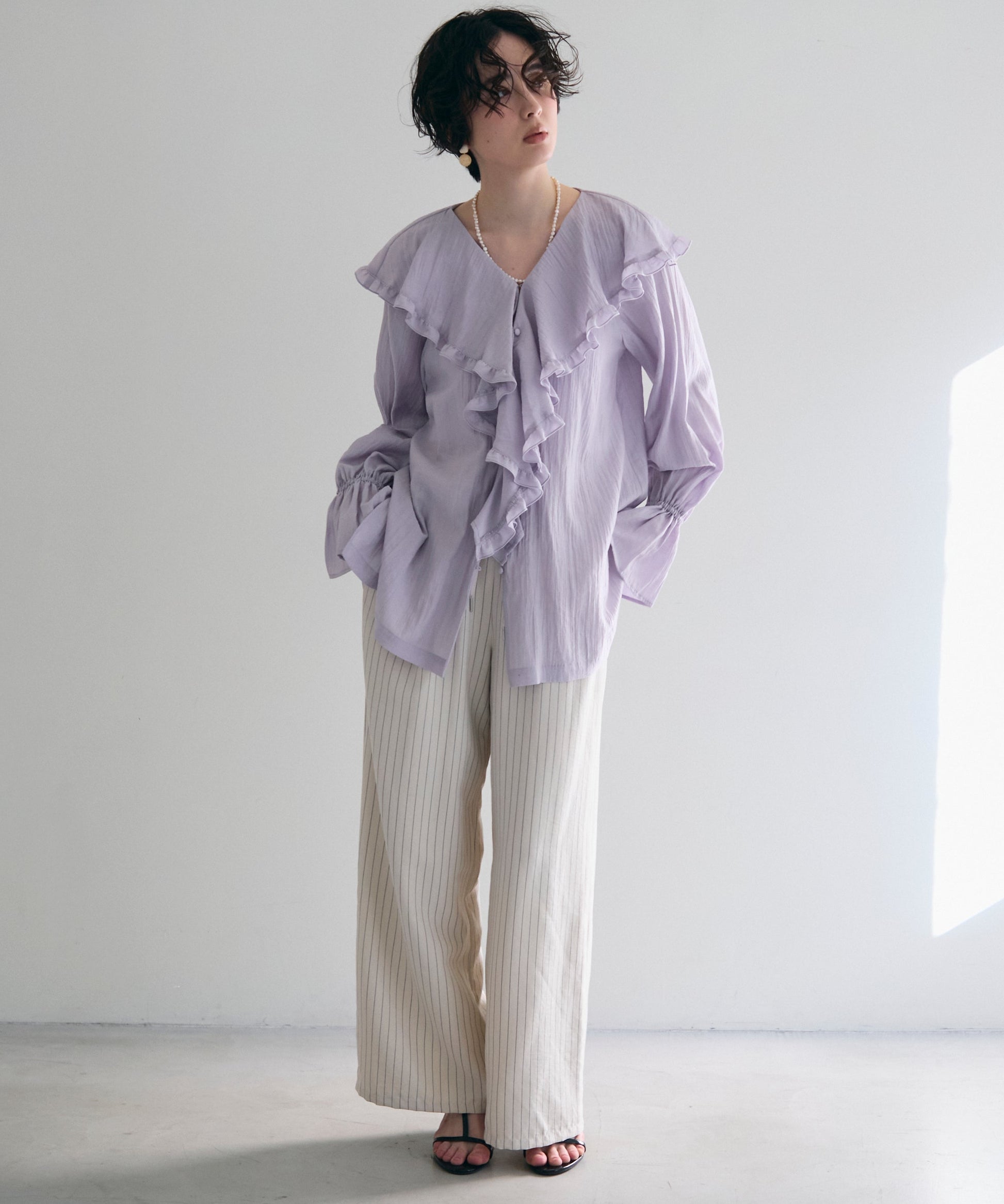 ギャザーをたっぷり寄せたリラックス感のあるシルエットながら、落ち感のある素材が大人らしい上品さを演出します。