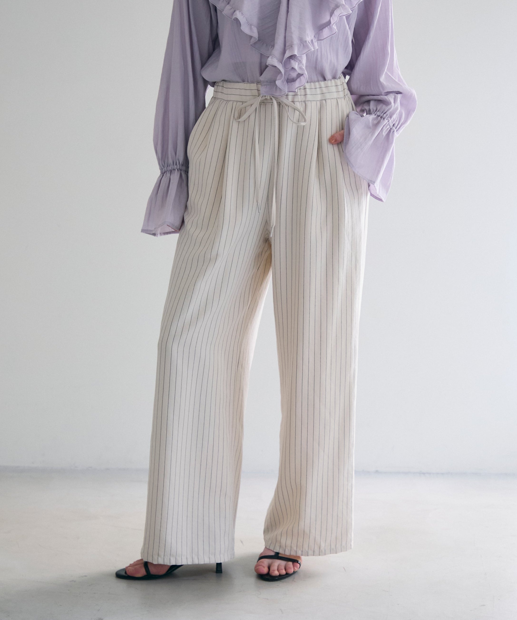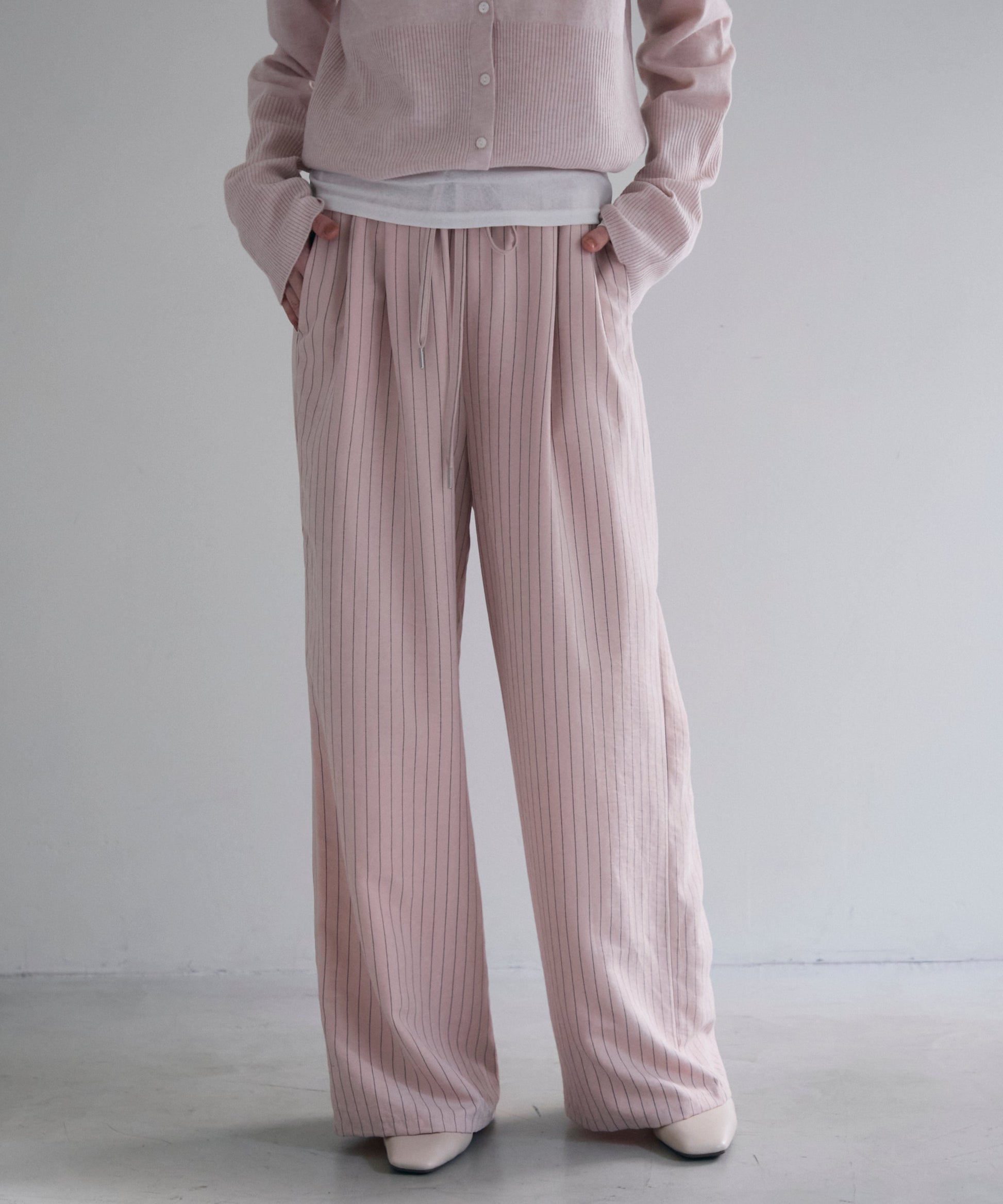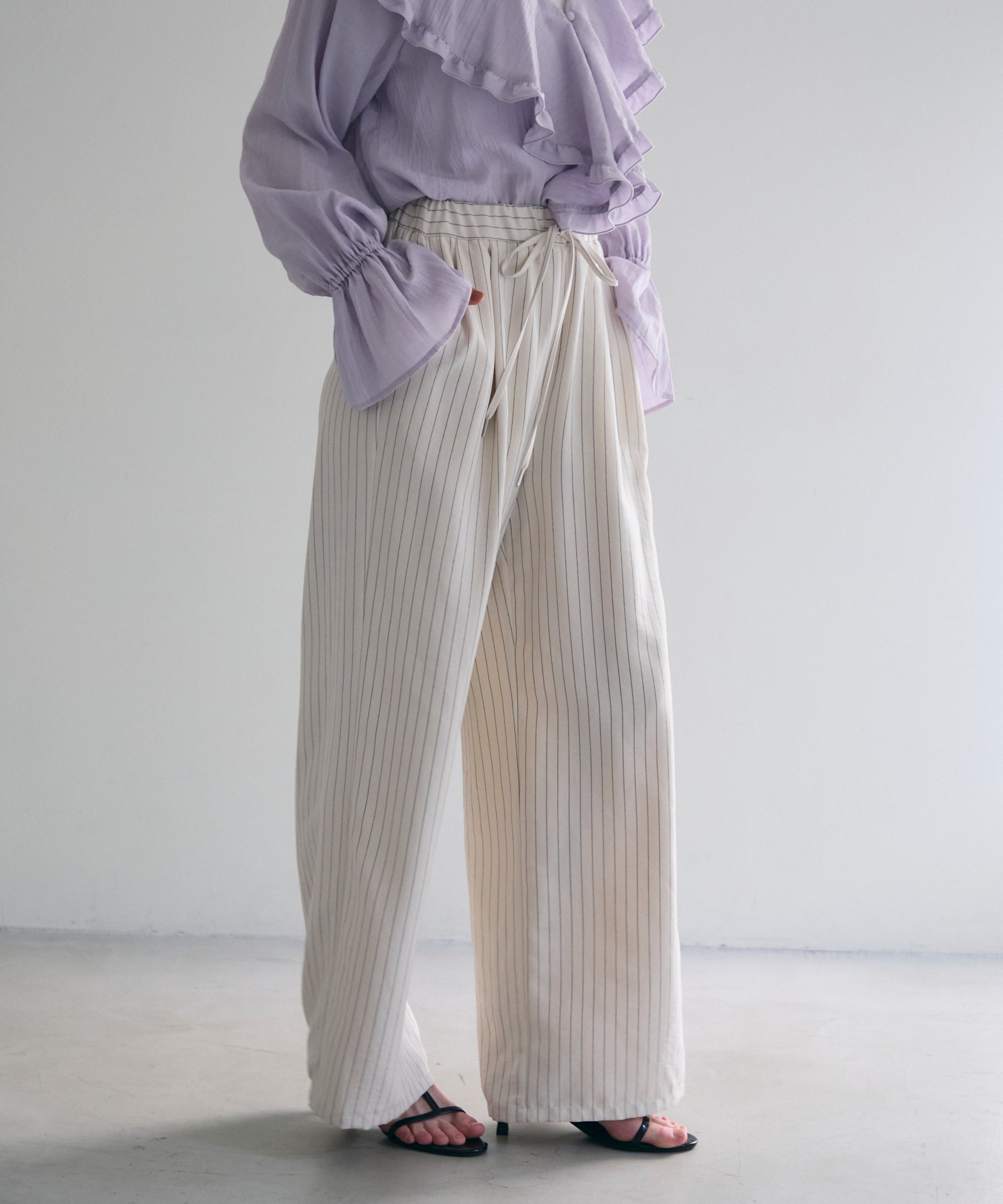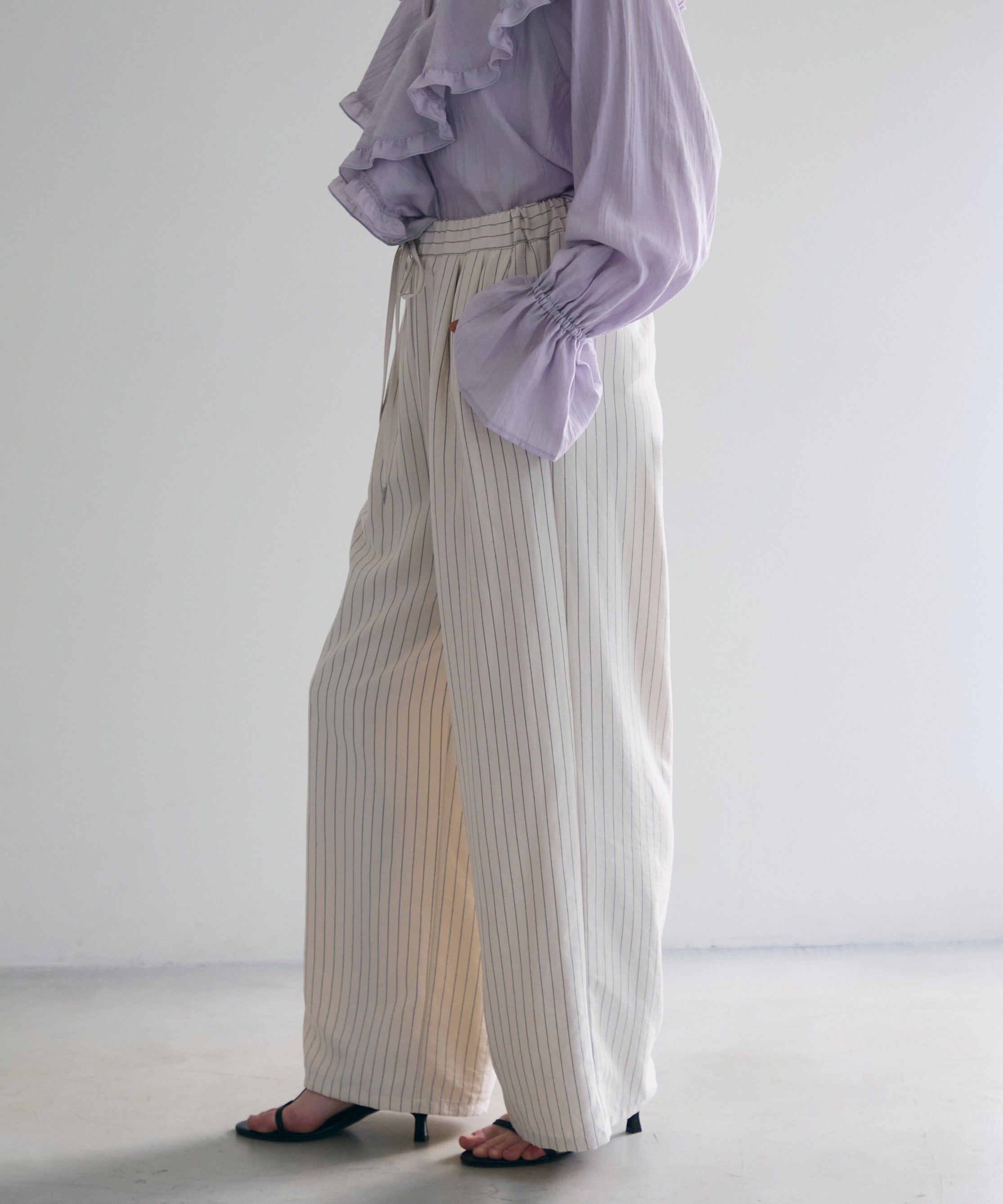 パウダースキンならではの、しっとりとなめらかなタッチが魅力のストライプイージーパンツ。