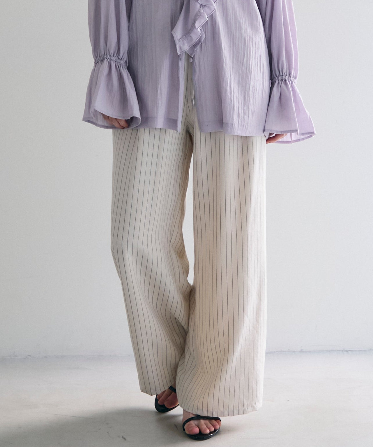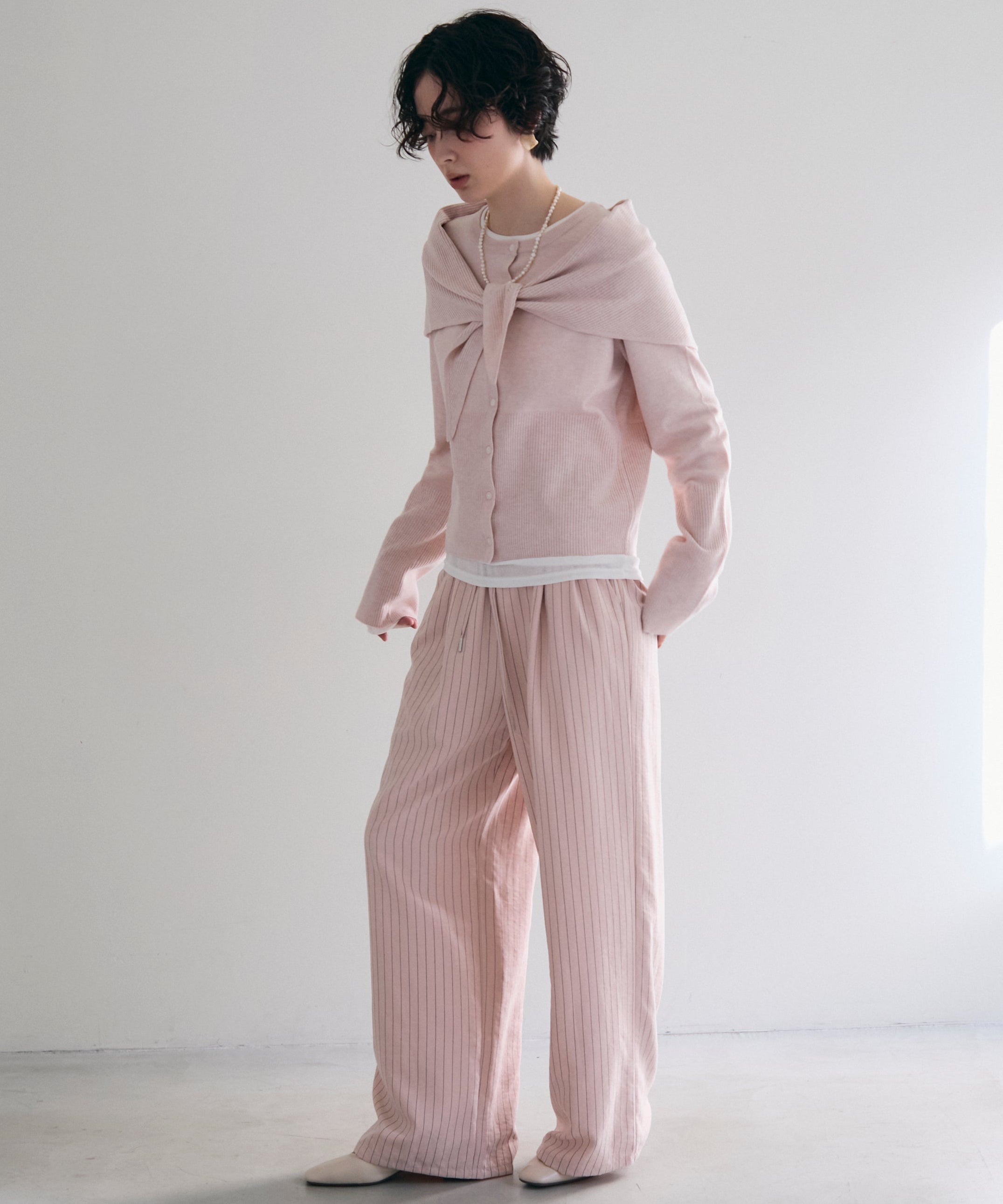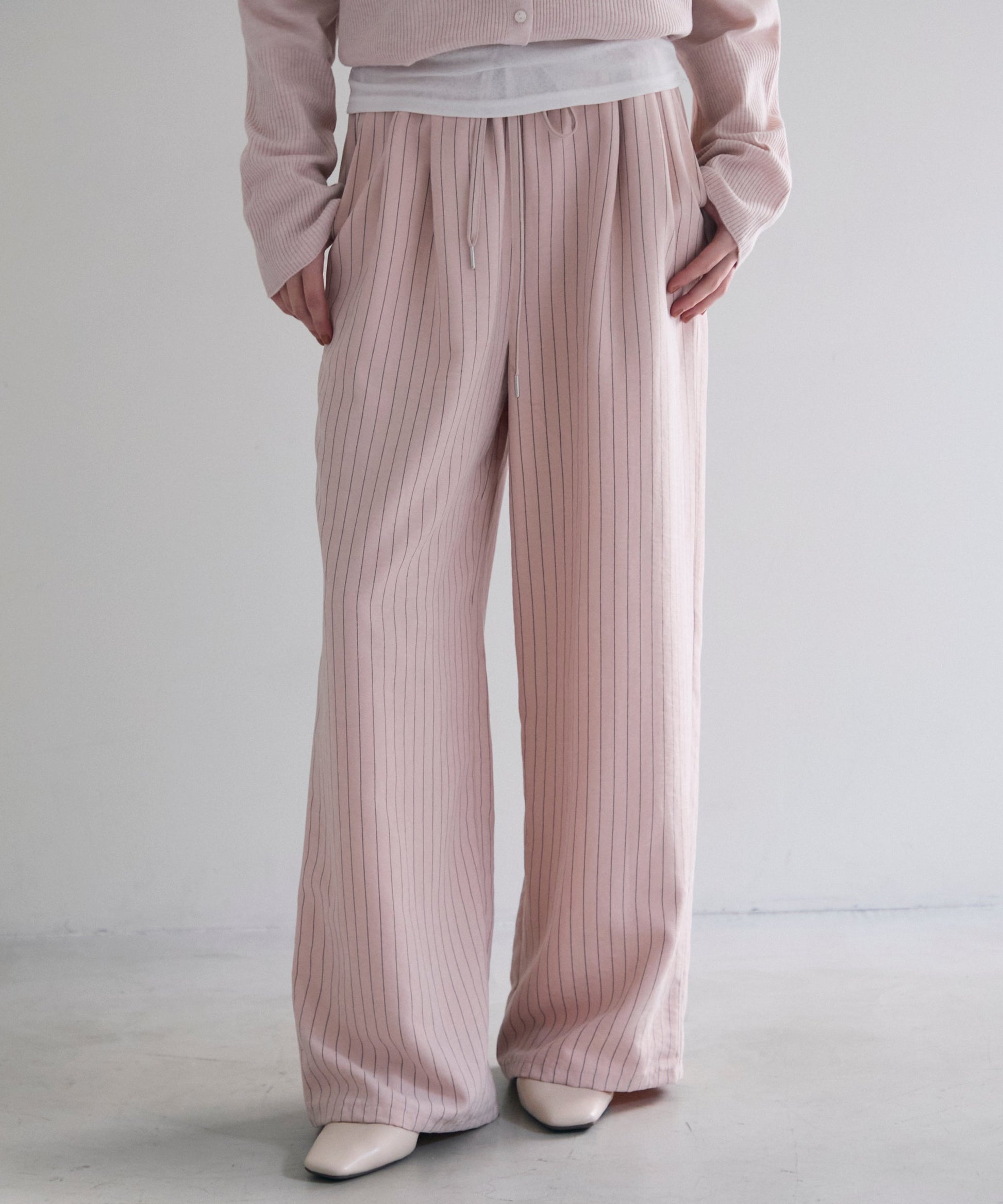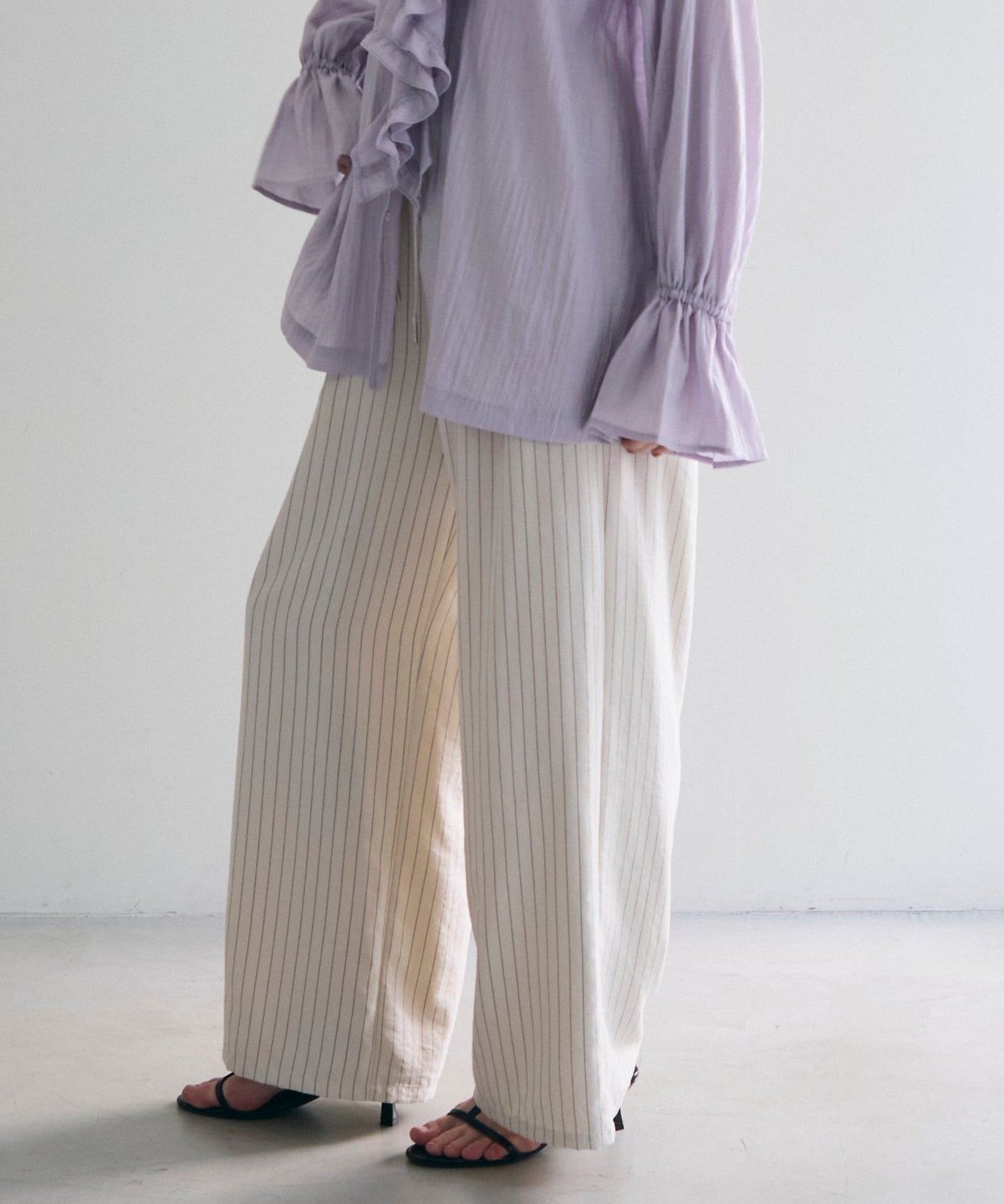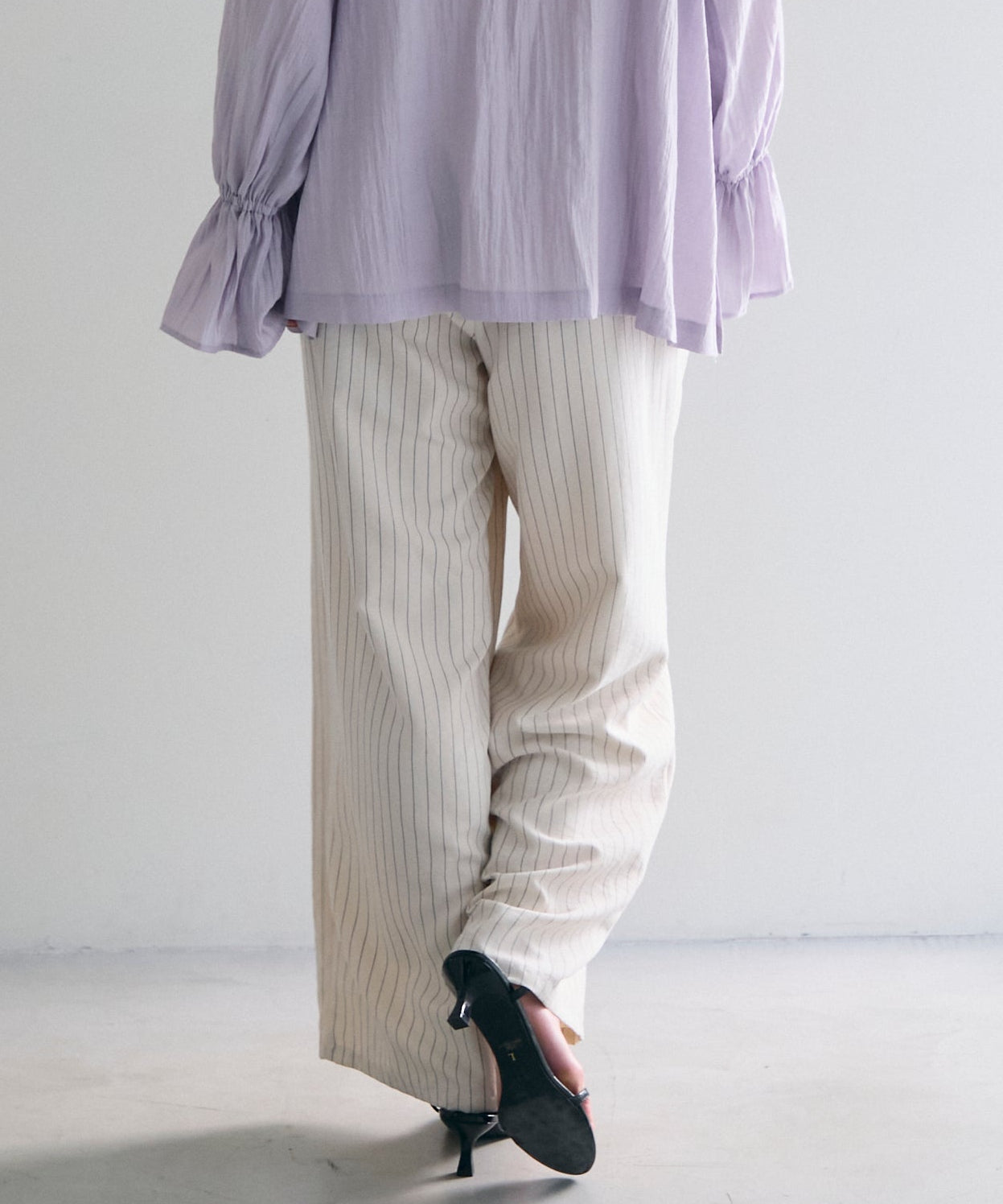 パウダースキンならではの、しっとりとなめらかなタッチが魅力のストライプイージーパンツ。