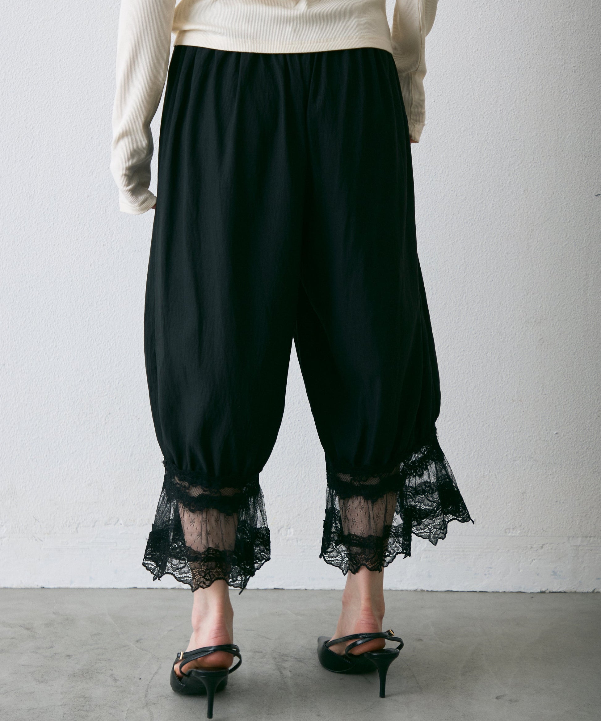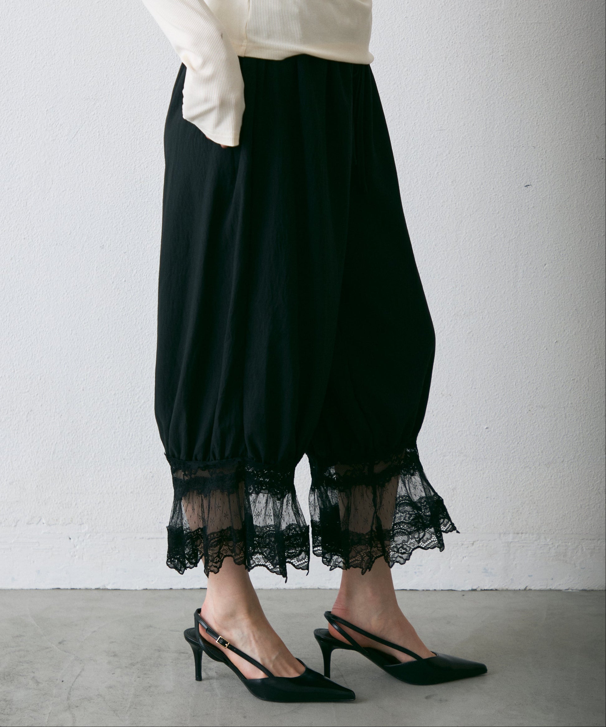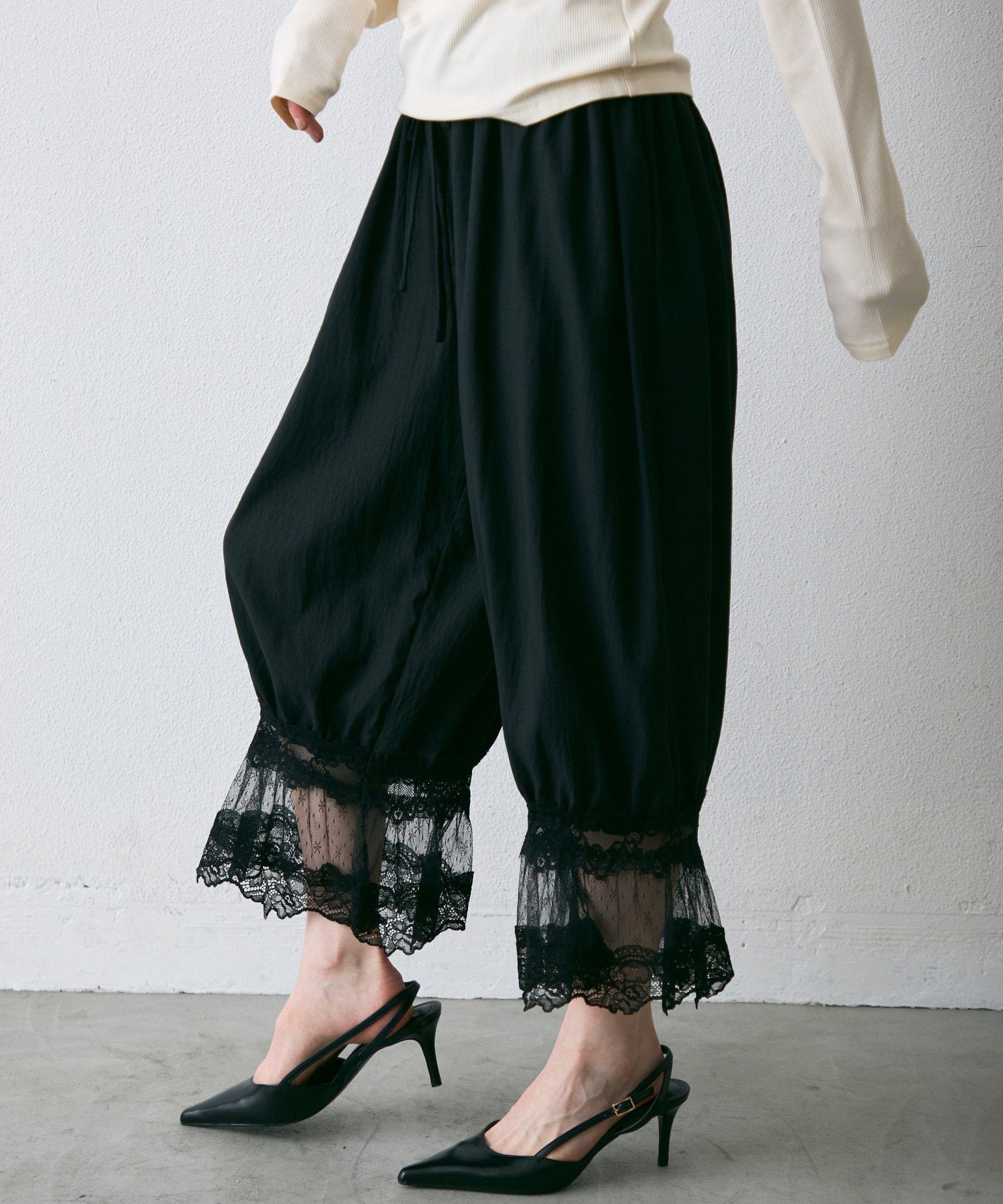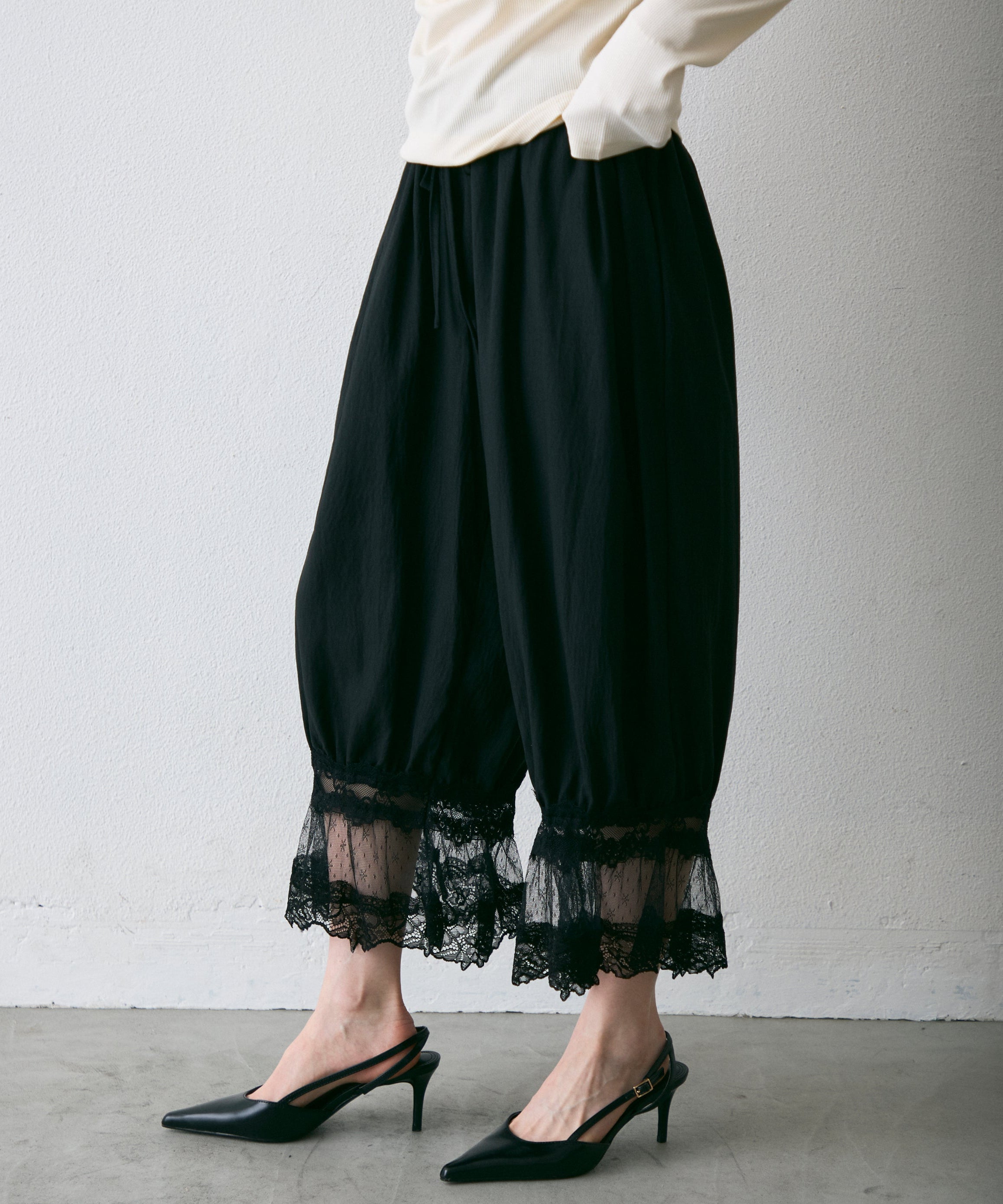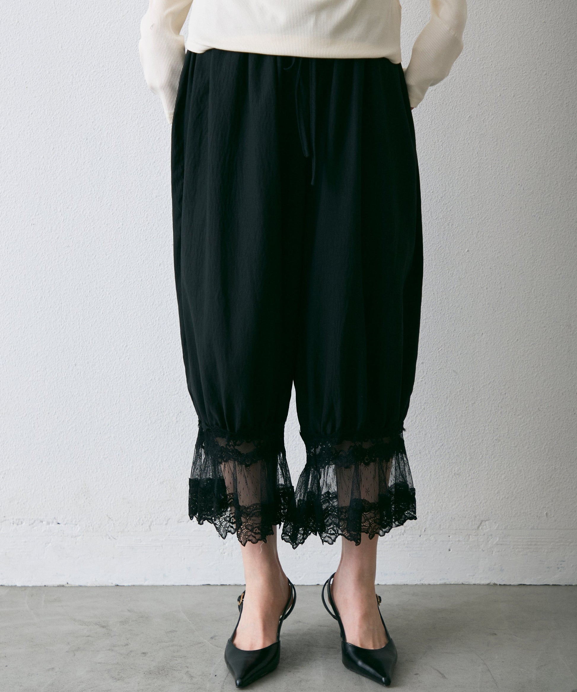 繊細なレース素材と立体感のあるバルーンシルエットが魅力のドロストパンツ。