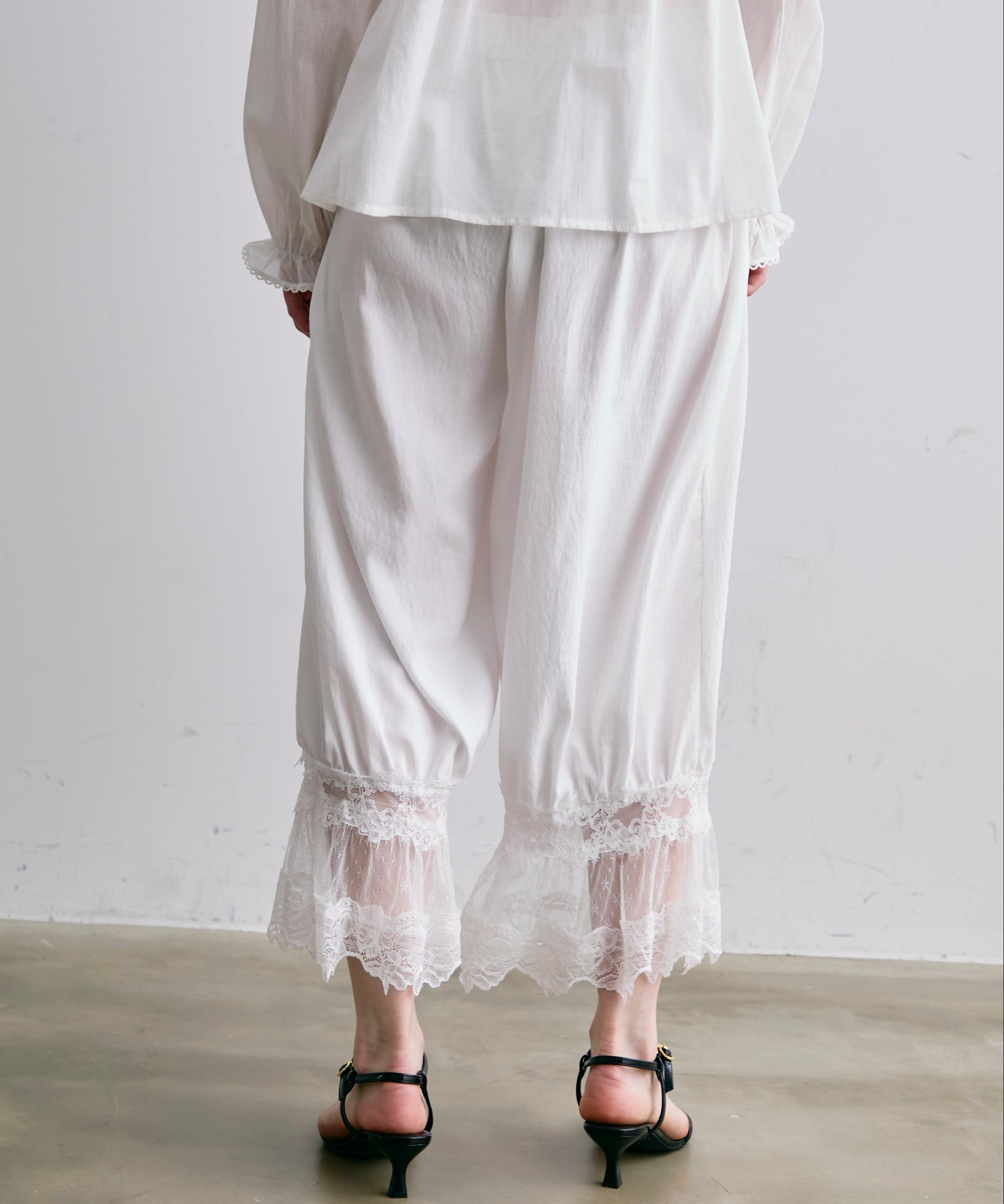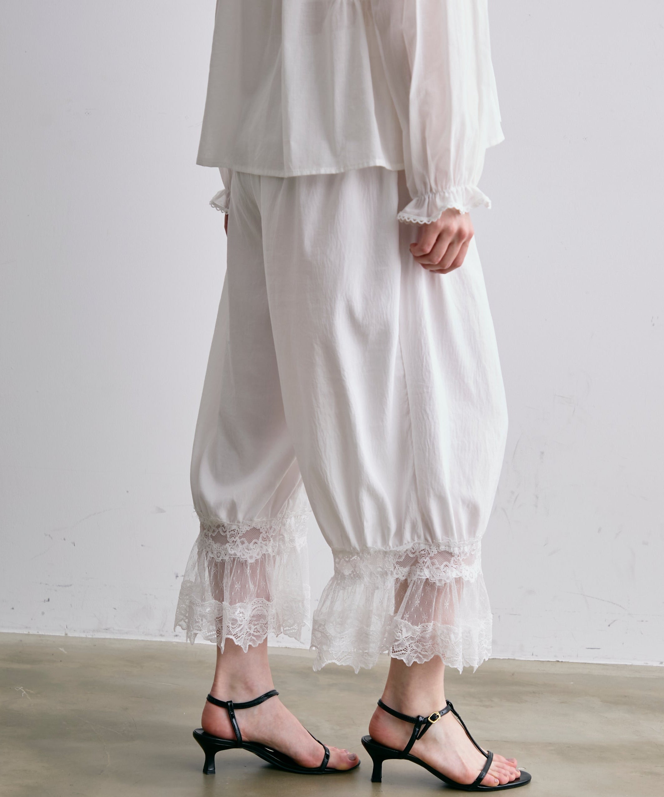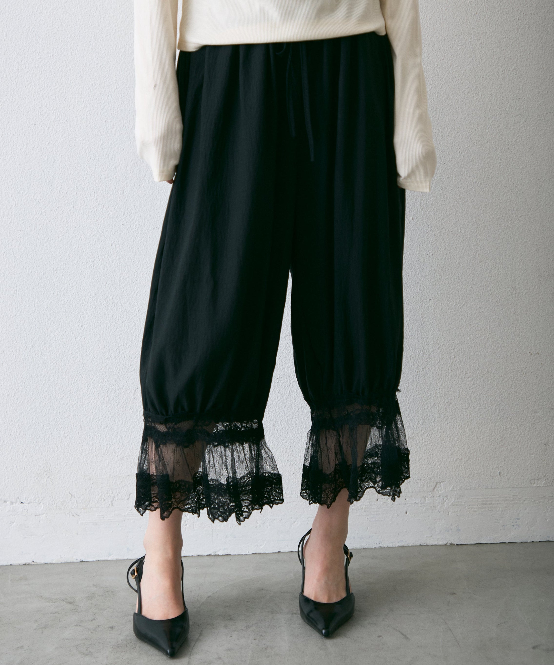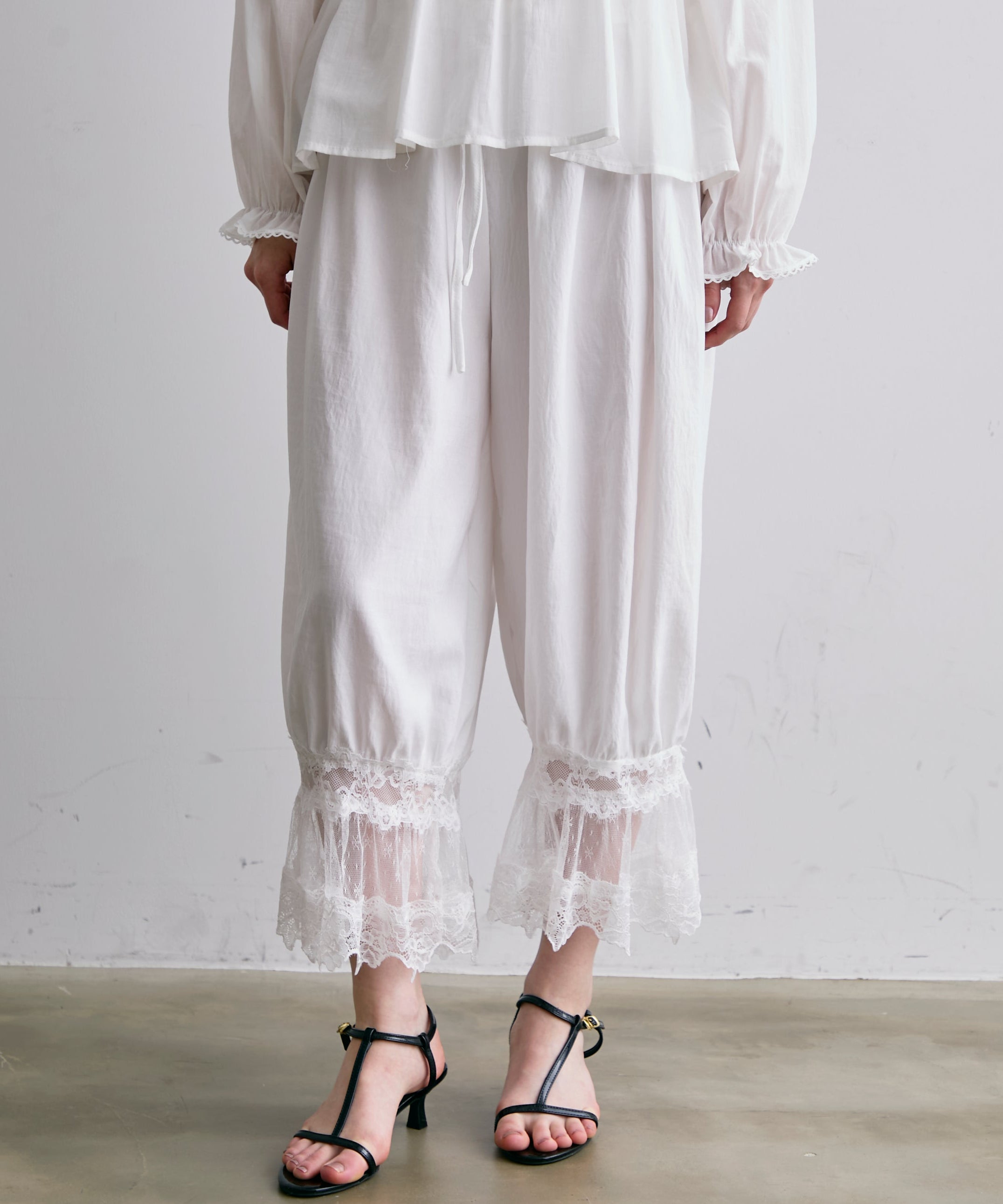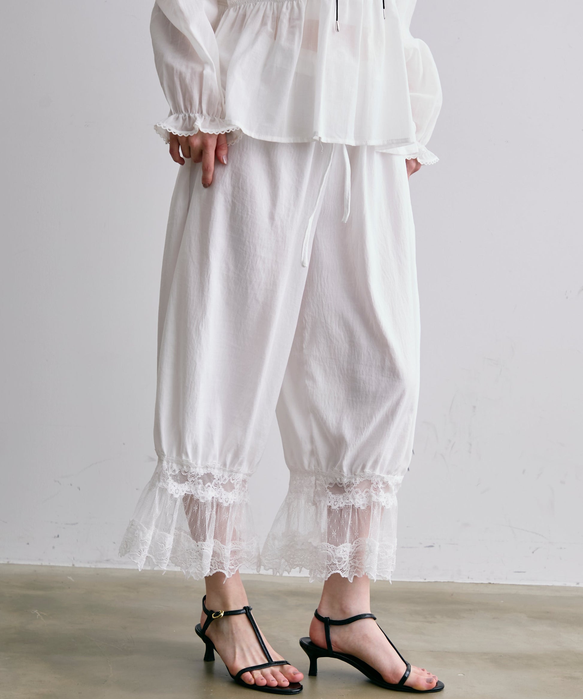 繊細なレース素材と立体感のあるバルーンシルエットが魅力のドロストパンツ。