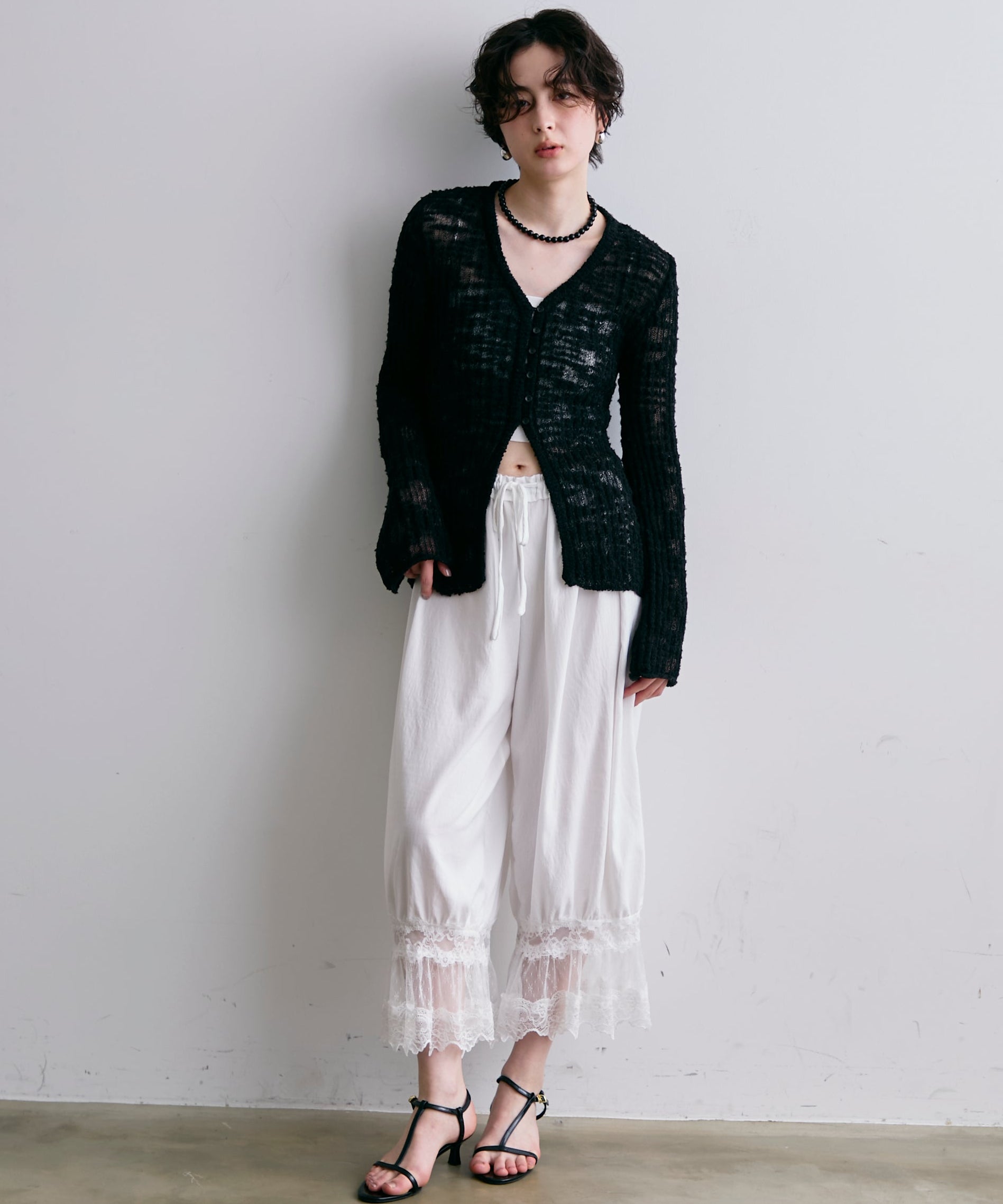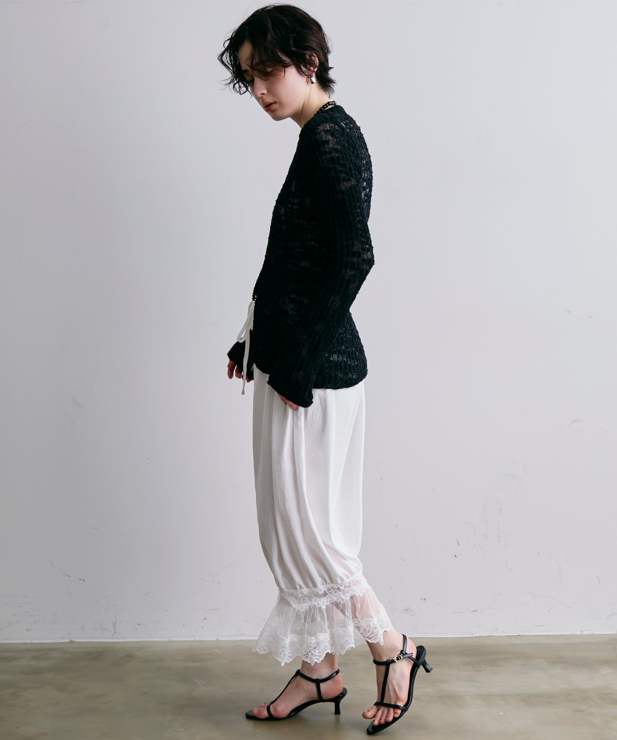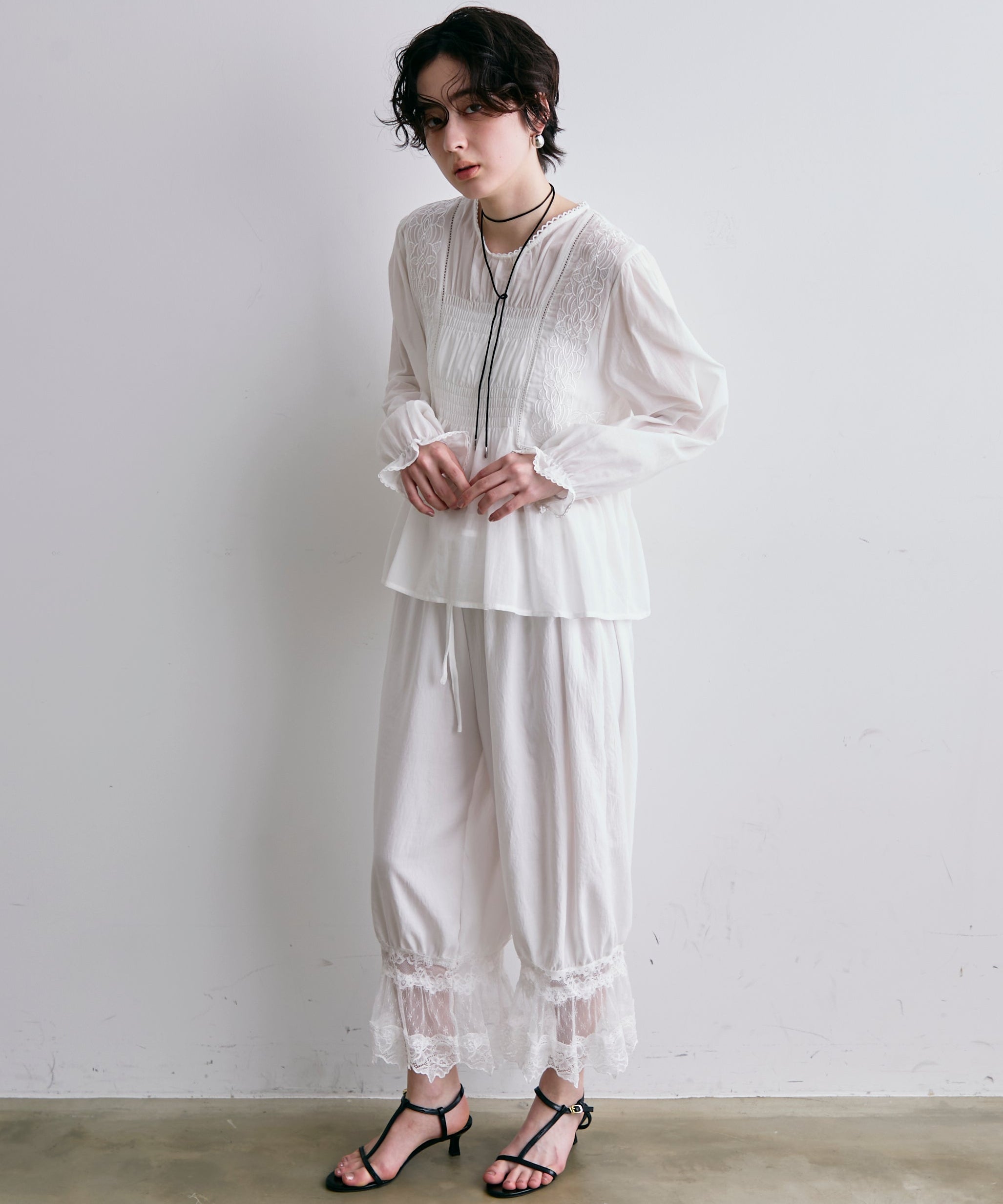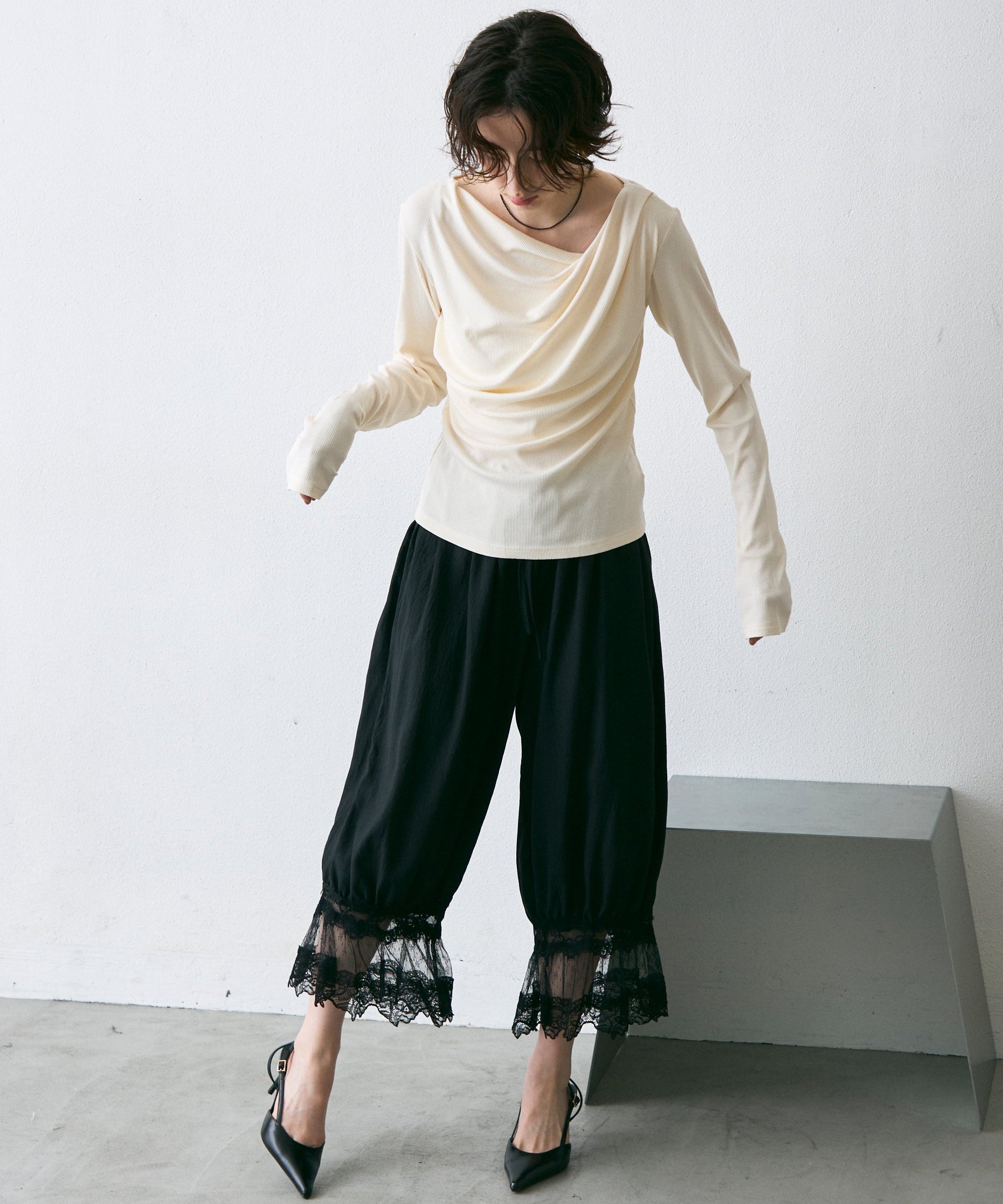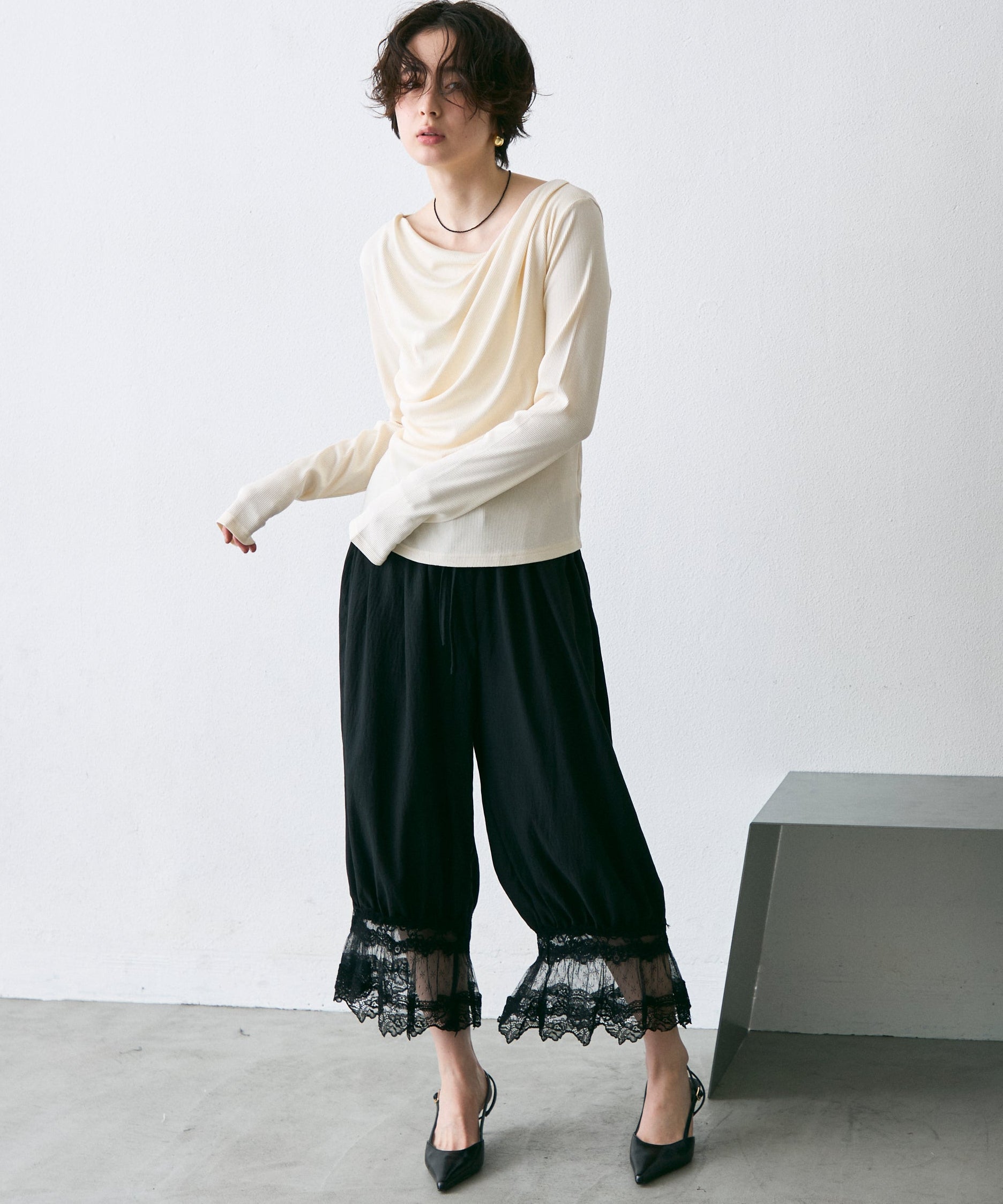 繊細なレース素材と立体感のあるバルーンシルエットが魅力のドロストパンツ。