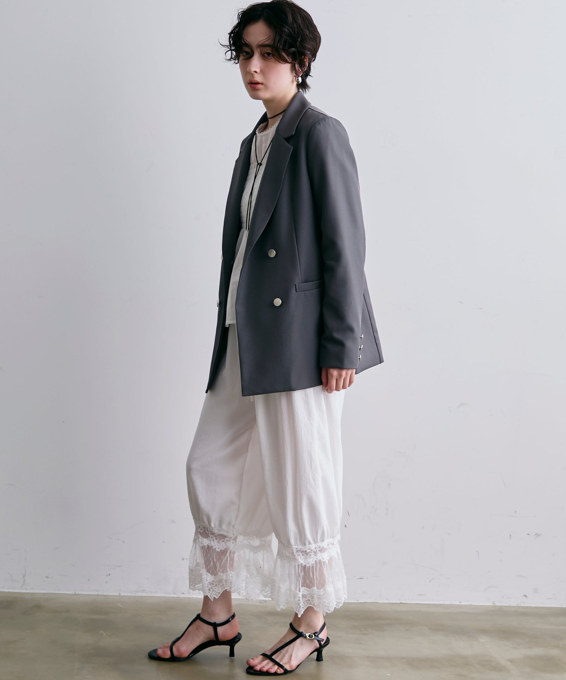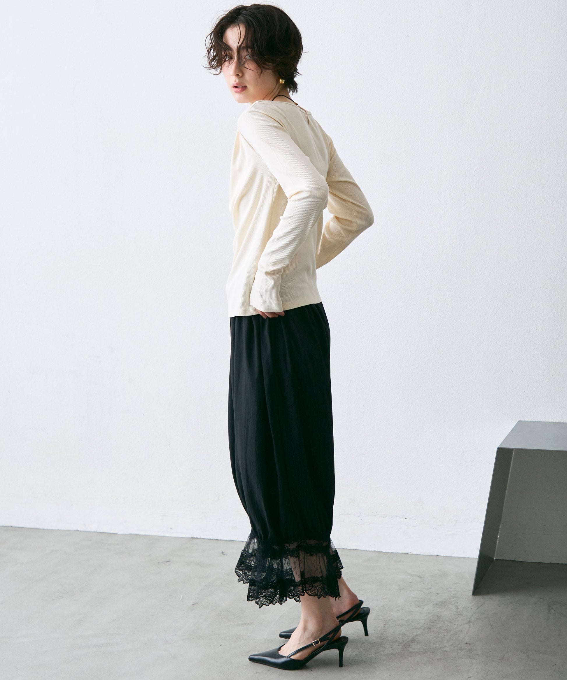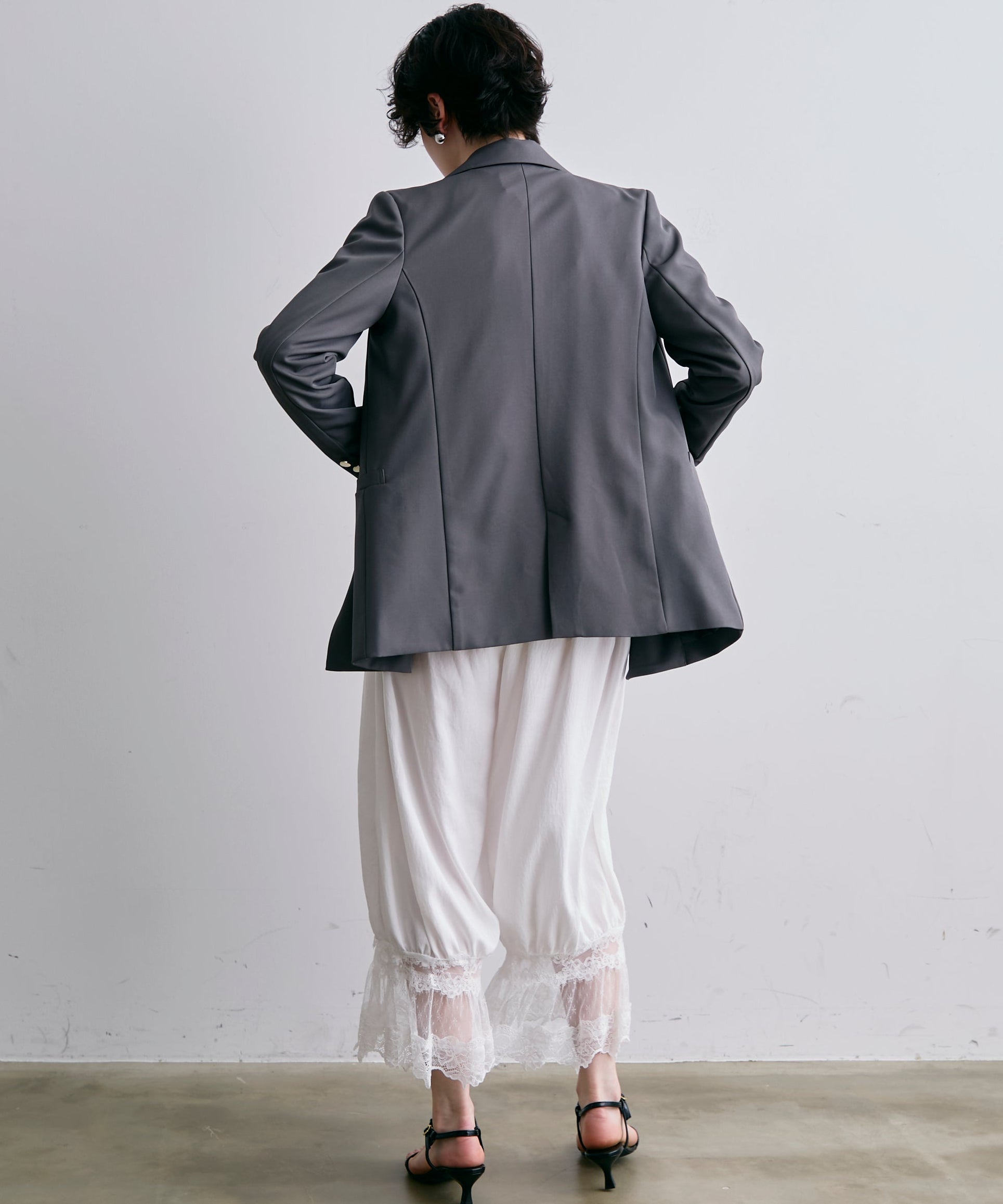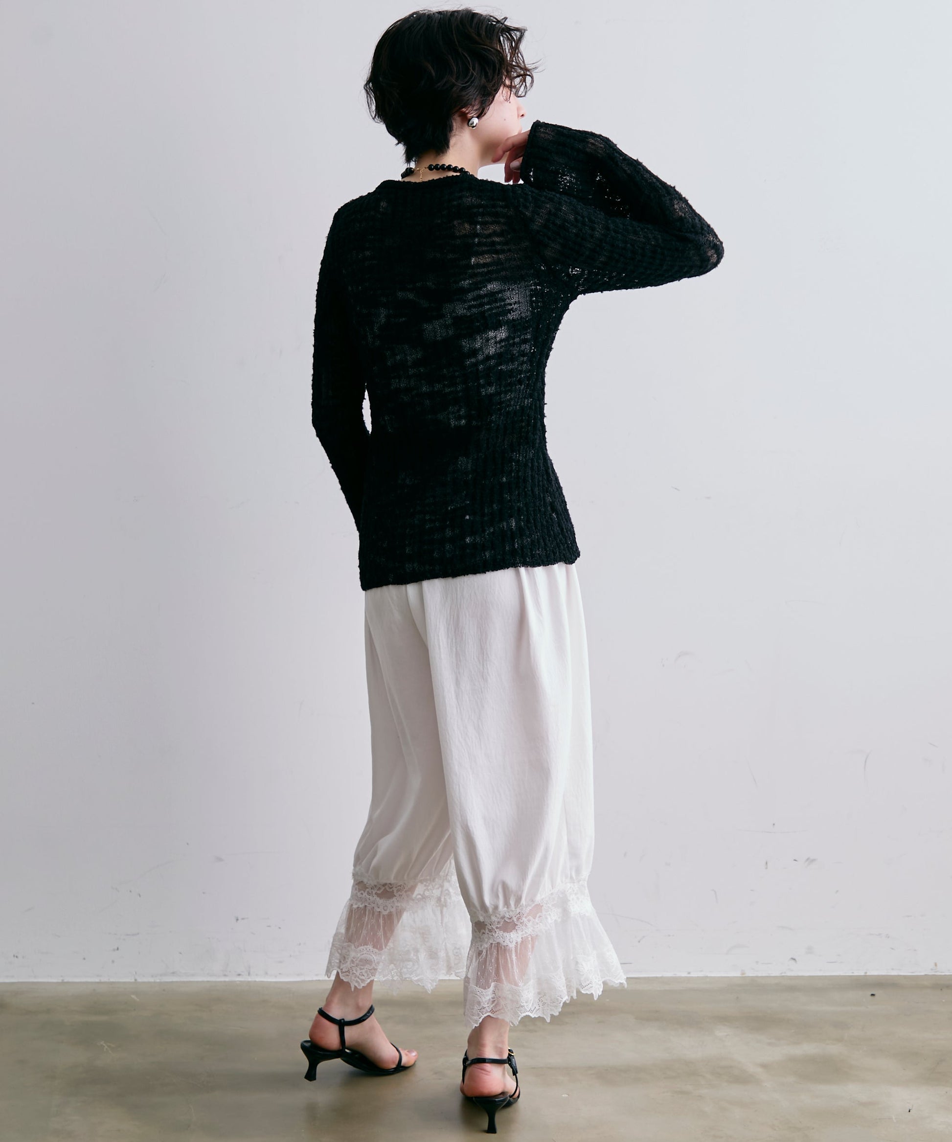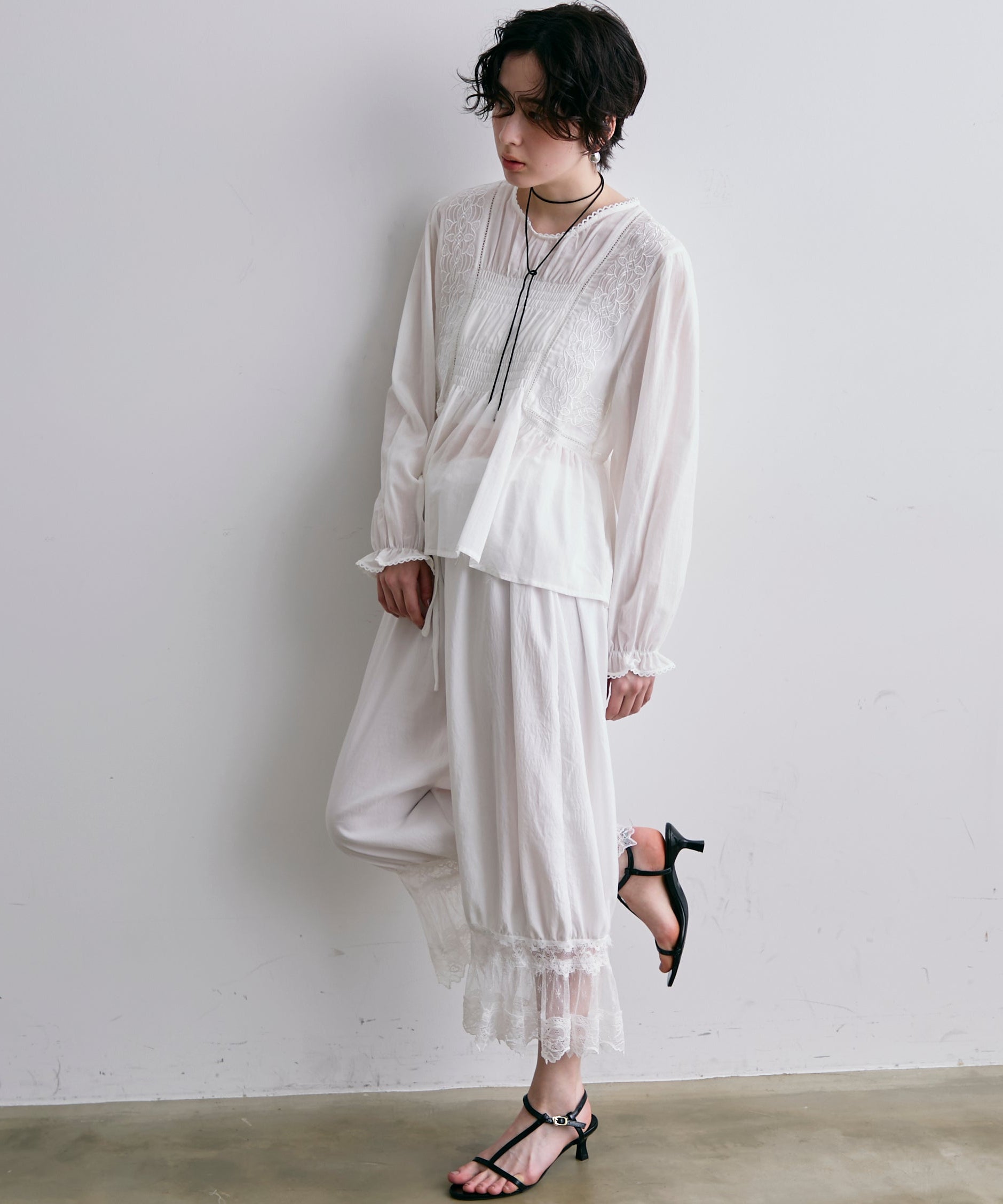 繊細なレース素材と立体感のあるバルーンシルエットが魅力のドロストパンツ。