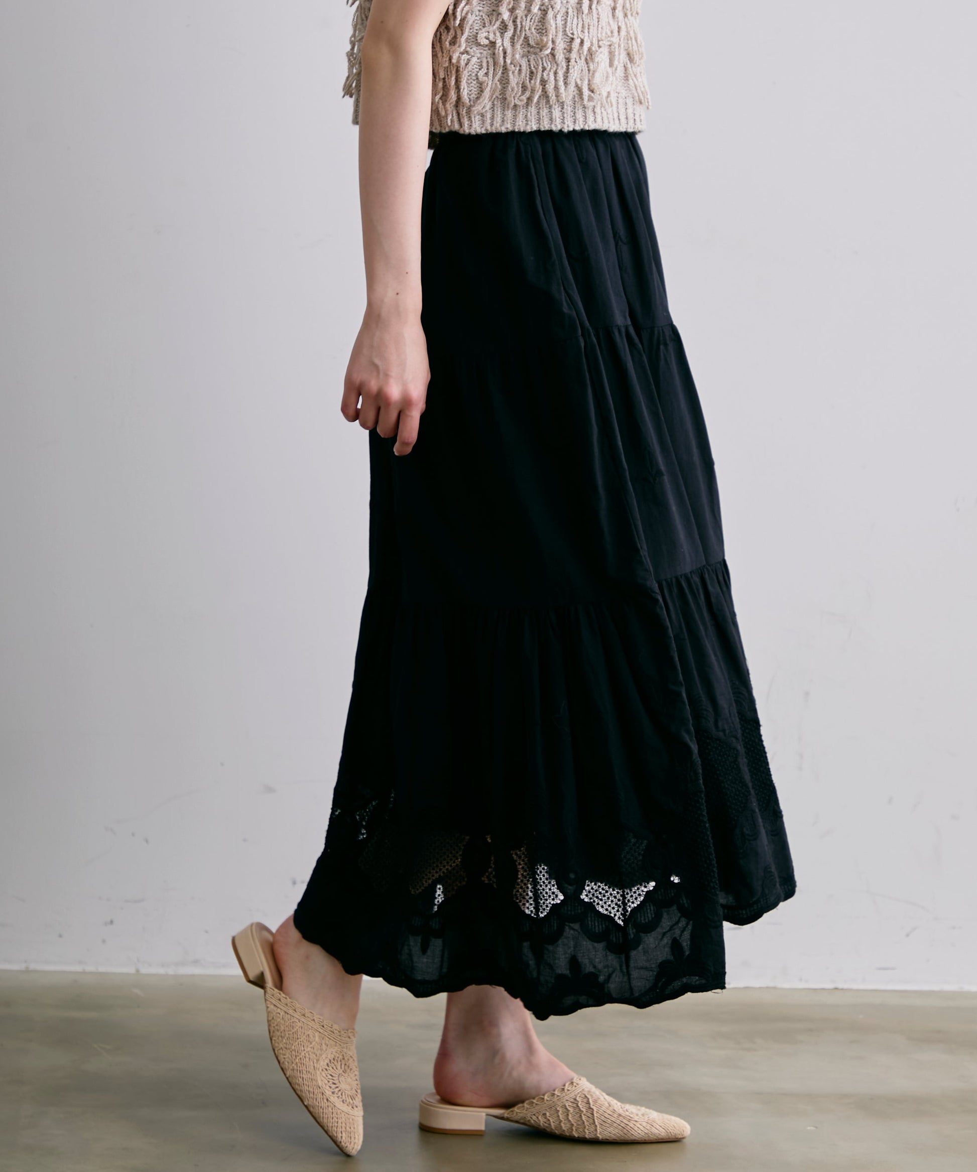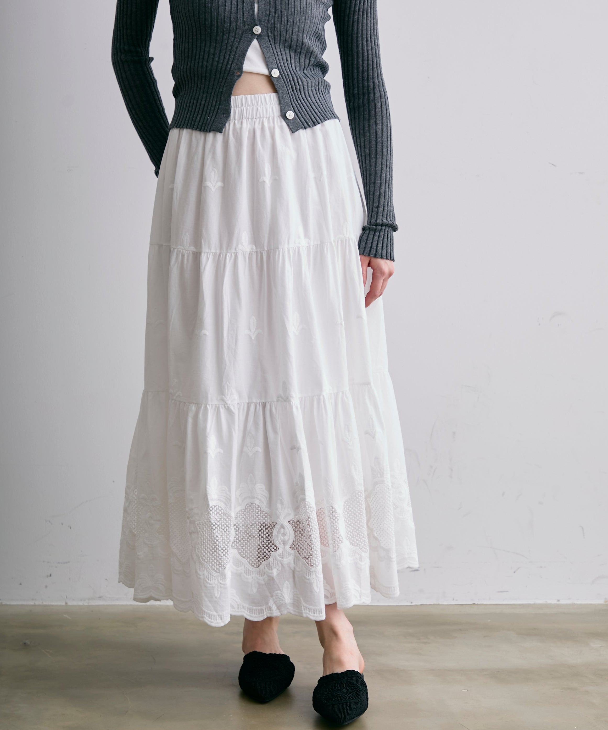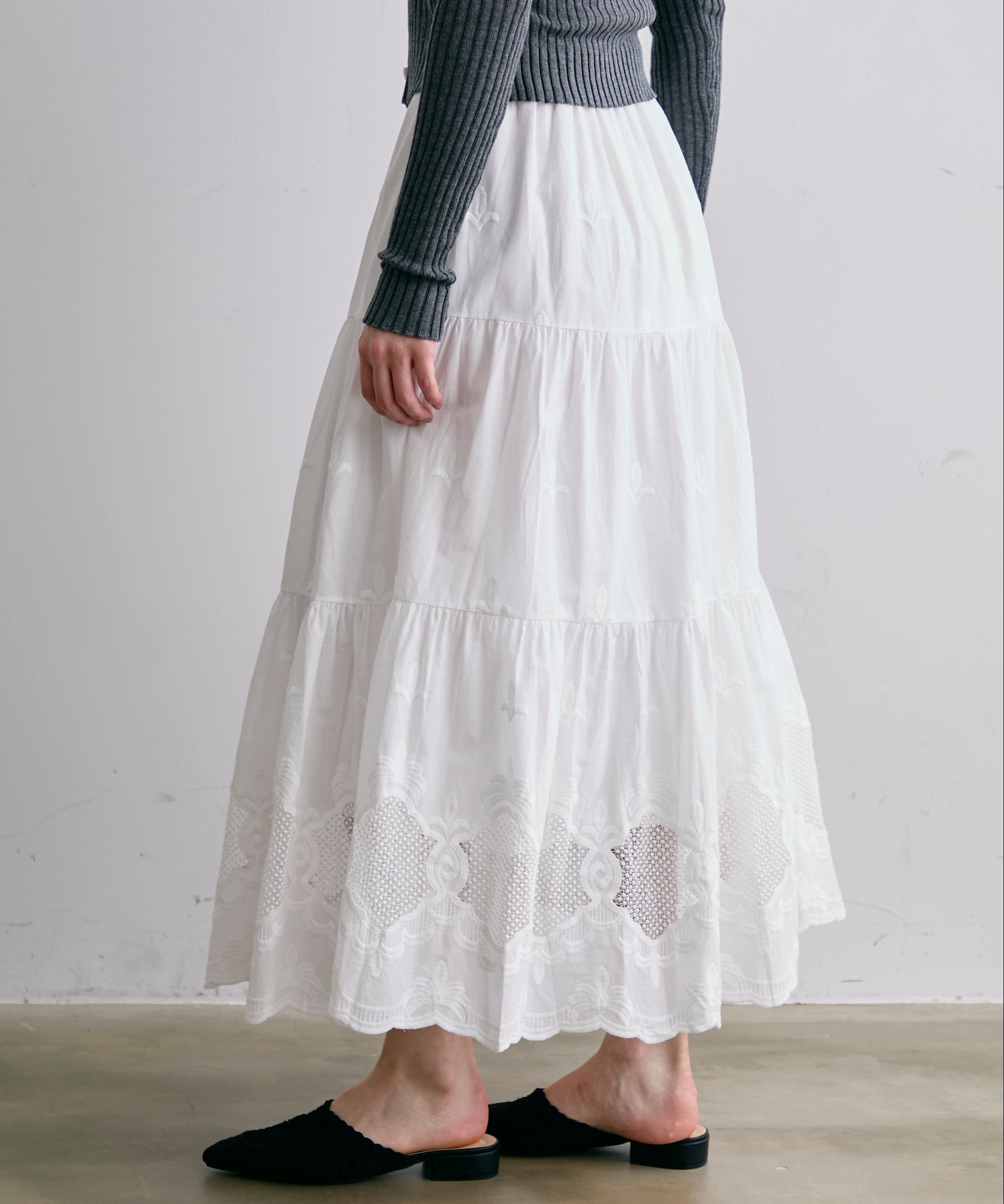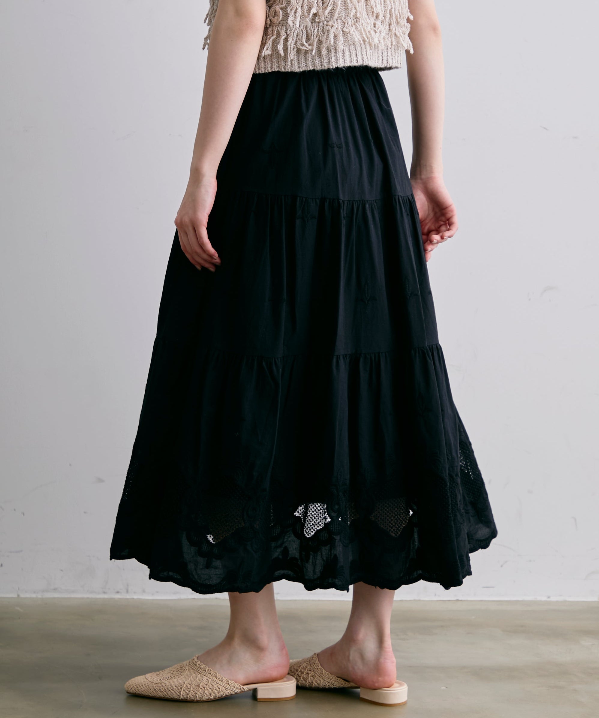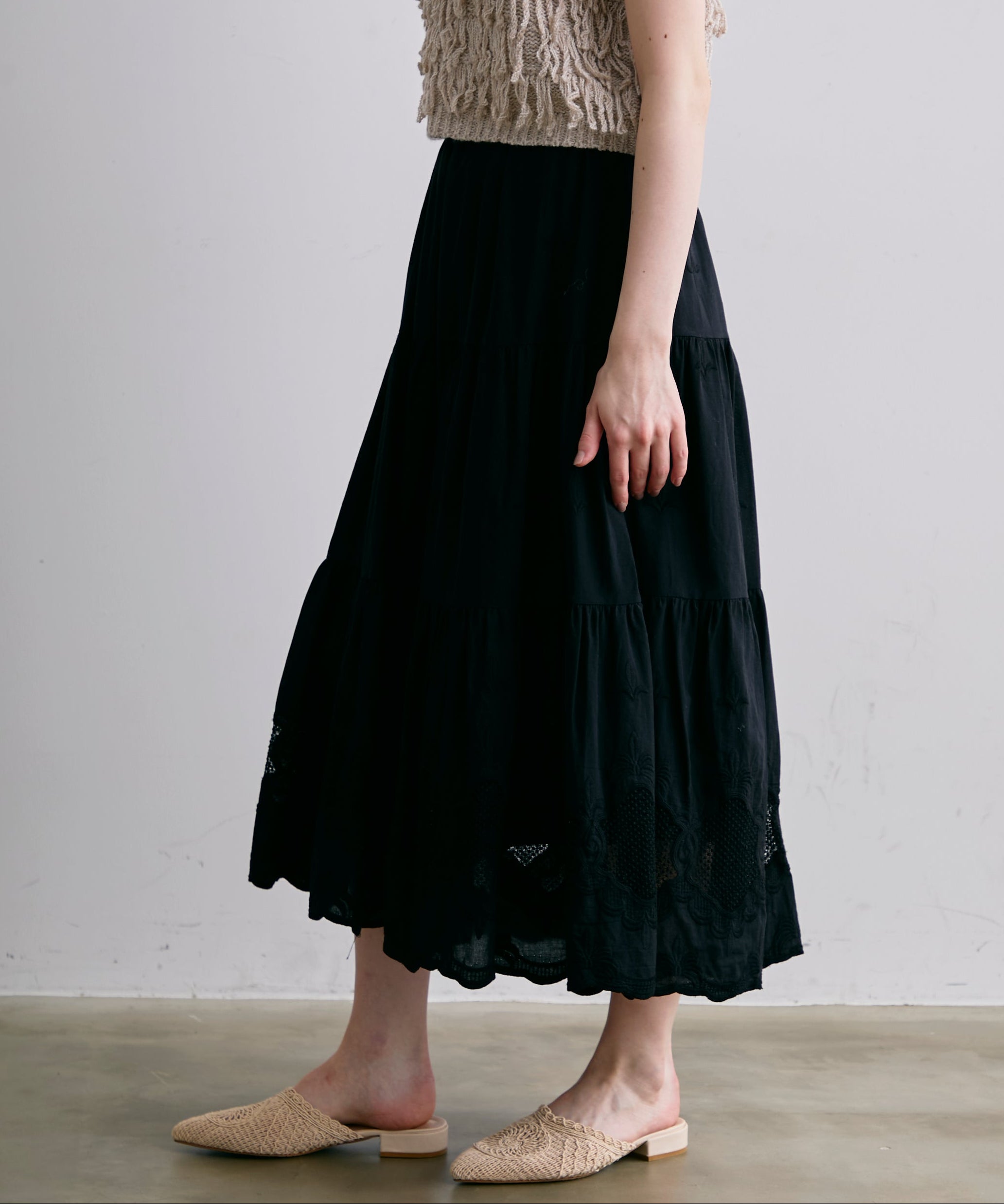 繊細なレース刺繍を贅沢にあしらったティアードロングスカート。